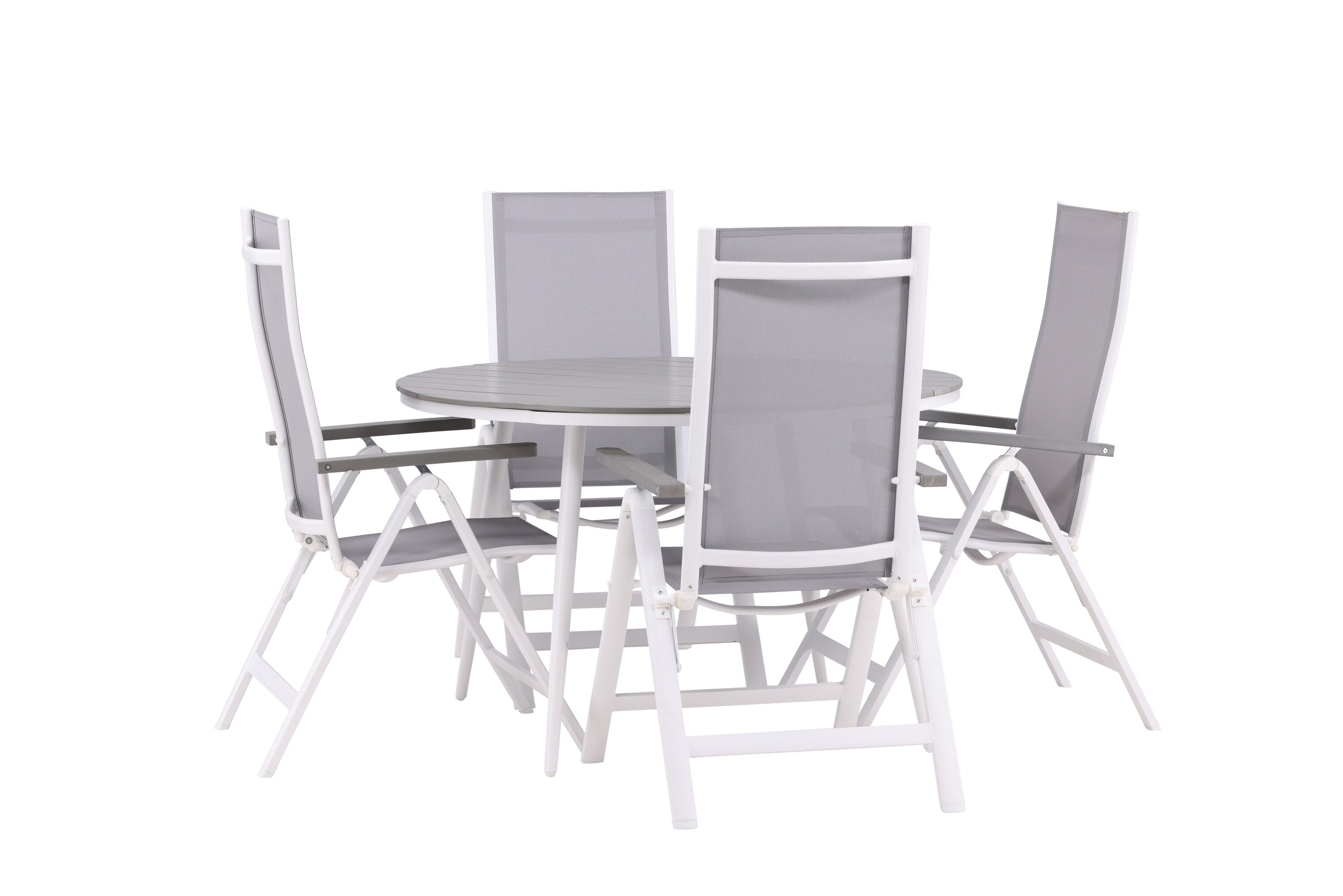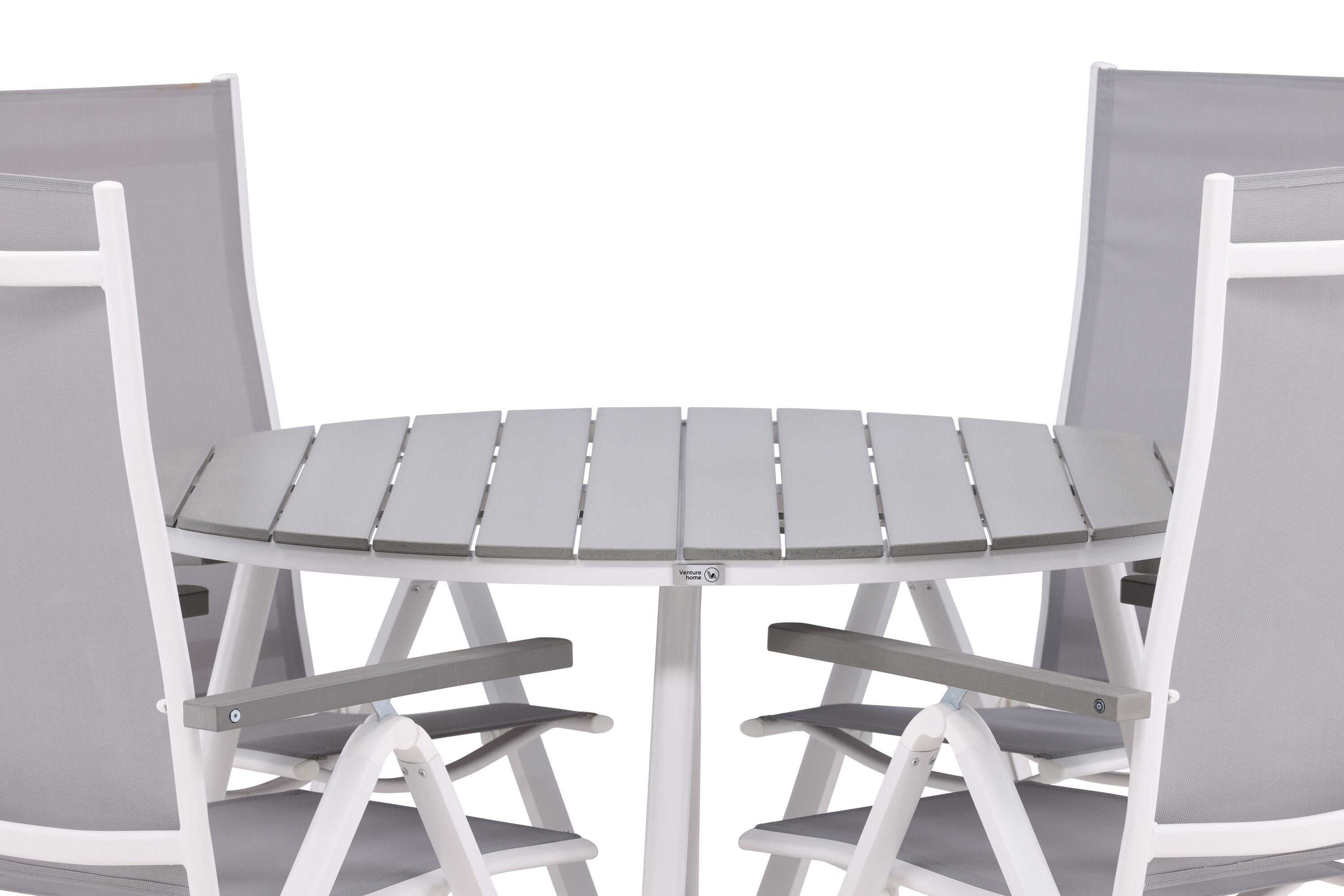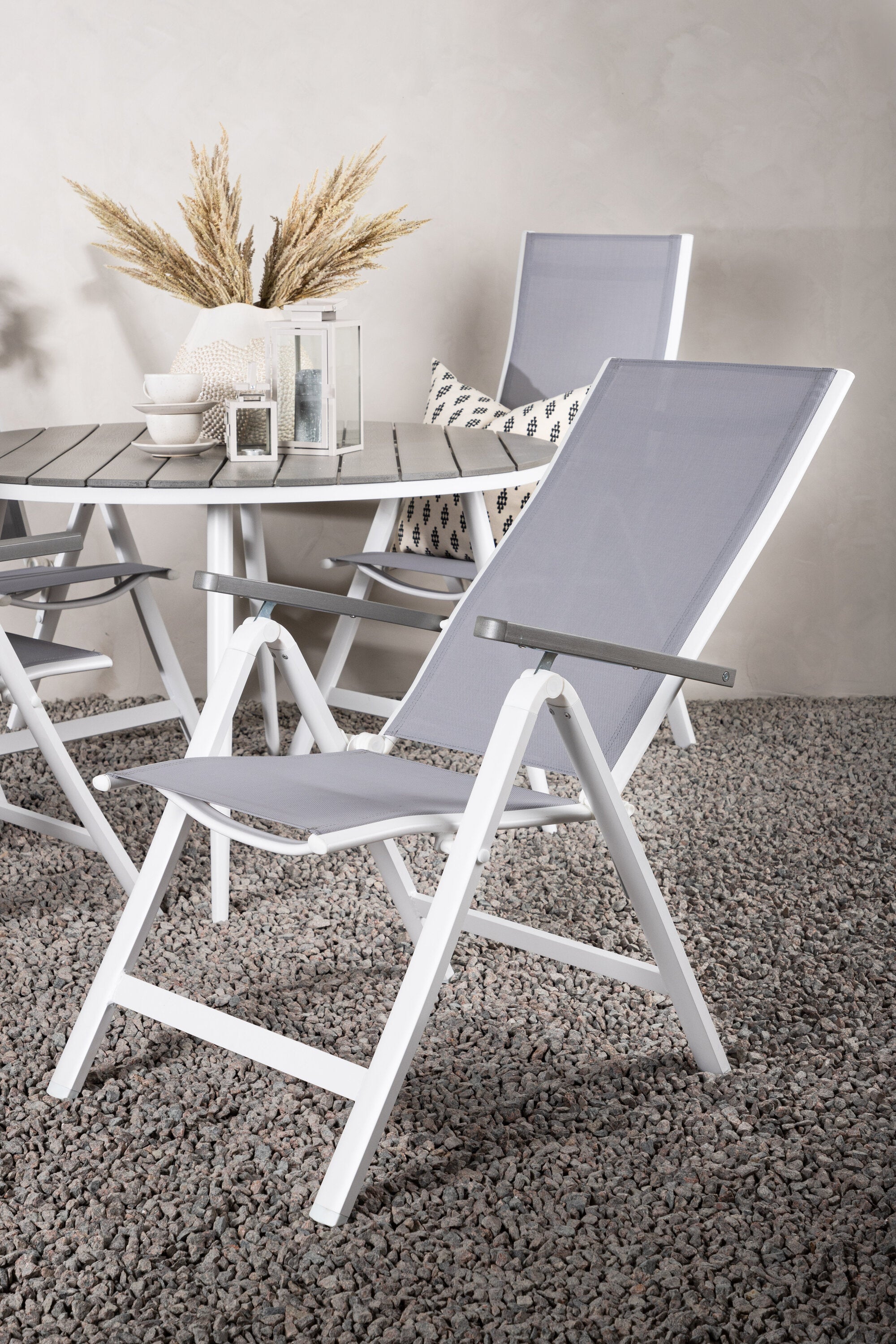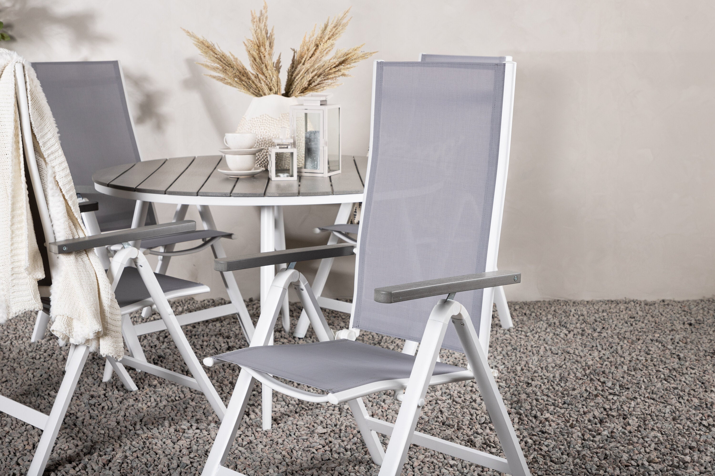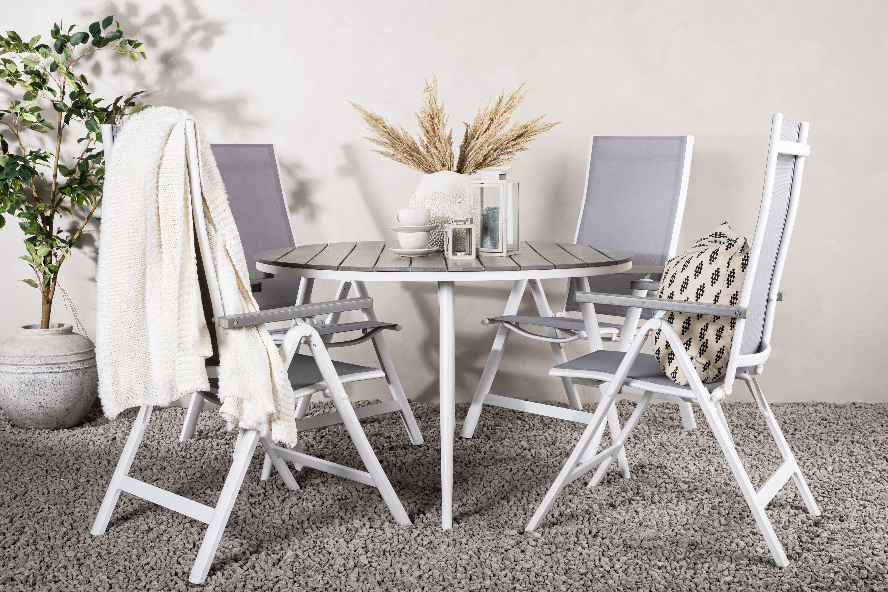 Lahodná sladká skupina jídel v příjemných barvách - ideální pro všechna letní venkovní jídla! Jídelní stůl Break má kruhovou desku stolu v šedé barvě Aintwood a klasický bílý hliníkový podvozek. Rozměry: 120ø cm. Zde spolu se 4 jídelními židlemi ze série Albany, židle se zaměřením na pohodlí a odolnost. Židle je šedá 5-polohová textilní židle s lahodnými područkami a bílou hliníkovou rámovou konstrukcí. Opěradlo je sklopné pro optimální pohodlí a relaxaci. Tady dlouho sedíte a užíváte si dobré jídlo!