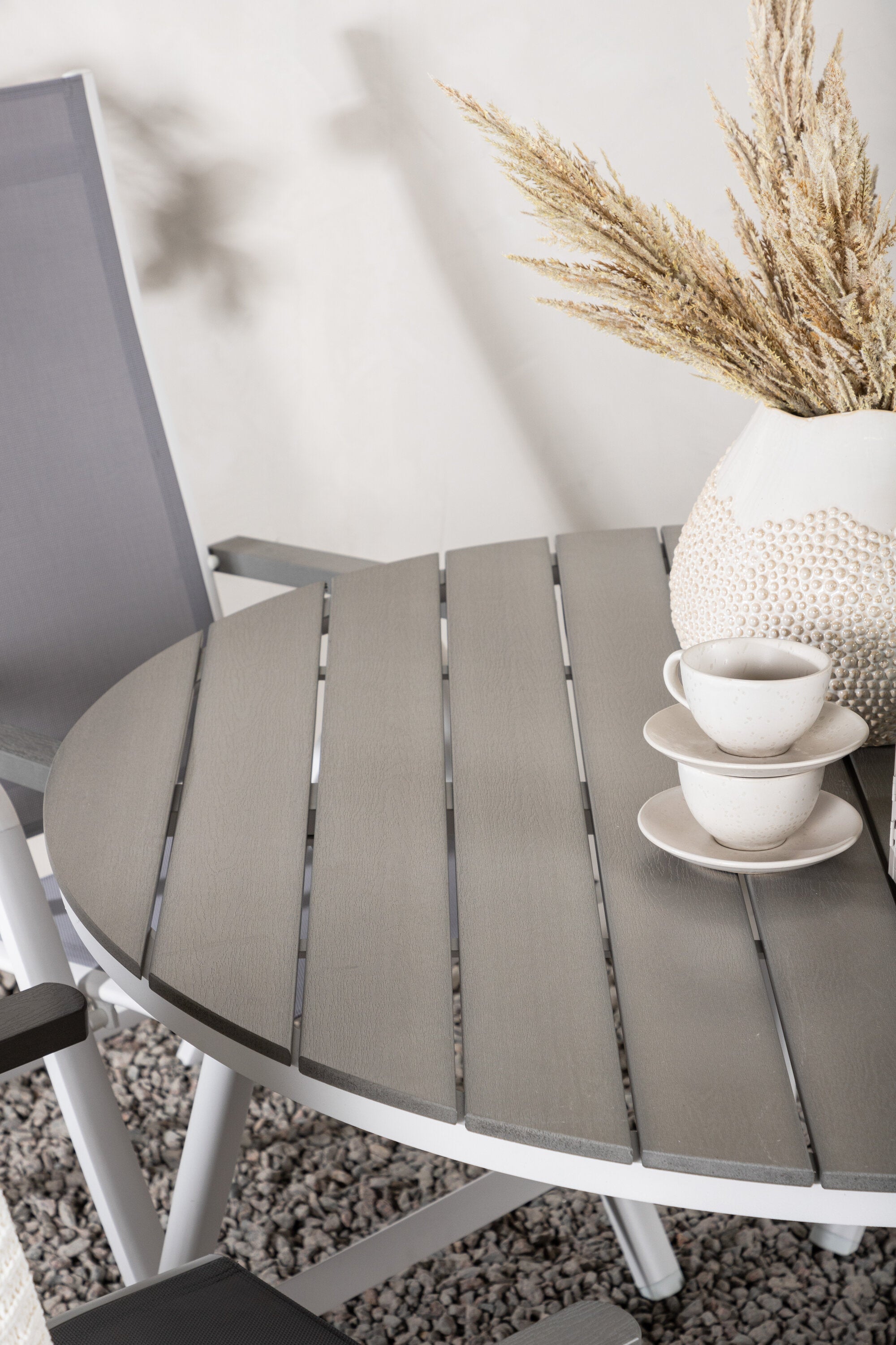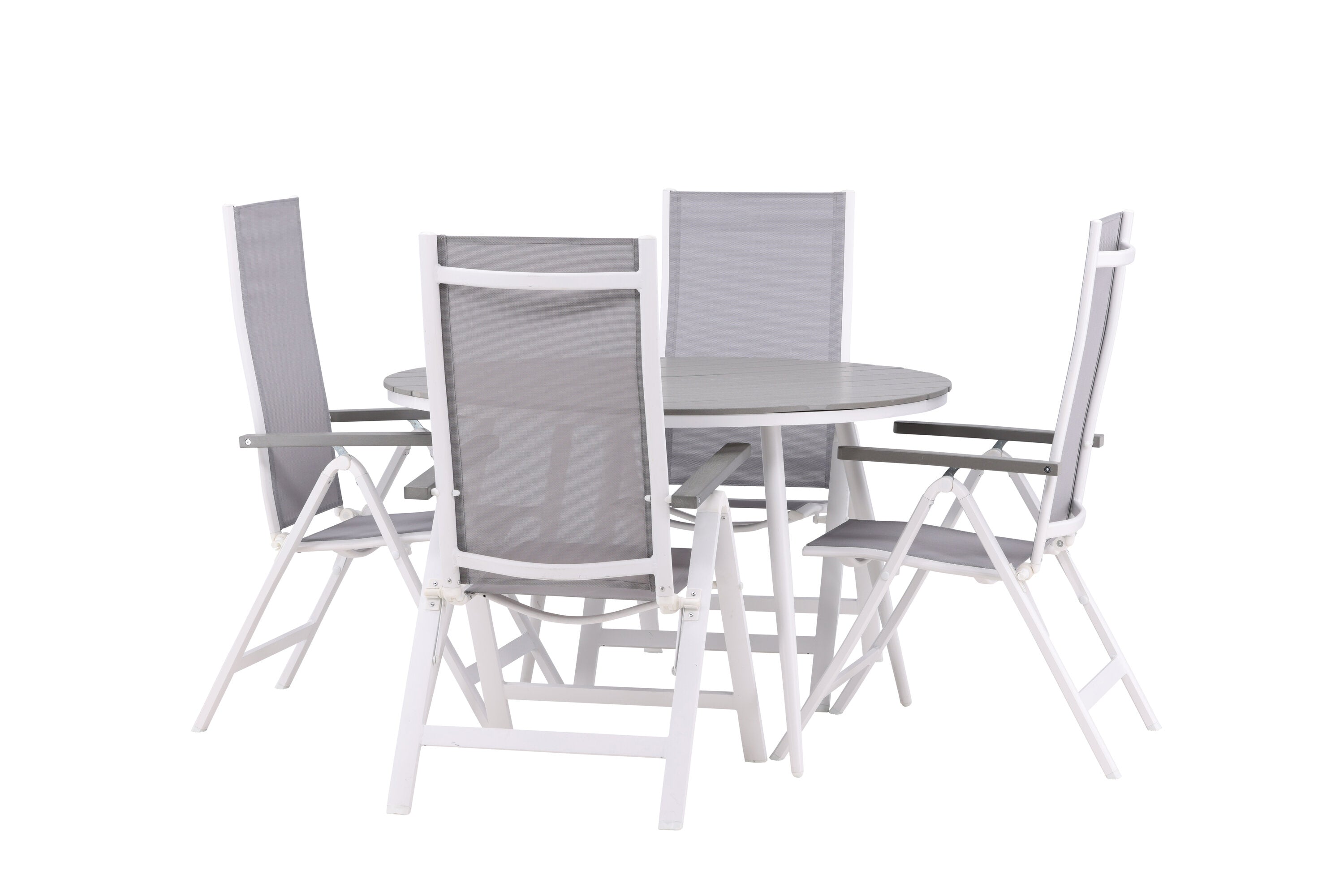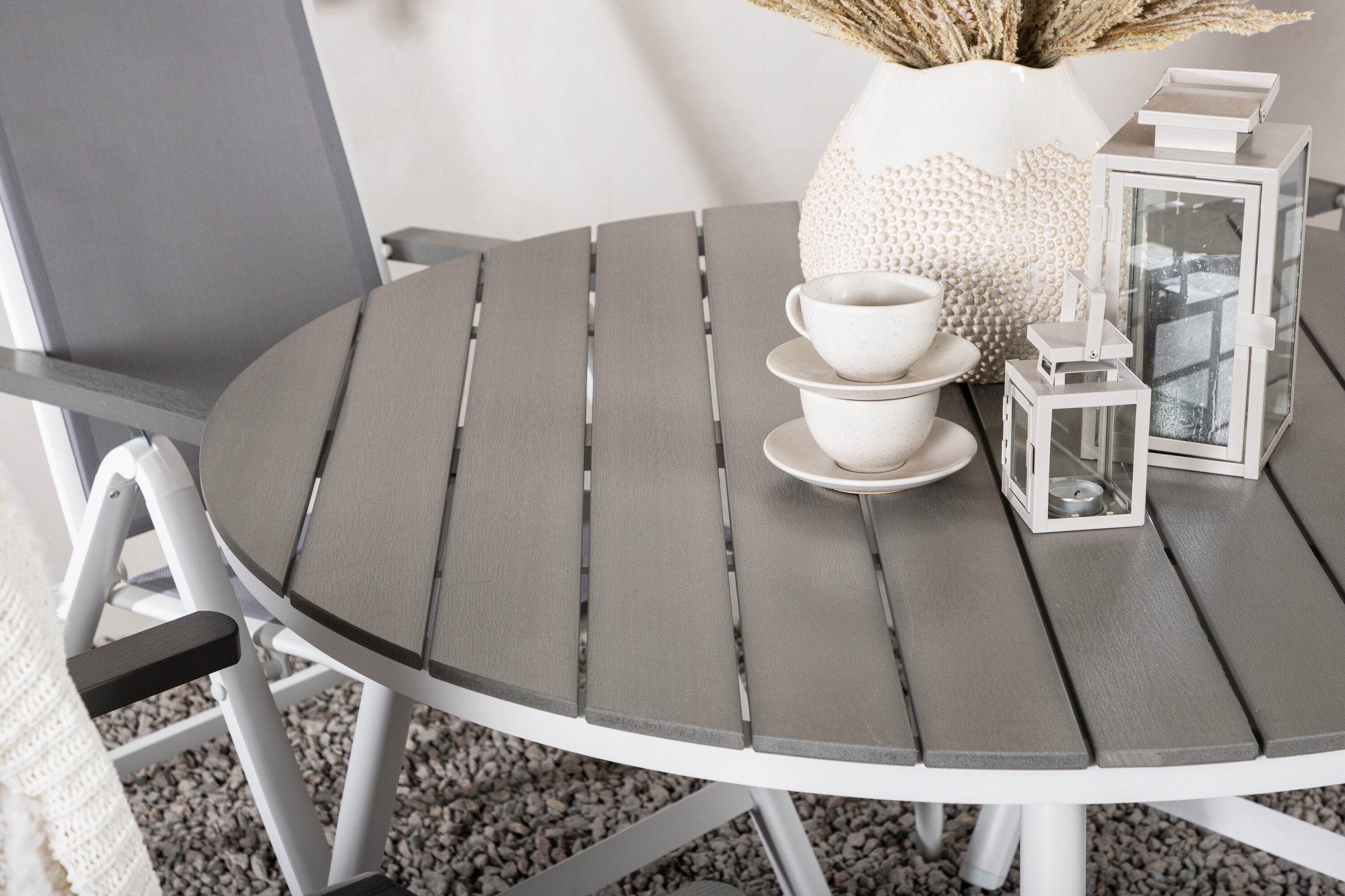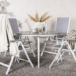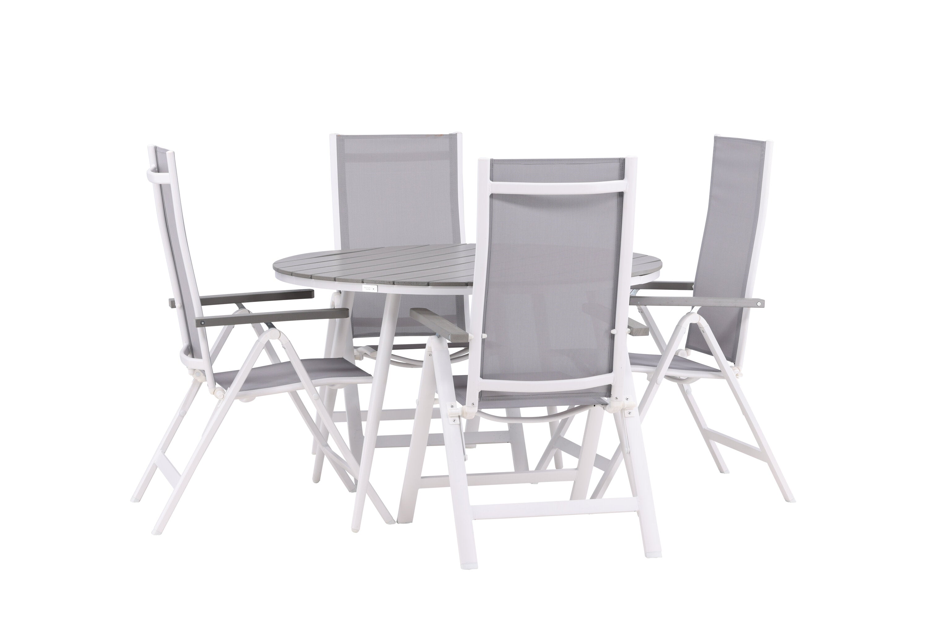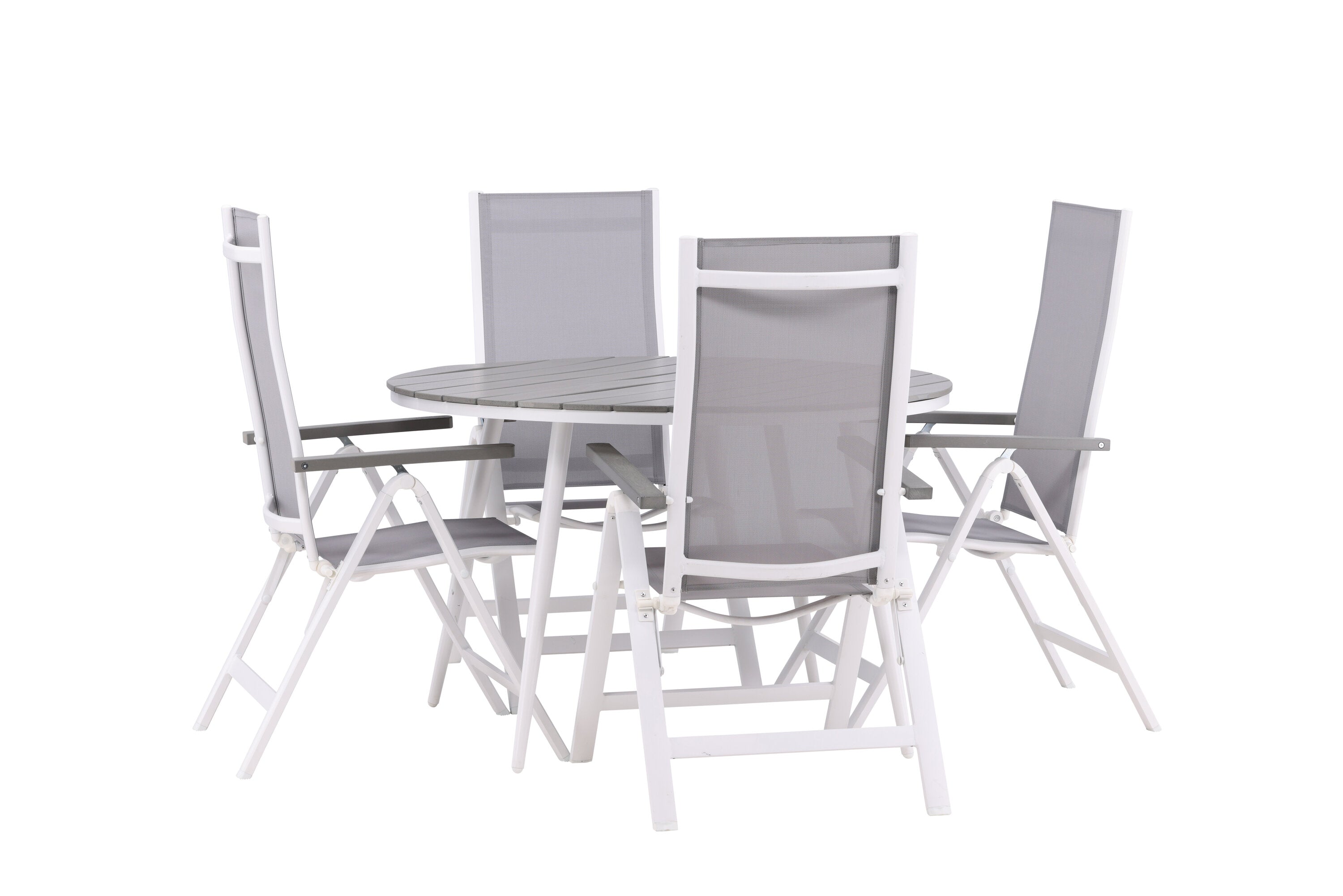 Lahodná sladká skupina jídel v příjemných barvách - ideální pro všechna letní venkovní jídla! Jídelní stůl Break má kruhovou desku stolu v šedé barvě Aintwood a klasický bílý hliníkový podvozek. Rozměry: 120ø cm. Zde spolu se 4 jídelními židlemi ze série Albany, židle se zaměřením na pohodlí a odolnost. Židle je šedá 5-polohová textilní židle s lahodnými područkami a bílou hliníkovou rámovou konstrukcí. Opěradlo je sklopné pro optimální pohodlí a relaxaci. Tady dlouho sedíte a užíváte si dobré jídlo!