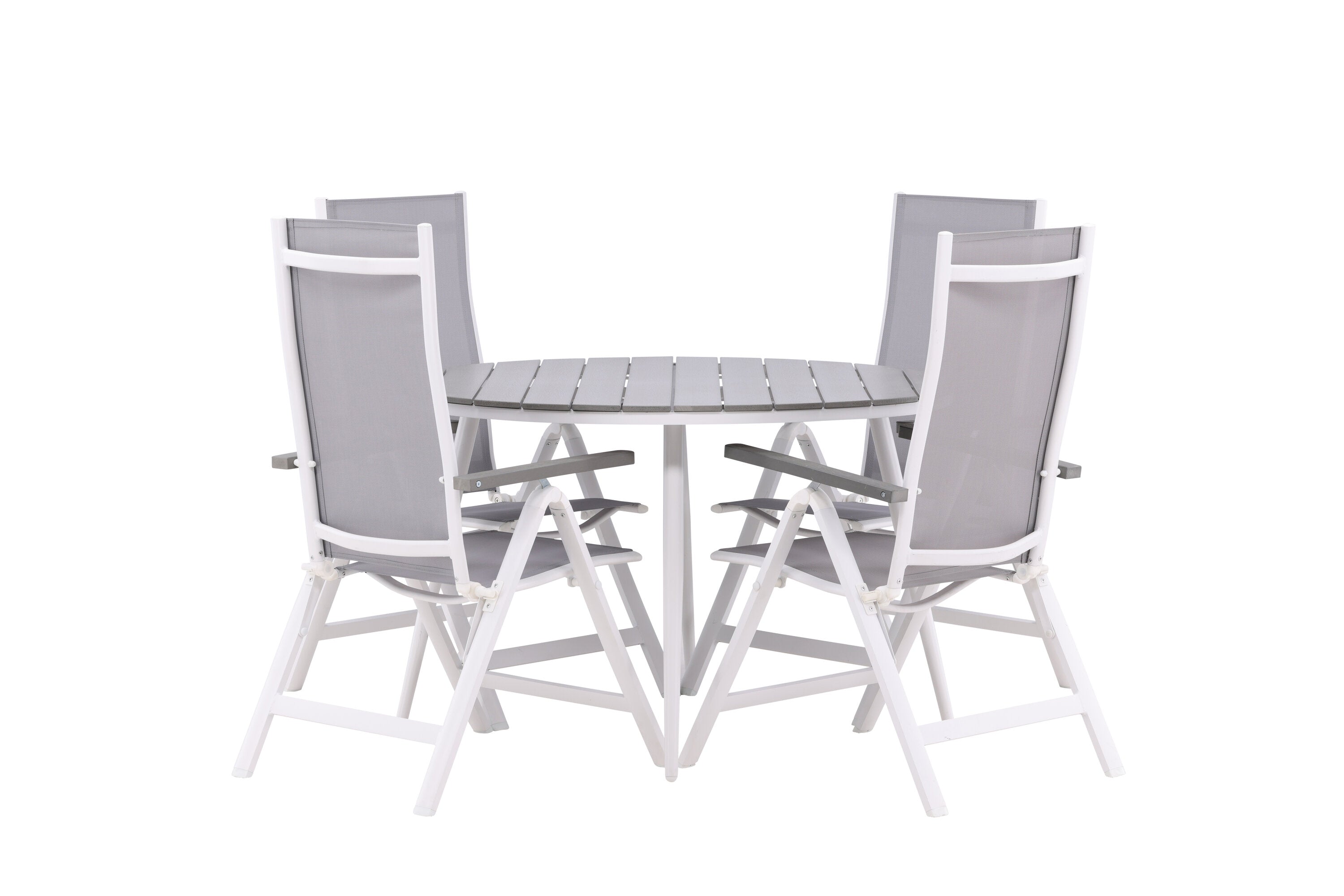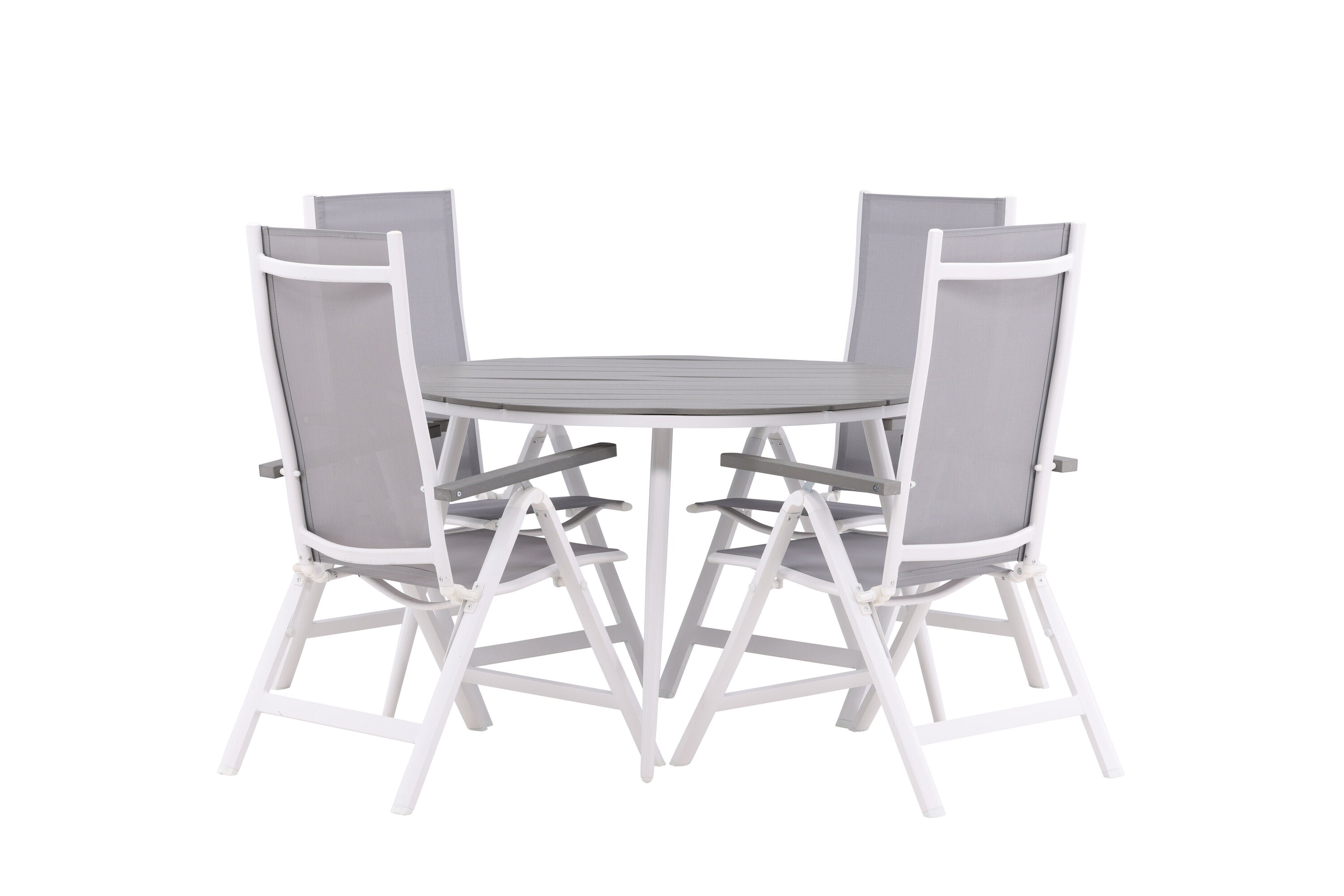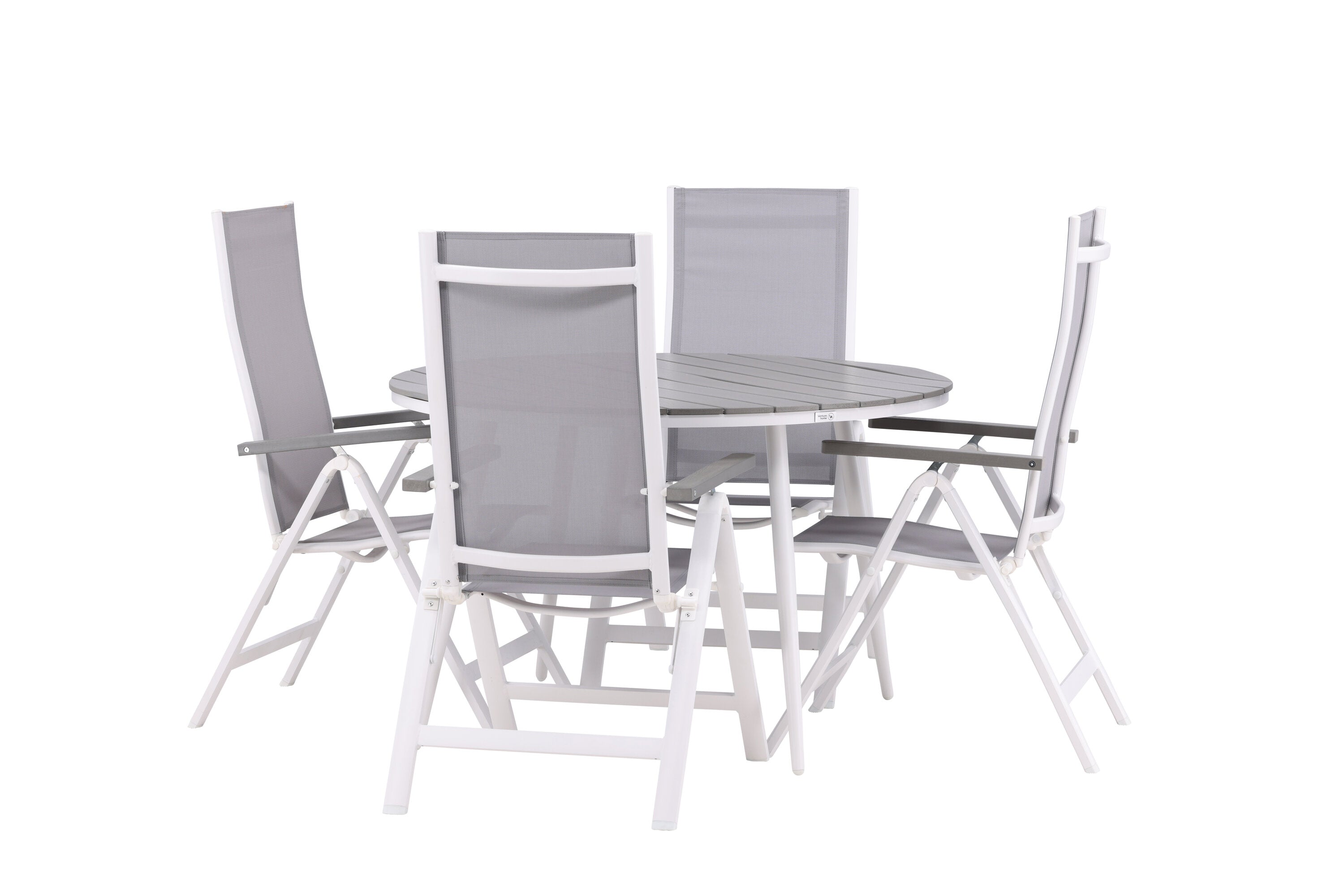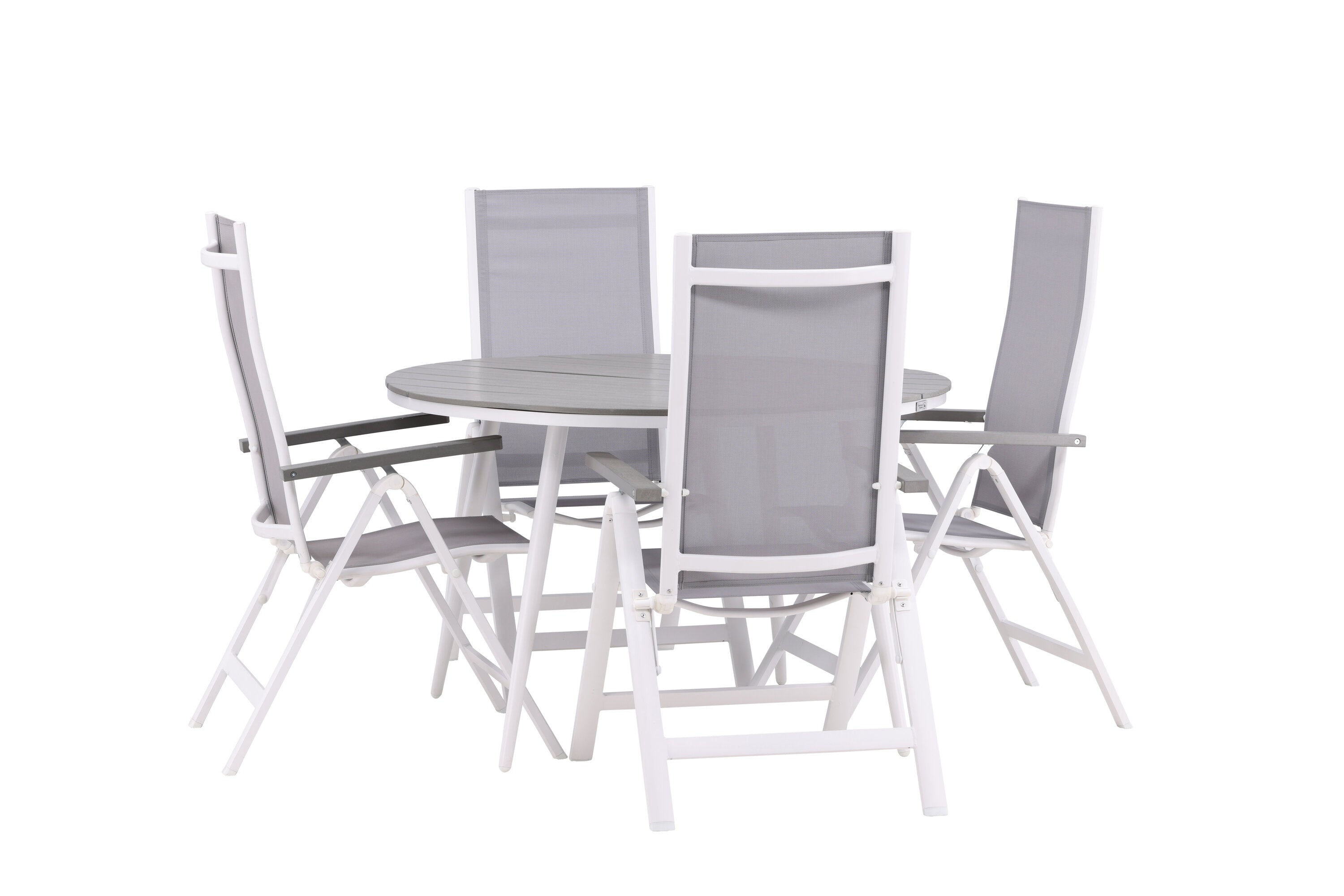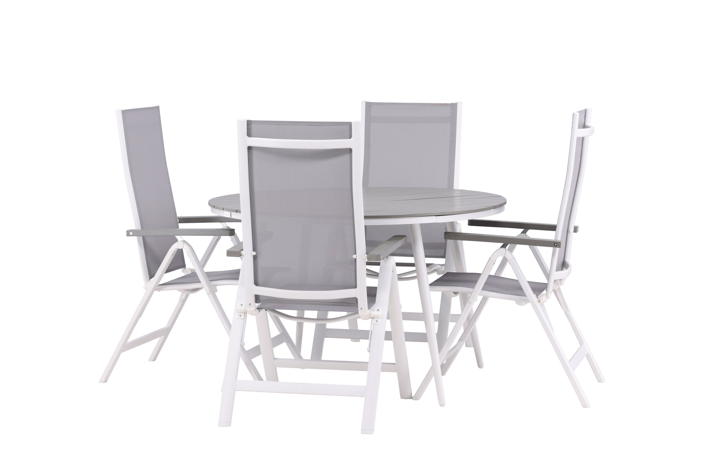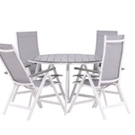 Lahodná sladká skupina jídel v příjemných barvách - ideální pro všechna letní venkovní jídla! Jídelní stůl Break má kruhovou desku stolu v šedé barvě Aintwood a klasický bílý hliníkový podvozek. Rozměry: 120ø cm. Zde spolu se 4 jídelními židlemi ze série Albany, židle se zaměřením na pohodlí a odolnost. Židle je šedá 5-polohová textilní židle s lahodnými područkami a bílou hliníkovou rámovou konstrukcí. Opěradlo je sklopné pro optimální pohodlí a relaxaci. Tady dlouho sedíte a užíváte si dobré jídlo!