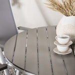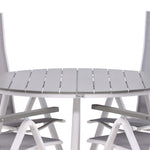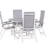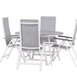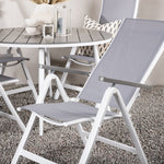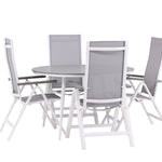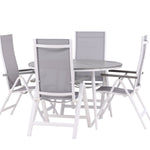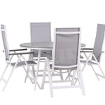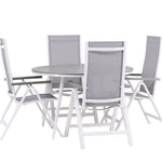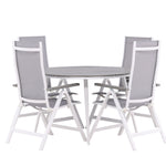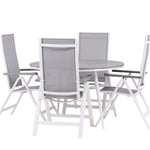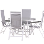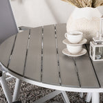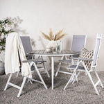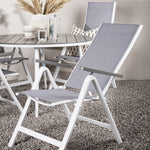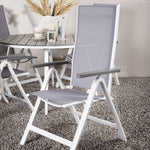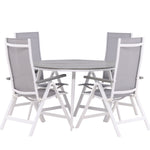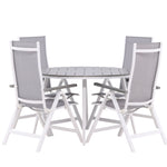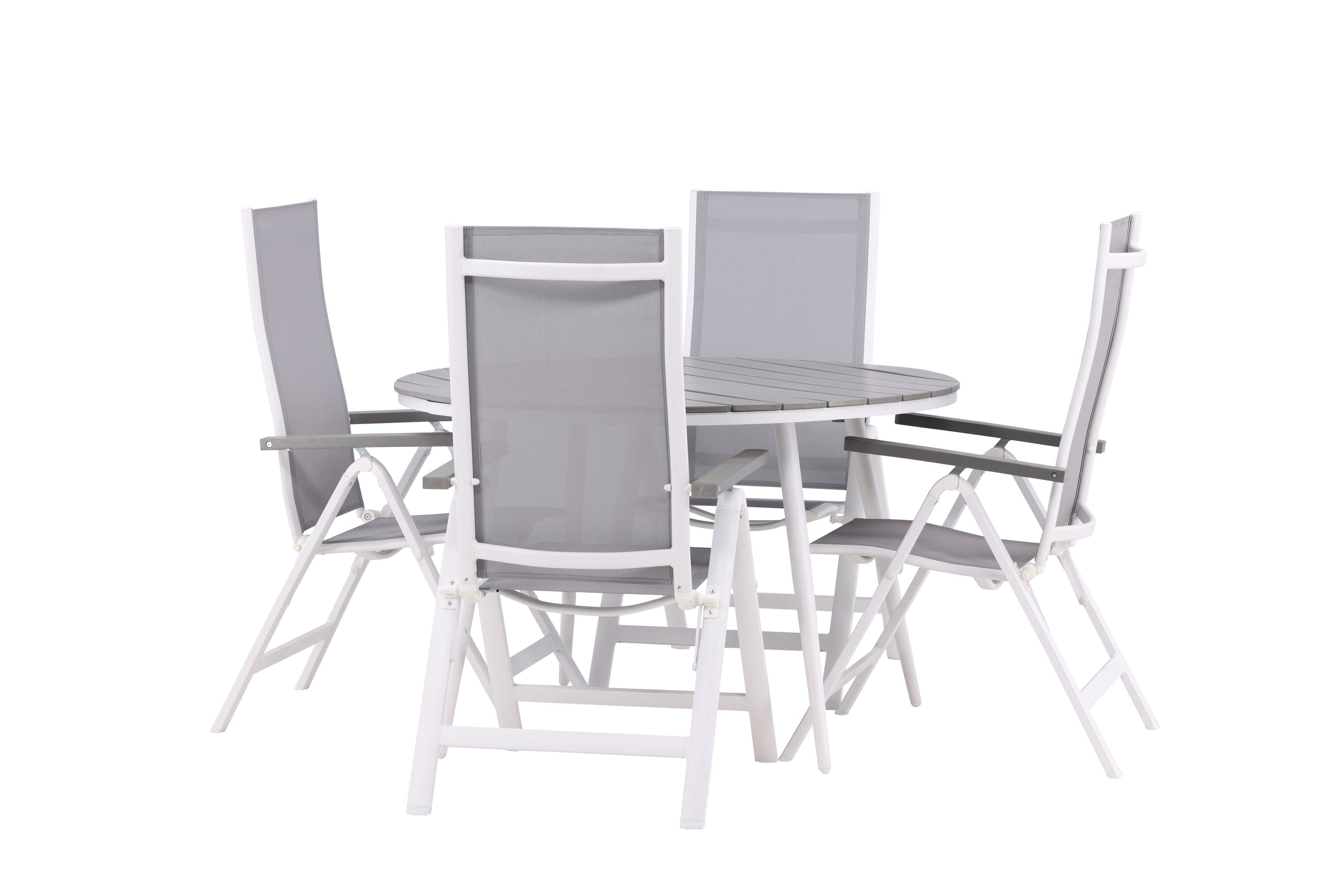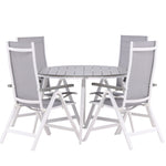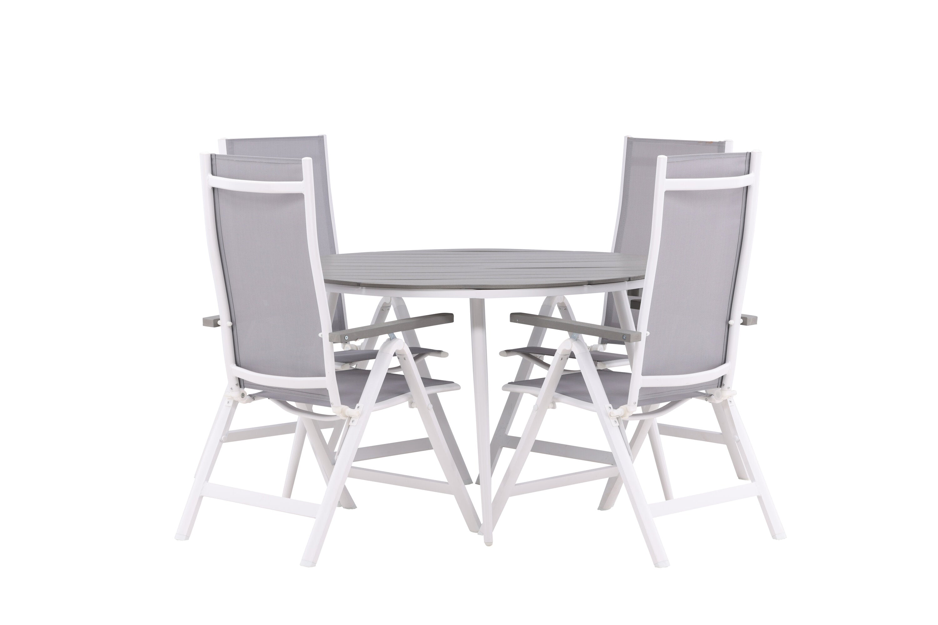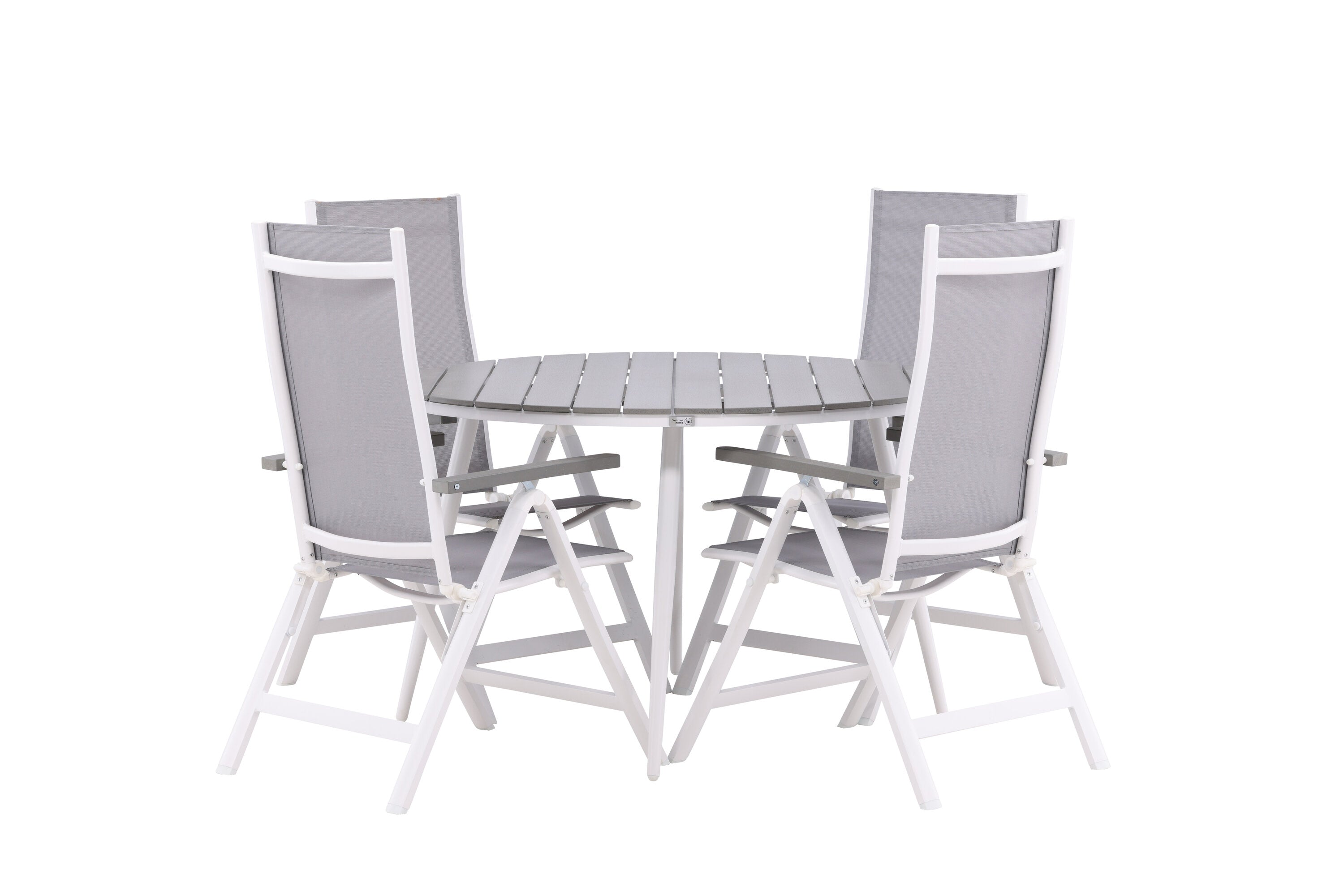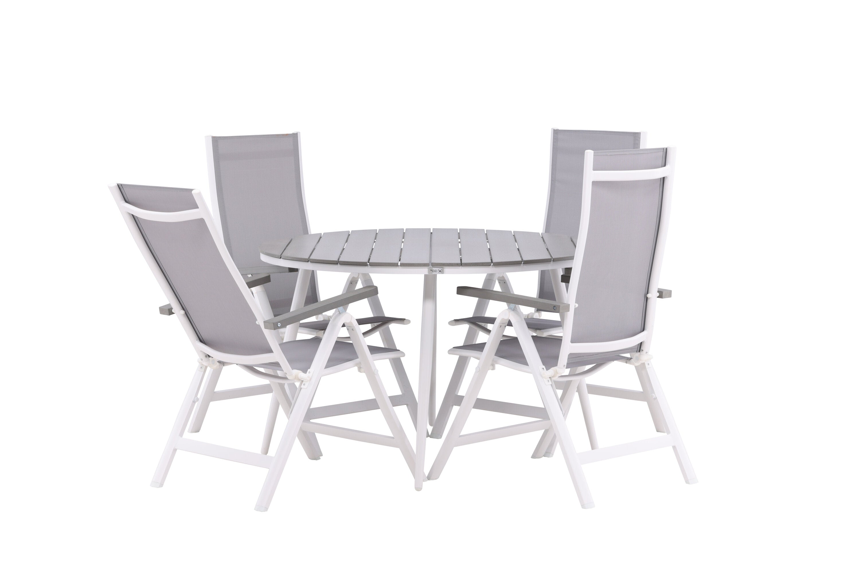 Lahodná sladká skupina jídel v příjemných barvách - ideální pro všechna letní venkovní jídla! Jídelní stůl Break má kruhovou desku stolu v šedé barvě Aintwood a klasický bílý hliníkový podvozek. Rozměry: 120ø cm. Zde spolu se 4 jídelními židlemi ze série Albany, židle se zaměřením na pohodlí a odolnost. Židle je šedá 5-polohová textilní židle s lahodnými područkami a bílou hliníkovou rámovou konstrukcí. Opěradlo je sklopné pro optimální pohodlí a relaxaci. Tady dlouho sedíte a užíváte si dobré jídlo!