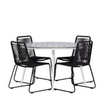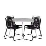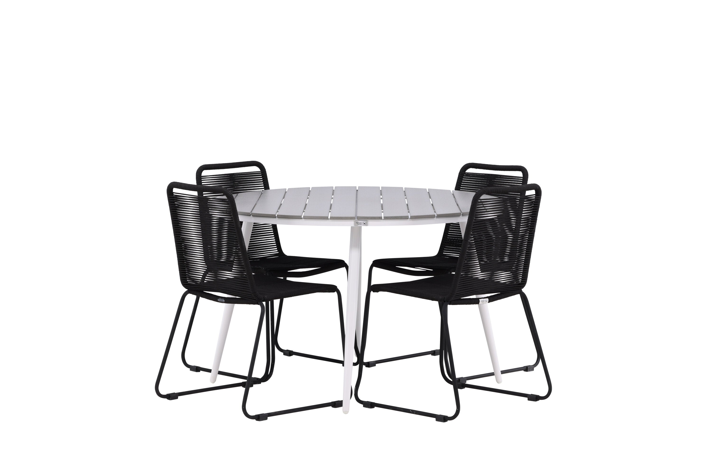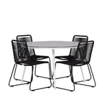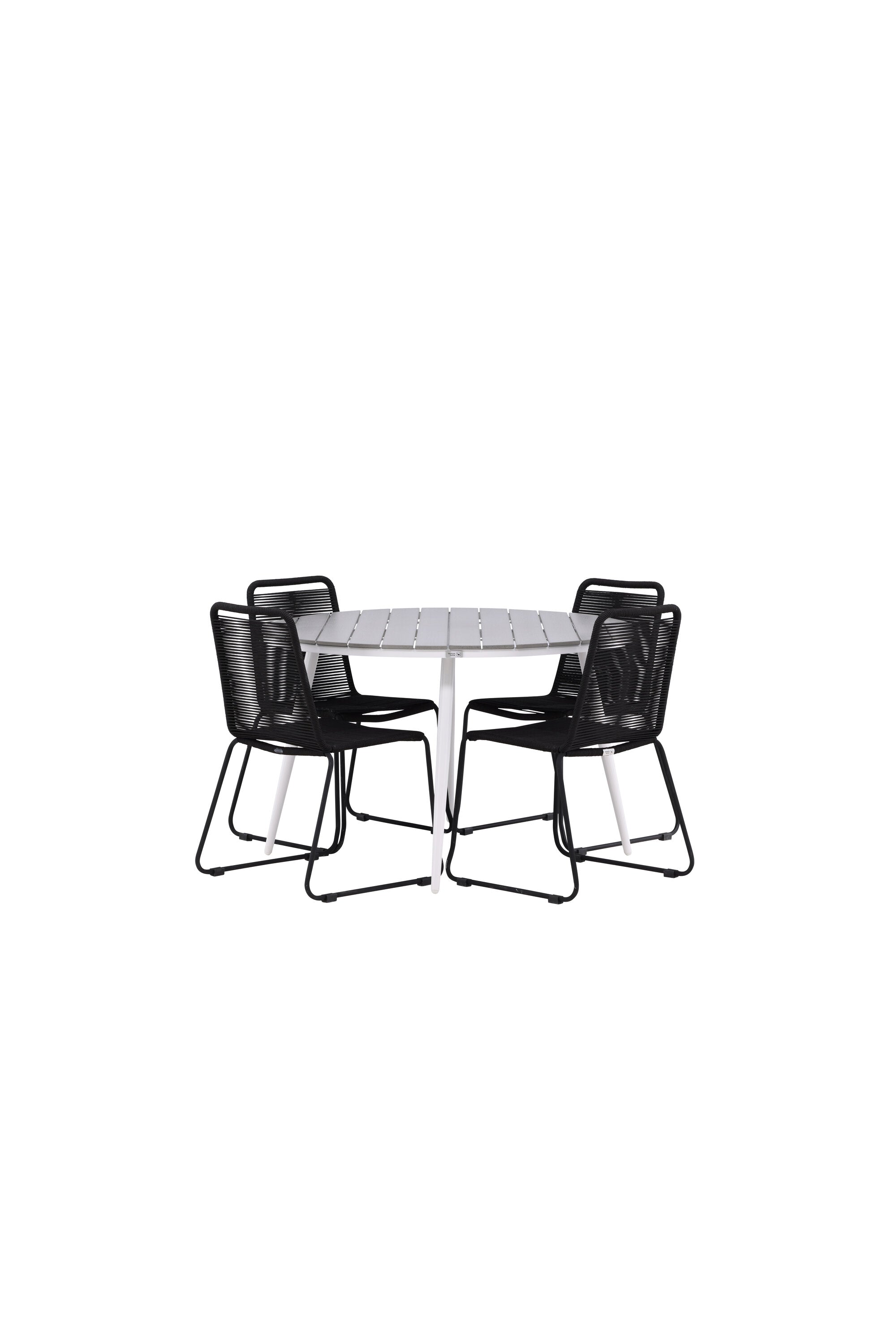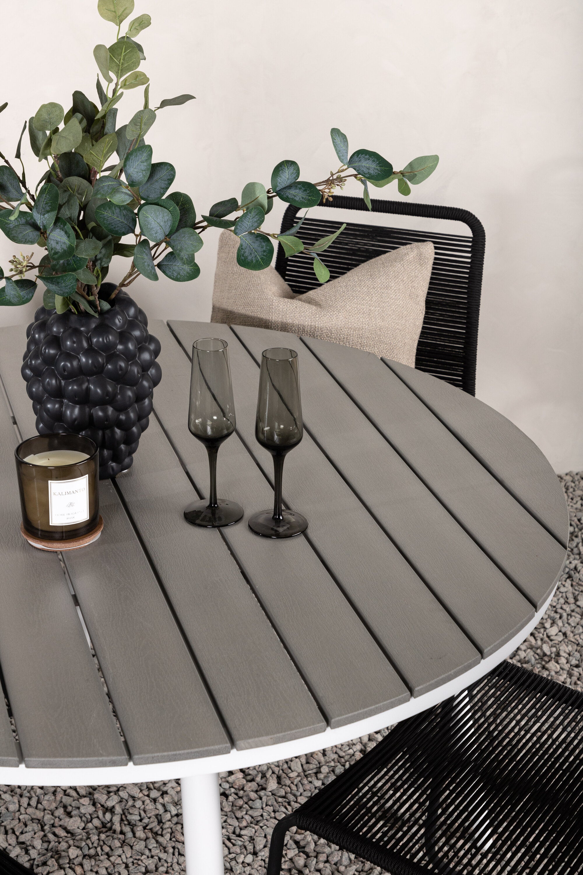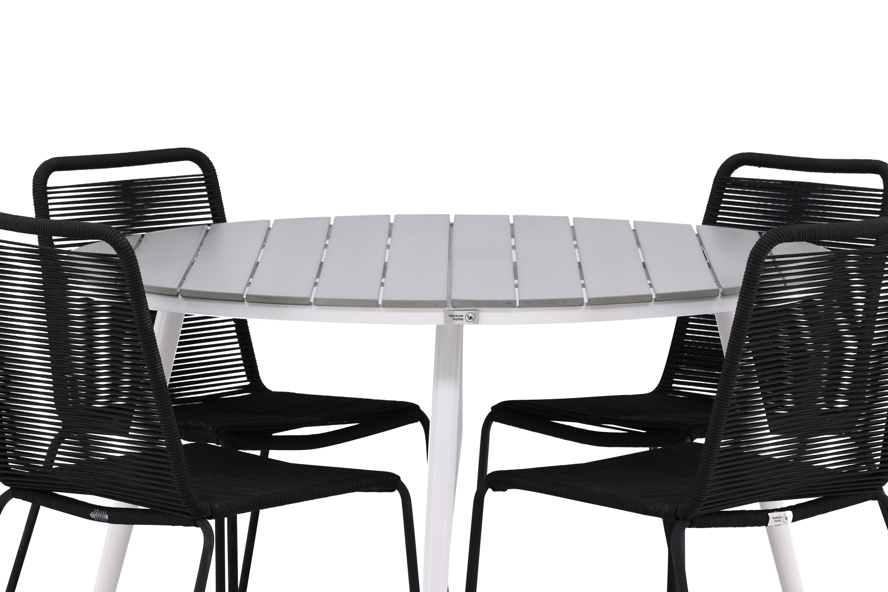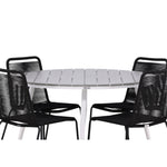 Kulatá skupina jídla je skvělá pro příjemné, příjemné a společenské chvíle! Jídelní stůl Break má kruhovou desku stolu v šedé barvě Aintwood a klasický bílý hliníkový podvozek. Zde spolu s trendy jídelními židlemi ze série Lindos v módním designu. Židle mají stylové úzké nohy z černého hliníku a sedák z odolného černého lana. Zařiďte nádvoří příjemně a vytvořte poutač, který zaujme!