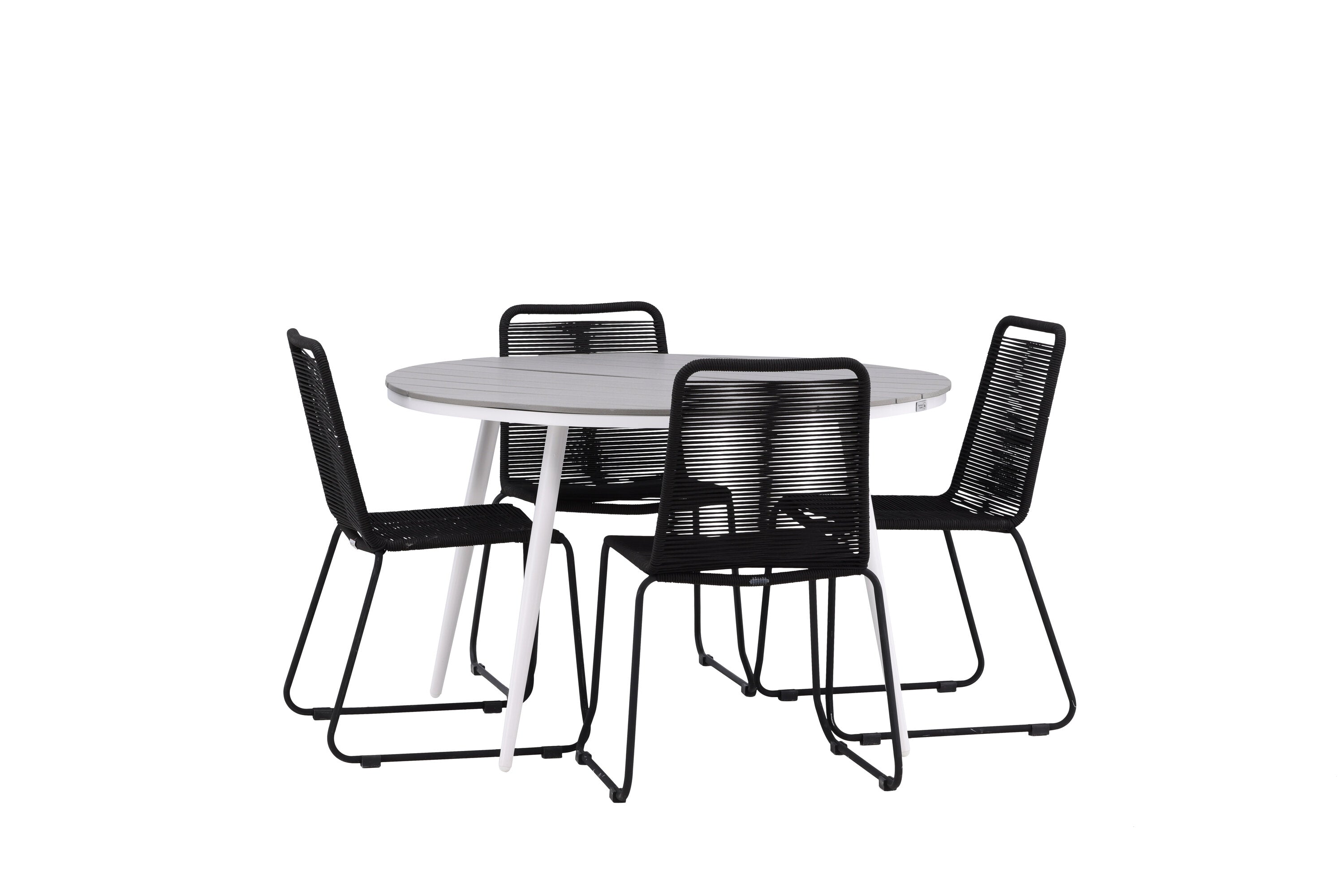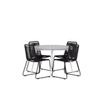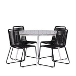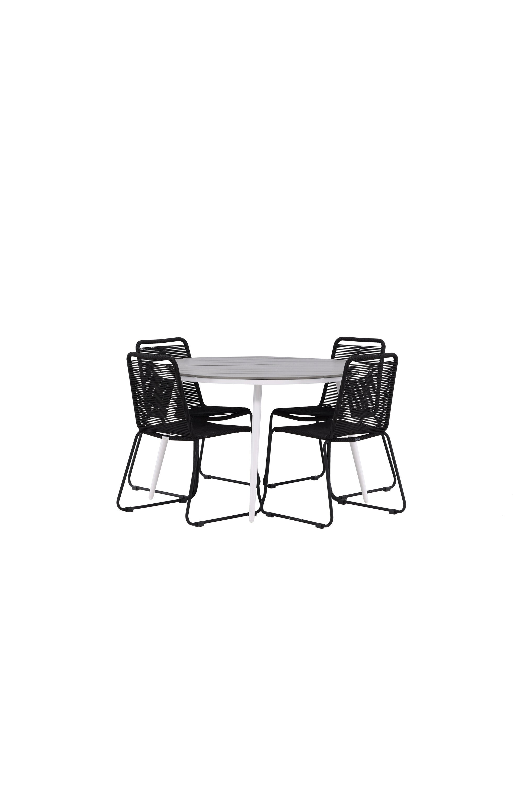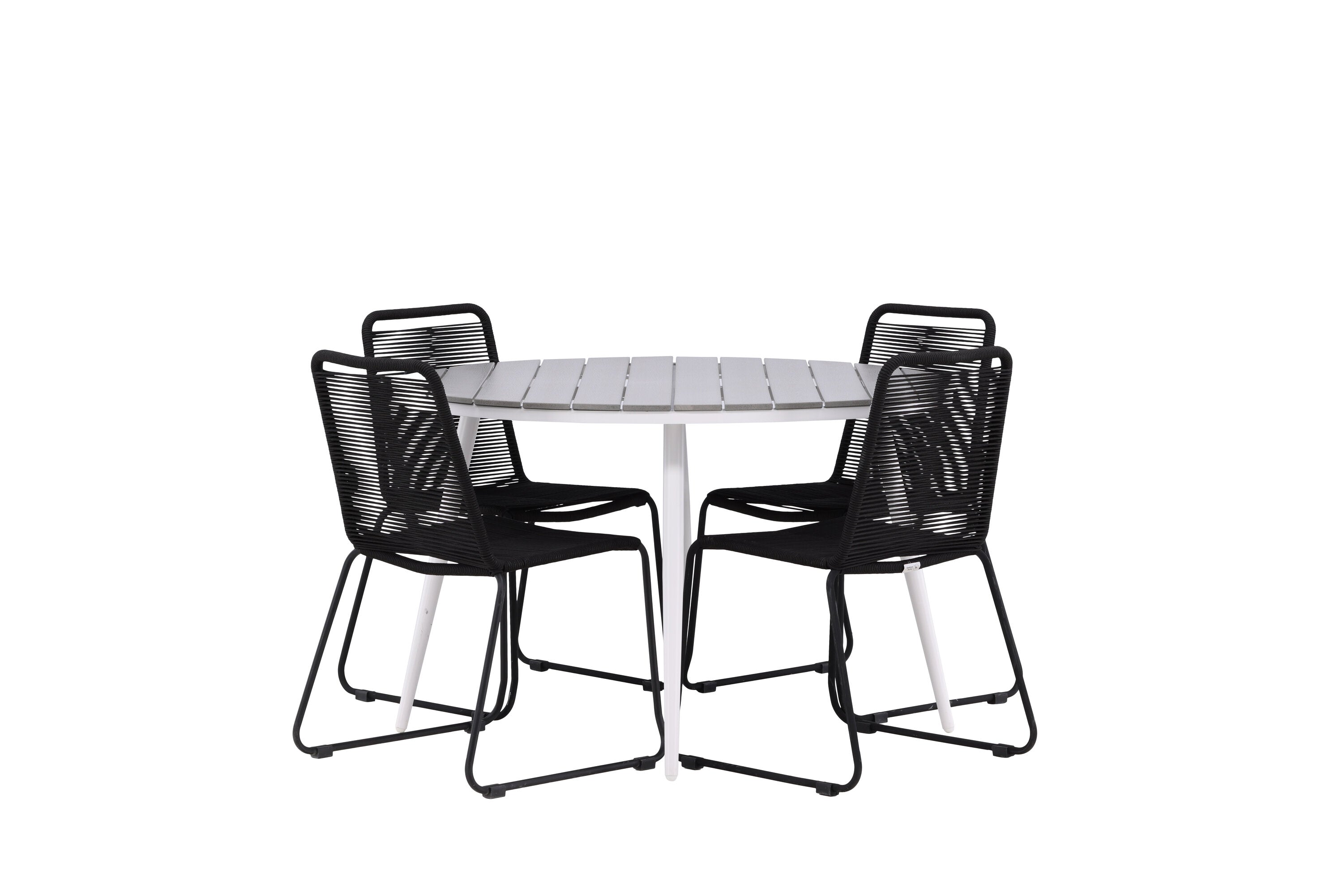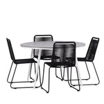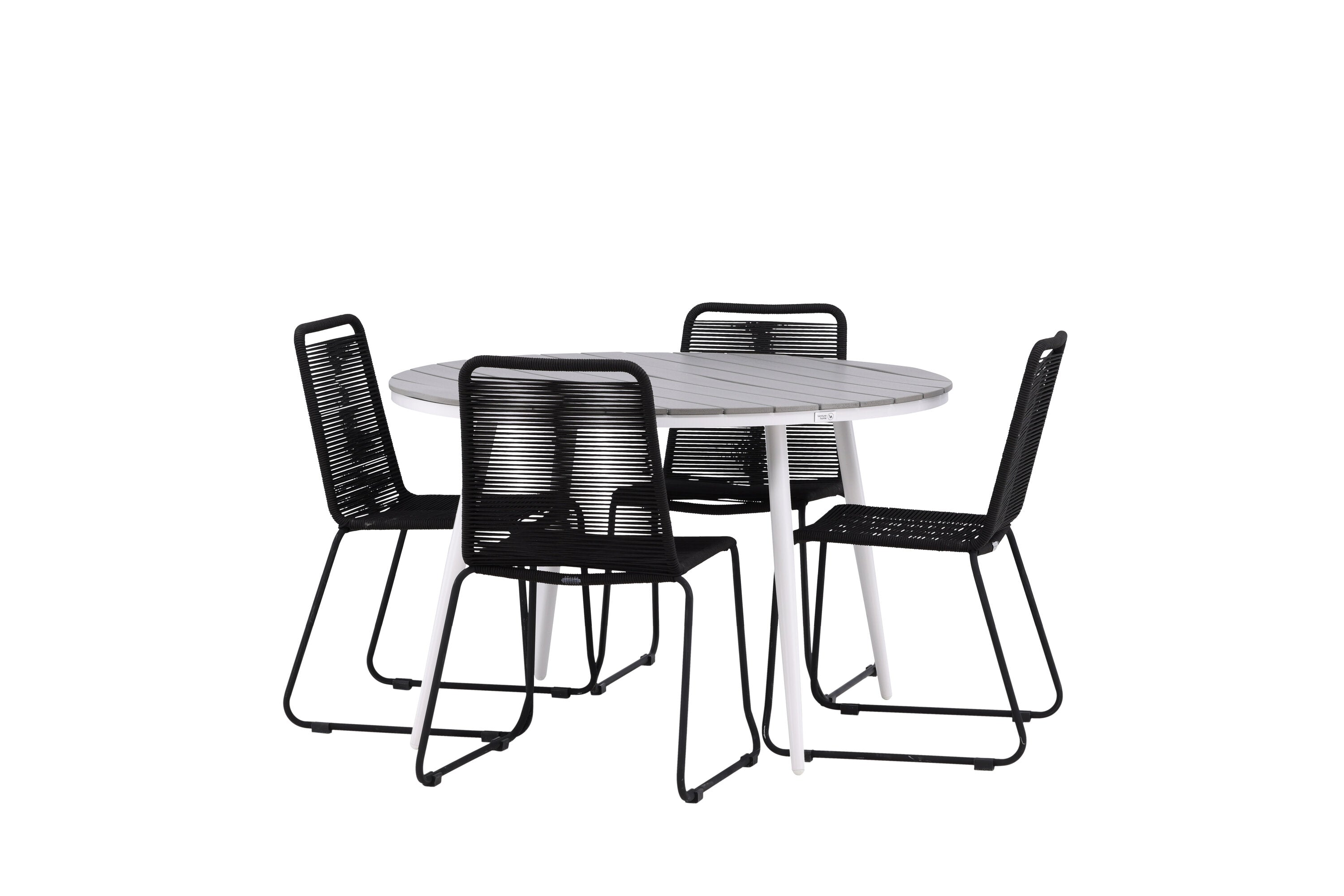 Kulatá skupina jídla je skvělá pro příjemné, příjemné a společenské chvíle! Jídelní stůl Break má kruhovou desku stolu v šedé barvě Aintwood a klasický bílý hliníkový podvozek. Zde spolu s trendy jídelními židlemi ze série Lindos v módním designu. Židle mají stylové úzké nohy z černého hliníku a sedák z odolného černého lana. Zařiďte nádvoří příjemně a vytvořte poutač, který zaujme!