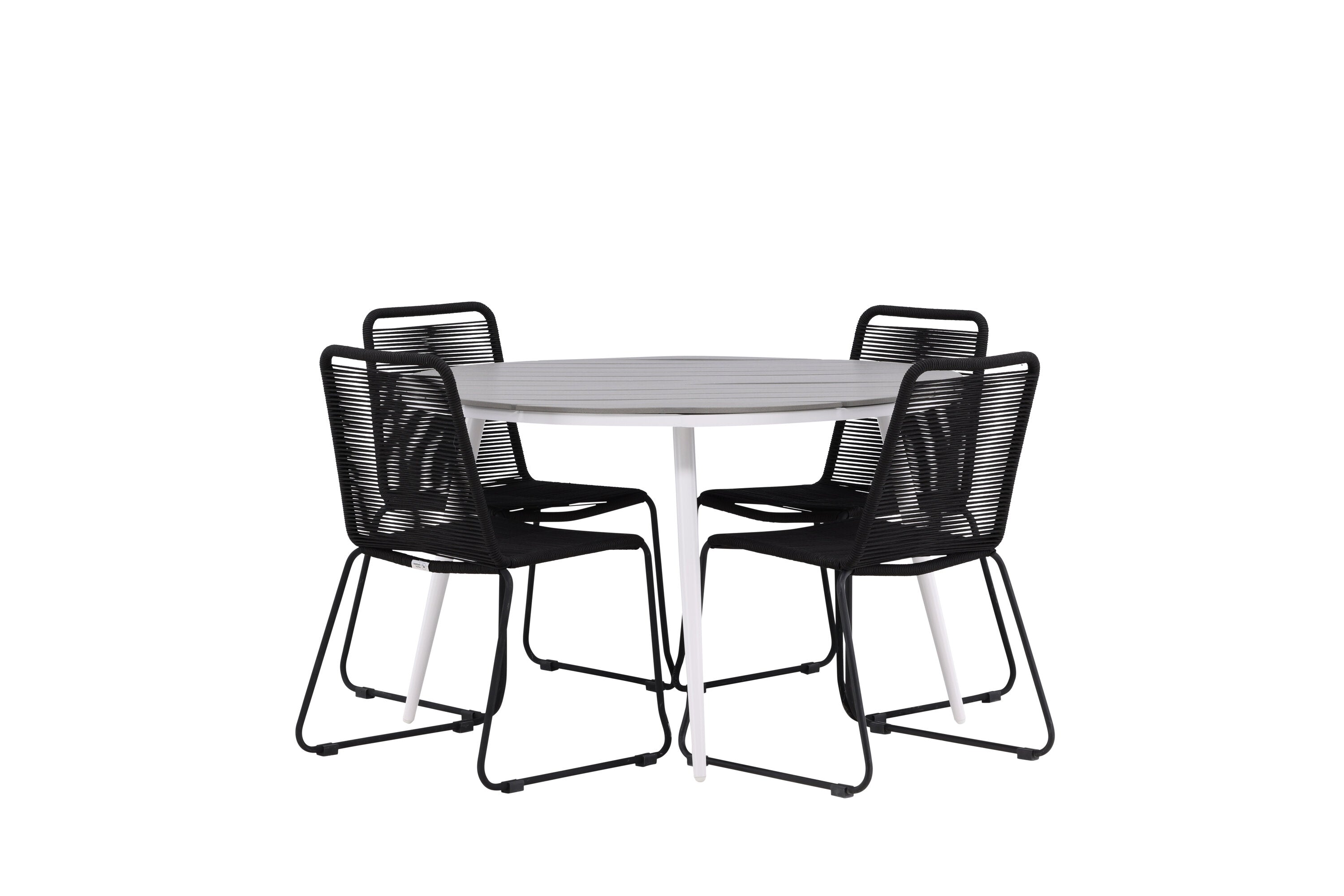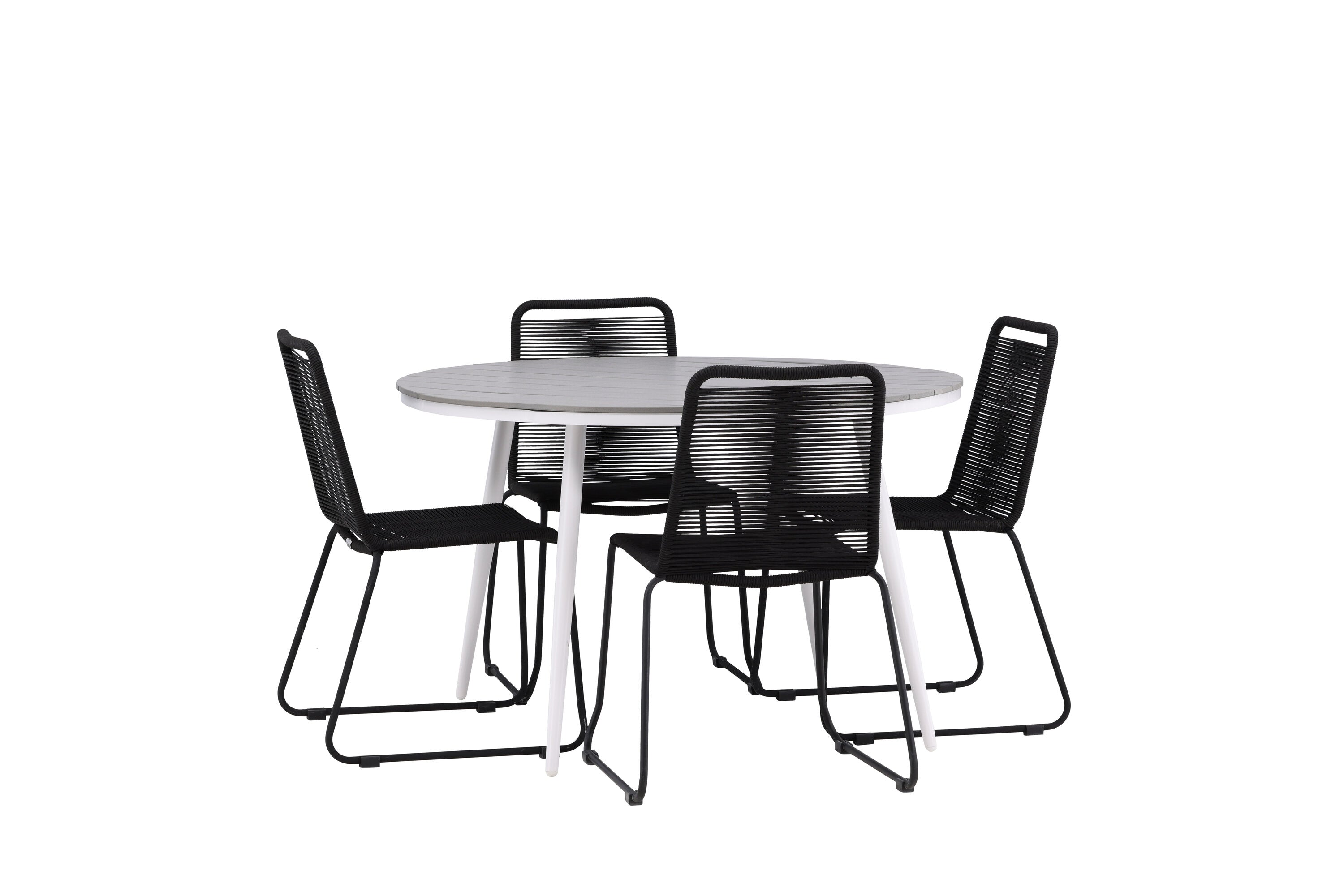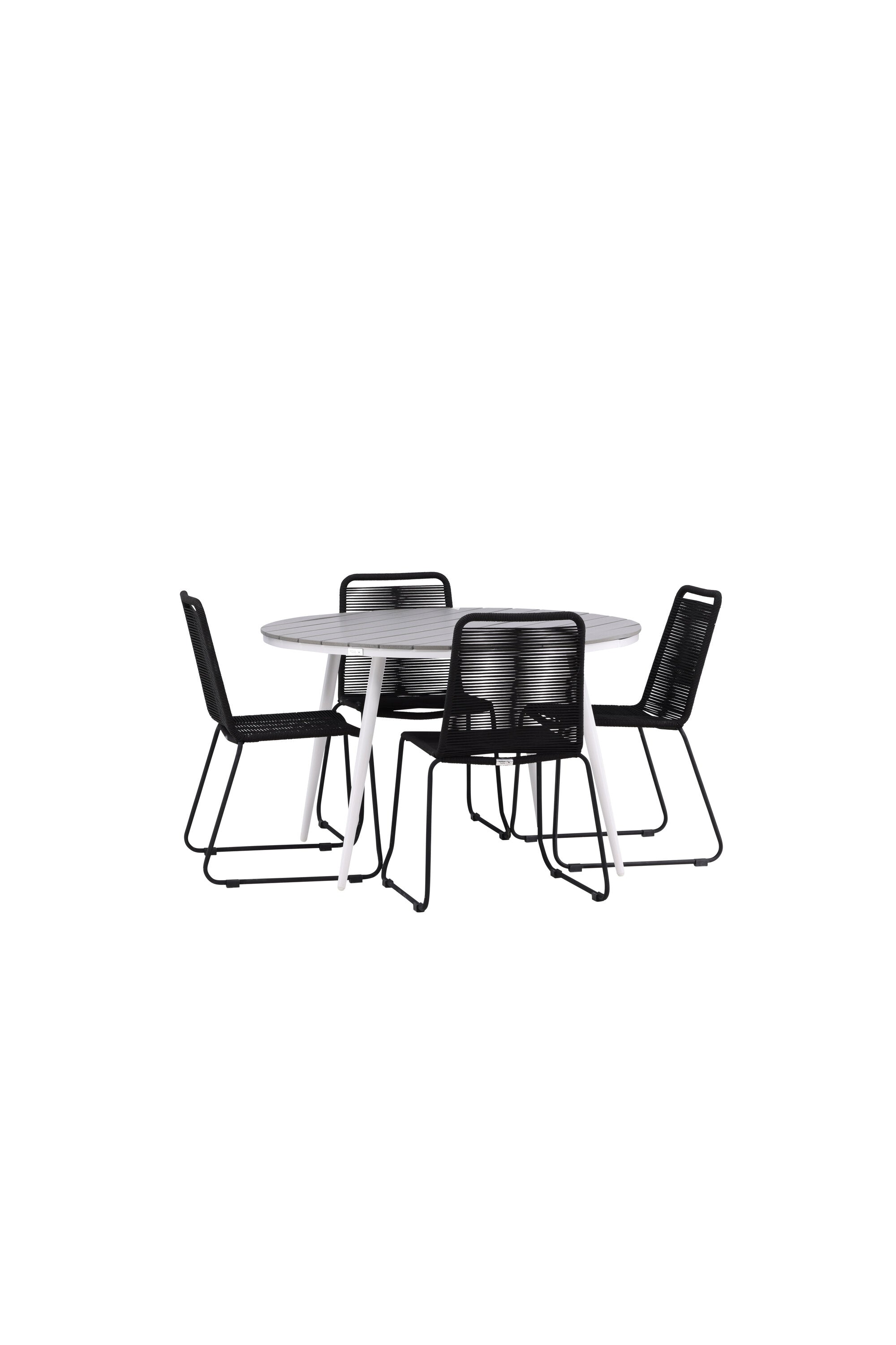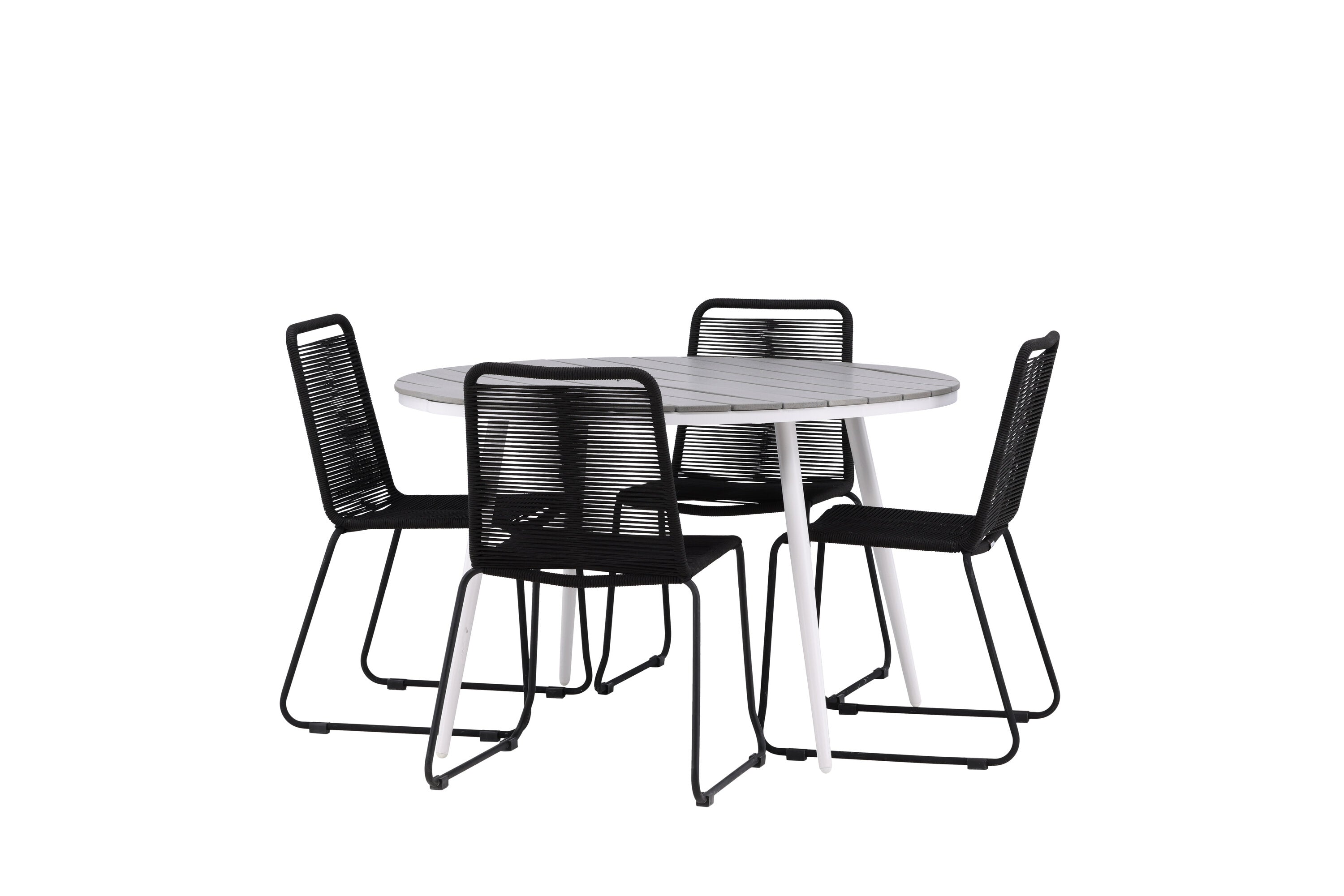 Kulatá skupina jídla je skvělá pro příjemné, příjemné a společenské chvíle! Jídelní stůl Break má kruhovou desku stolu v šedé barvě Aintwood a klasický bílý hliníkový podvozek. Zde spolu s trendy jídelními židlemi ze série Lindos v módním designu. Židle mají stylové úzké nohy z černého hliníku a sedák z odolného černého lana. Zařiďte nádvoří příjemně a vytvořte poutač, který zaujme!