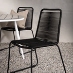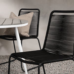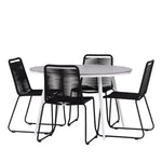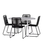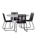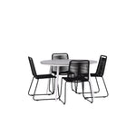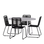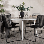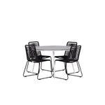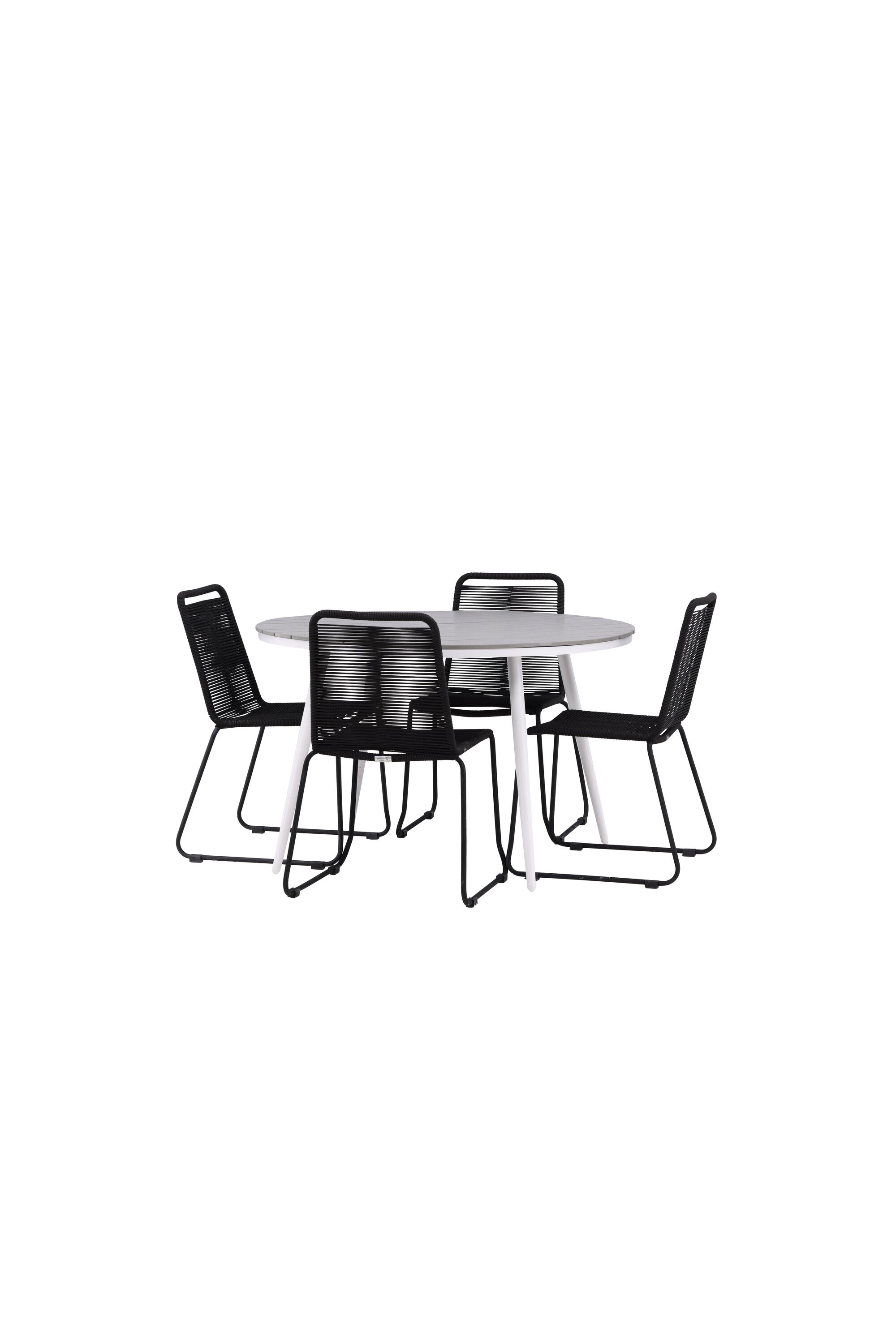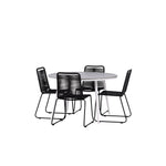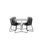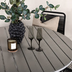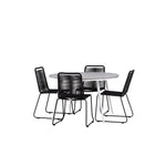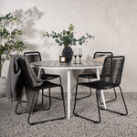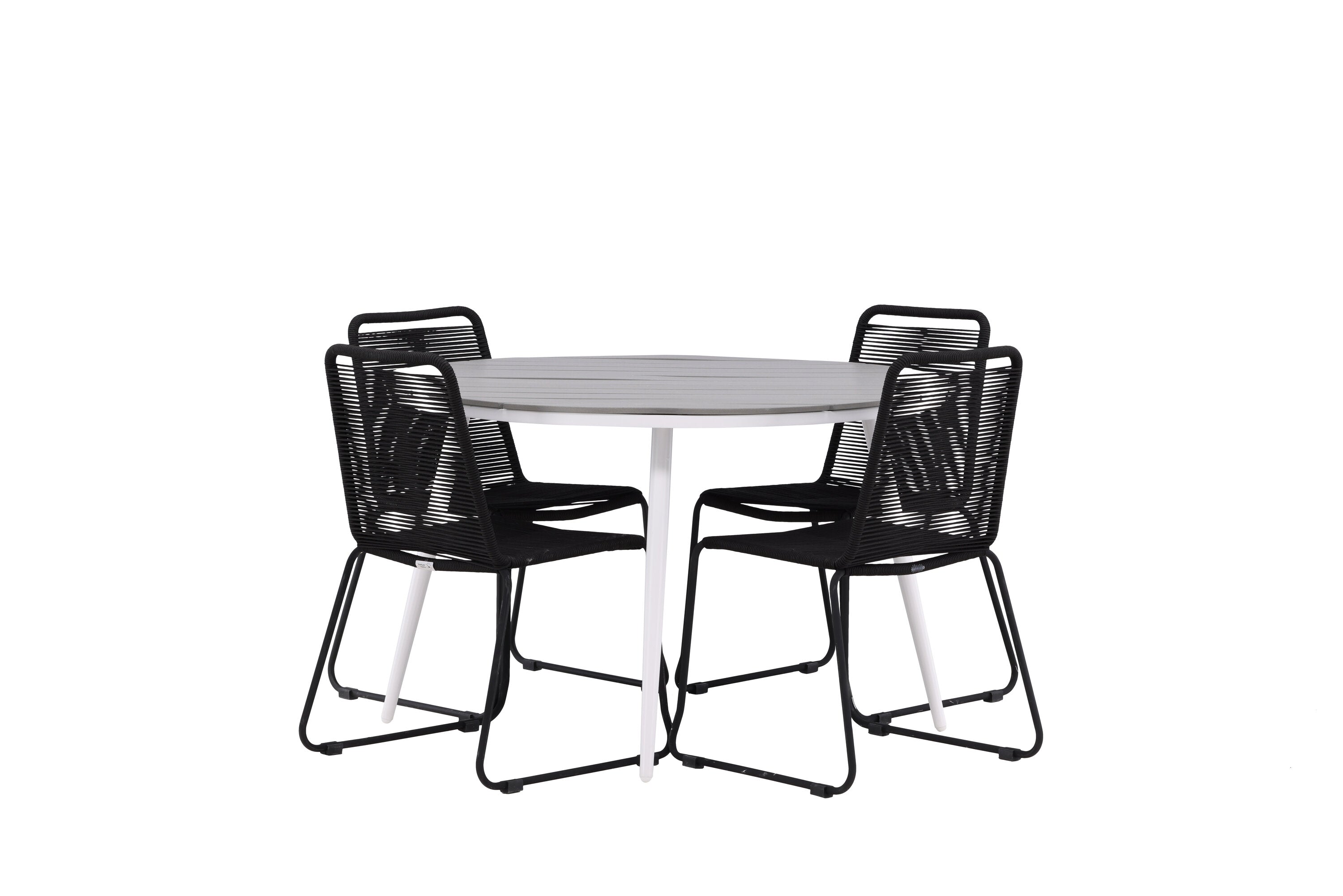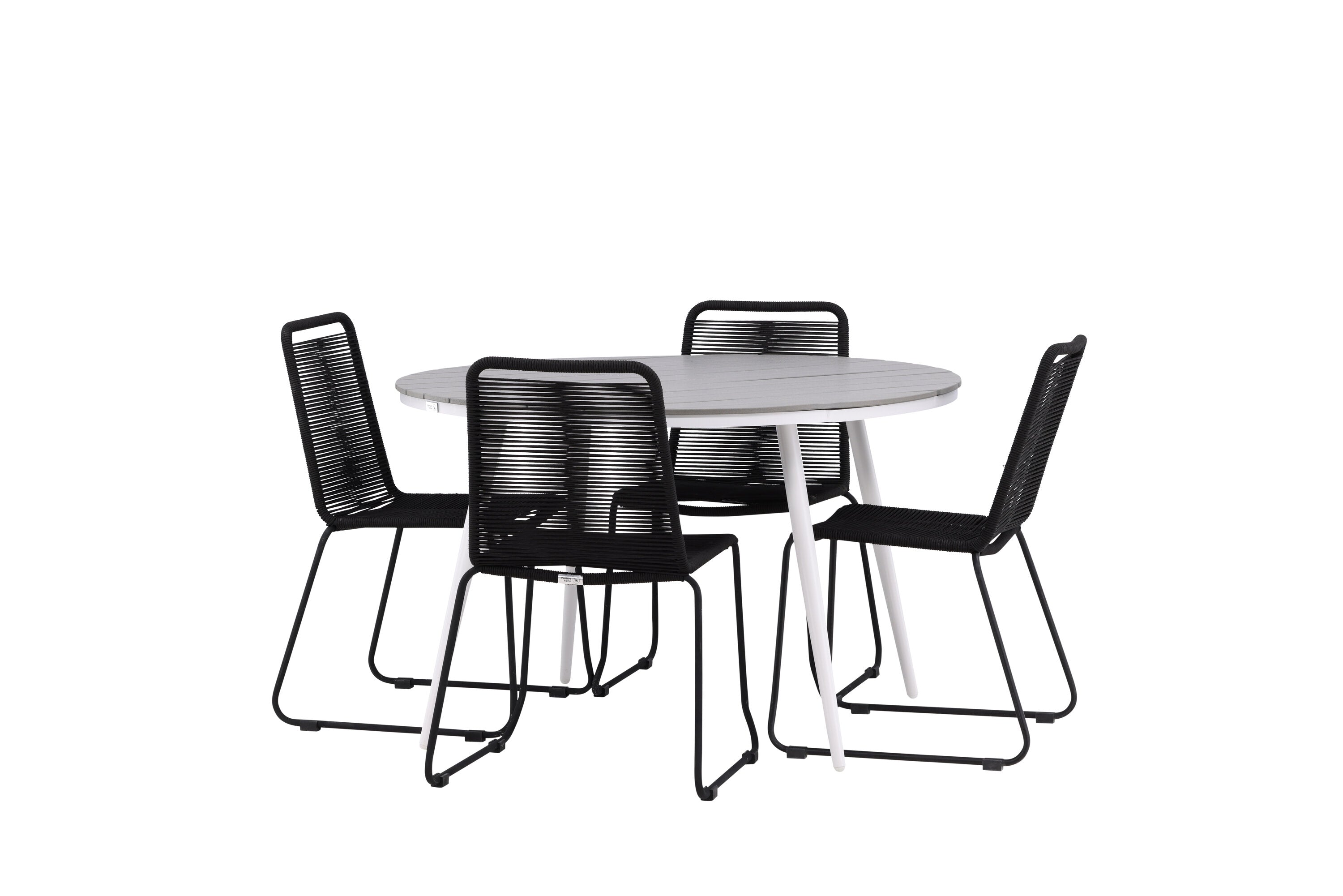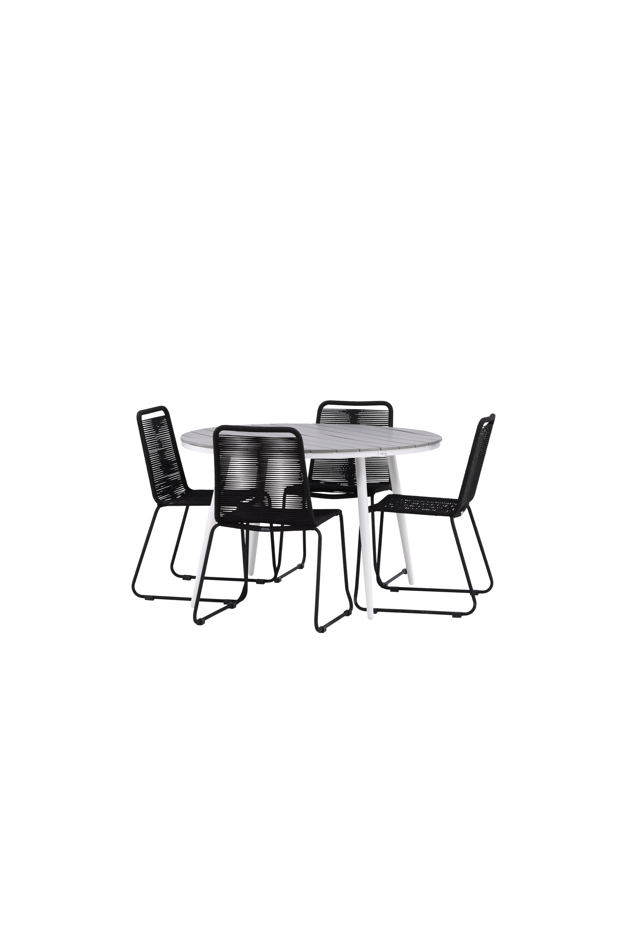 Kulatá skupina jídla je skvělá pro příjemné, příjemné a společenské chvíle! Jídelní stůl Break má kruhovou desku stolu v šedé barvě Aintwood a klasický bílý hliníkový podvozek. Zde spolu s trendy jídelními židlemi ze série Lindos v módním designu. Židle mají stylové úzké nohy z černého hliníku a sedák z odolného černého lana. Zařiďte nádvoří příjemně a vytvořte poutač, který zaujme!