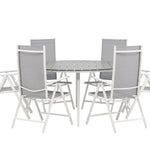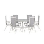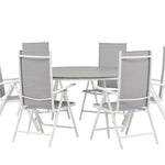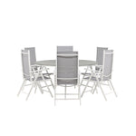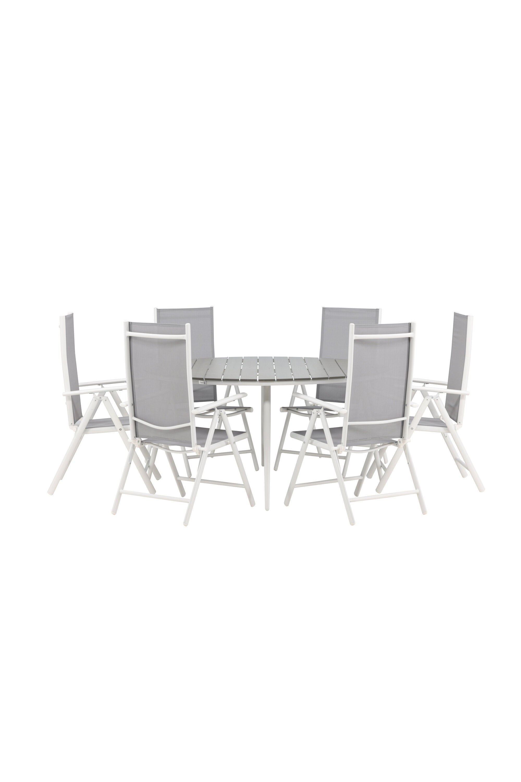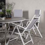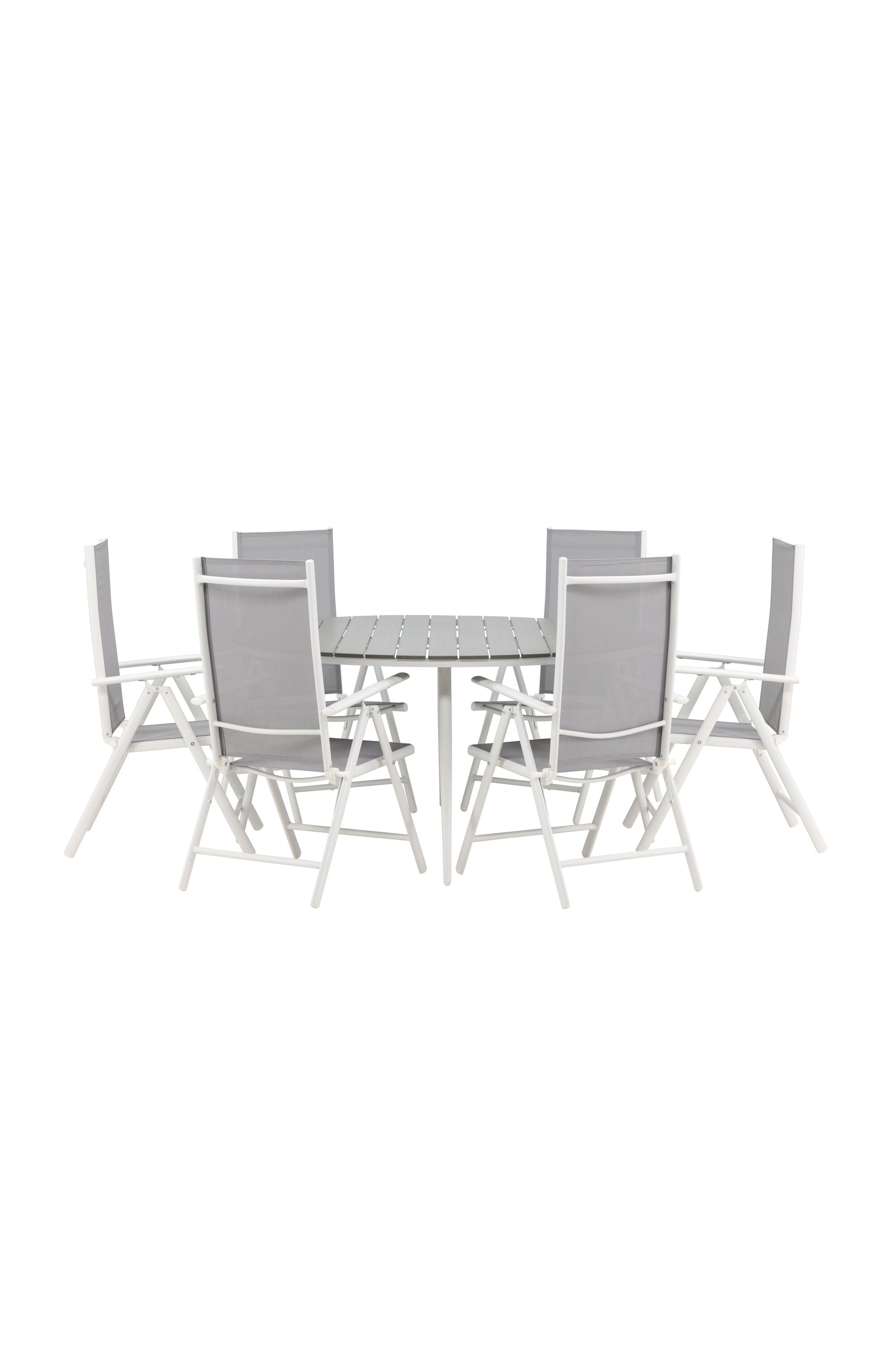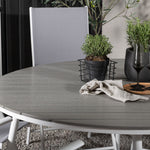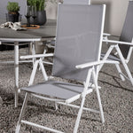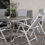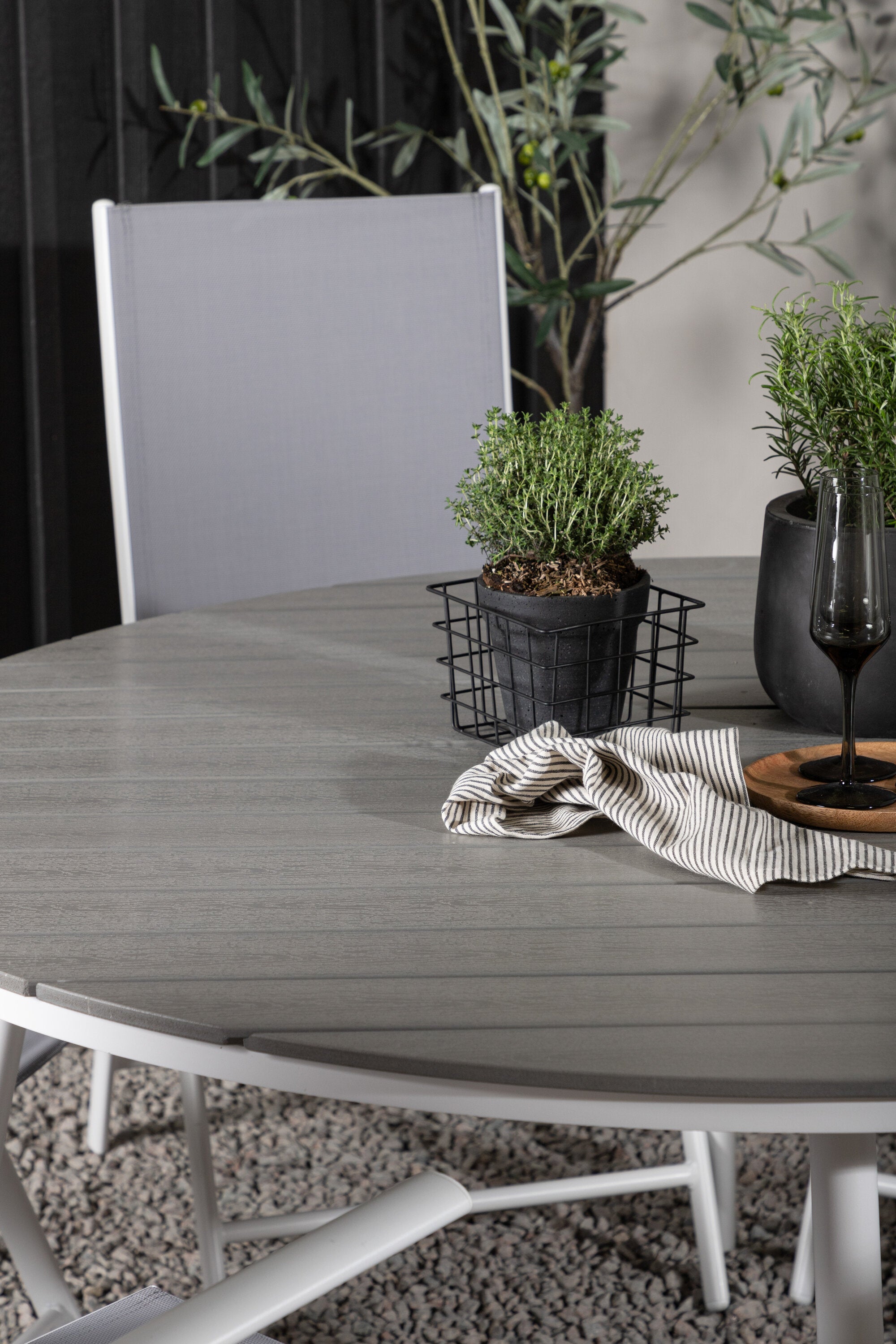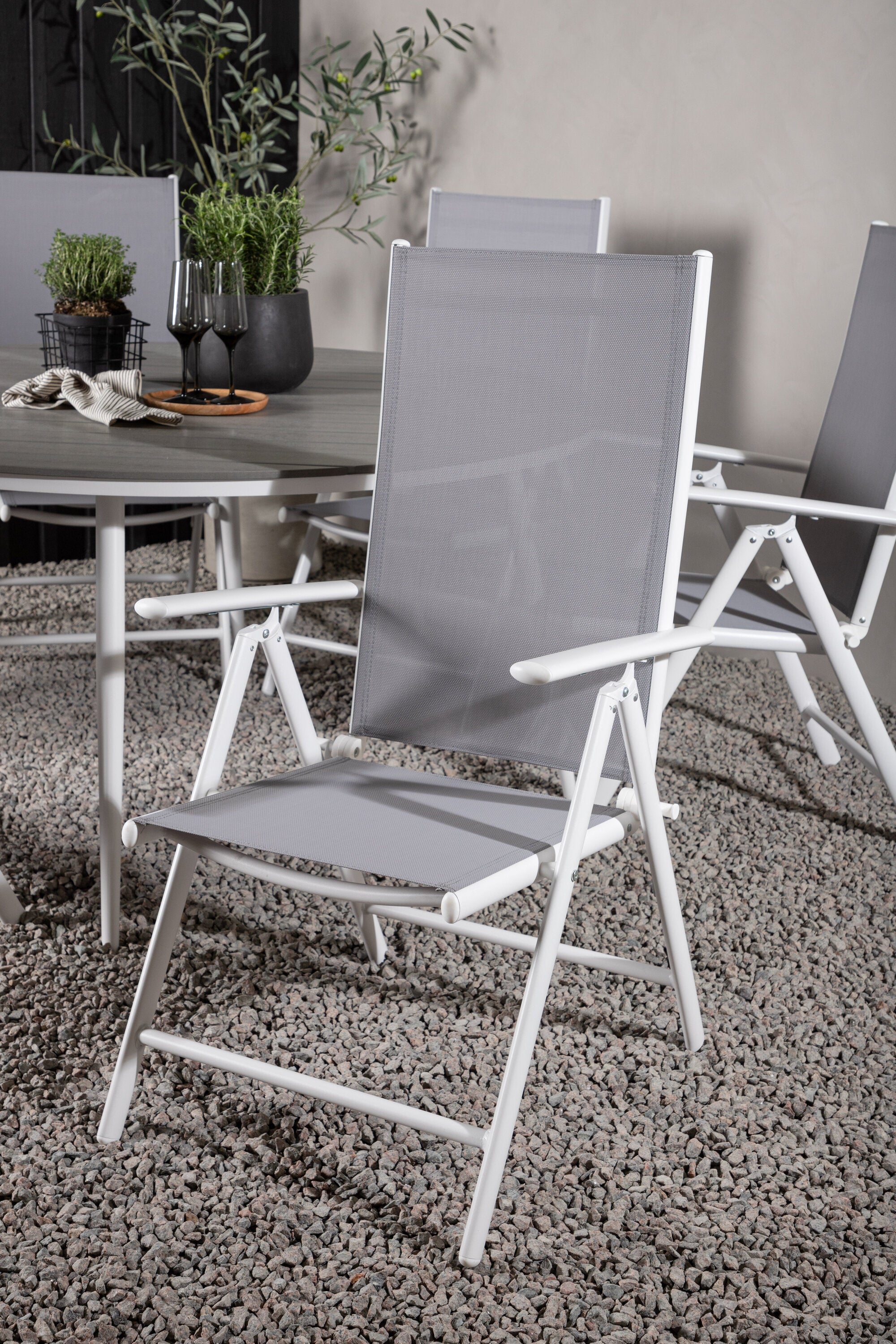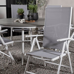 Vhodná skupina potravin ze série Break je přesně to, co terasa toto léto potřebuje! Jídelní stůl Break má kruhovou desku stolu v šedé barvě Aintwood a klasický bílý hliníkový podvozek. Zde společně se 6 jídelními židlemi ze stejné série. Židle je šedá 5-polohová židle s područkami pro větší pohodlí a bílou hliníkovou rámovou konstrukcí. Opěradlo je sklopné pro optimální pohodlí a relaxaci. Tady sedíte dlouho a užívejte si!