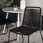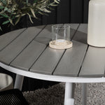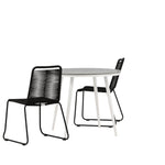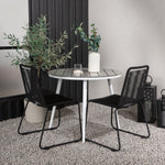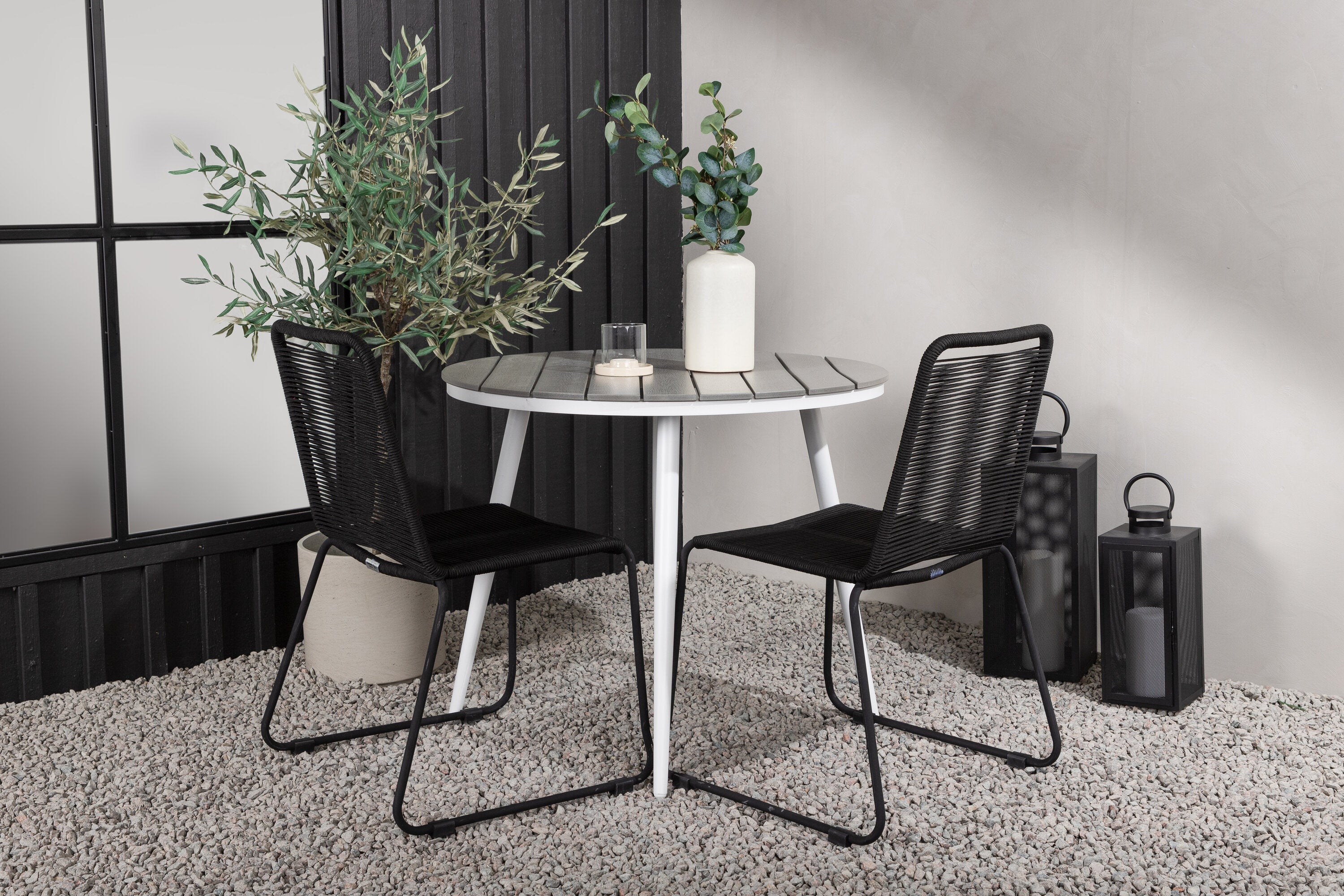 Pohodlná, příjemná a hezká kavárenská skupina v černé barvě se toto léto skvěle hodí na terasu! Stůl Break má kulatou desku stolu v šedé barvě Aintwood a klasický bílý hliníkový podvozek. Zde v dokonalé kombinaci se štíhlými židlemi ze série Lindos. Židle mají stylové úzké nohy z černého hliníku a sedák z odolného černého lana. Je také stohovatelné pro praktické skladování. Toto je lákavá skupina jídla pro dva, která zaručeně prodlouží příjemné chvíle tohoto léta!
