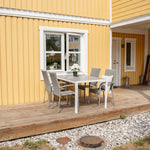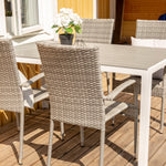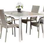 Nedělejte kompromisy mezi stylem a pohodlím! Obdélníkový jídelní stůl Break má rovné tvary v klasickém severském designu s deskou stolu z šedé překližky a nohami stolu z bílého hliníku. Zde společně s pohodlnými jídelními židlemi ze série Anna. Židle má hliníkový rám a je čalouněná pleteným umělým ratanem šedé barvy. Prodlužte si letní jídla při posezení v pohodlné a útulné jídelně! Rozměry stolu: 150x90cm.