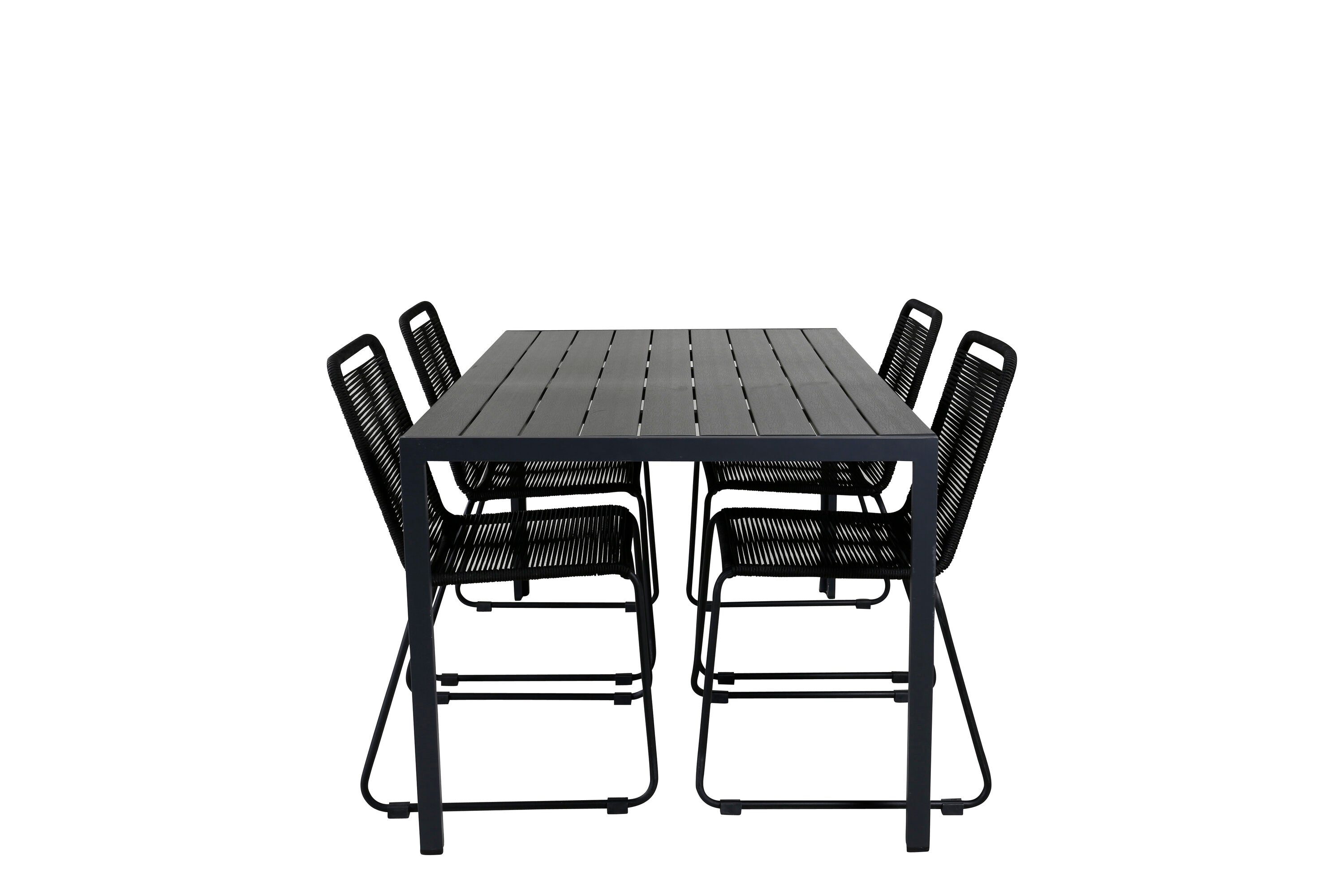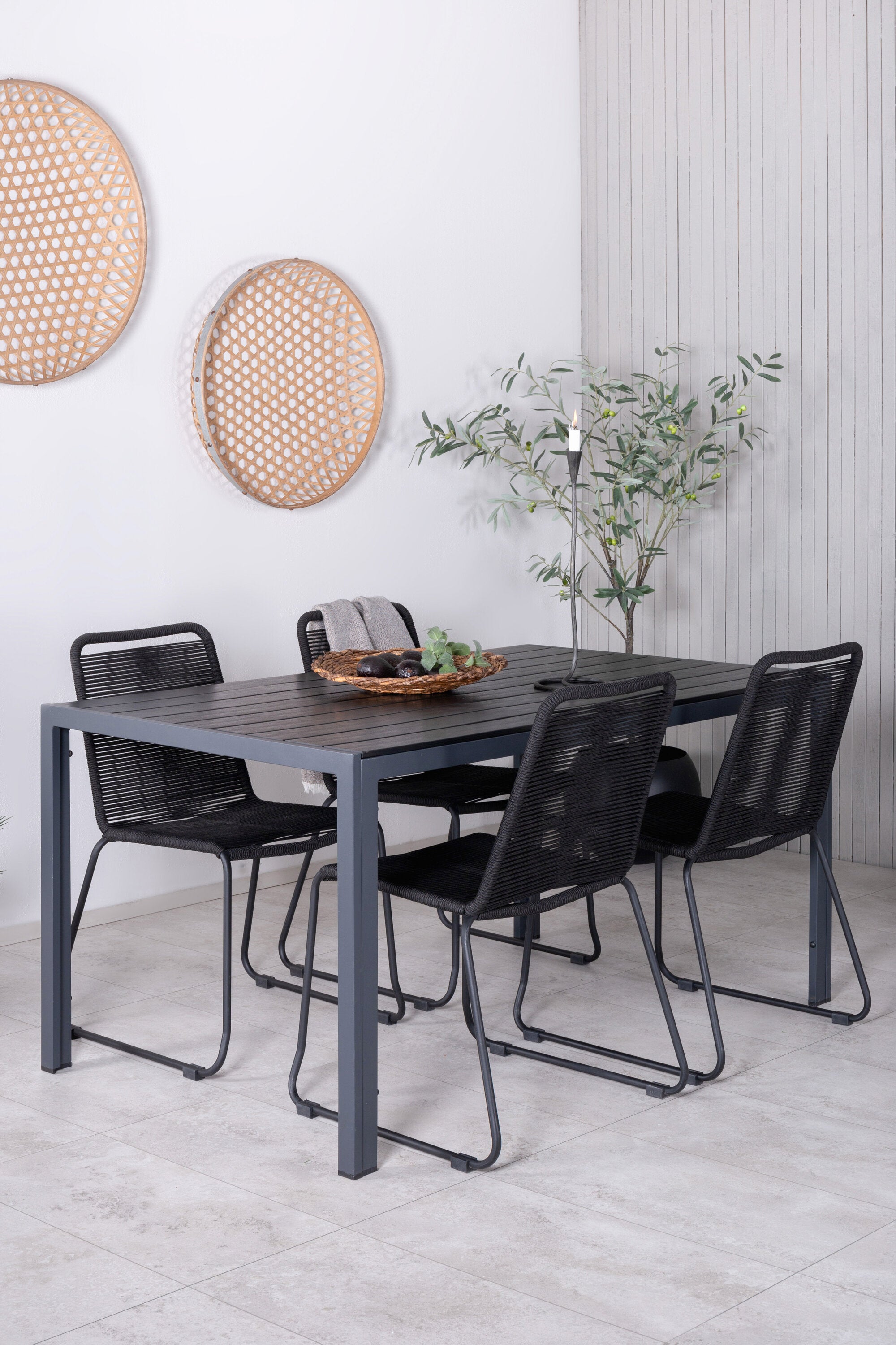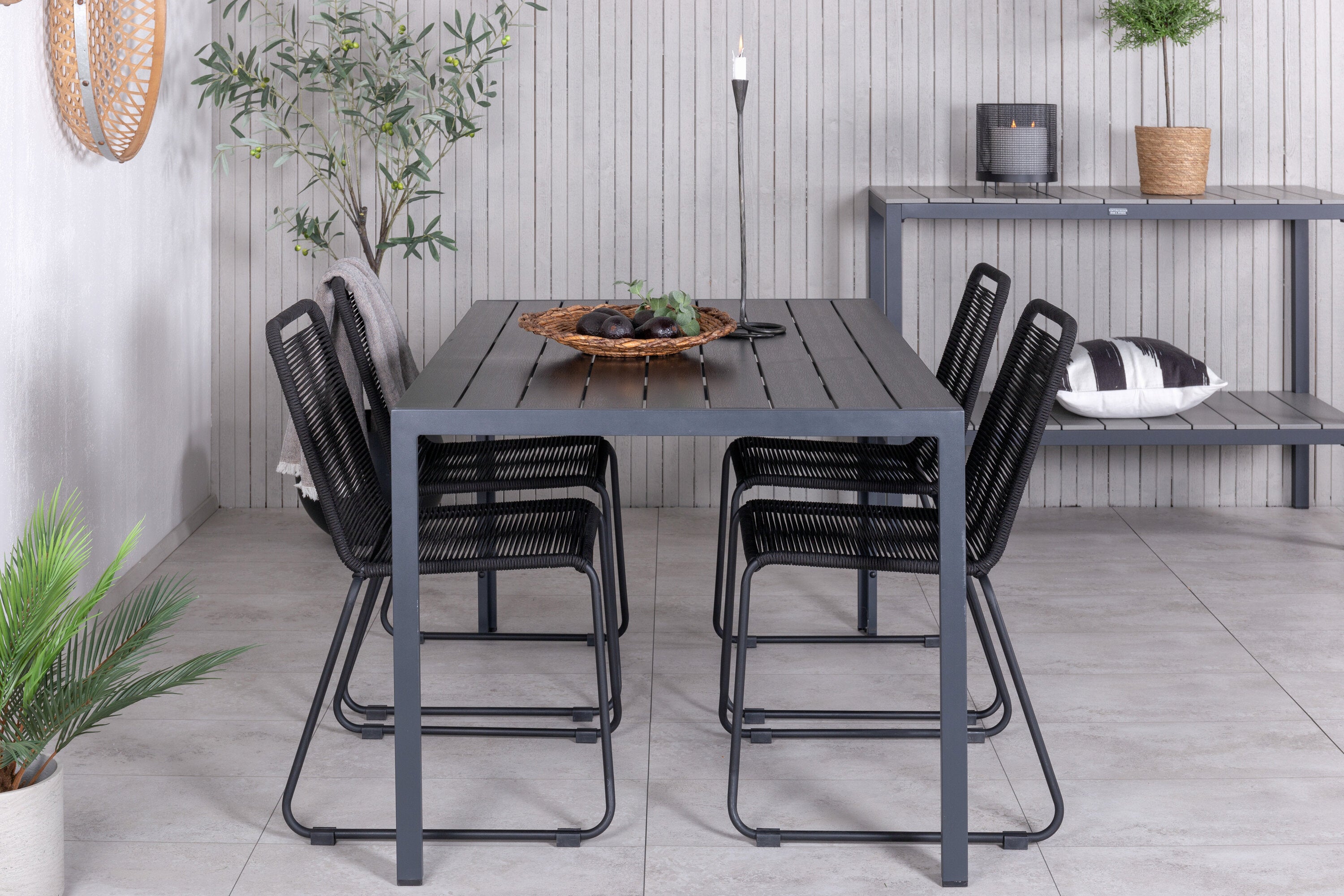 Vytvořte si stylovou atmosféru ve venkovním prostoru pomocí poutavé skupiny jídel v moderním duchu! Naše oblíbené jídelní židle Lindos svým minimalistickým designem opravdu udávají tón. Židle jsou stohovatelné pro praktické skladování a jsou vyrobeny v úzké, černé hliníkové konstrukci se sedákem z černého tkaného lana. Zde spolu s naším obdélníkovým jídelním stolem zlom v přímé severské podobě. Deska stolu je z černé překližky a hliníkového podvozku. Jednoduše dobře promyšlená skupina potravin, se kterou snadno vytvoříte okouzlující venkovní prostředí!