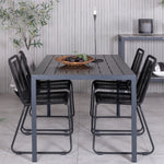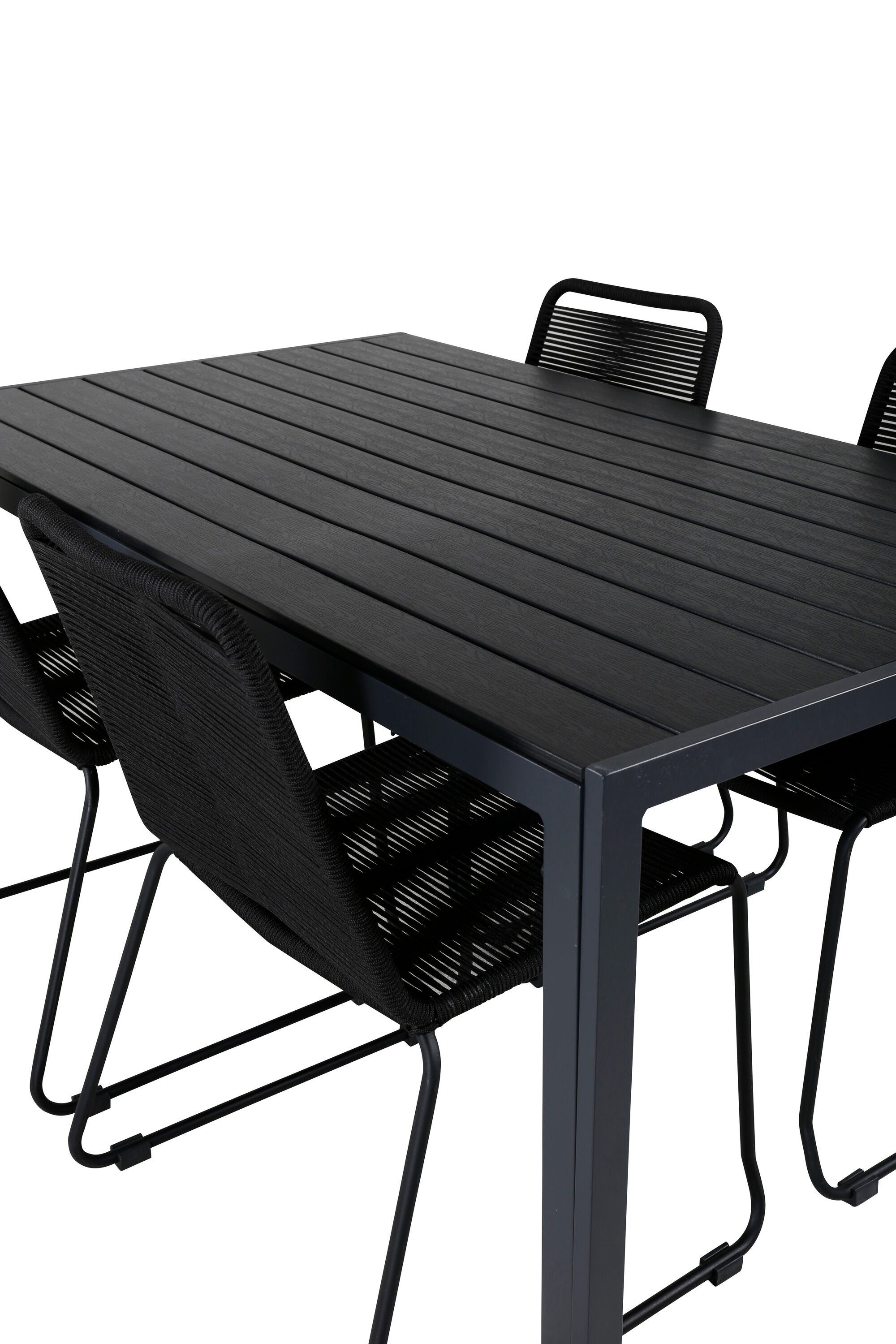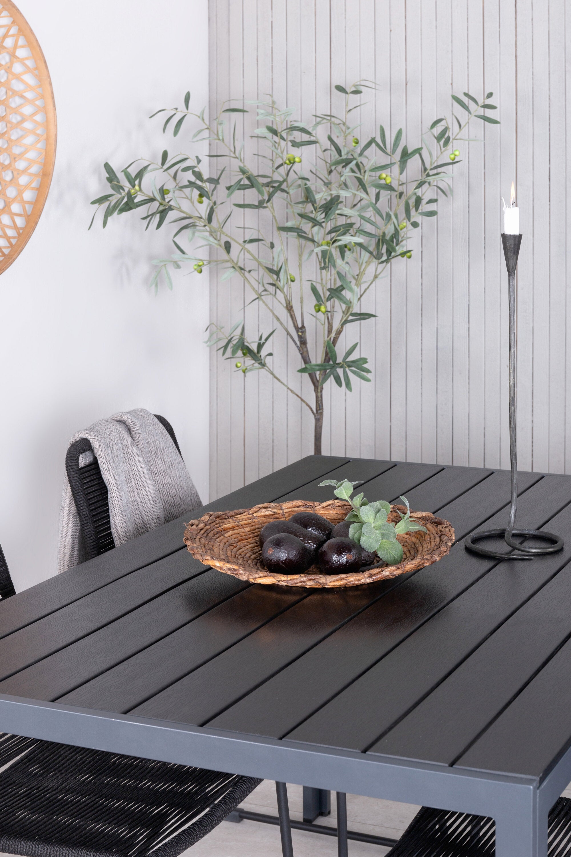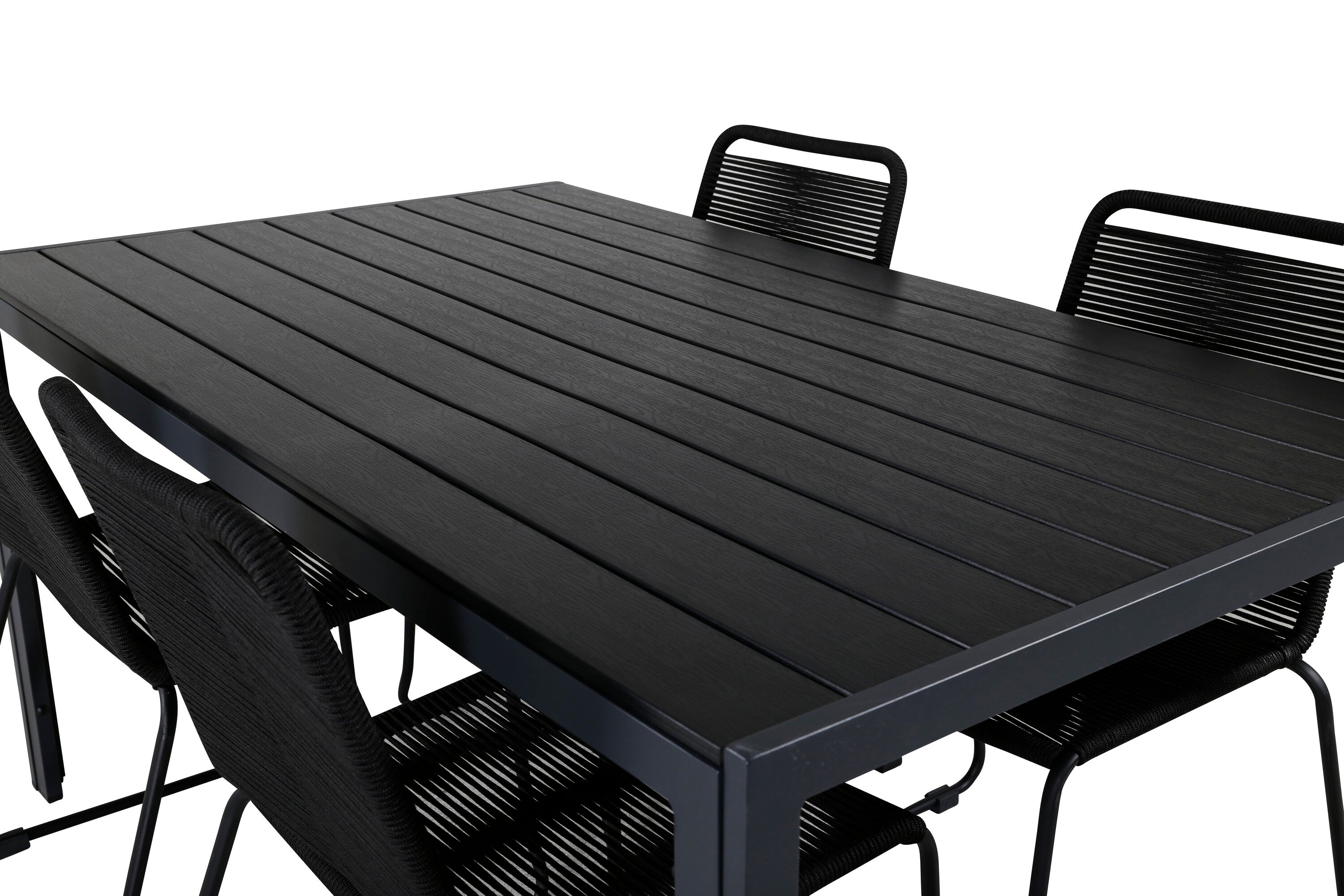 Vytvořte si stylovou atmosféru ve venkovním prostoru pomocí poutavé skupiny jídel v moderním duchu! Naše oblíbené jídelní židle Lindos svým minimalistickým designem opravdu udávají tón. Židle jsou stohovatelné pro praktické skladování a jsou vyrobeny v úzké, černé hliníkové konstrukci se sedákem z černého tkaného lana. Zde spolu s naším obdélníkovým jídelním stolem zlom v přímé severské podobě. Deska stolu je z černé překližky a hliníkového podvozku. Jednoduše dobře promyšlená skupina potravin, se kterou snadno vytvoříte okouzlující venkovní prostředí!