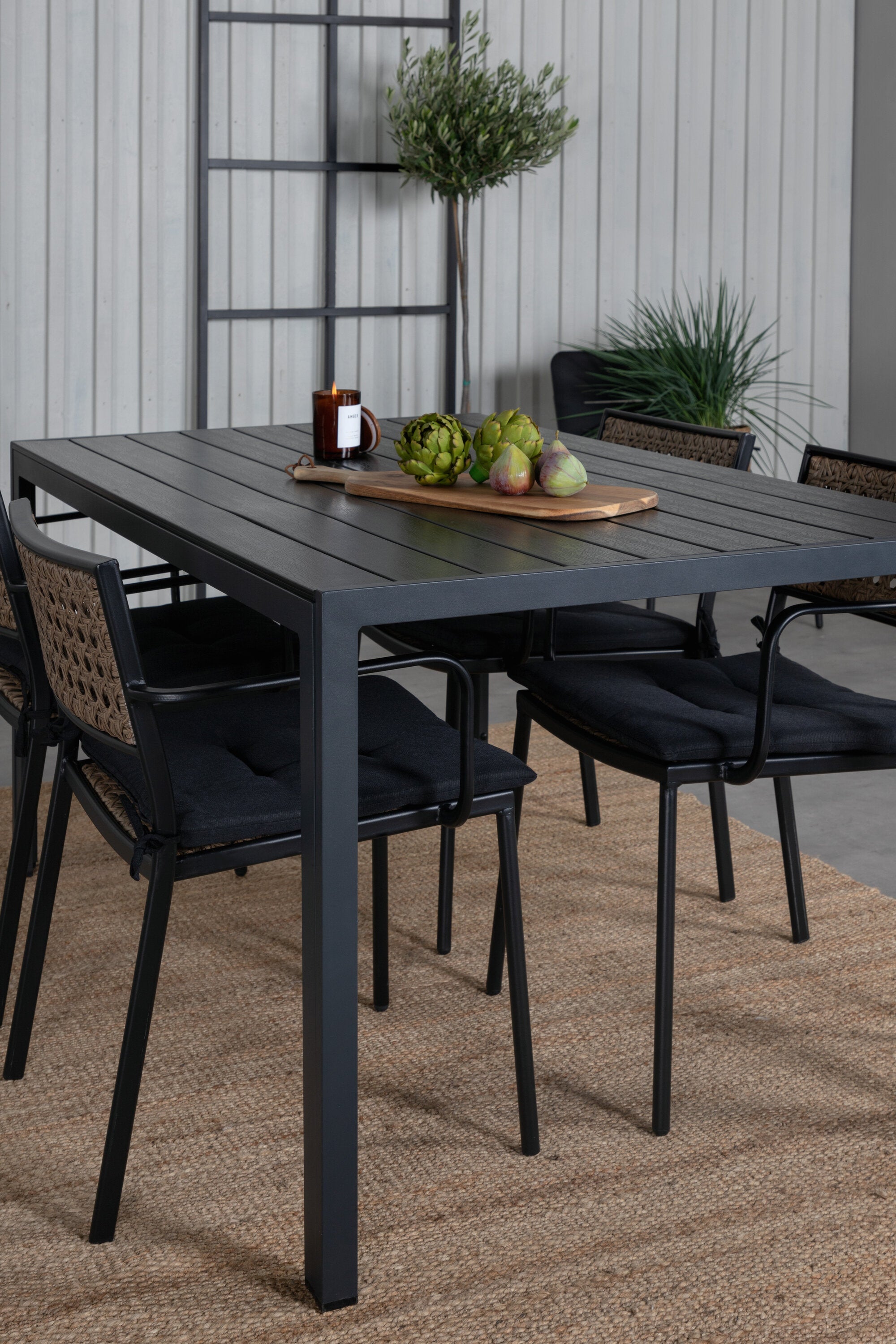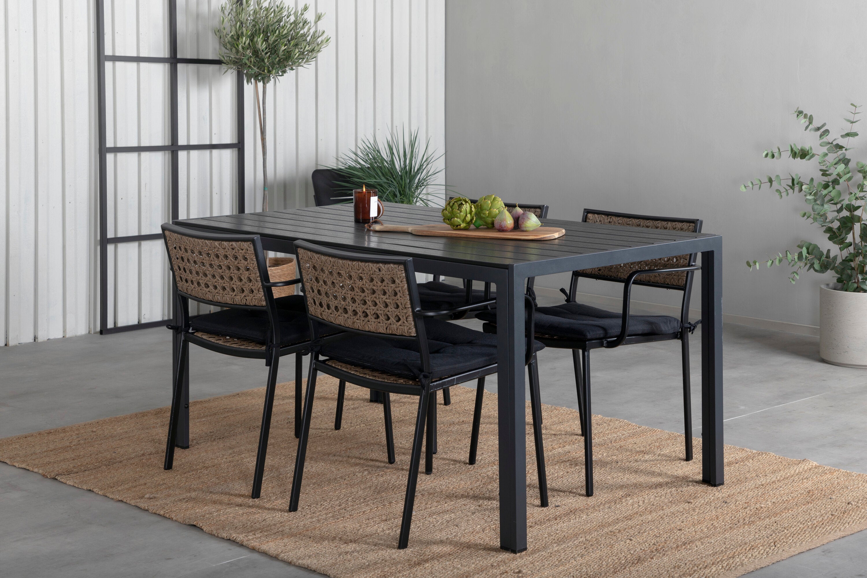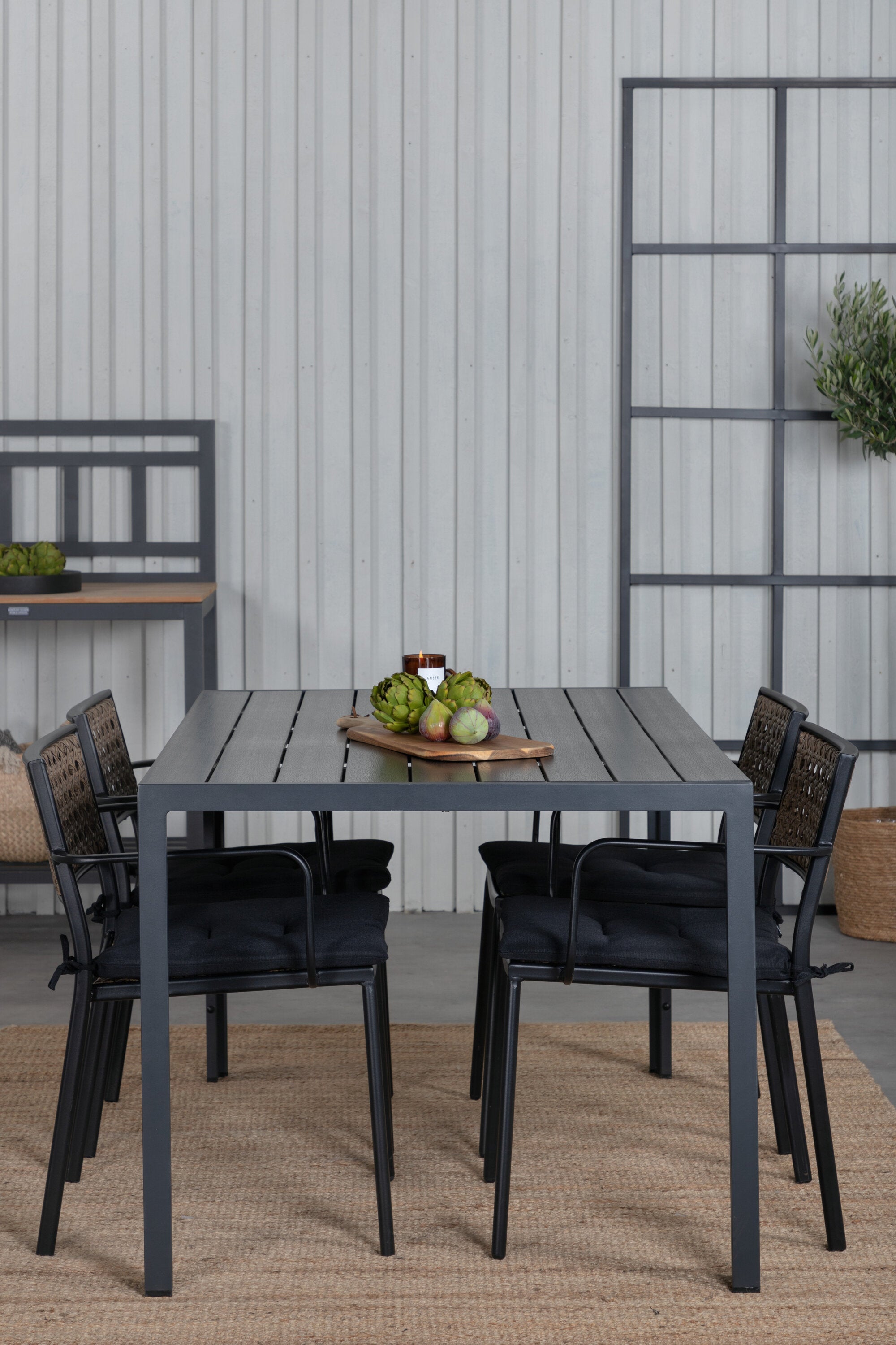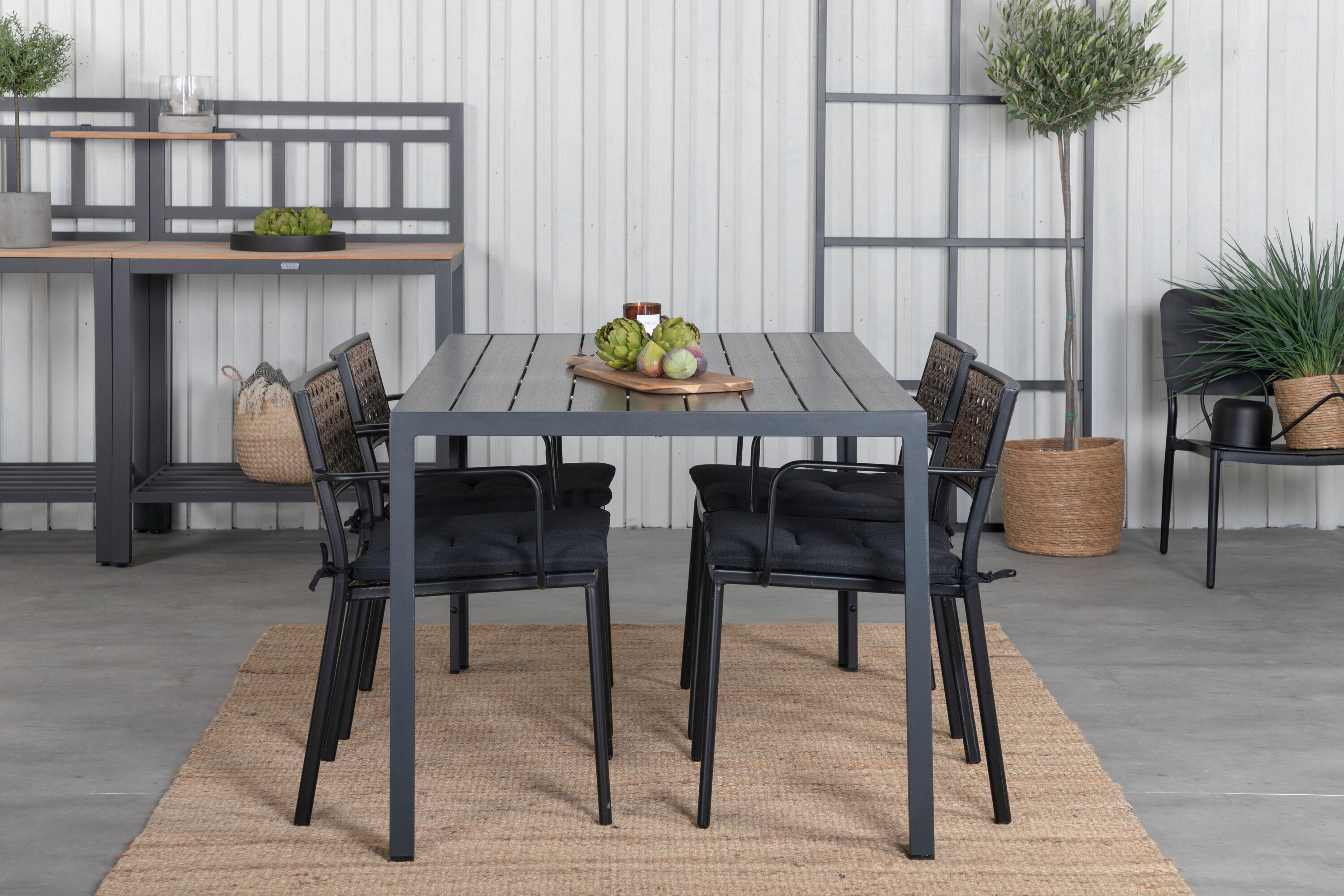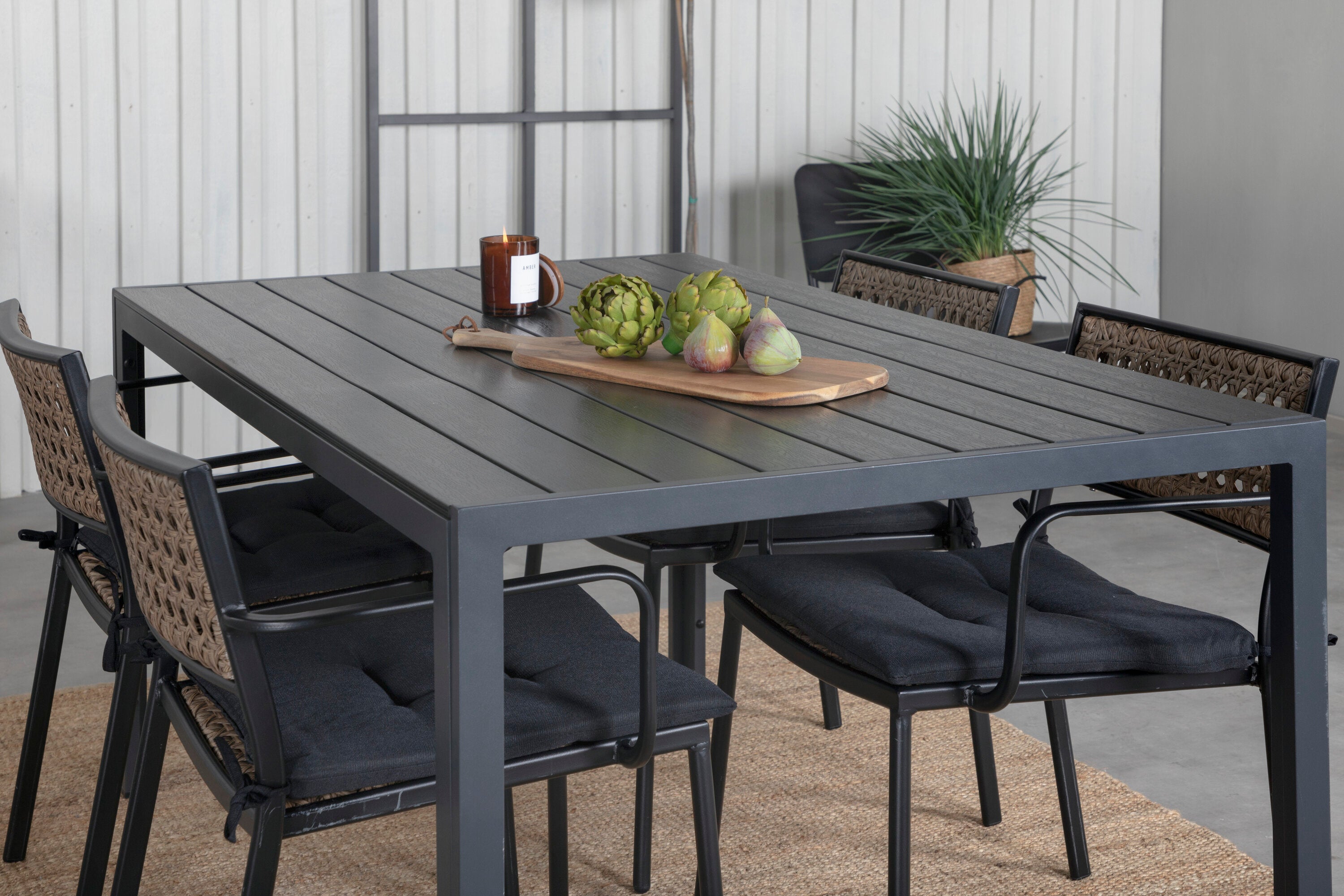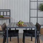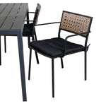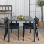 Harmonická skupina potravin pro letní jídla! Jídelní židle Paola je dokonalým mixem mezi dekorativním dřevem a stylovou černou barvou. Jemné kontrasty mezi barvami vytvářejí harmonický pocit ve venkovním prostoru! Zde v dokonalé kombinaci s naším obdélníkovým jídelním lomem v černém hliníku a stolní deskou z překližky. Jednoduše dobře promyšlená skupina potravin, se kterou snadno vytvoříte okouzlující venkovní prostředí!