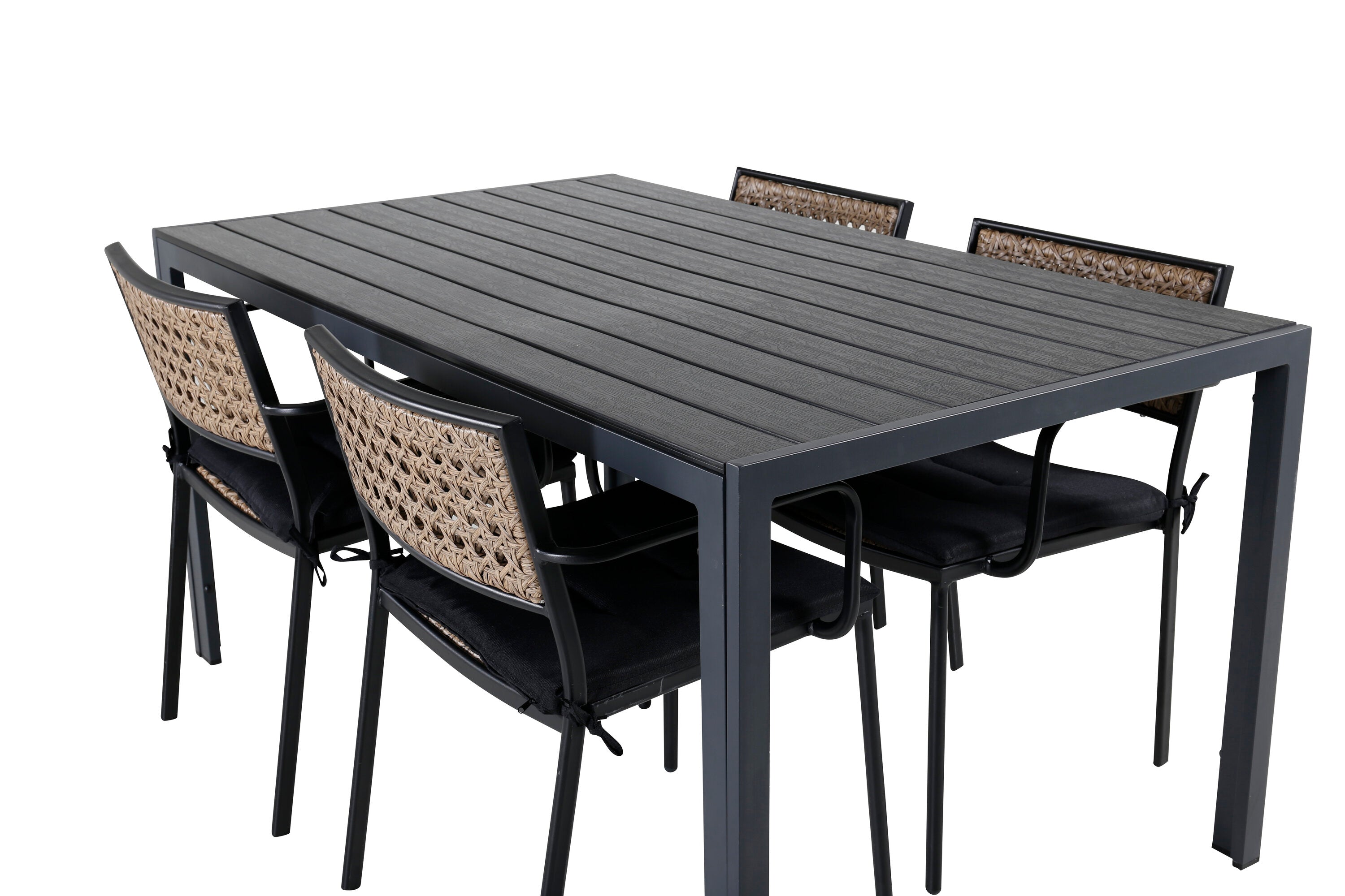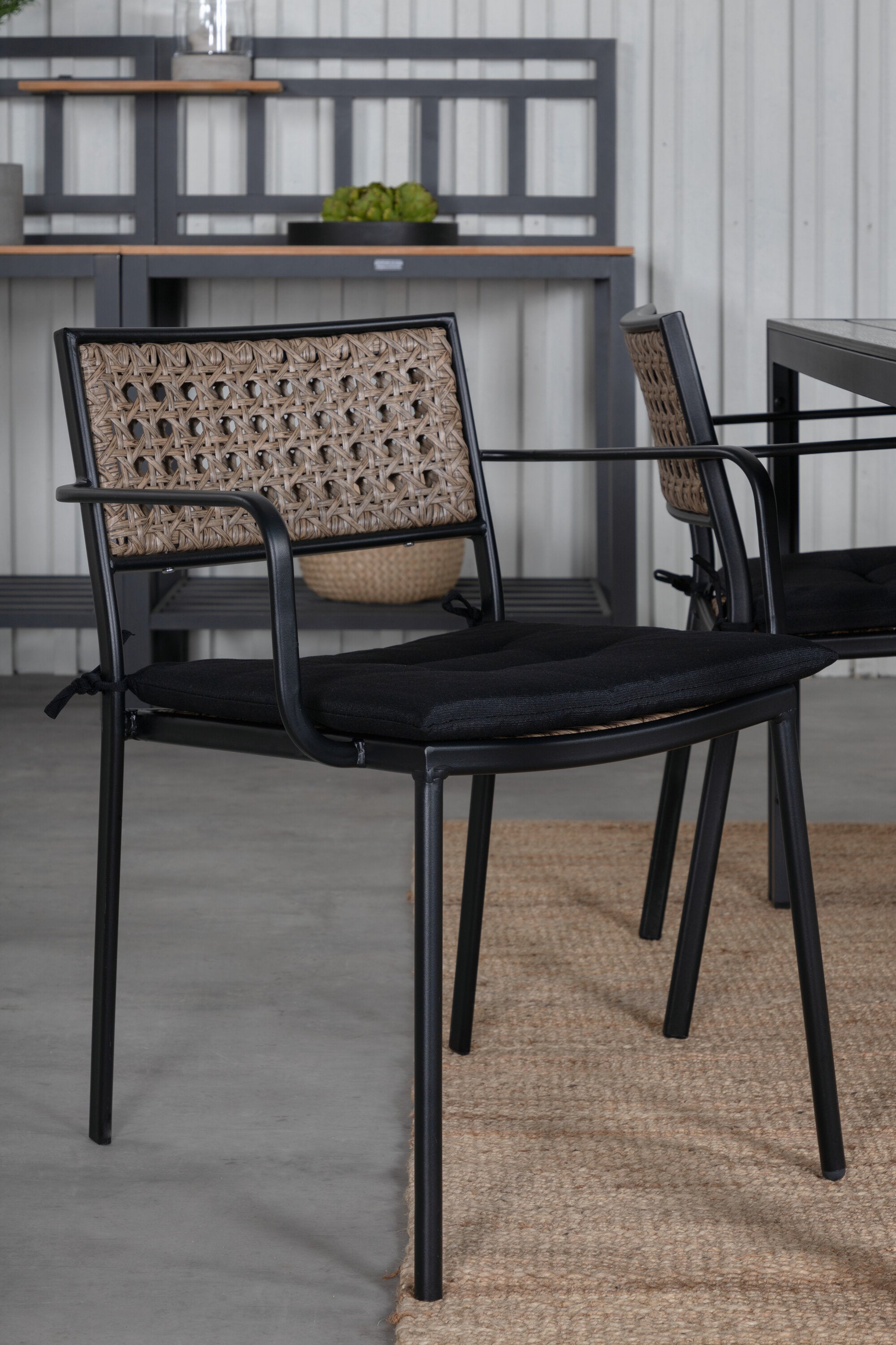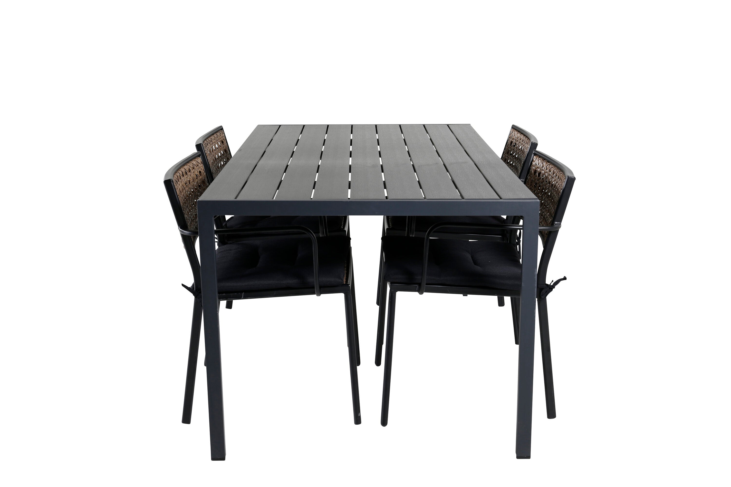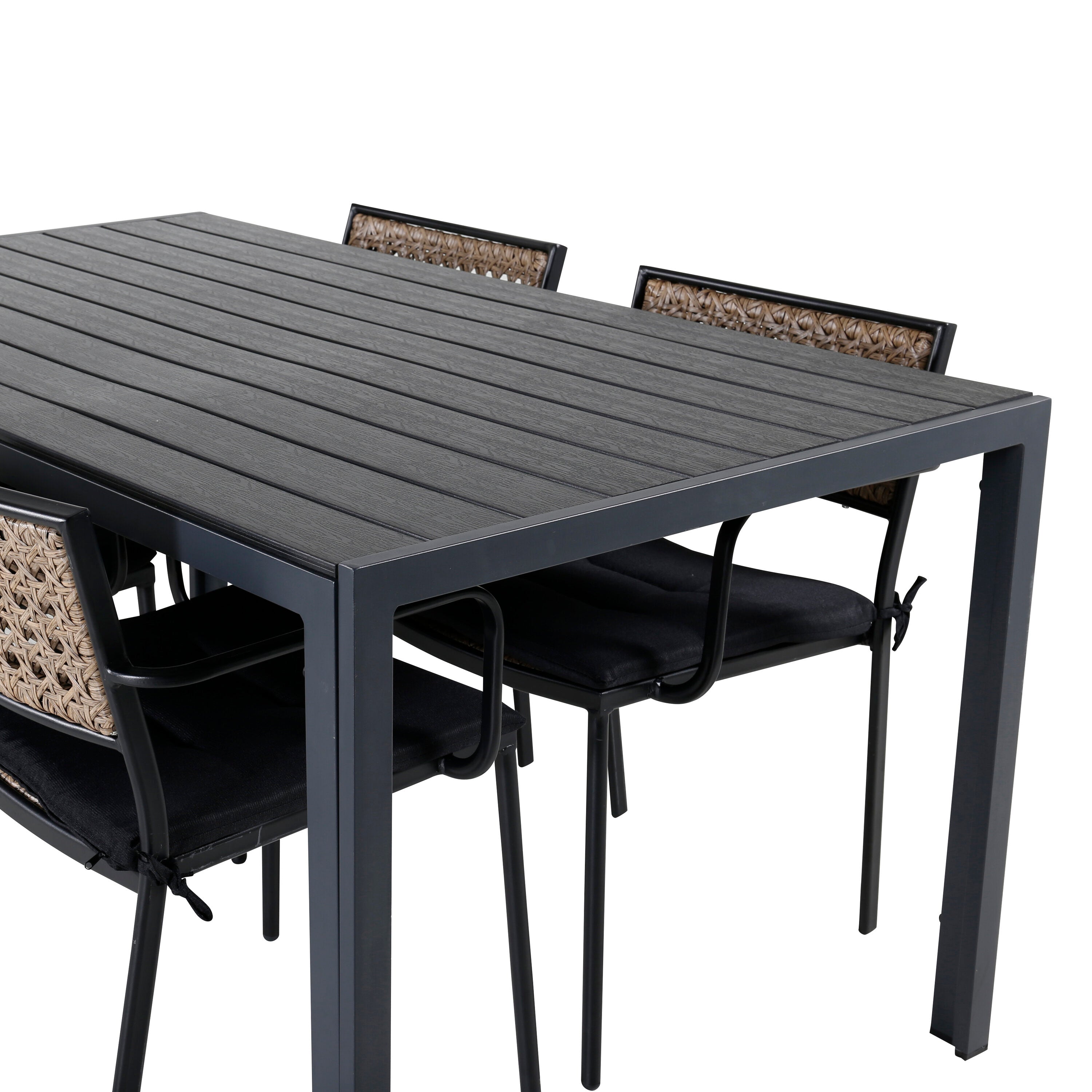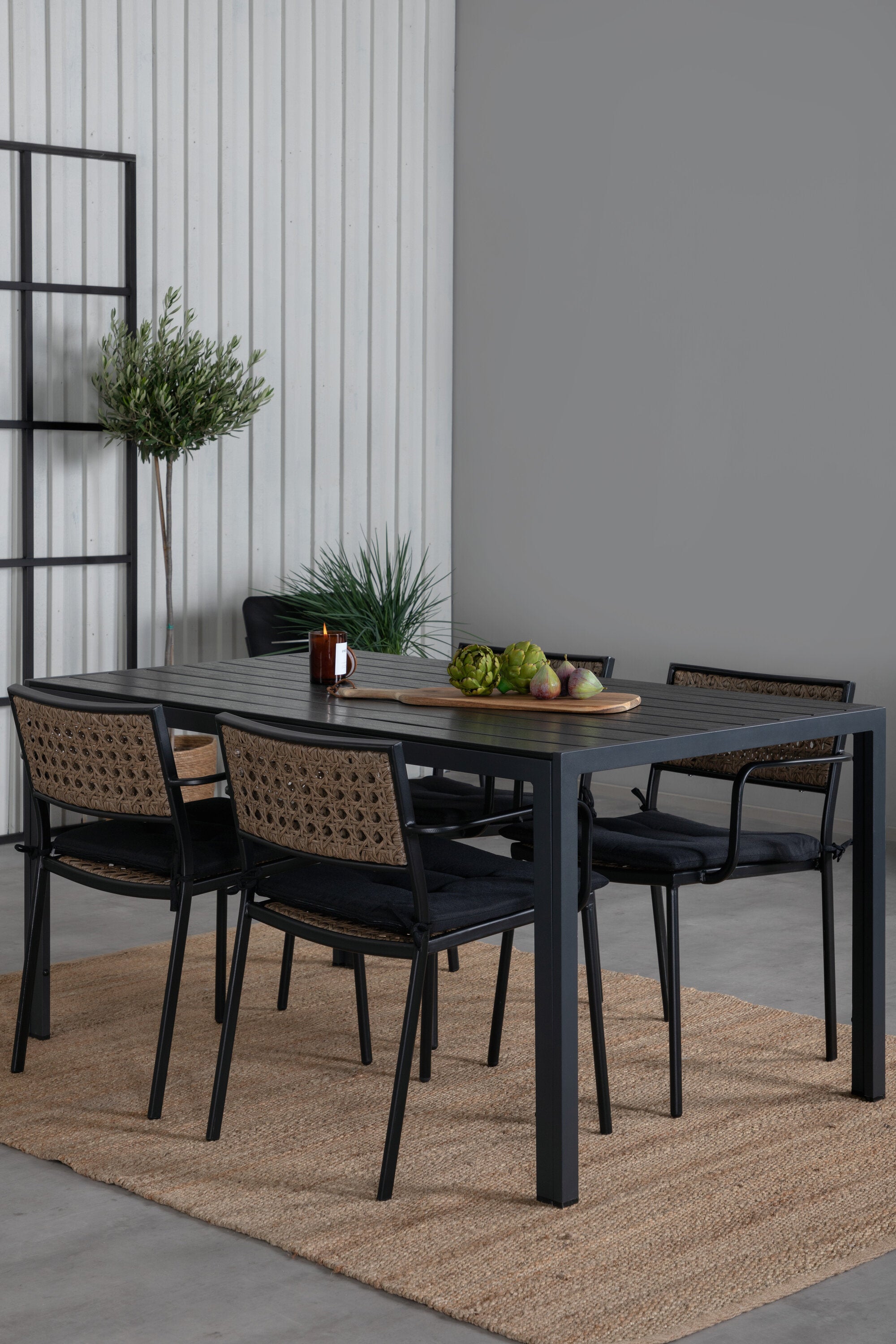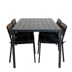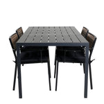 Harmonická skupina potravin pro letní jídla! Jídelní židle Paola je dokonalým mixem mezi dekorativním dřevem a stylovou černou barvou. Jemné kontrasty mezi barvami vytvářejí harmonický pocit ve venkovním prostoru! Zde v dokonalé kombinaci s naším obdélníkovým jídelním lomem v černém hliníku a stolní deskou z překližky. Jednoduše dobře promyšlená skupina potravin, se kterou snadno vytvoříte okouzlující venkovní prostředí!