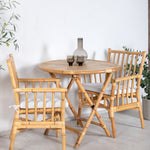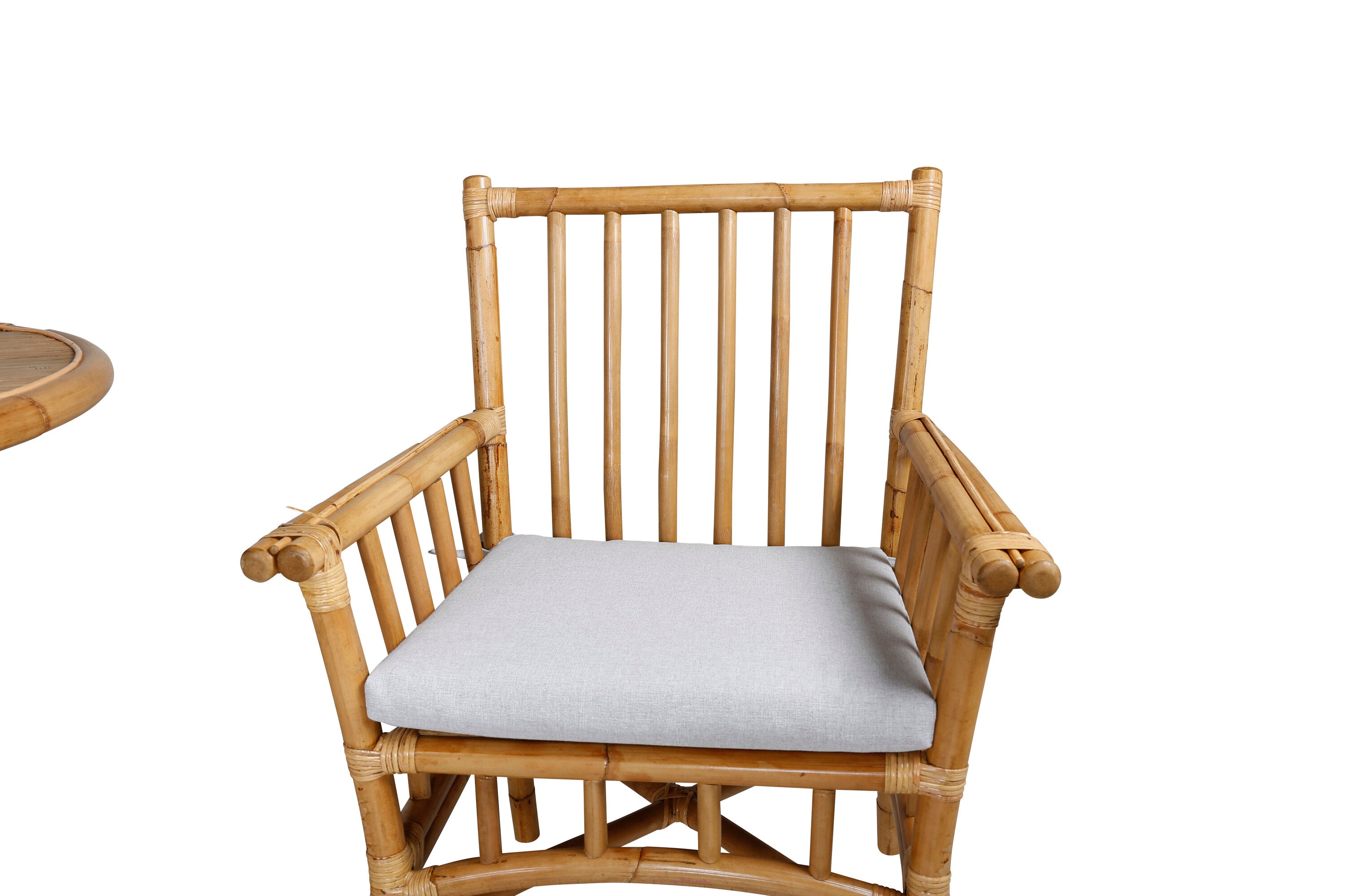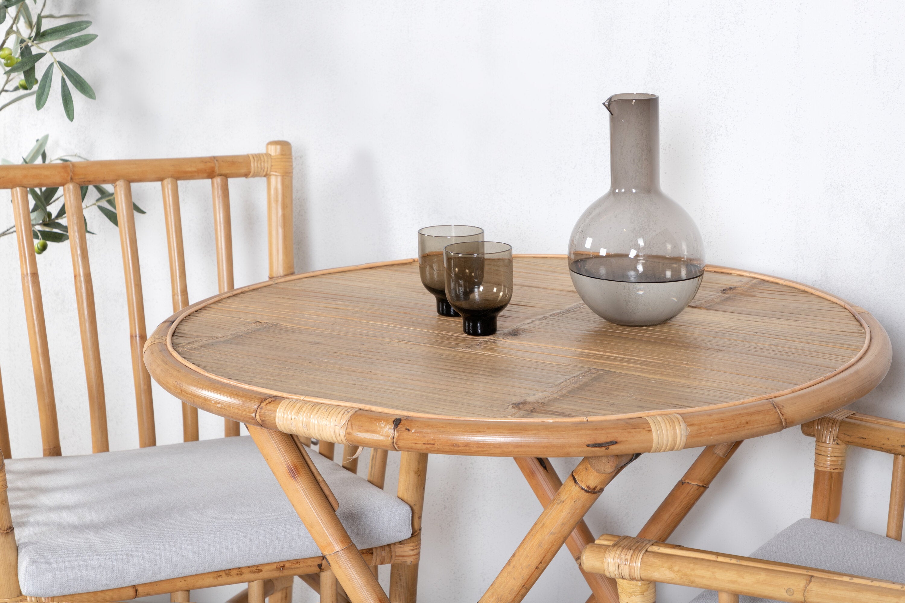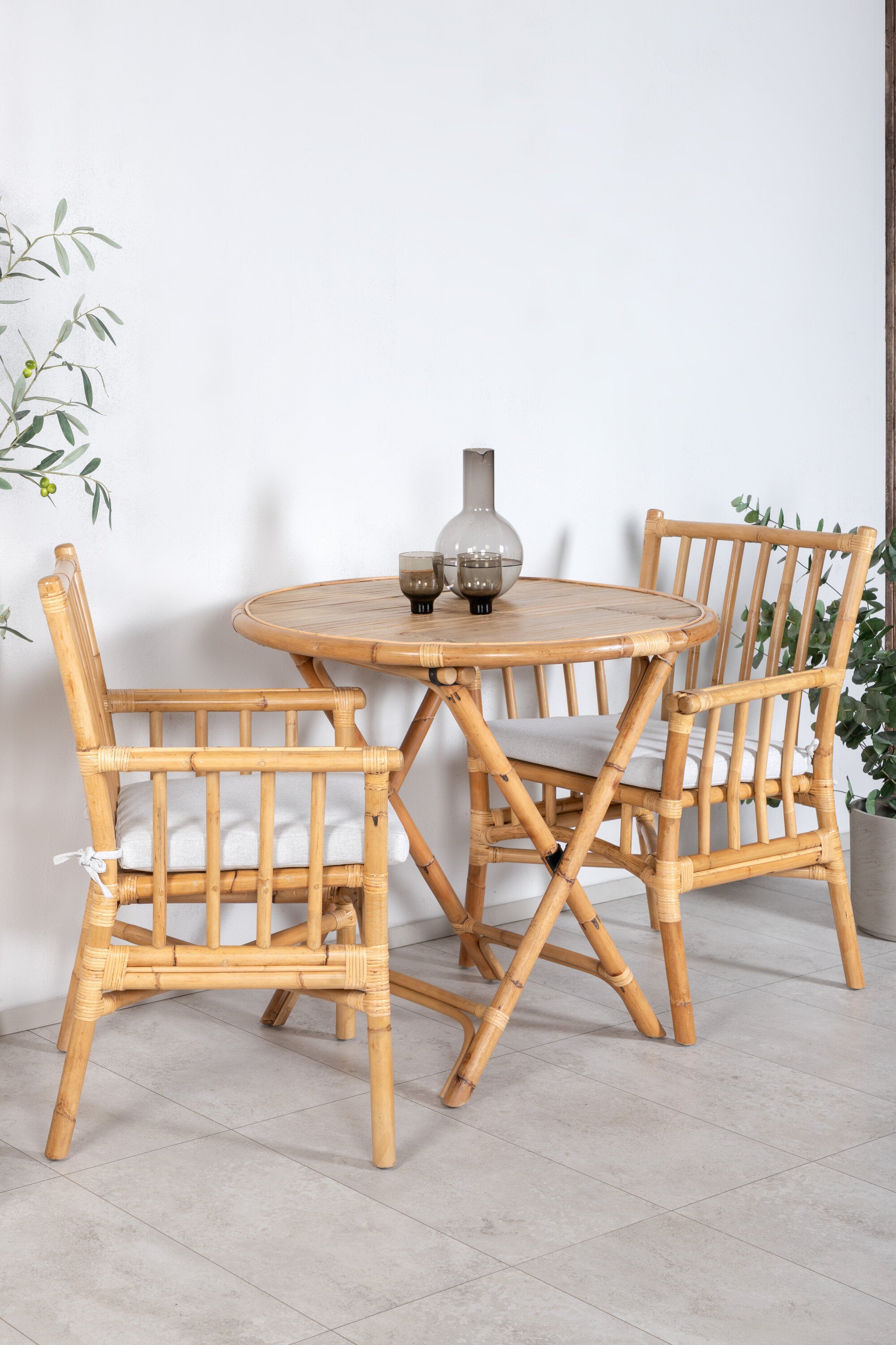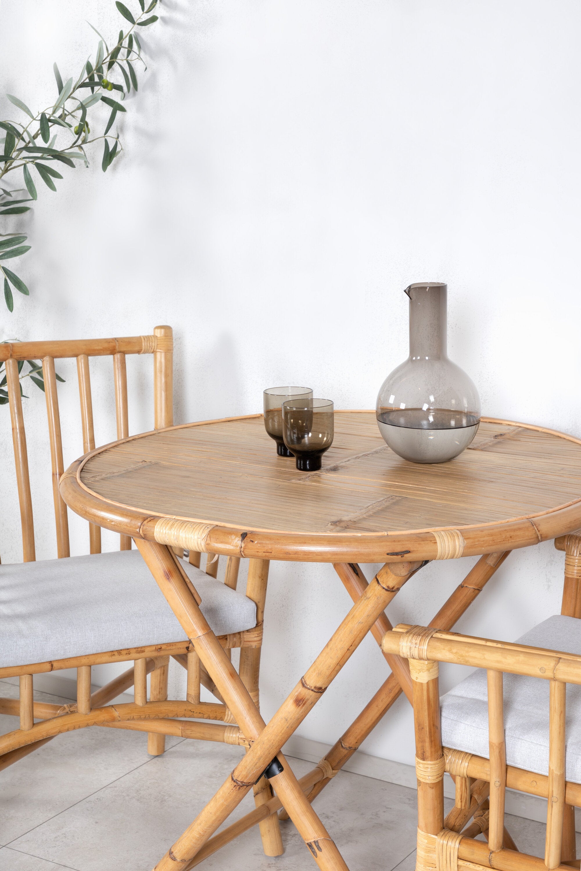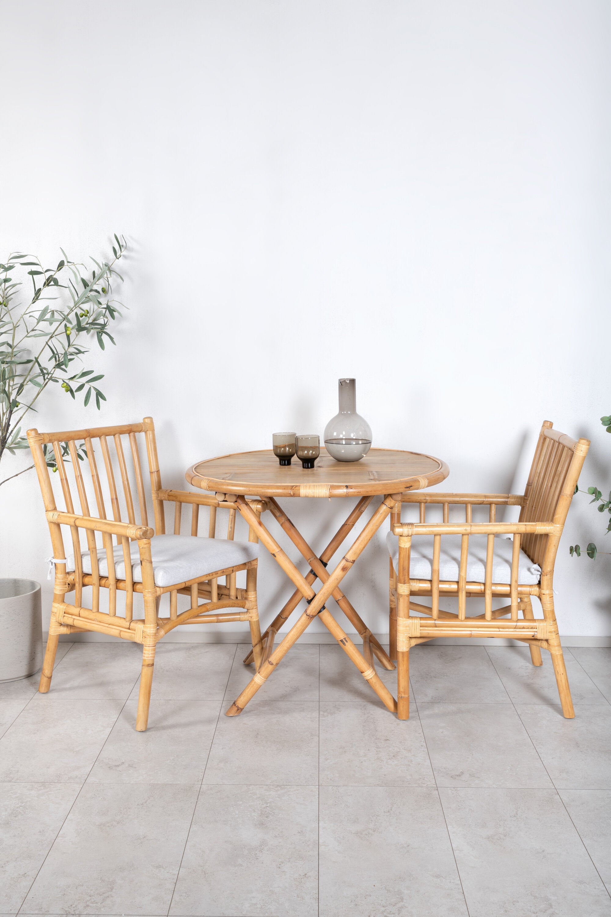 Cane, náš krásný kavárenský stůl a jídelní židle z přírodního bambusu. Tato elegantní kombinace se snadno hodí do většiny prostředí a poskytuje tichý a příjemný pocit. Zařiďte si terasu nebo balkon, abyste vytvořili dokonalé místo pro kávu v nádherném letním dni.