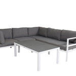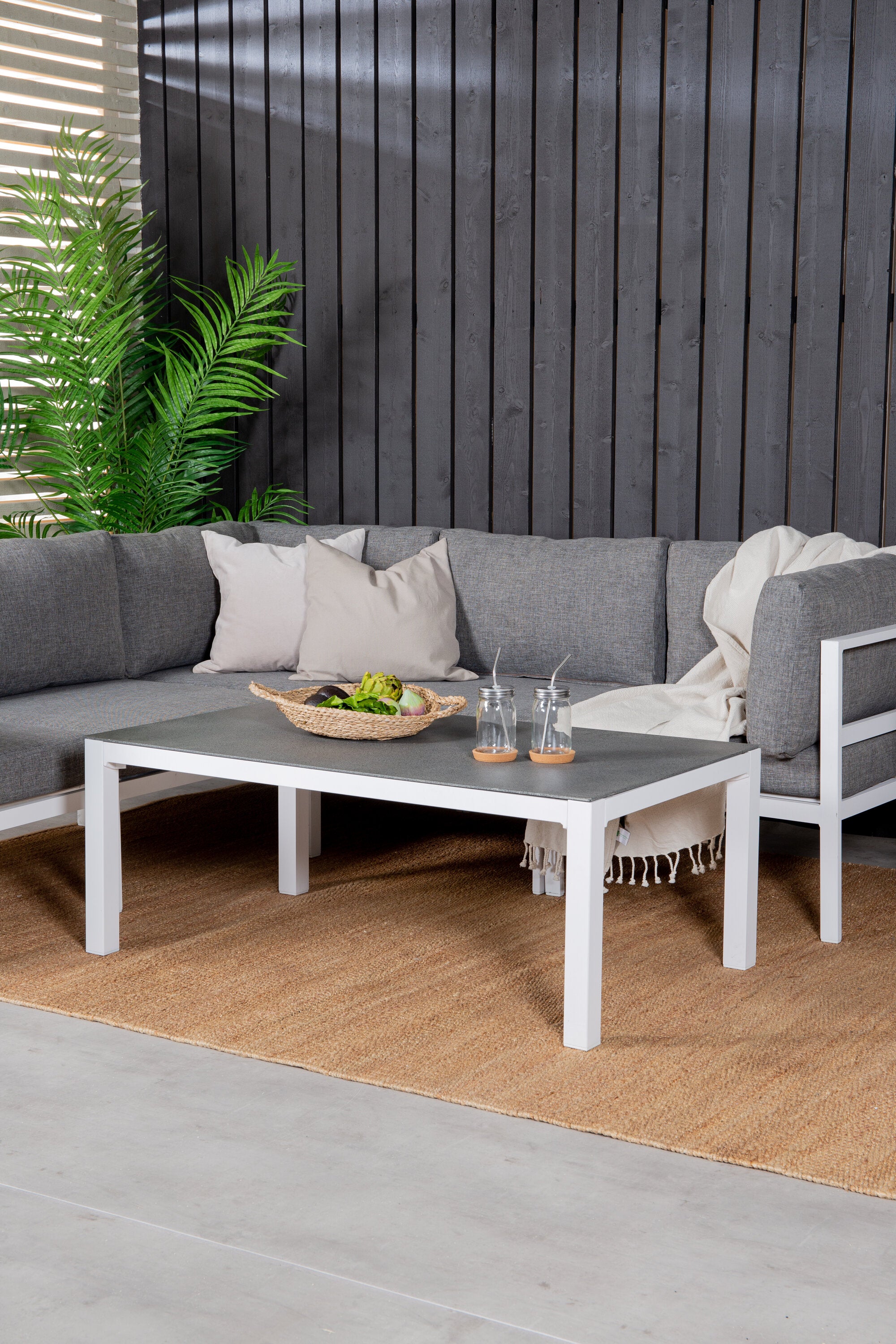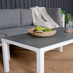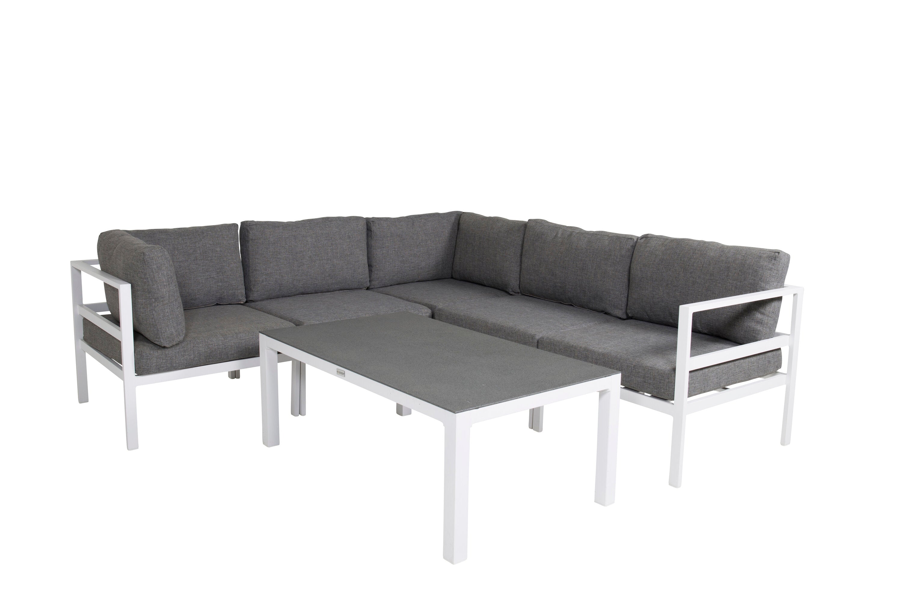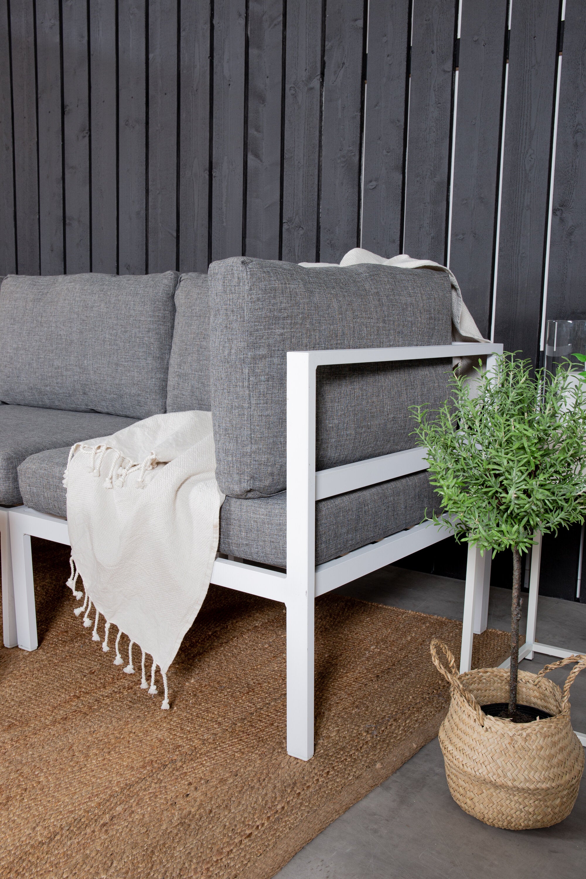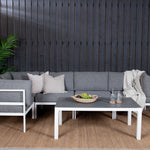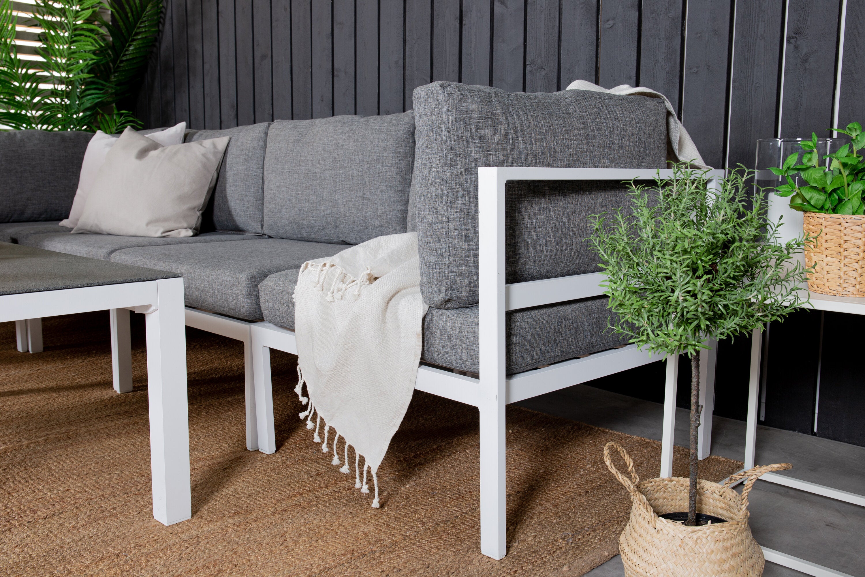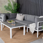 S přenosnými moduly si můžete přizpůsobit a postavit salonek, o kterém jste vždy snili! Tento rohový díl patří do série Copacabana a je v bílém hliníku s měkkými šedými podložkami pro extra pohodlí. S pomocí tohoto modulu si můžete svou skupinu pohovek přizpůsobit vkusu a prostoru. Zde společně s konferenčním stolkem ze stejné série. Deska stolu je z šedého stříkaného skla a podnož z bílého hliníku, aby ladila s pohovkou. Přizpůsobte se vaší konkrétní terase!