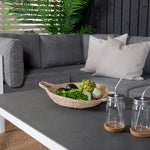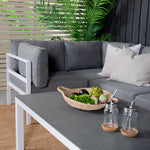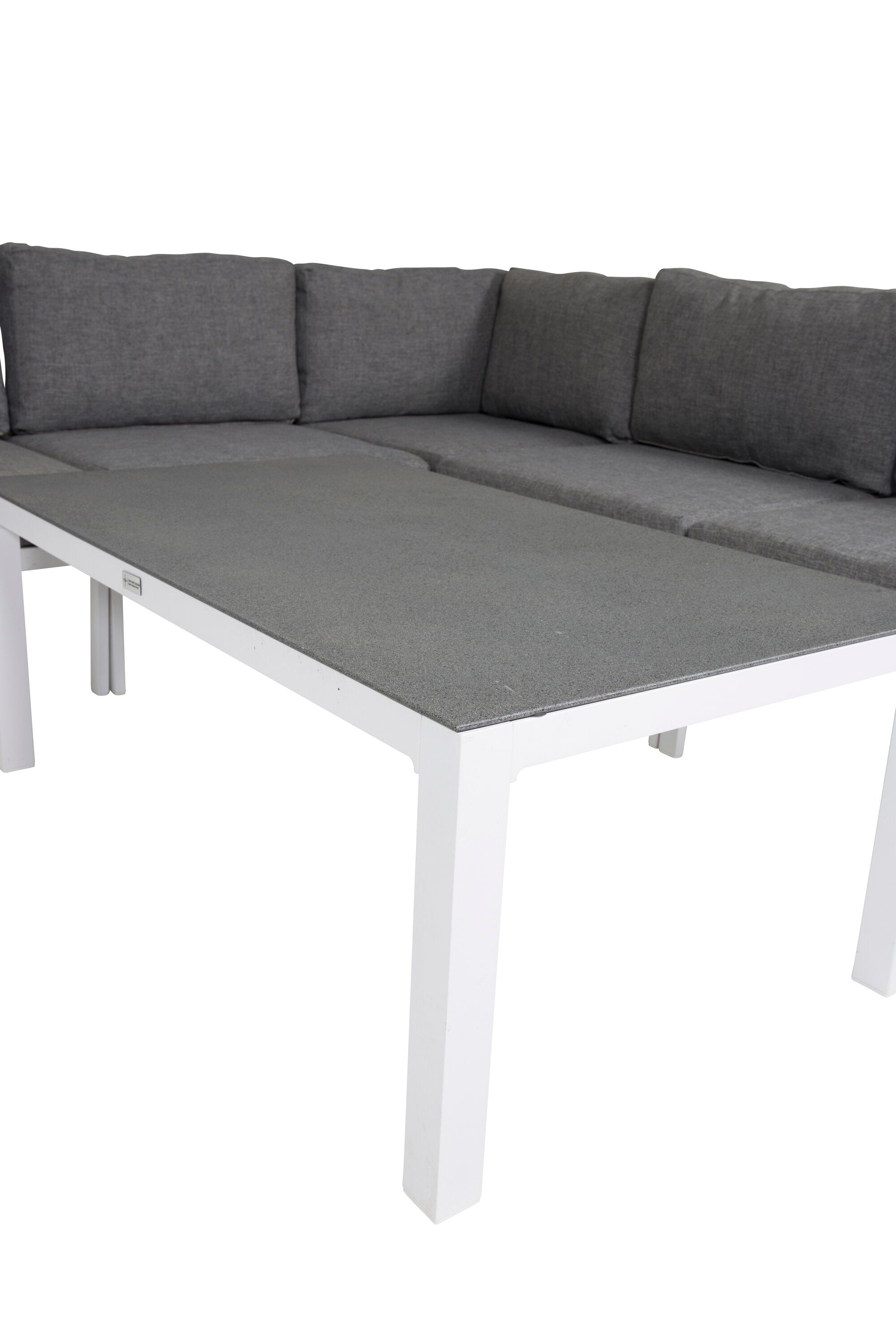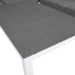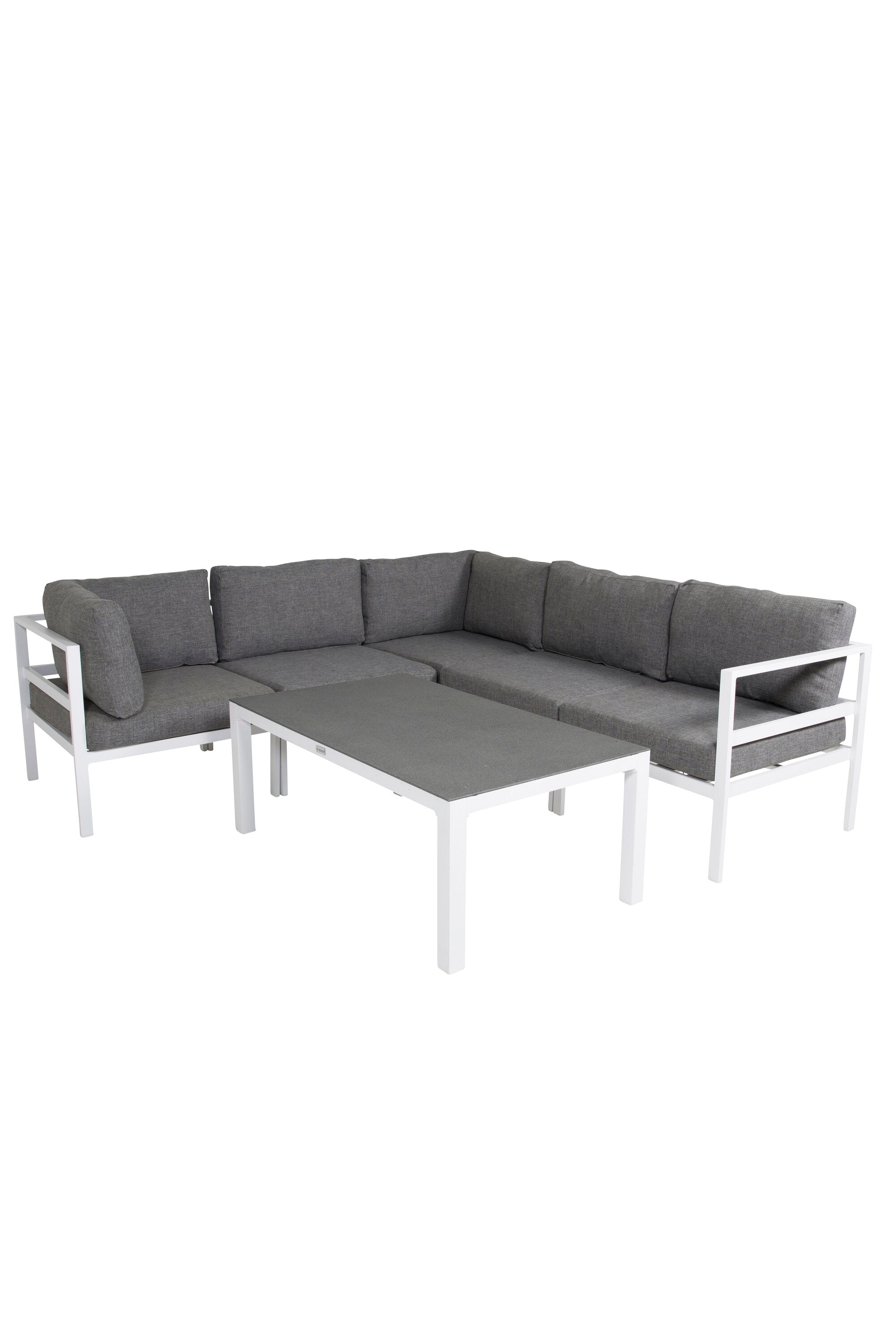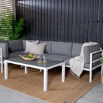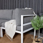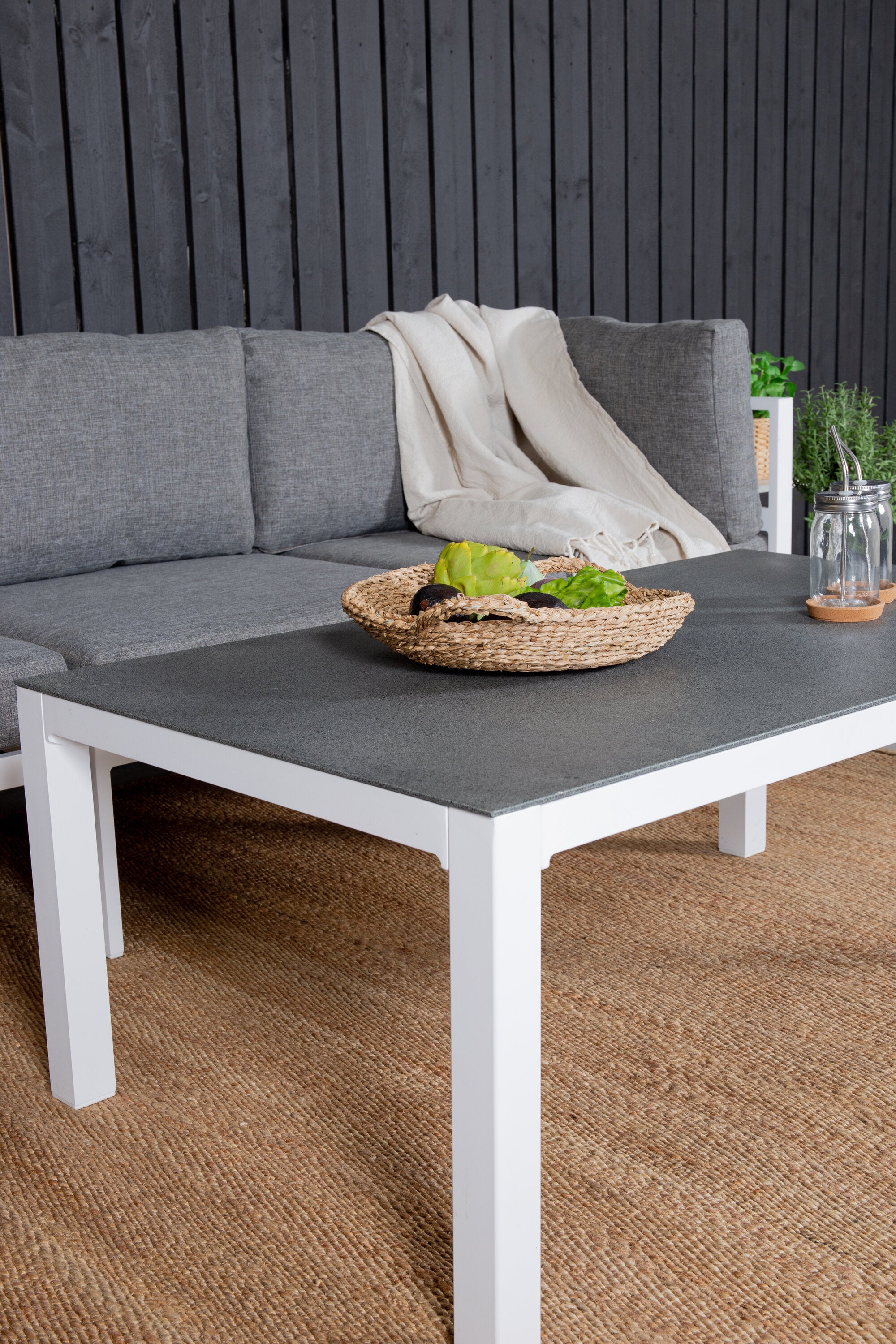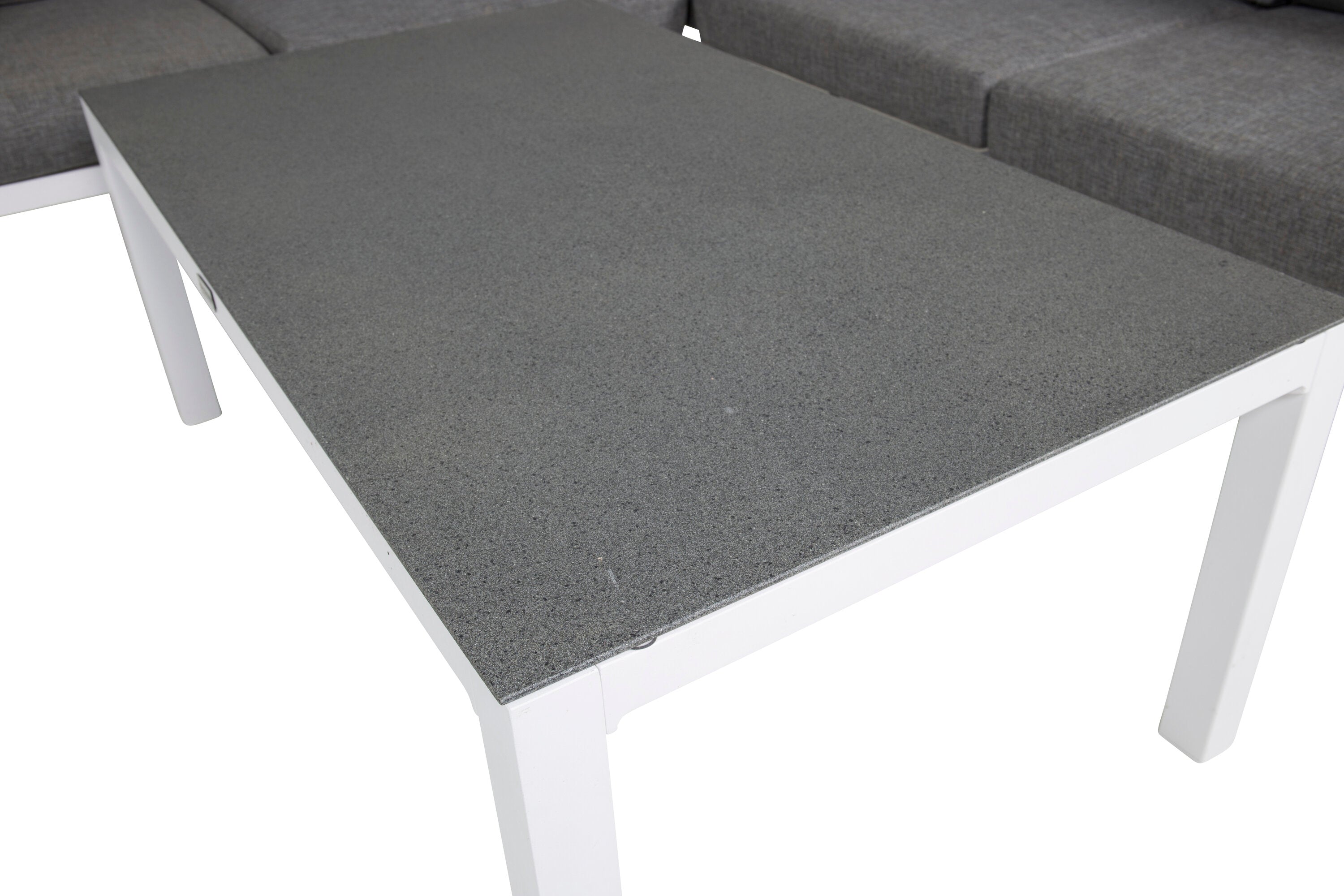 S přenosnými moduly si můžete přizpůsobit a postavit salonek, o kterém jste vždy snili! Tento rohový díl patří do série Copacabana a je v bílém hliníku s měkkými šedými podložkami pro extra pohodlí. S pomocí tohoto modulu si můžete svou skupinu pohovek přizpůsobit vkusu a prostoru. Zde společně s konferenčním stolkem ze stejné série. Deska stolu je z šedého stříkaného skla a podnož z bílého hliníku, aby ladila s pohovkou. Přizpůsobte se vaší konkrétní terase!