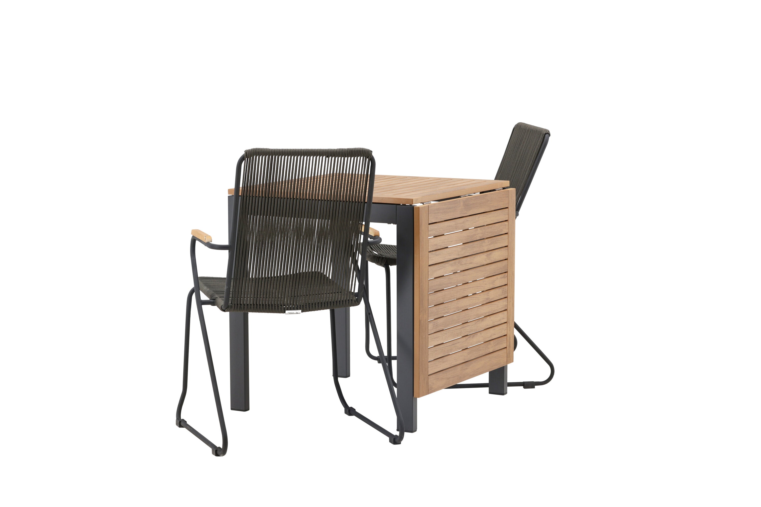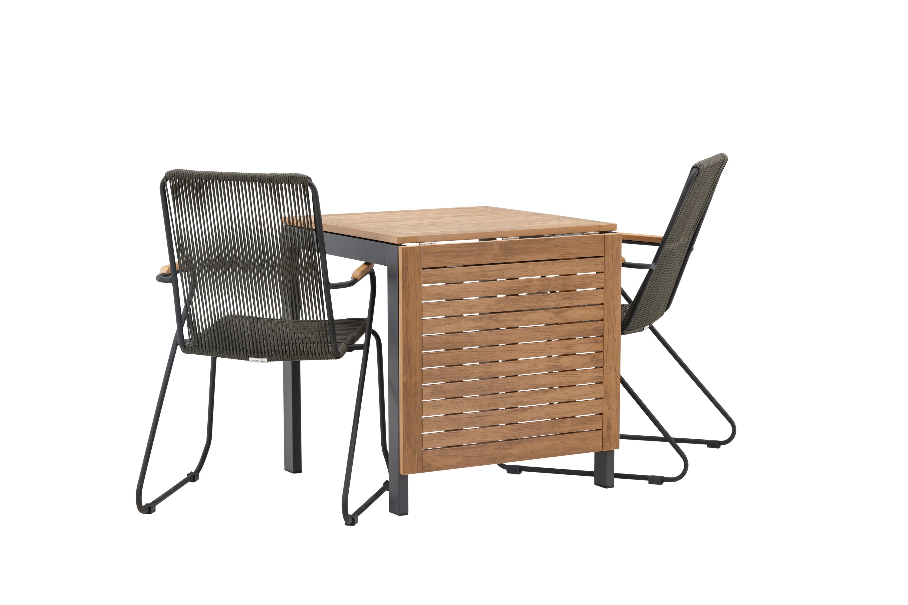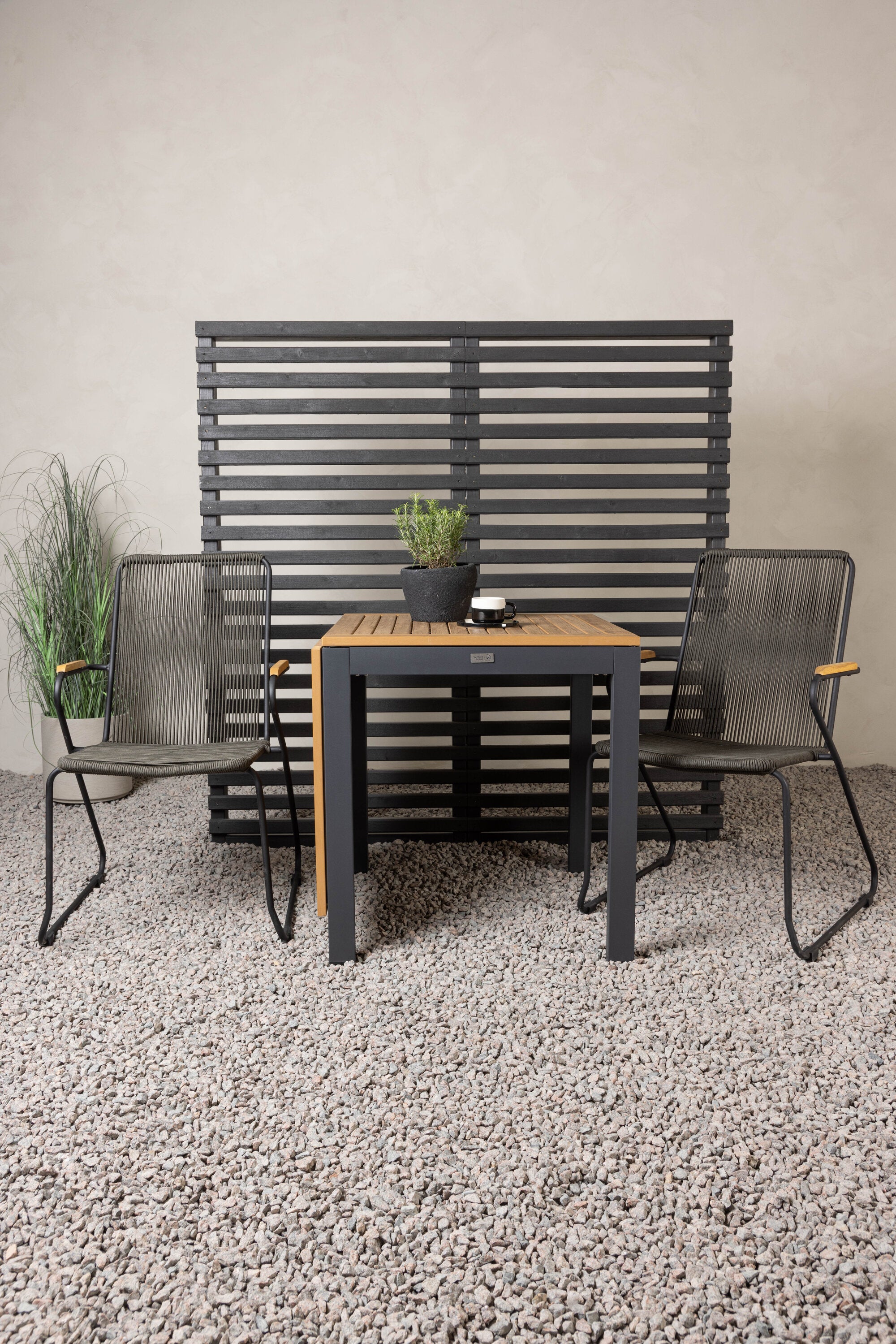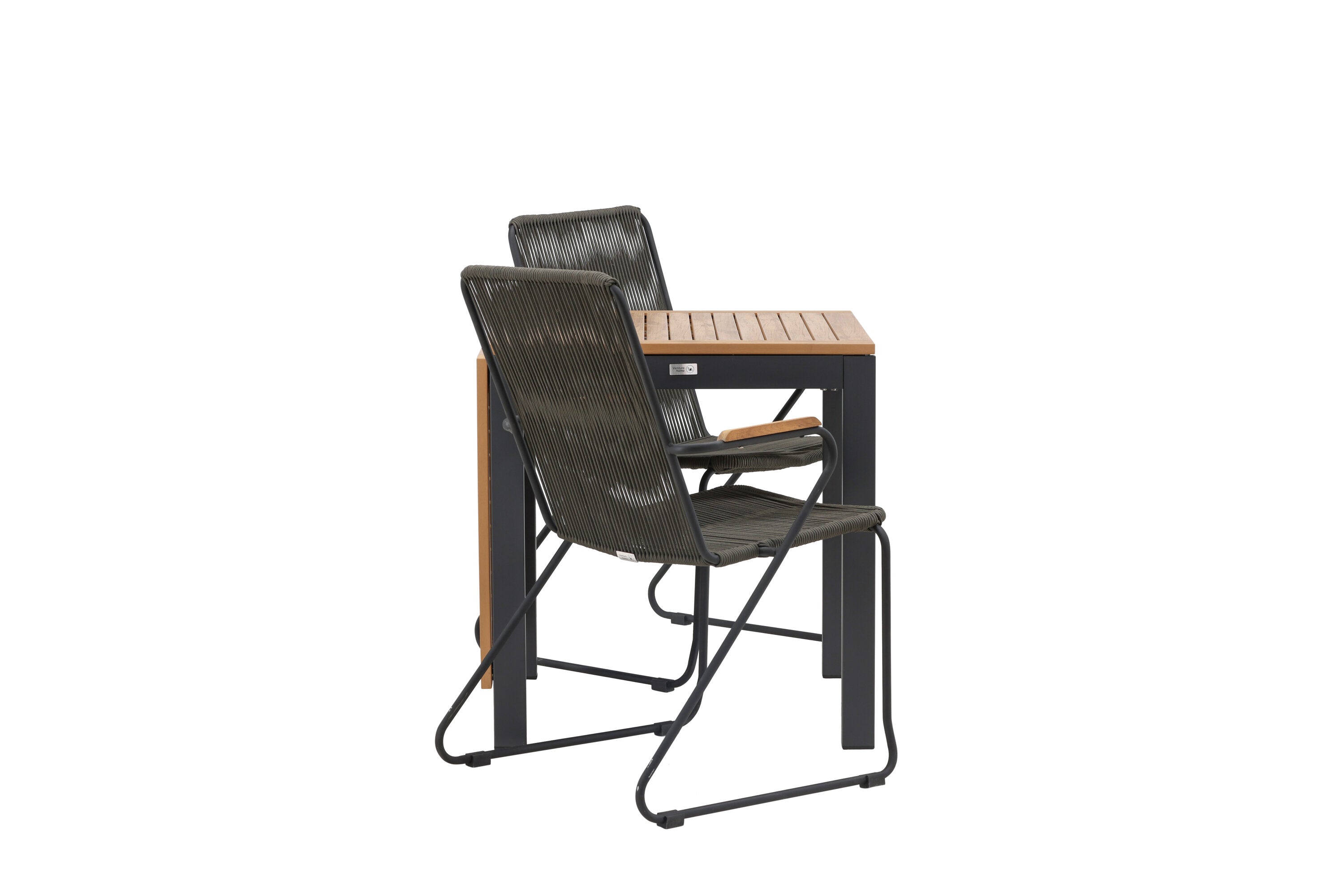 Pijte si toto léto kávu venku! Kavárenský stůl Diego je stejně chytrý jako stylový s deskou v hnědém aintwoodu a nohami v černém hliníku. Stůl má také jednoduchou konstrukci, která umožňuje snadné skládání nástavných desek po stranách. Zde společně se 2 šedými jídelními židlemi ze série Bois. Židle má sedák z odolného šedého lana a úzký rám z černé oceli. Perfektní jídelní skupina na malý balkon! Rozměry stolu: 130/70x70cm.