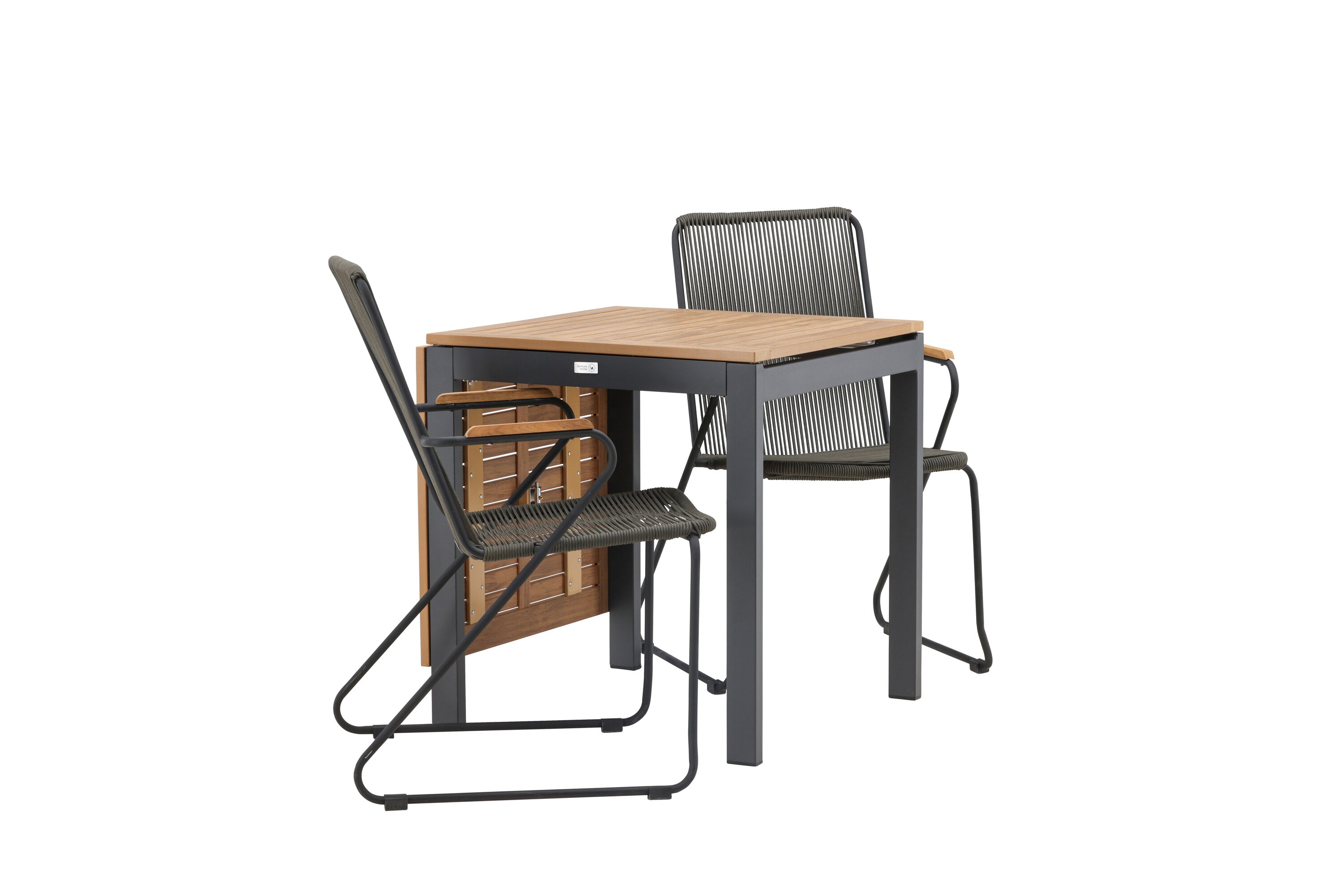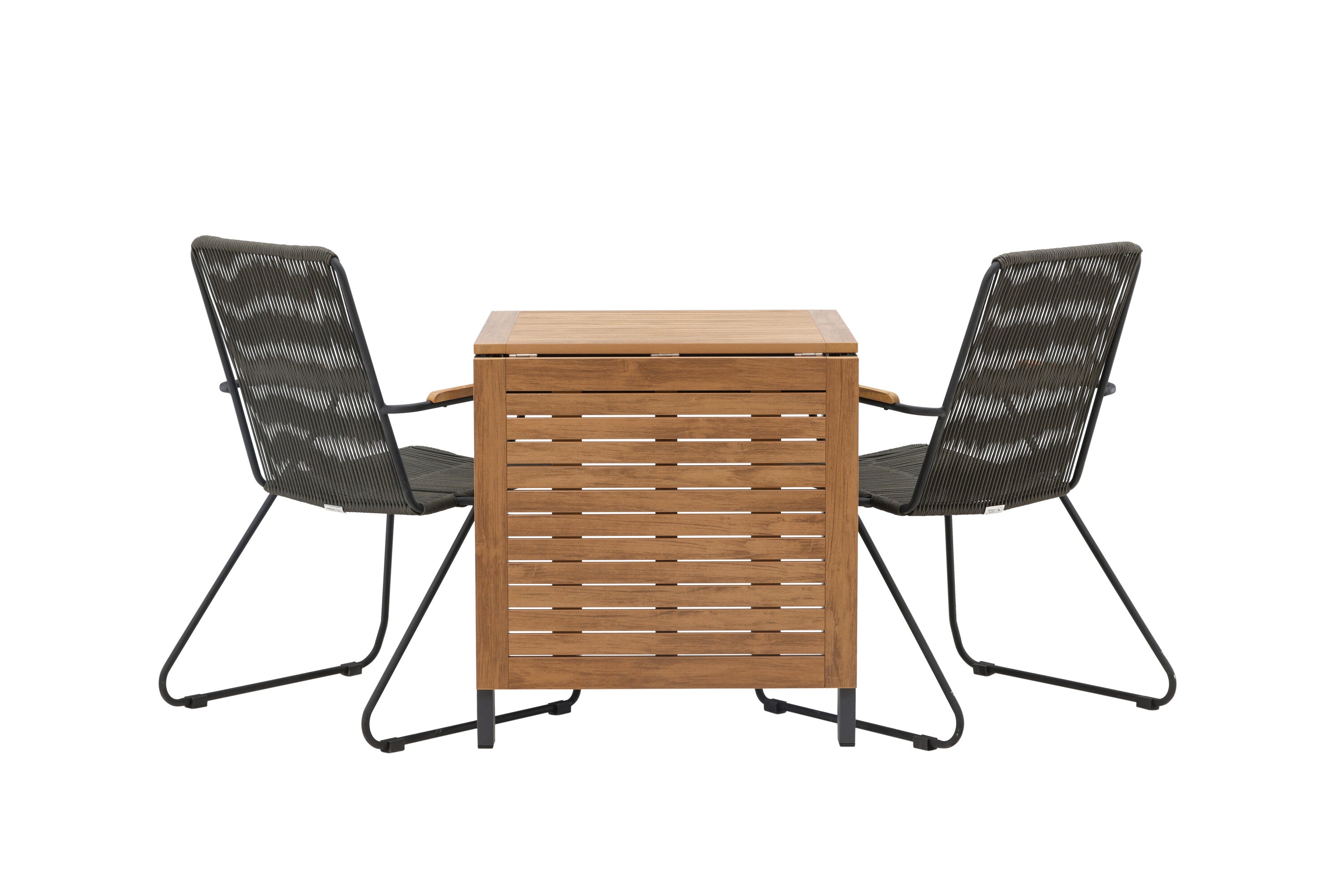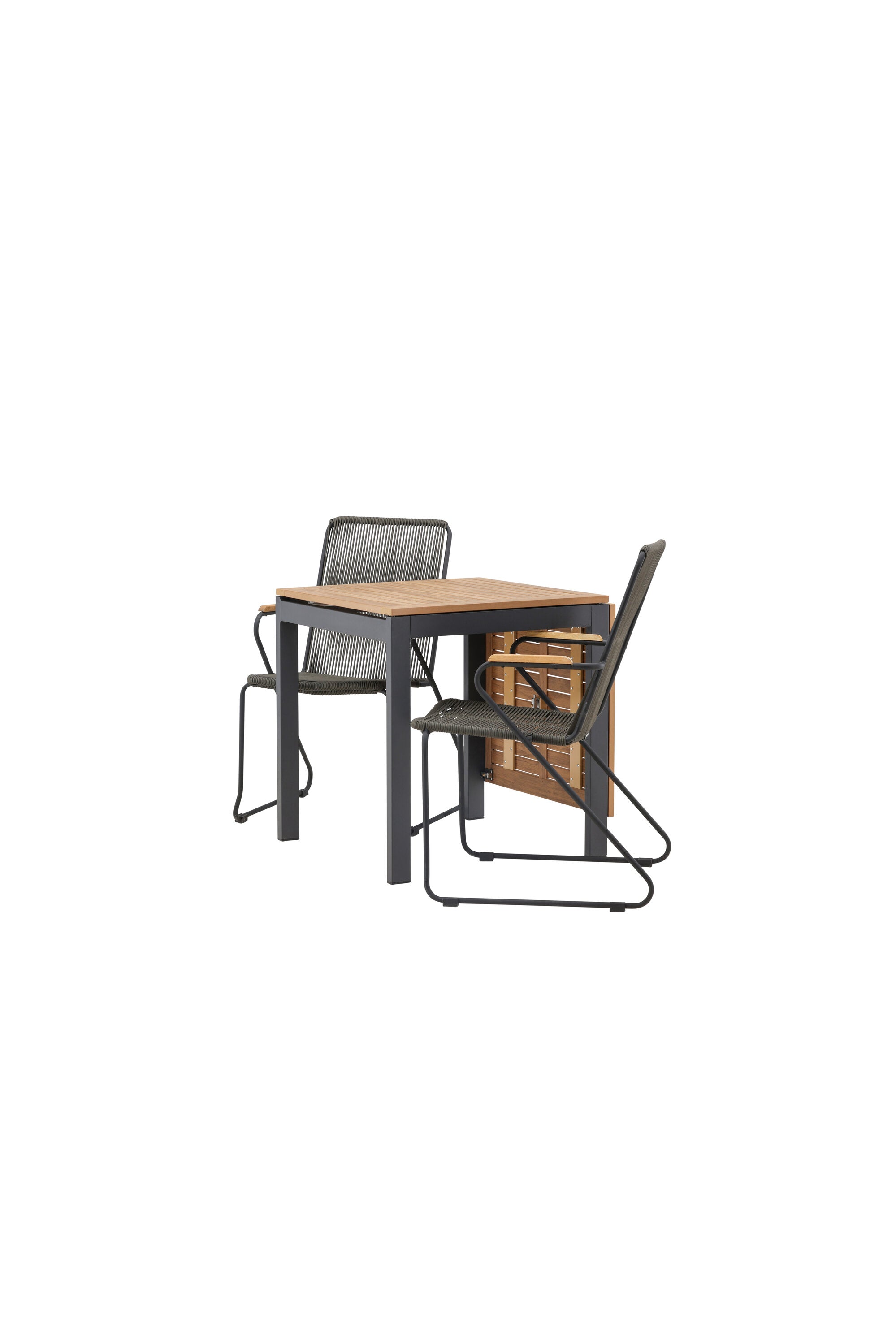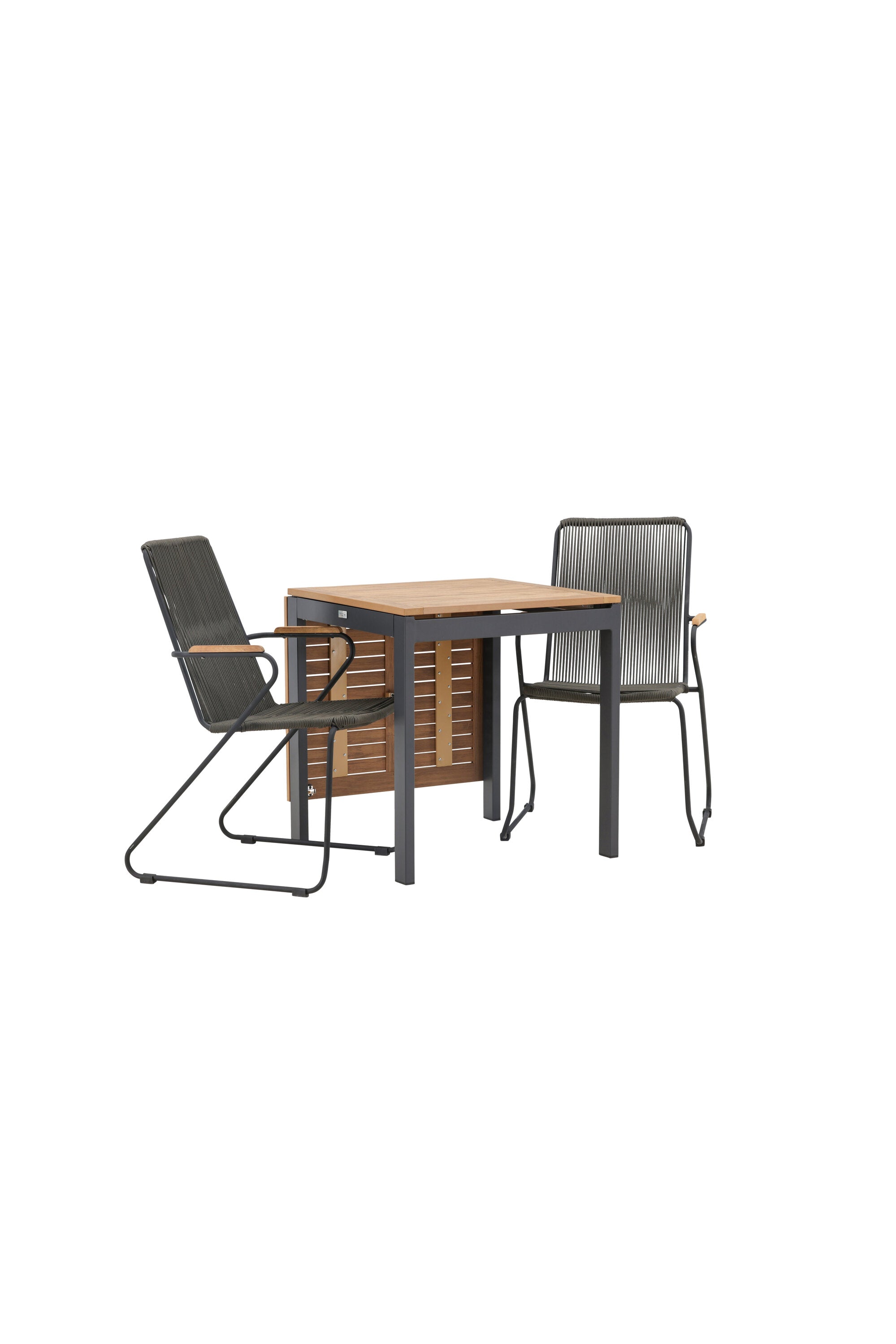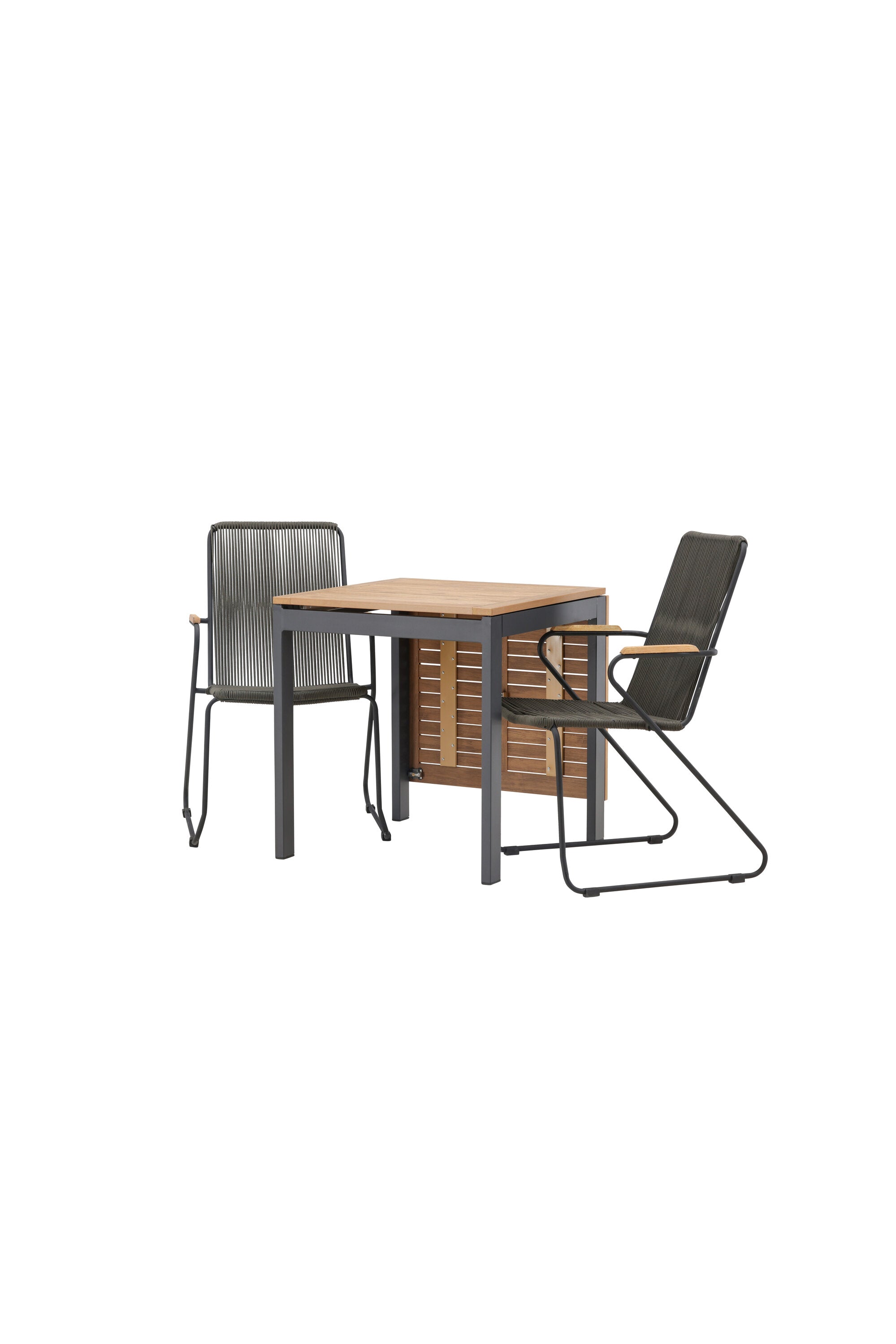 Pijte si toto léto kávu venku! Kavárenský stůl Diego je stejně chytrý jako stylový s deskou v hnědém aintwoodu a nohami v černém hliníku. Stůl má také jednoduchou konstrukci, která umožňuje snadné skládání nástavných desek po stranách. Zde společně se 2 šedými jídelními židlemi ze série Bois. Židle má sedák z odolného šedého lana a úzký rám z černé oceli. Perfektní jídelní skupina na malý balkon! Rozměry stolu: 130/70x70cm.