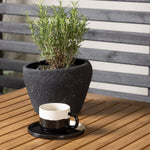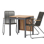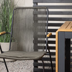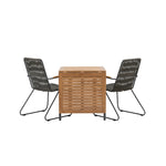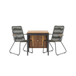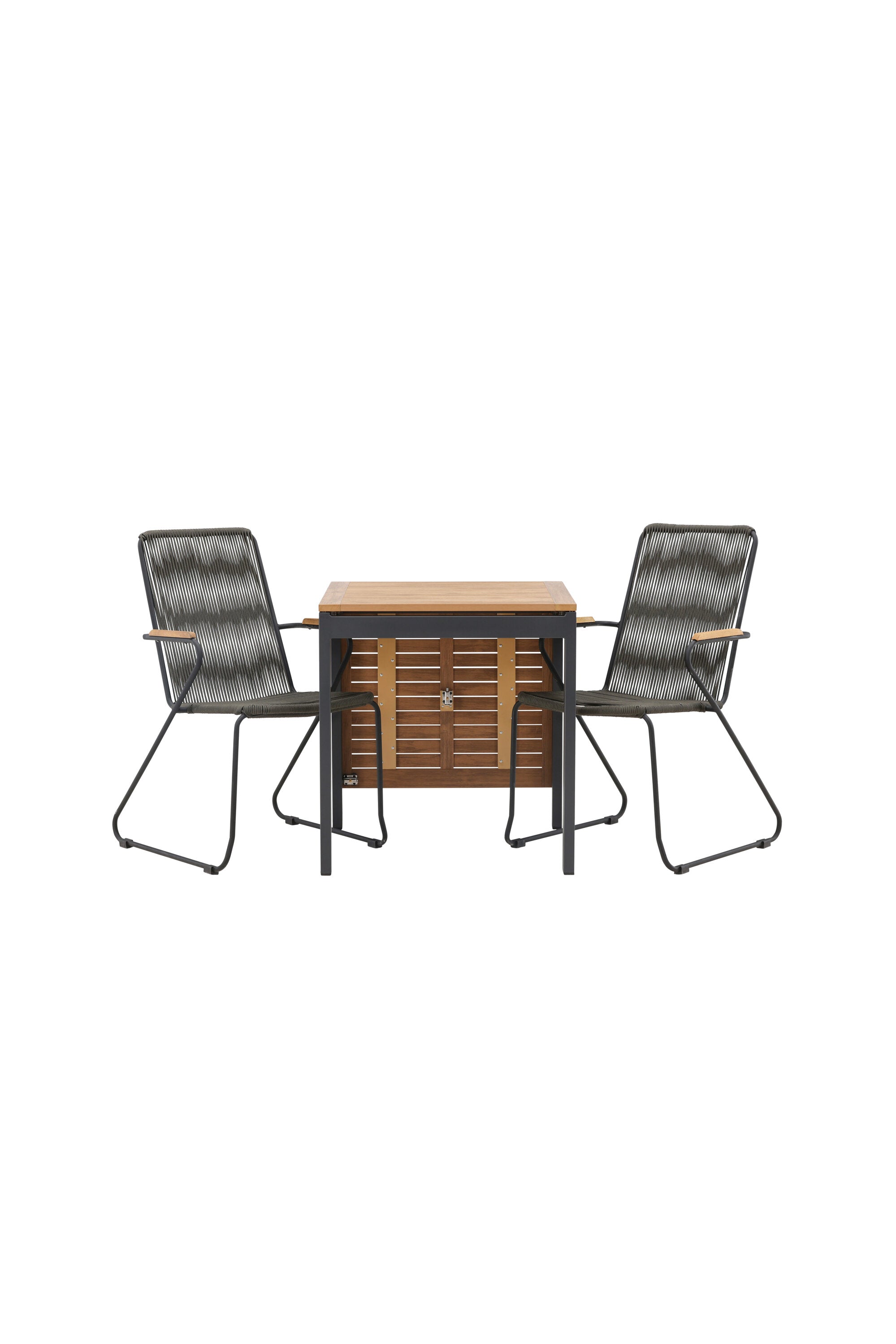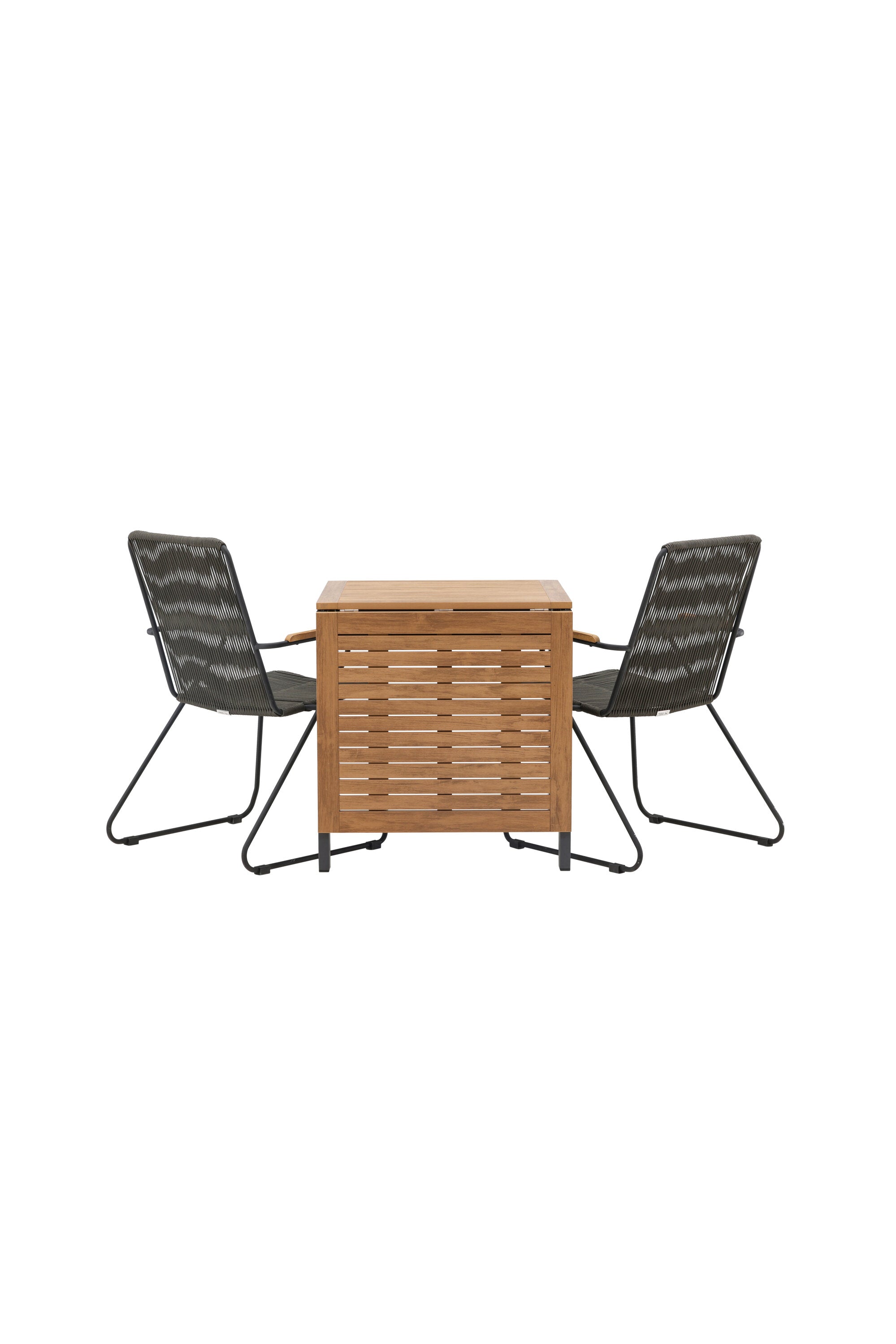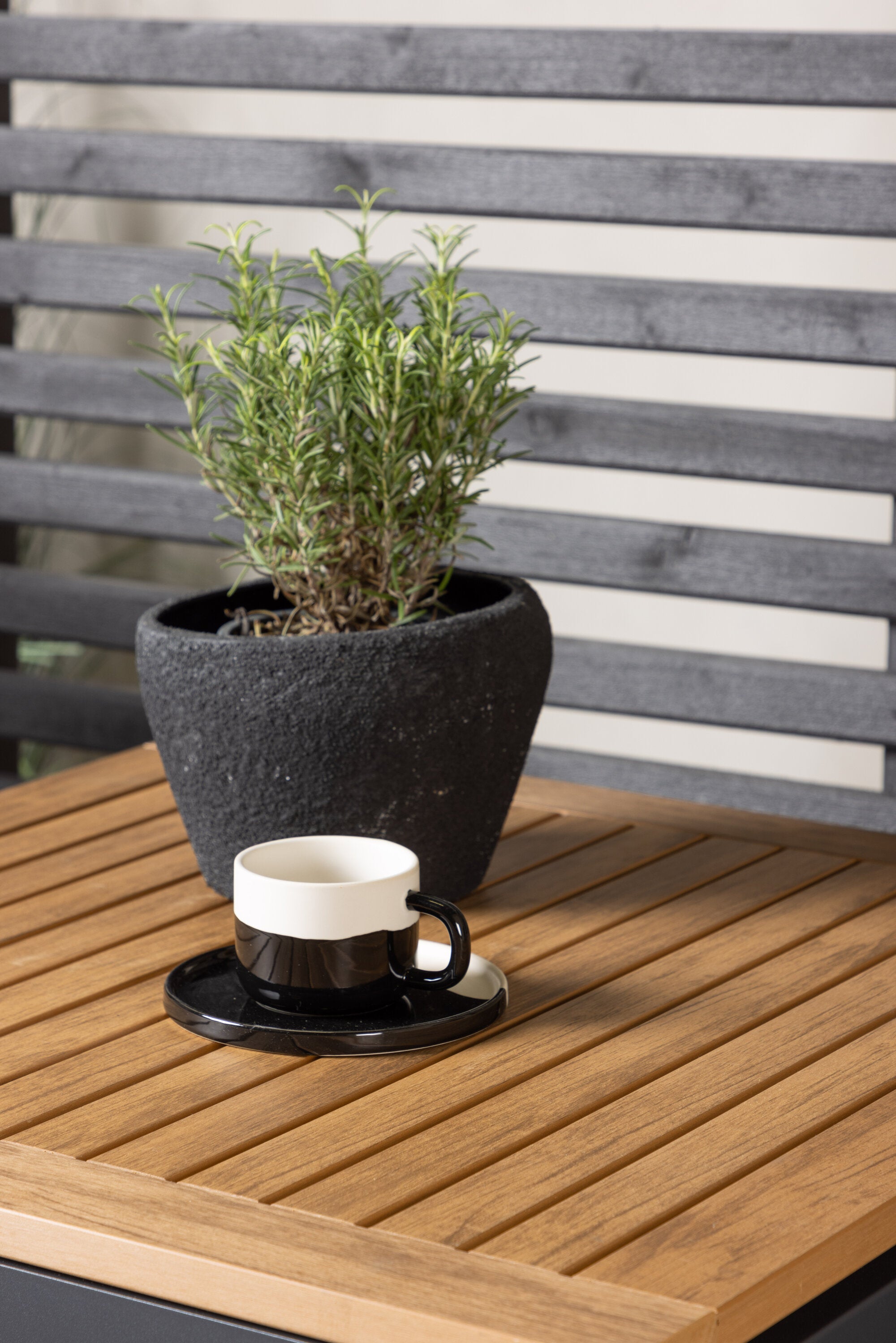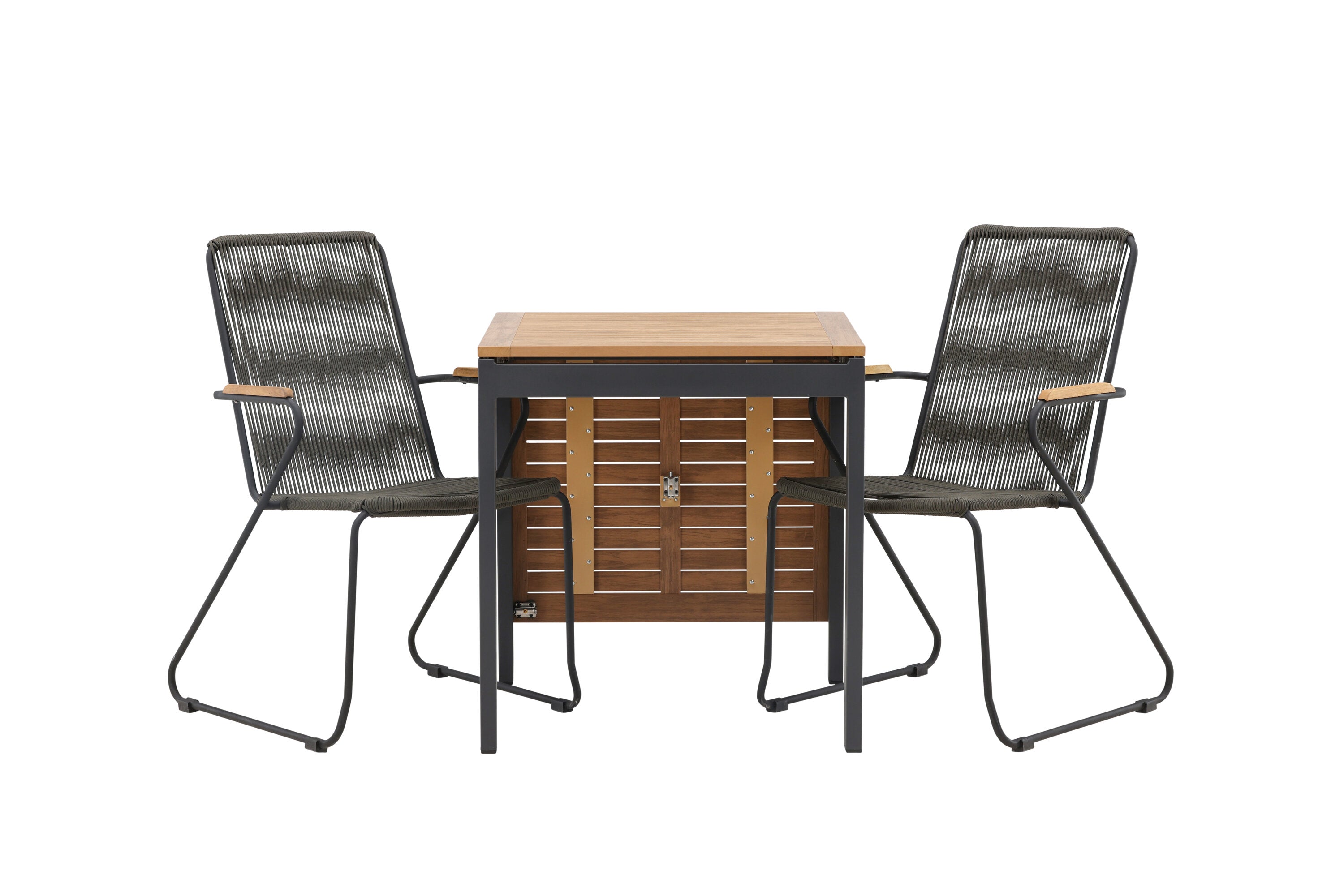 Pijte si toto léto kávu venku! Kavárenský stůl Diego je stejně chytrý jako stylový s deskou v hnědém aintwoodu a nohami v černém hliníku. Stůl má také jednoduchou konstrukci, která umožňuje snadné skládání nástavných desek po stranách. Zde společně se 2 šedými jídelními židlemi ze série Bois. Židle má sedák z odolného šedého lana a úzký rám z černé oceli. Perfektní jídelní skupina na malý balkon! Rozměry stolu: 130/70x70cm.