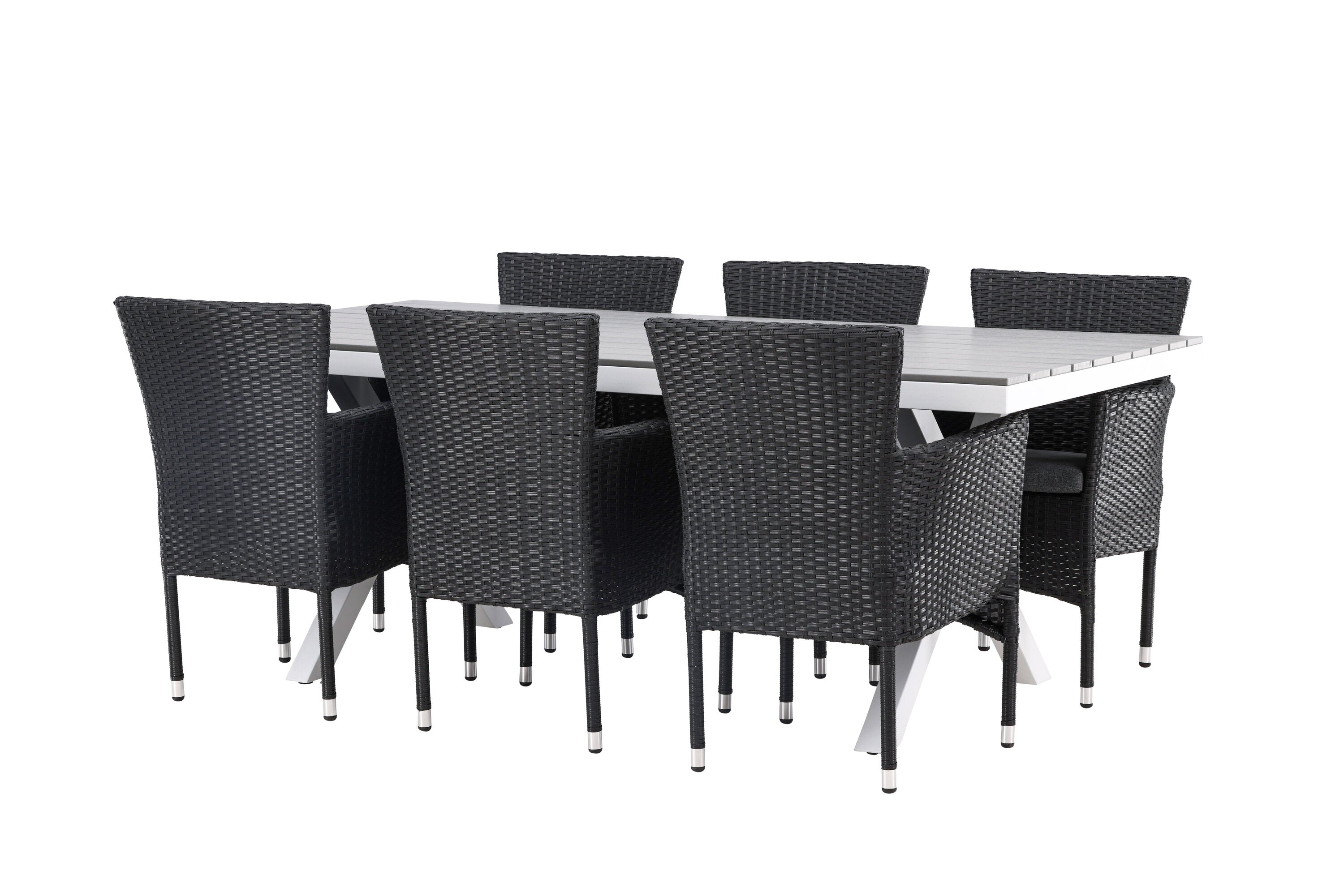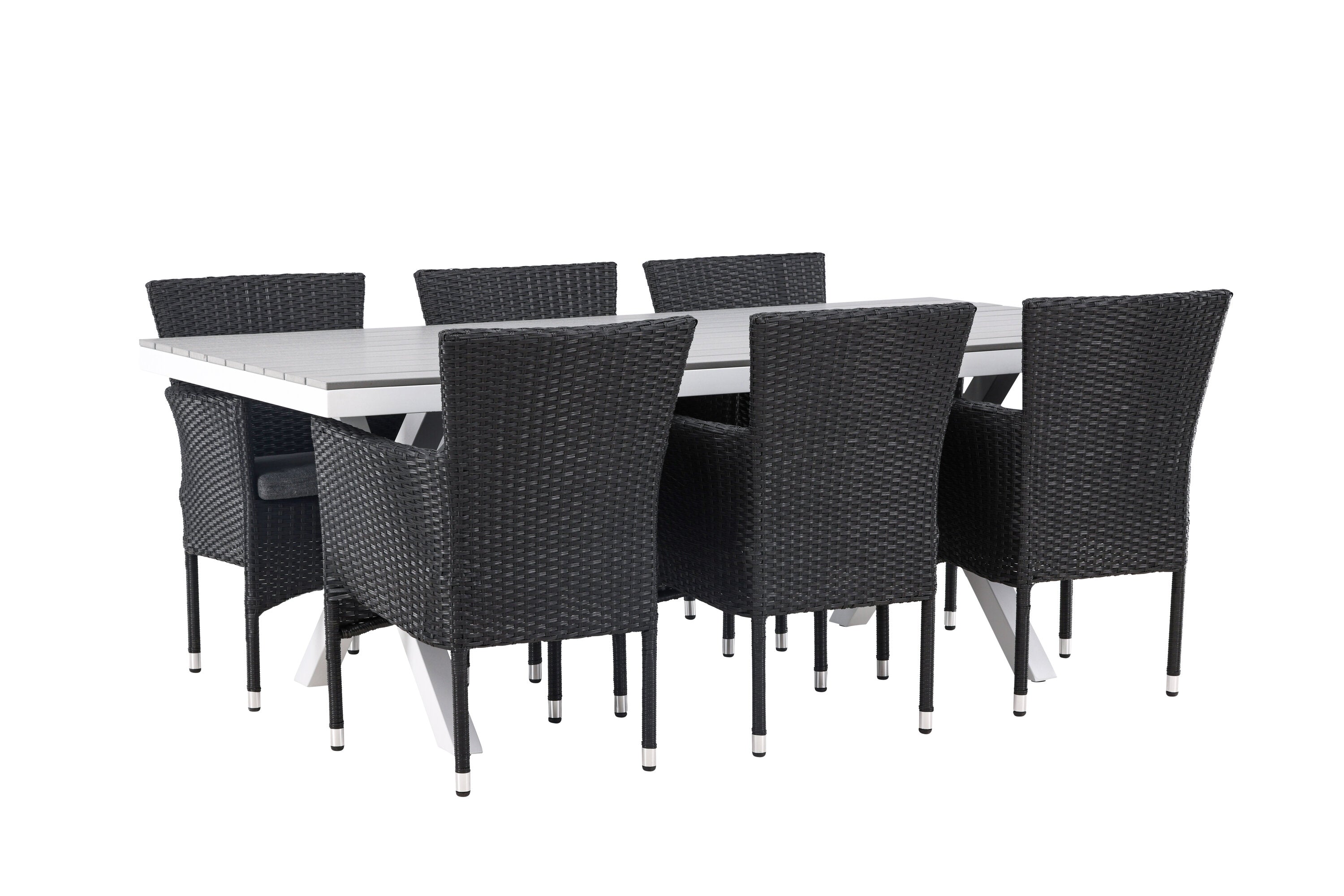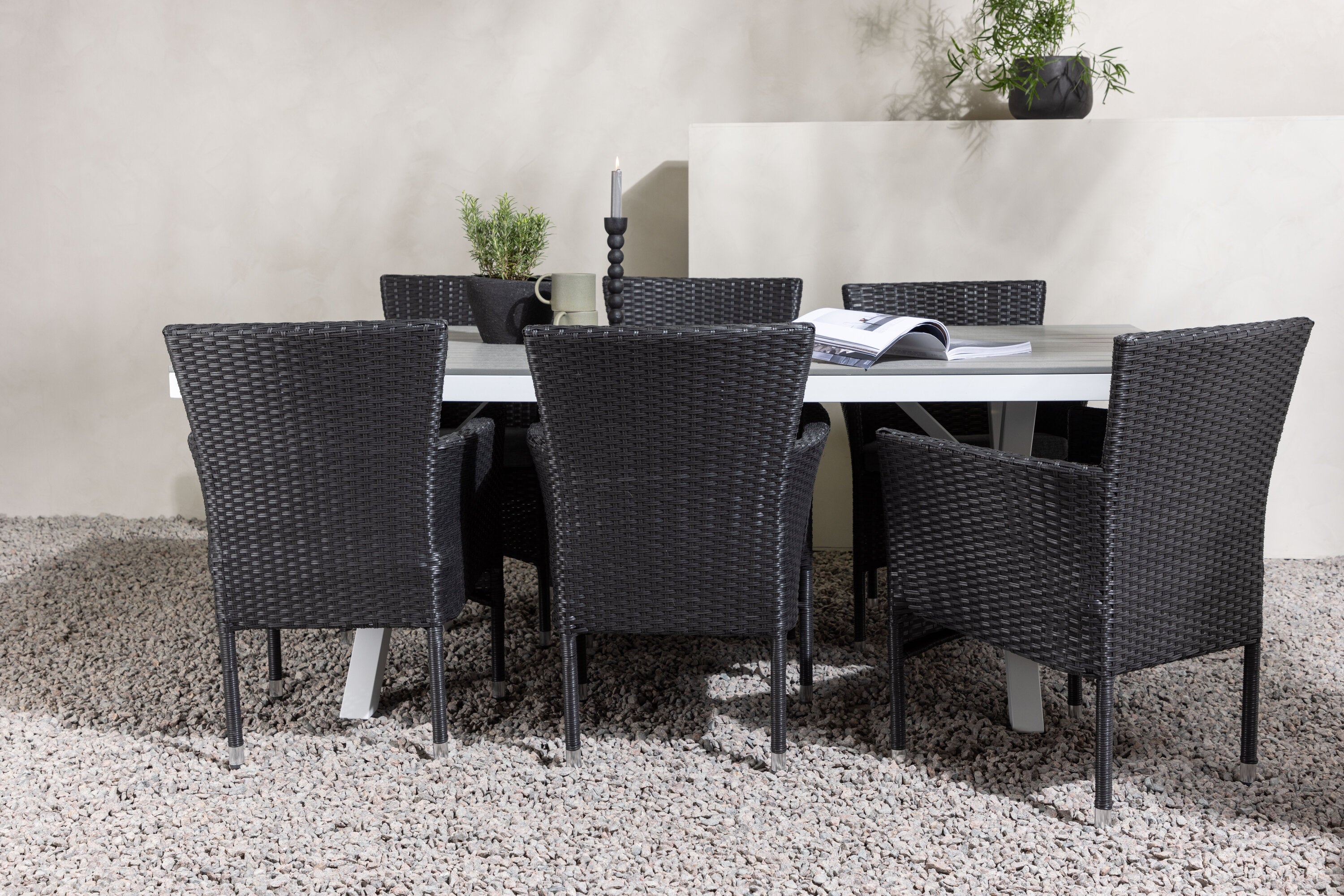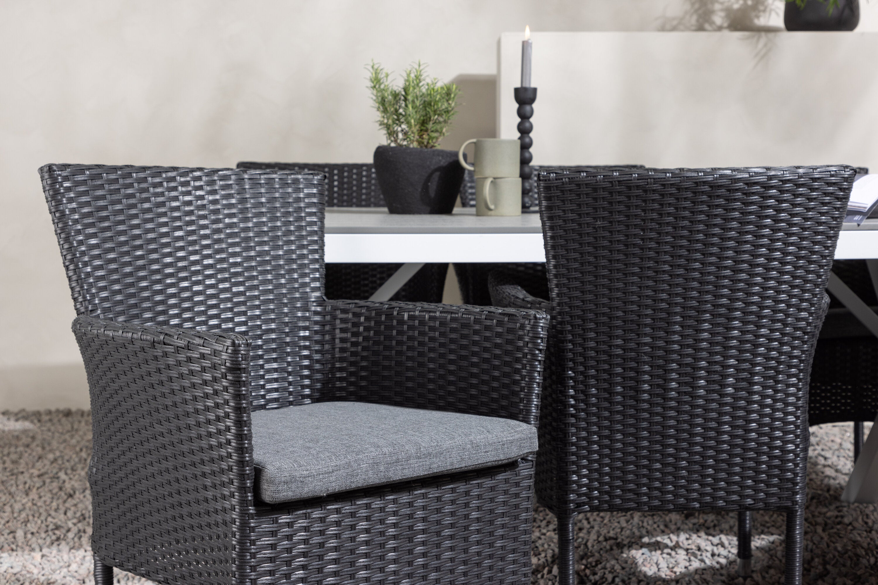 Dokonalá kombinace vysokého komfortu a stylového designu - tato jídelní sestava je vhodná pro všechny příležitosti! Náš obdélníkový jídelní stůl Garcia má klasický design se stolovou deskou z vkusného aintwoodu a zkříženými nohami stolu v bílém hliníku. Zde ve fantastické kombinaci s ratanovými křesly ze série Malina. Židle má hliníkový rám a sedák z umělého ratanu v černé barvě. Pohodlně se letos v létě usaďte a vychutnejte si lahodná jídla venku! Rozměry stolu: 200 x 100 cm.