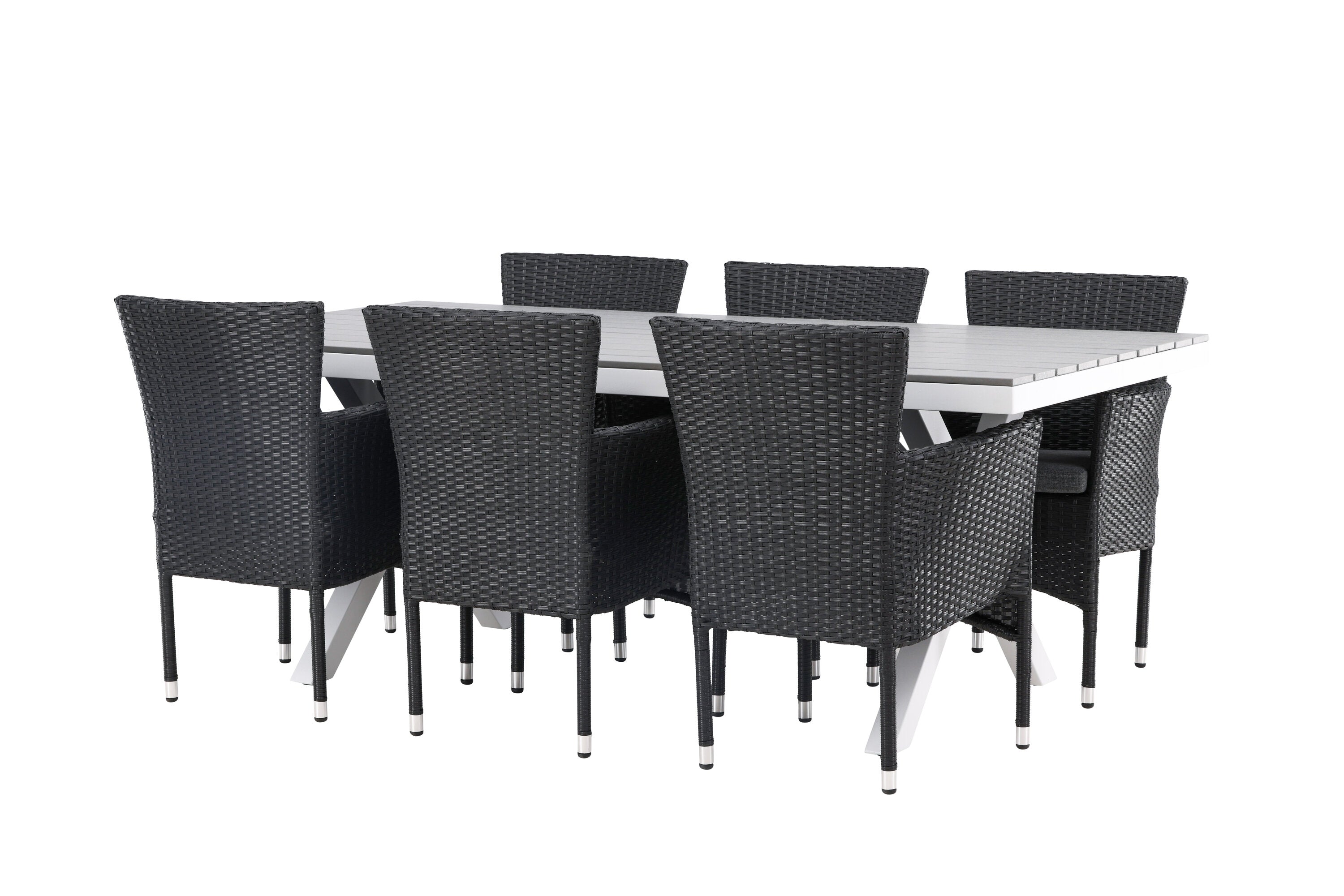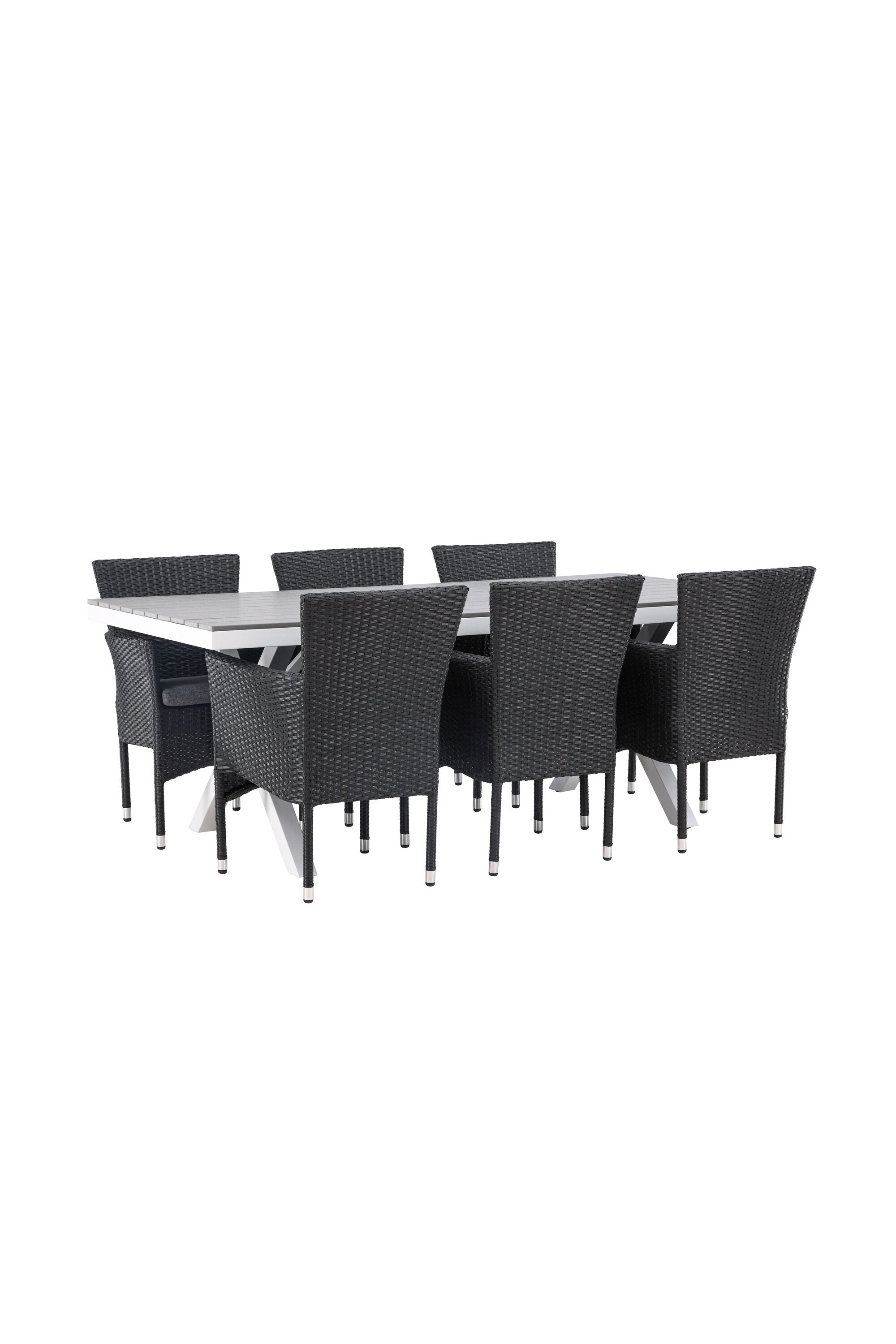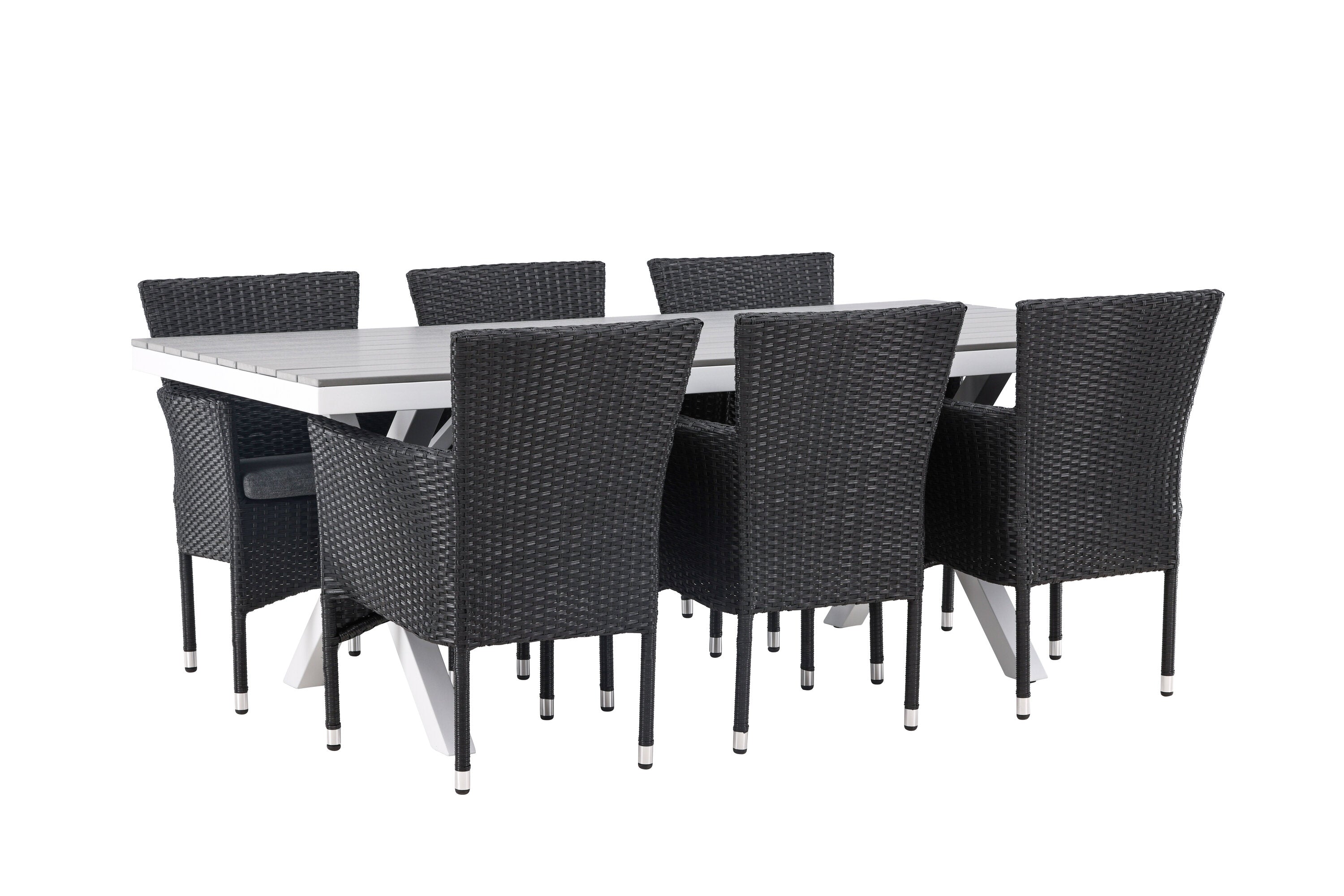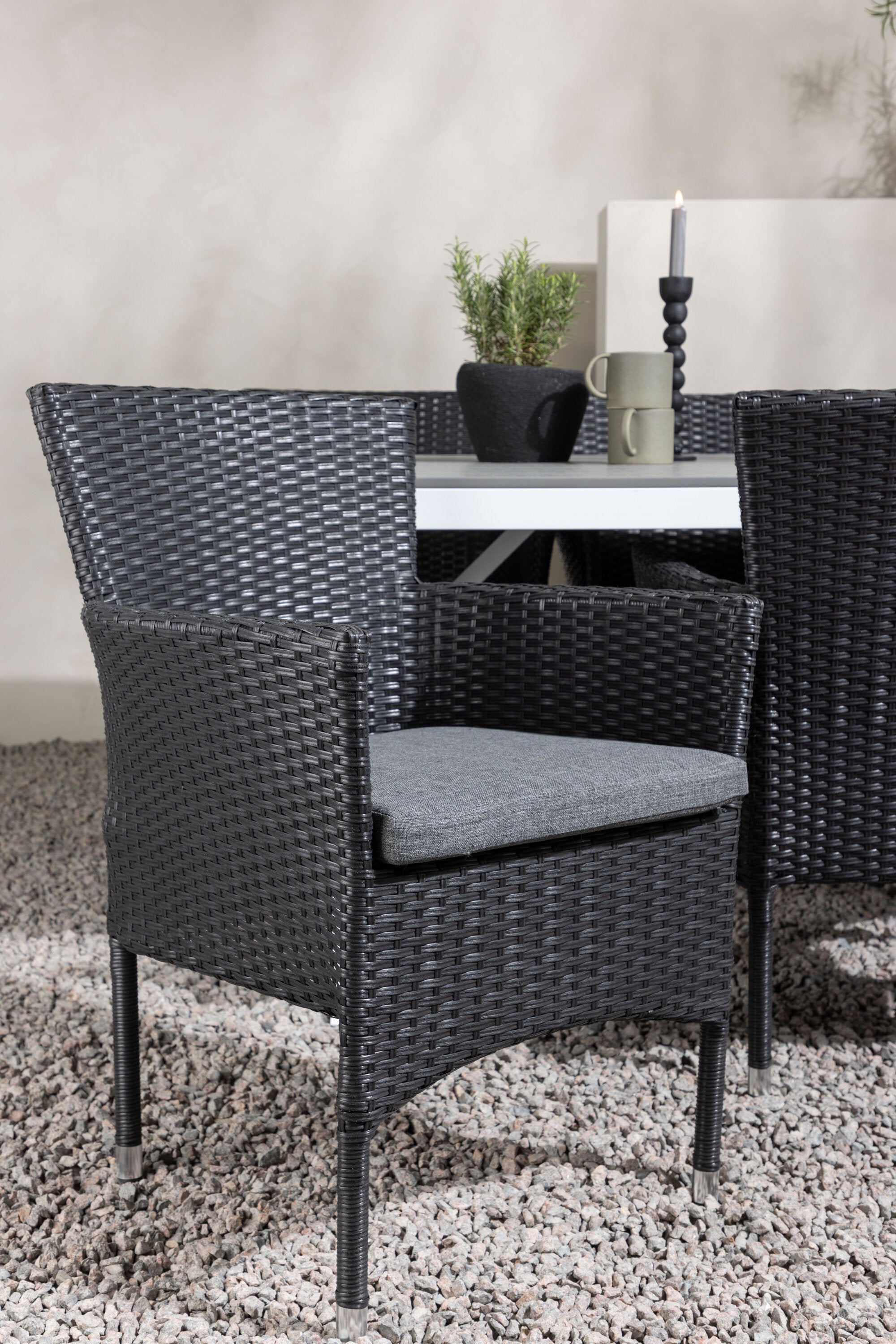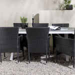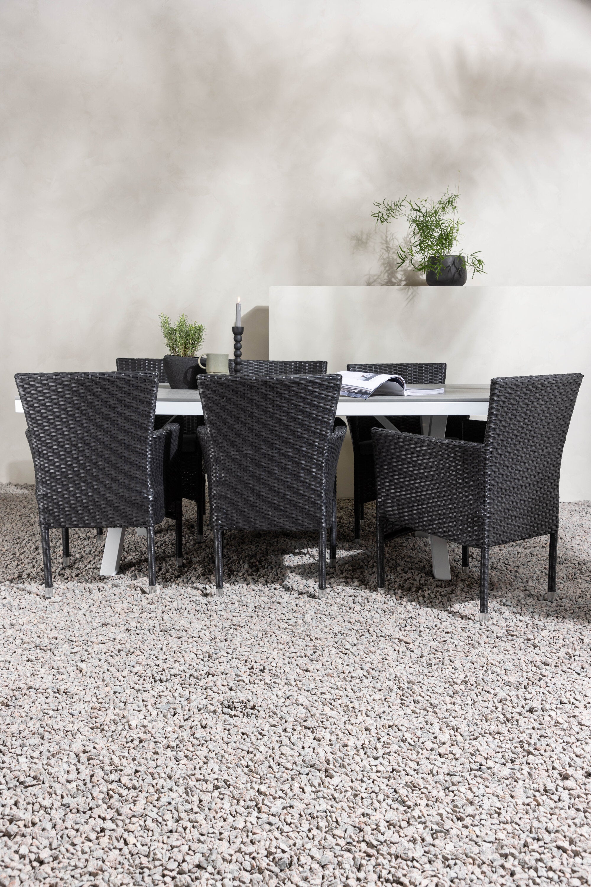 Dokonalá kombinace vysokého komfortu a stylového designu - tato jídelní sestava je vhodná pro všechny příležitosti! Náš obdélníkový jídelní stůl Garcia má klasický design se stolovou deskou z vkusného aintwoodu a zkříženými nohami stolu v bílém hliníku. Zde ve fantastické kombinaci s ratanovými křesly ze série Malina. Židle má hliníkový rám a sedák z umělého ratanu v černé barvě. Pohodlně se letos v létě usaďte a vychutnejte si lahodná jídla venku! Rozměry stolu: 200 x 100 cm.