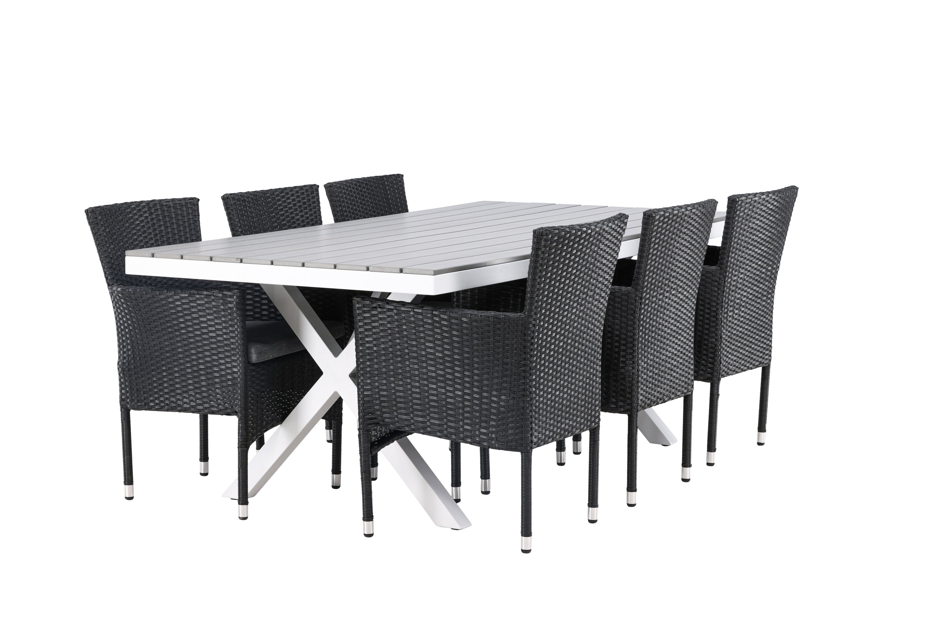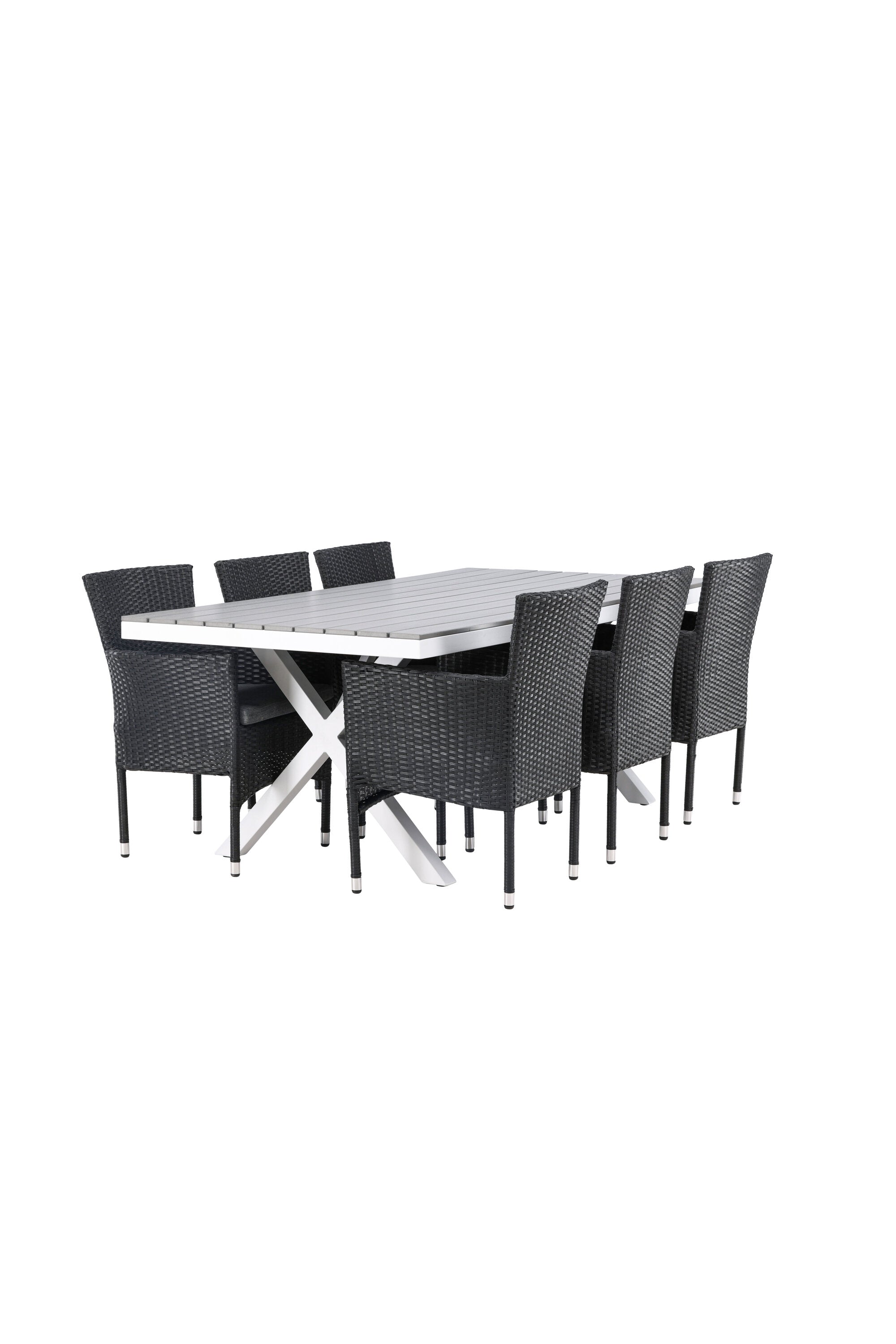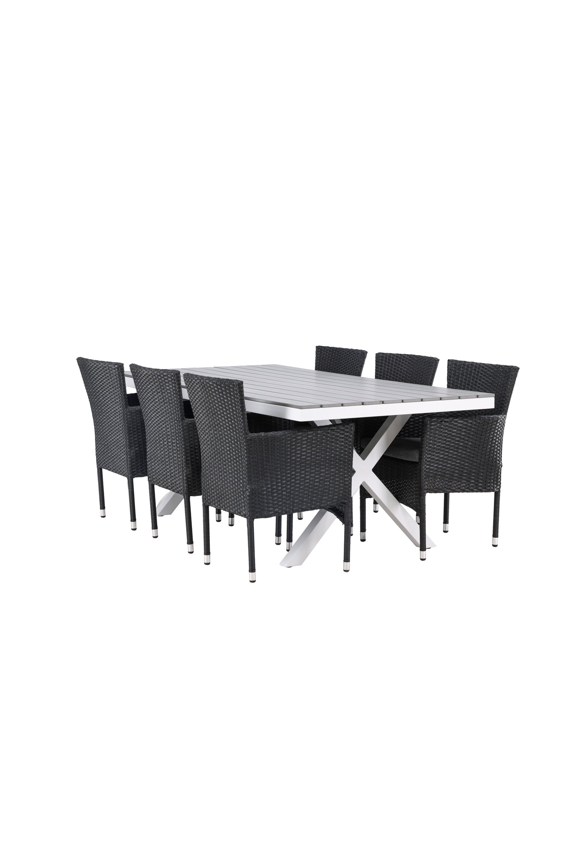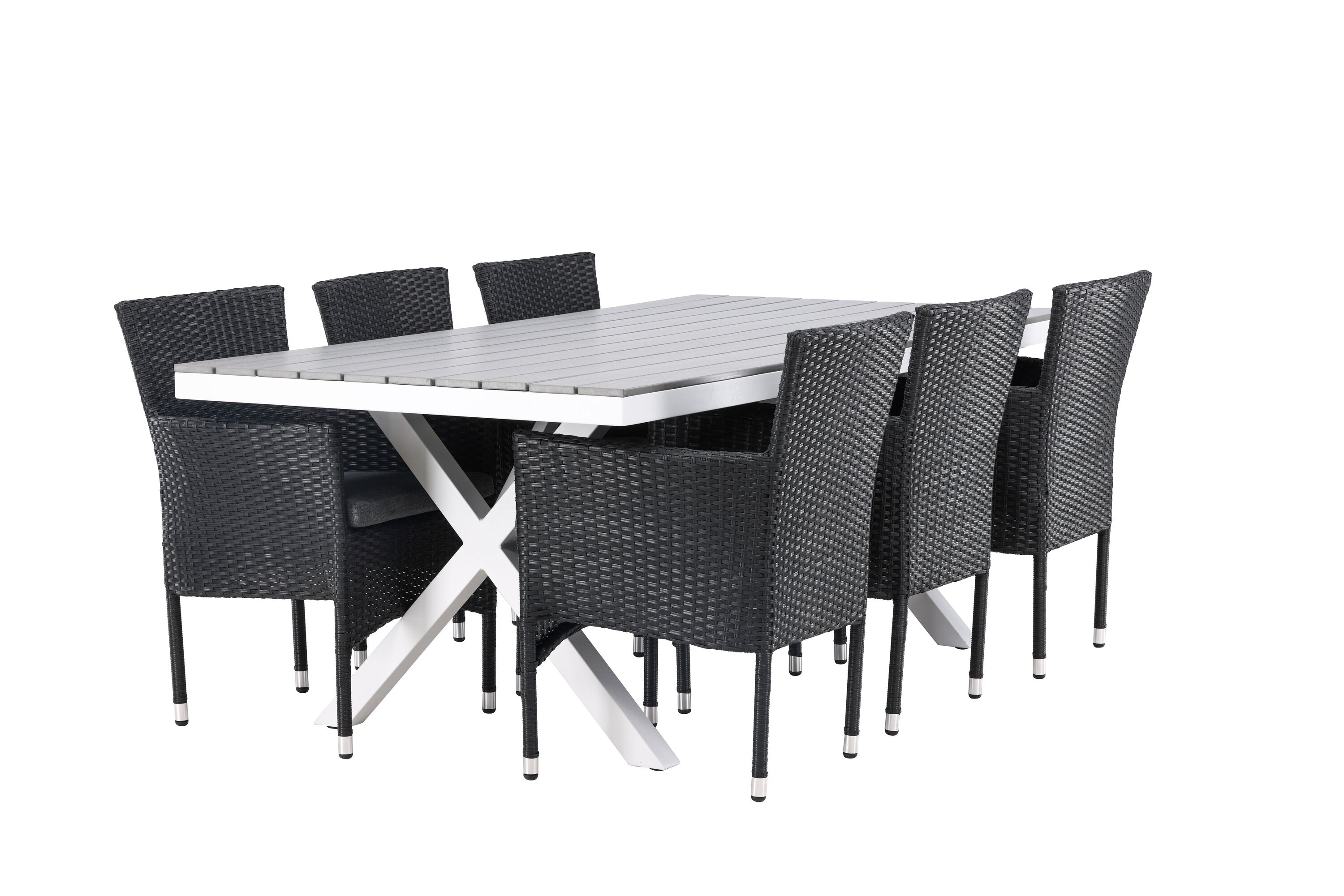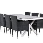 Dokonalá kombinace vysokého komfortu a stylového designu - tato jídelní sestava je vhodná pro všechny příležitosti! Náš obdélníkový jídelní stůl Garcia má klasický design se stolovou deskou z vkusného aintwoodu a zkříženými nohami stolu v bílém hliníku. Zde ve fantastické kombinaci s ratanovými křesly ze série Malina. Židle má hliníkový rám a sedák z umělého ratanu v černé barvě. Pohodlně se letos v létě usaďte a vychutnejte si lahodná jídla venku! Rozměry stolu: 200 x 100 cm.