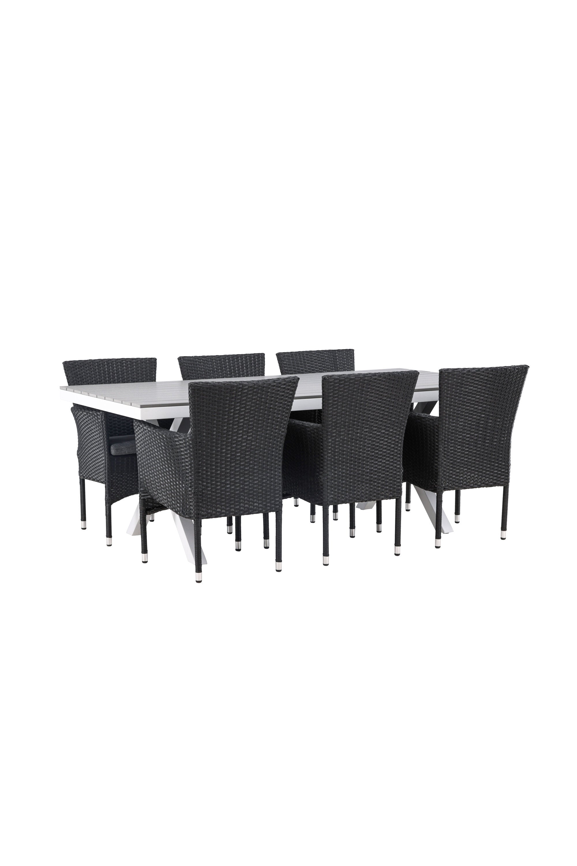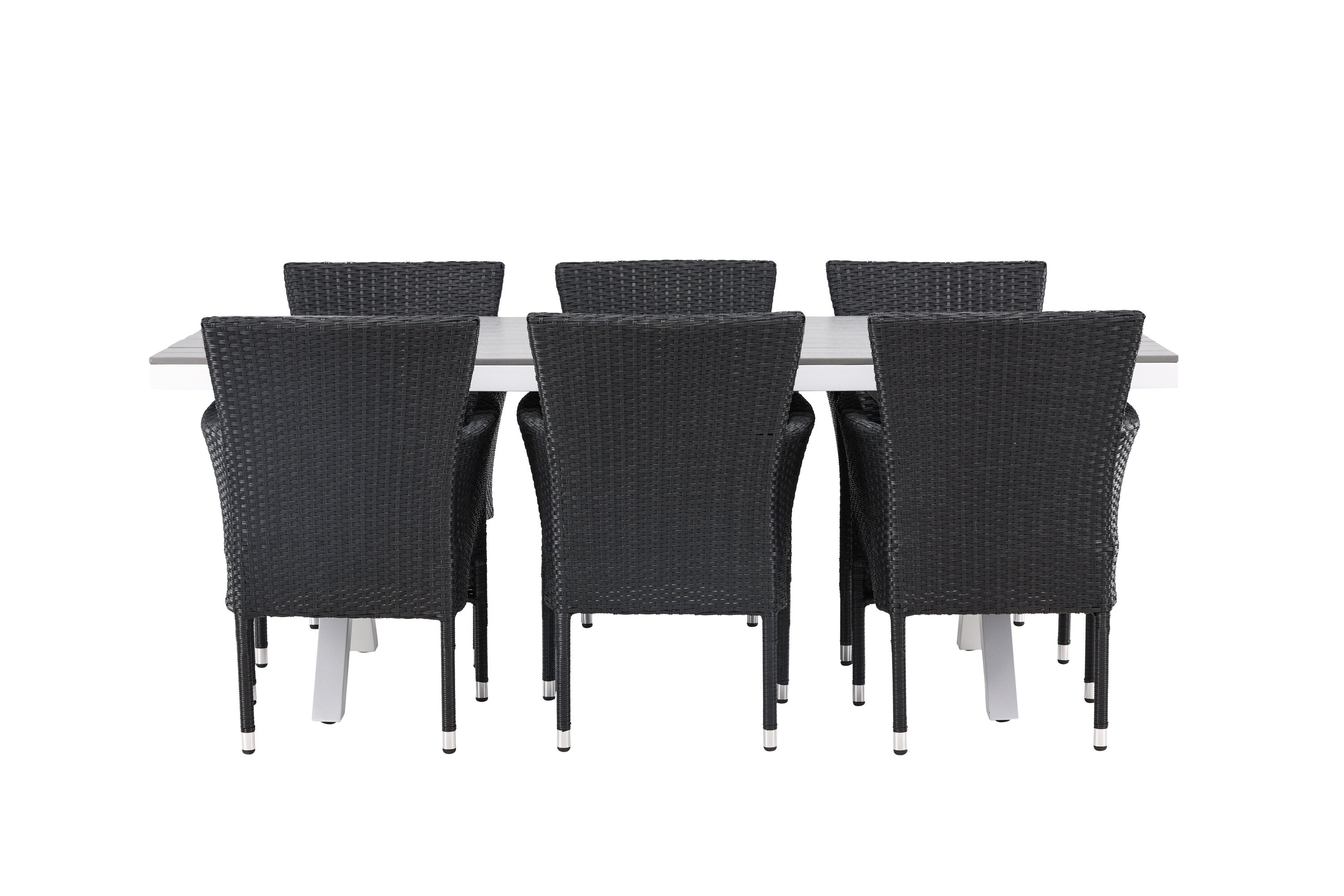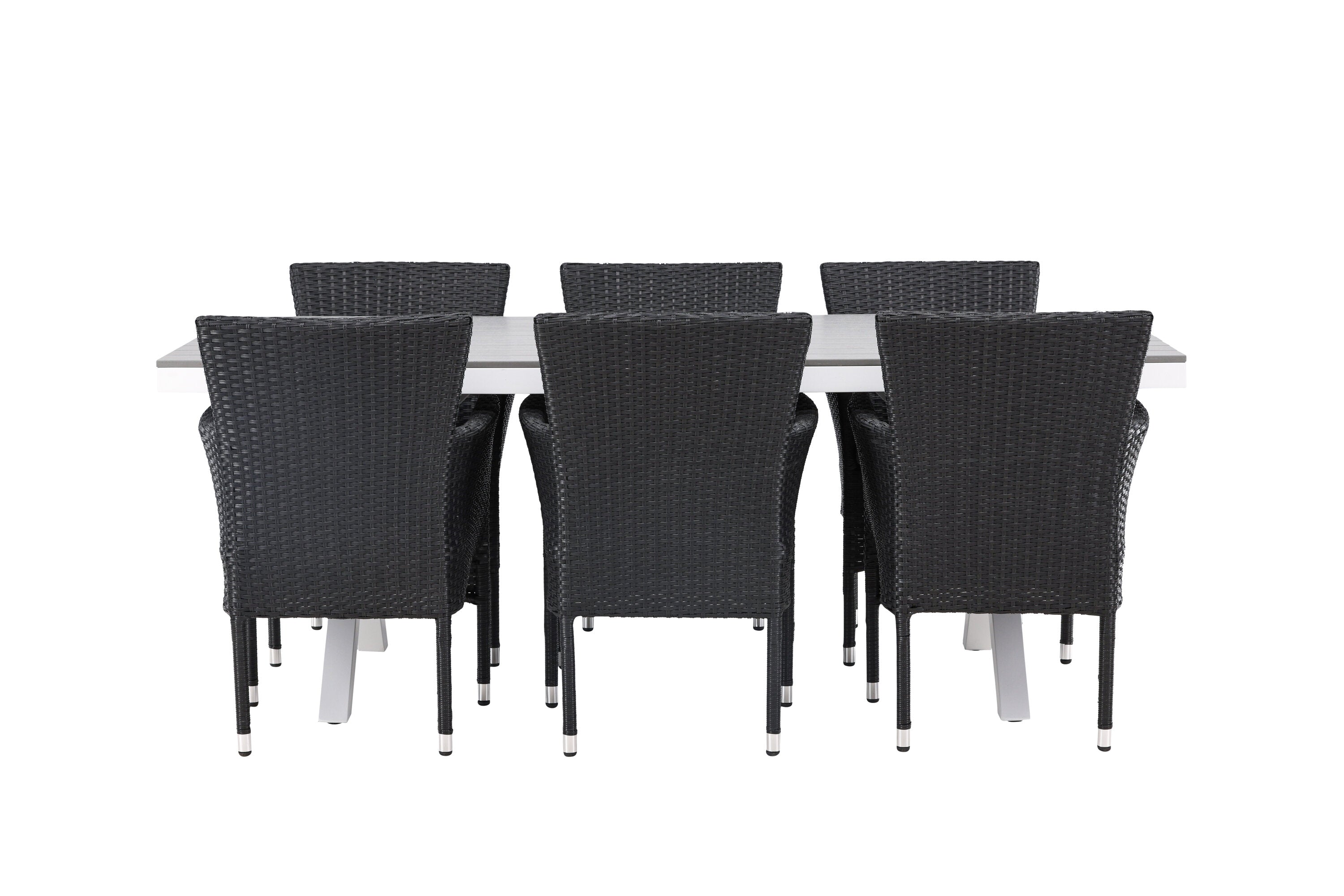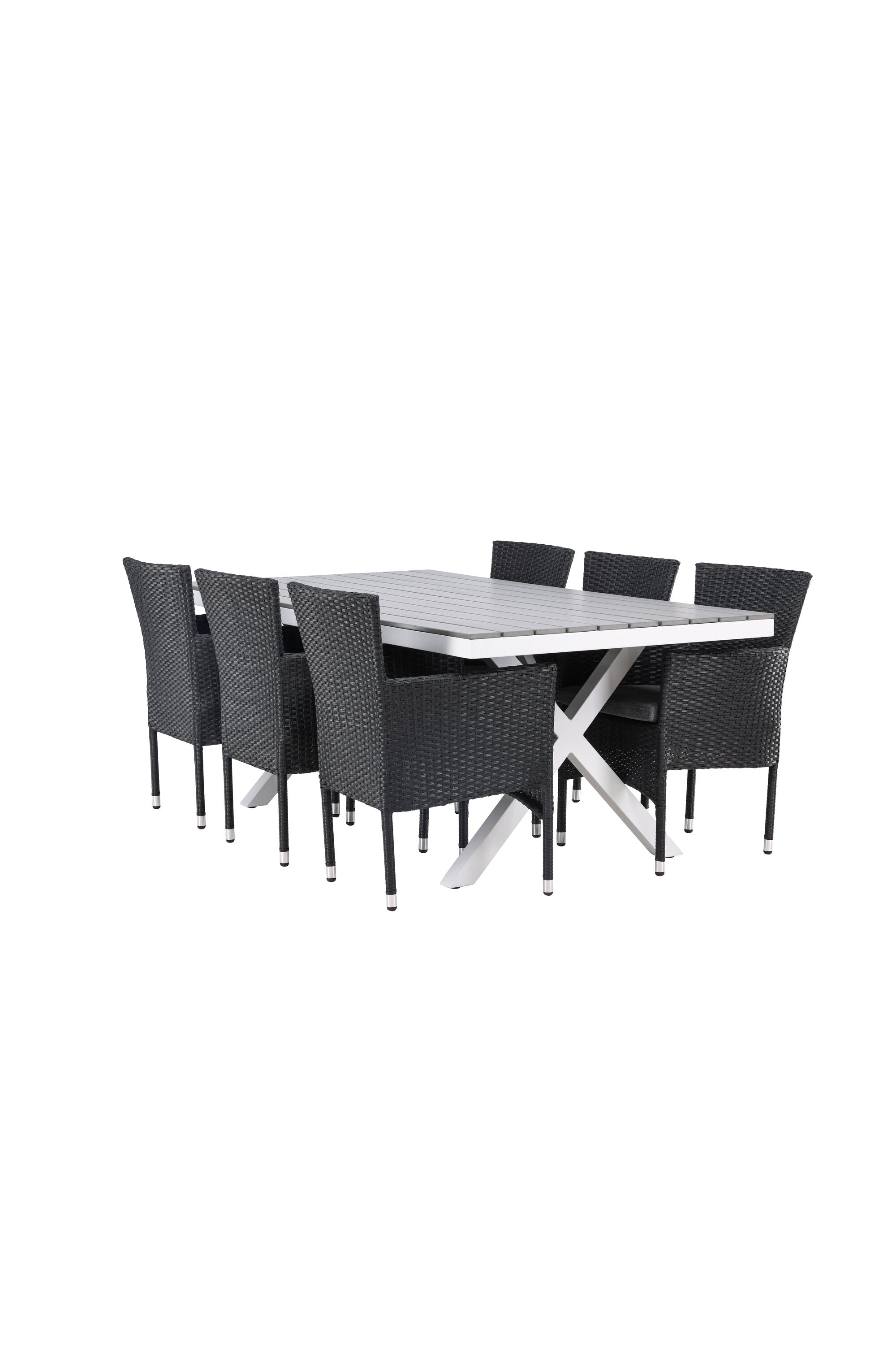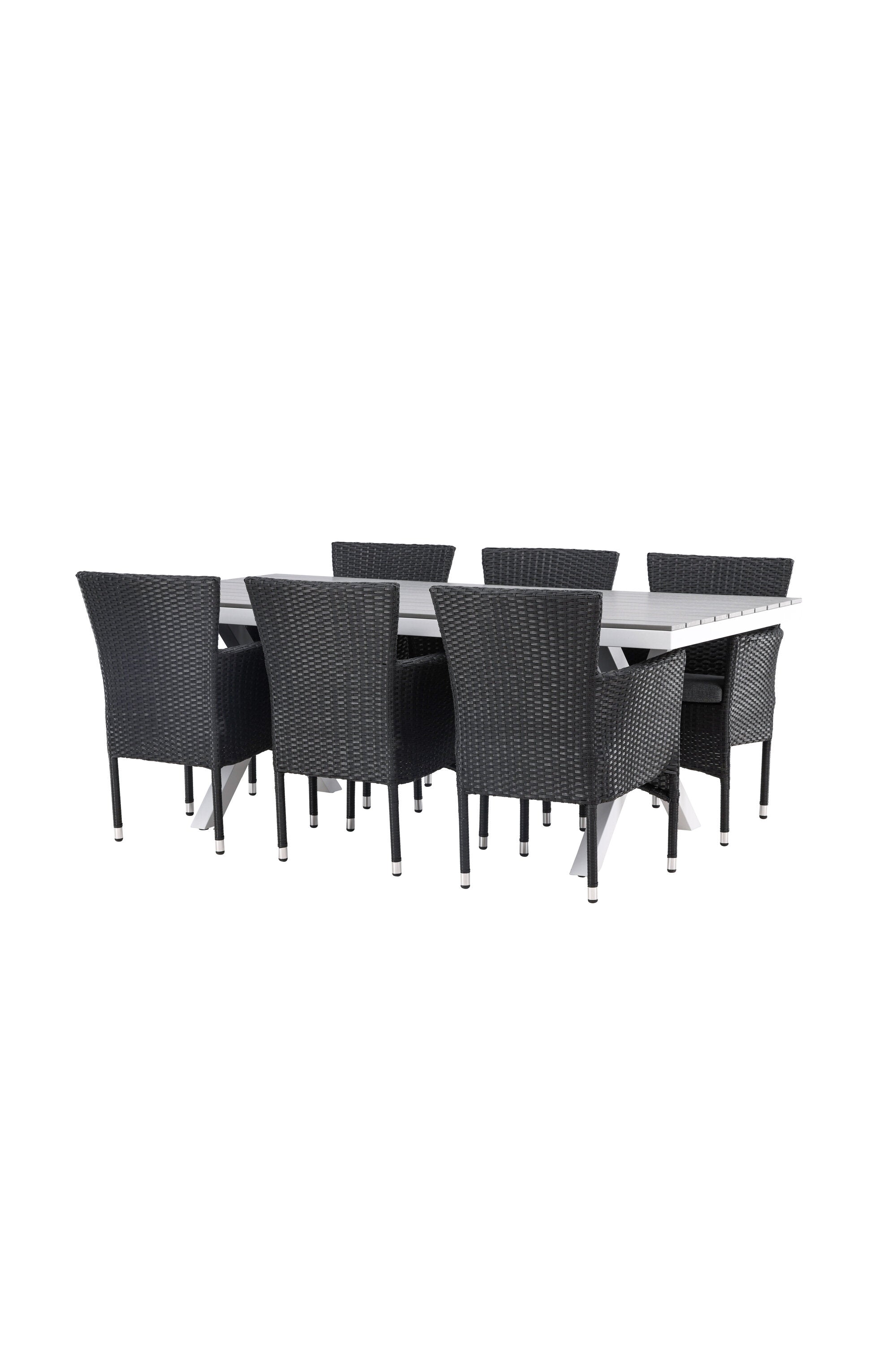 Dokonalá kombinace vysokého komfortu a stylového designu - tato jídelní sestava je vhodná pro všechny příležitosti! Náš obdélníkový jídelní stůl Garcia má klasický design se stolovou deskou z vkusného aintwoodu a zkříženými nohami stolu v bílém hliníku. Zde ve fantastické kombinaci s ratanovými křesly ze série Malina. Židle má hliníkový rám a sedák z umělého ratanu v černé barvě. Pohodlně se letos v létě usaďte a vychutnejte si lahodná jídla venku! Rozměry stolu: 200 x 100 cm.