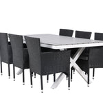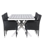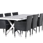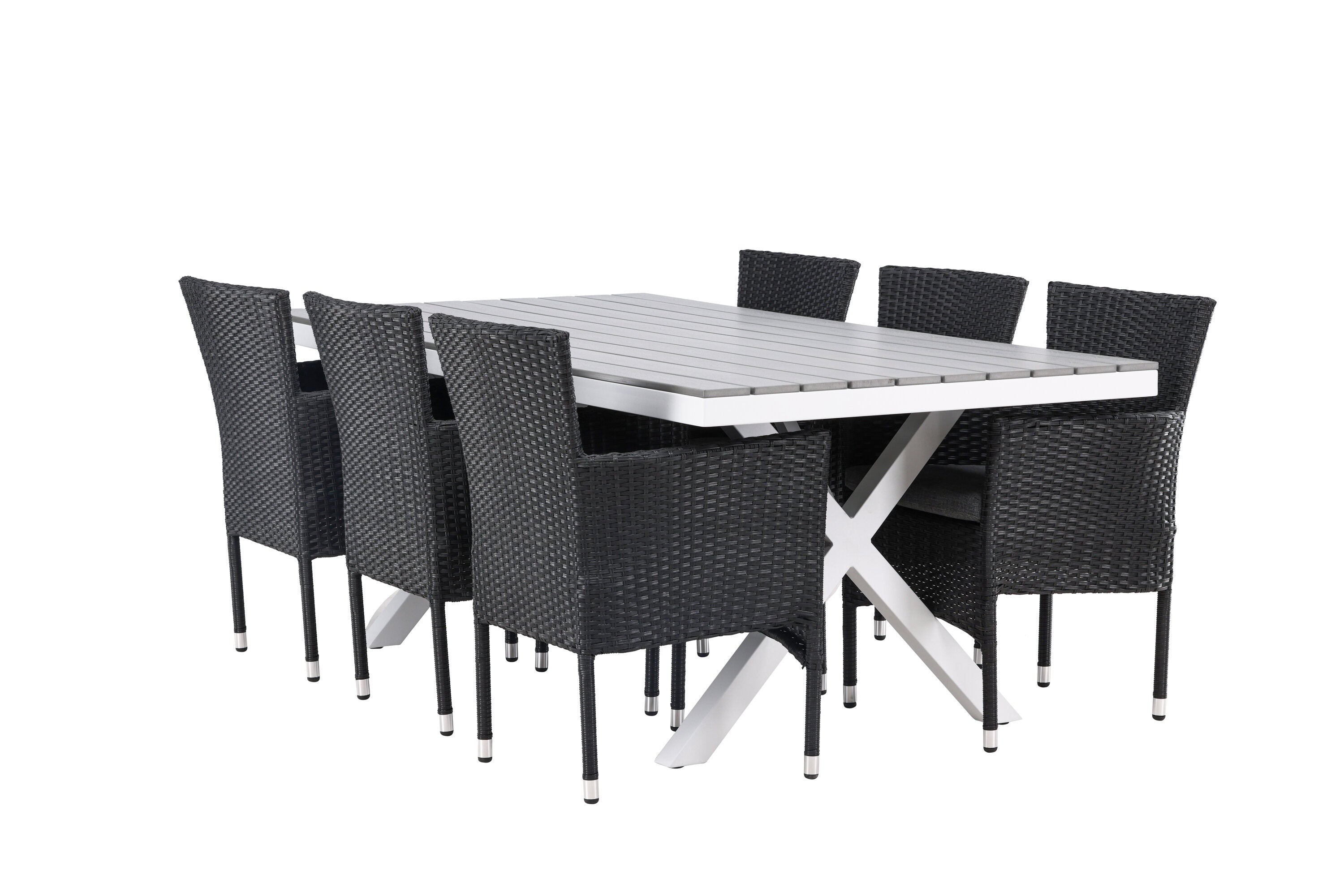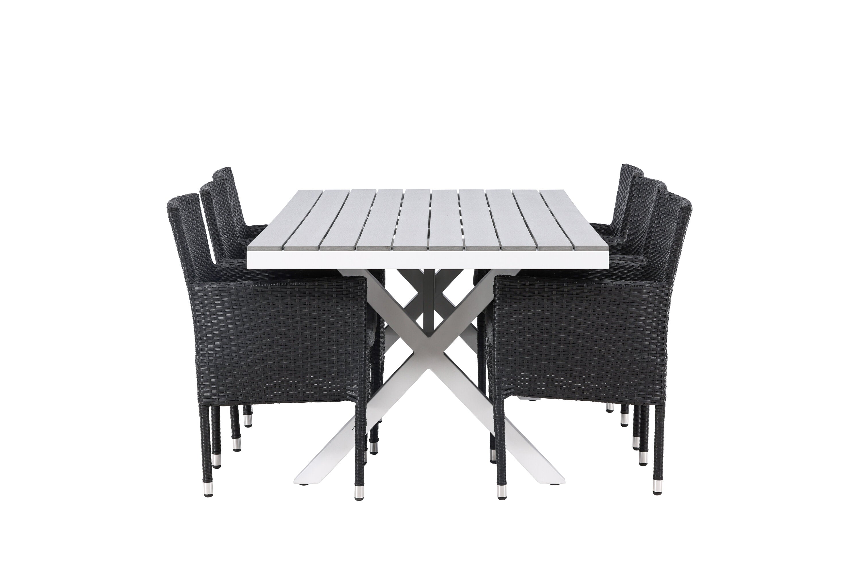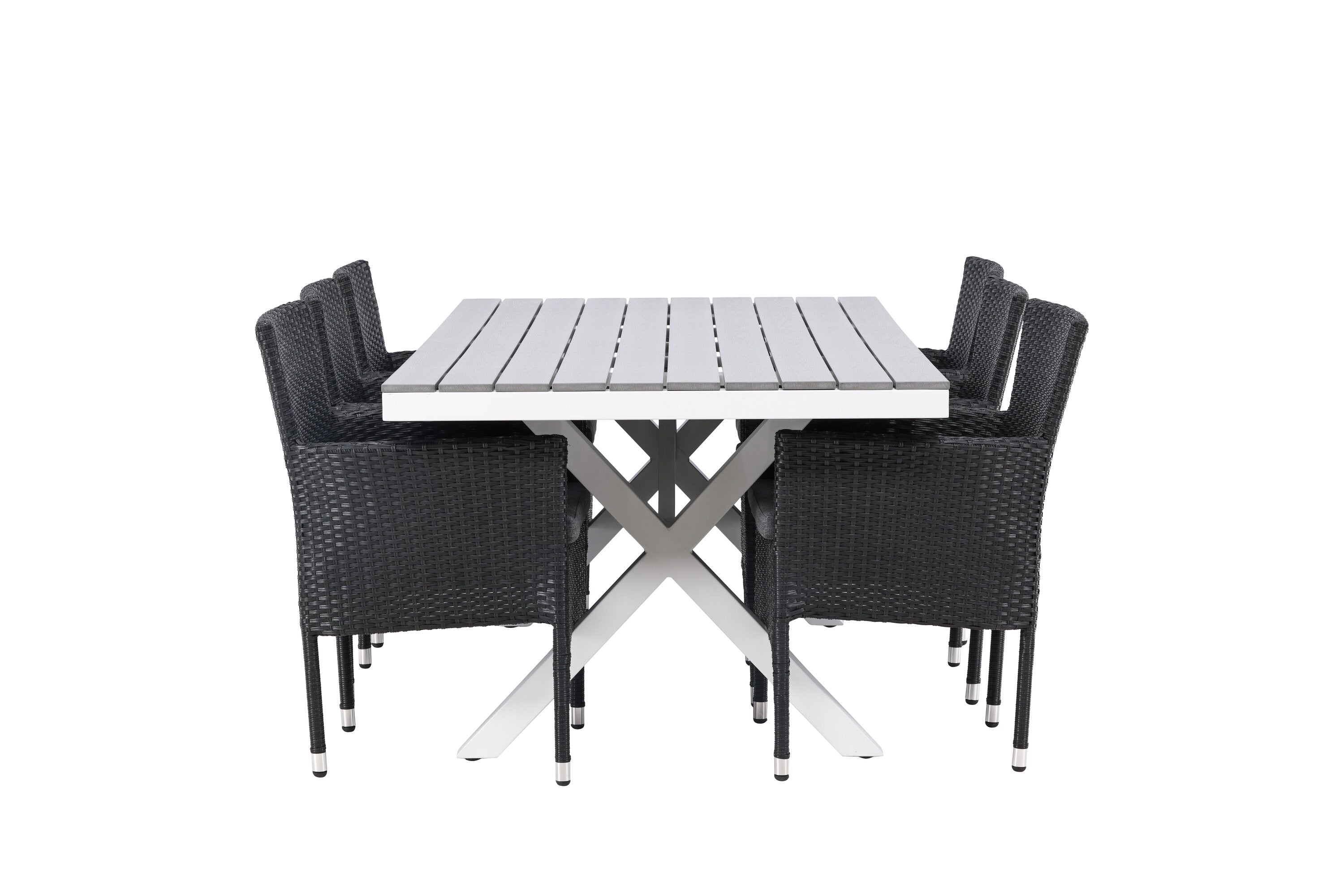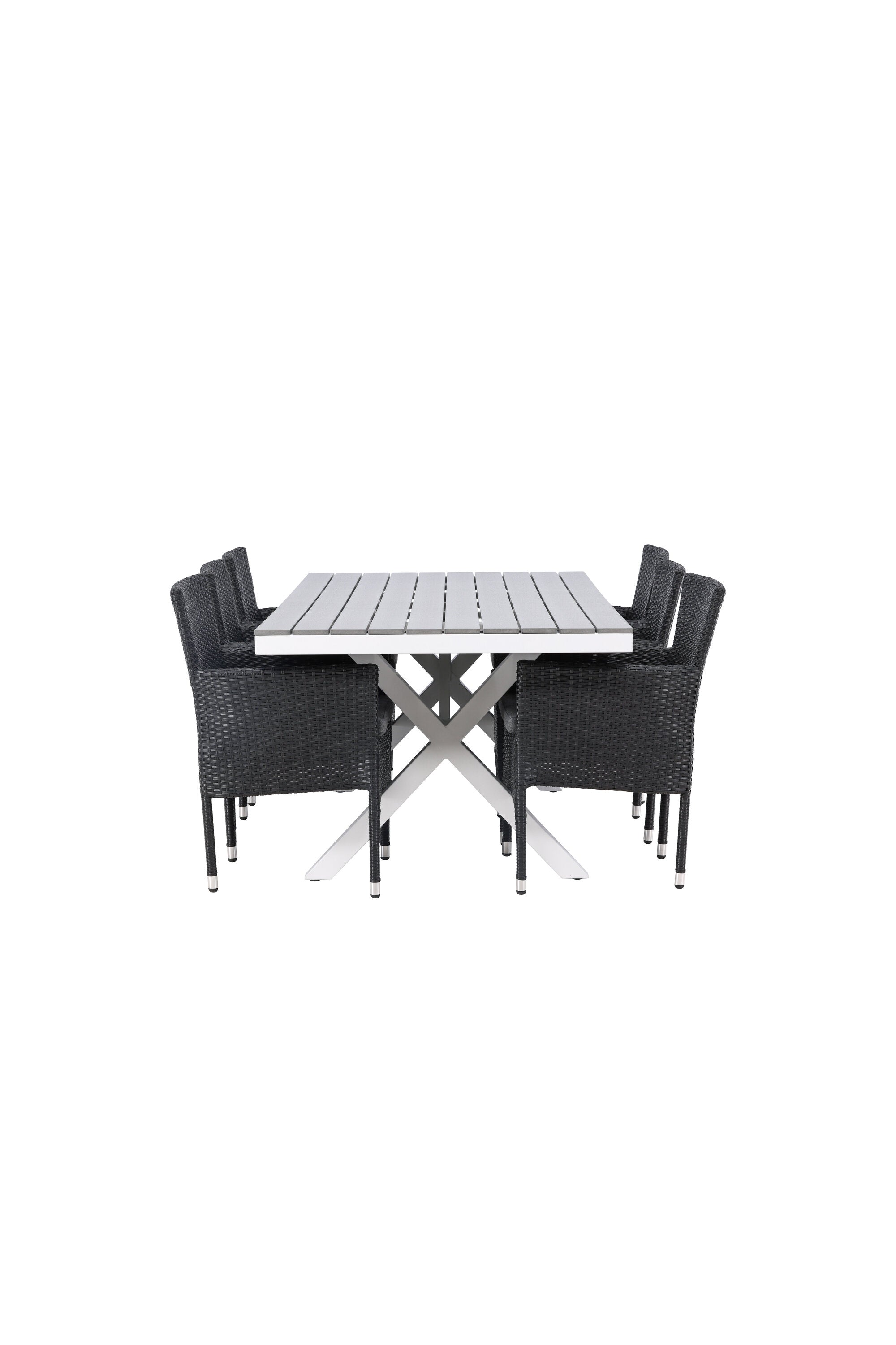 Dokonalá kombinace vysokého komfortu a stylového designu - tato jídelní sestava je vhodná pro všechny příležitosti! Náš obdélníkový jídelní stůl Garcia má klasický design se stolovou deskou z vkusného aintwoodu a zkříženými nohami stolu v bílém hliníku. Zde ve fantastické kombinaci s ratanovými křesly ze série Malina. Židle má hliníkový rám a sedák z umělého ratanu v černé barvě. Pohodlně se letos v létě usaďte a vychutnejte si lahodná jídla venku! Rozměry stolu: 200 x 100 cm.