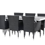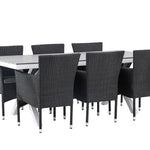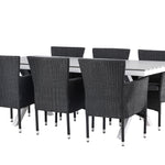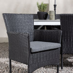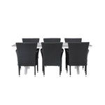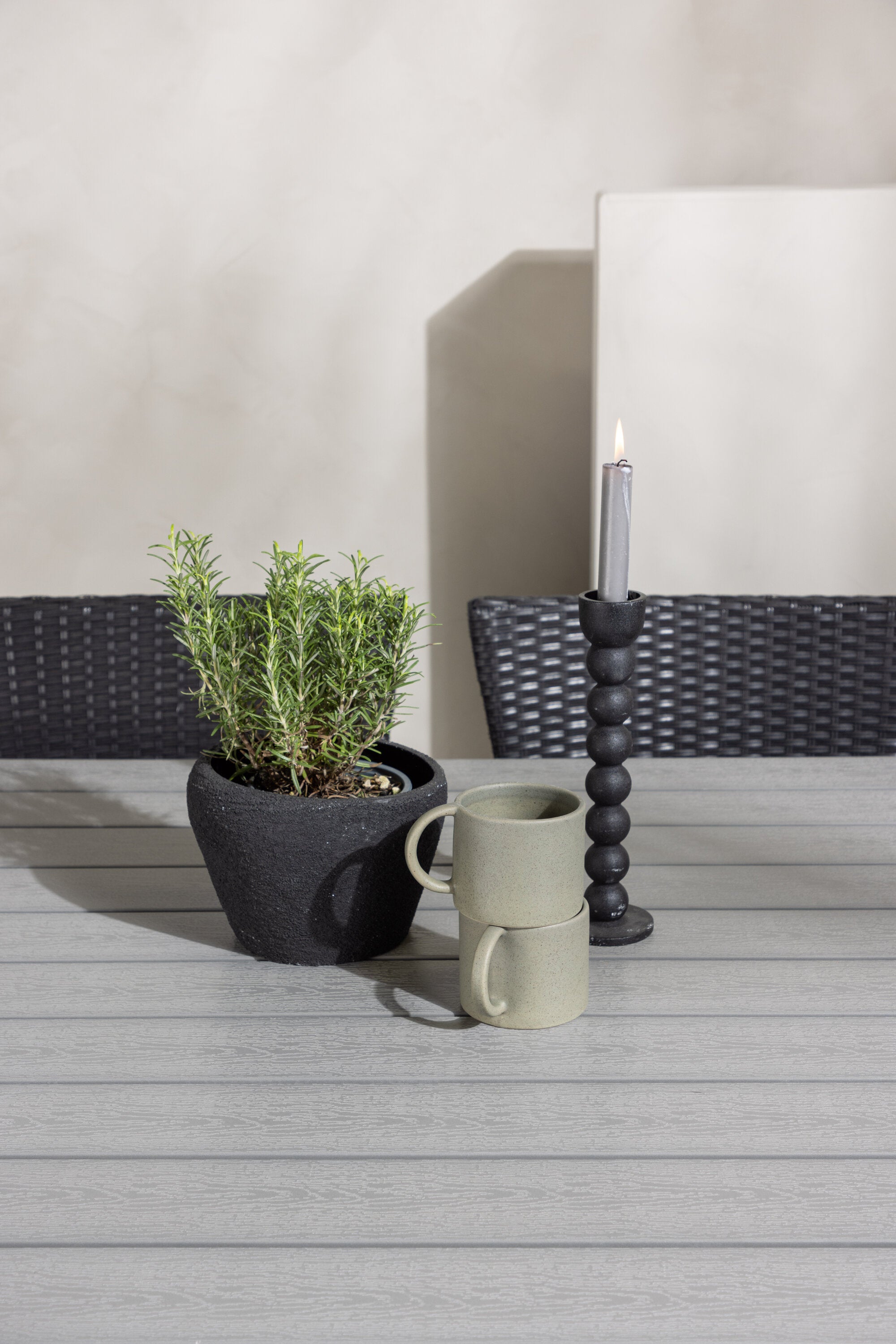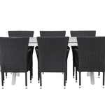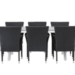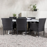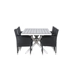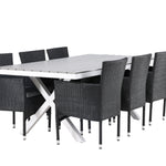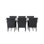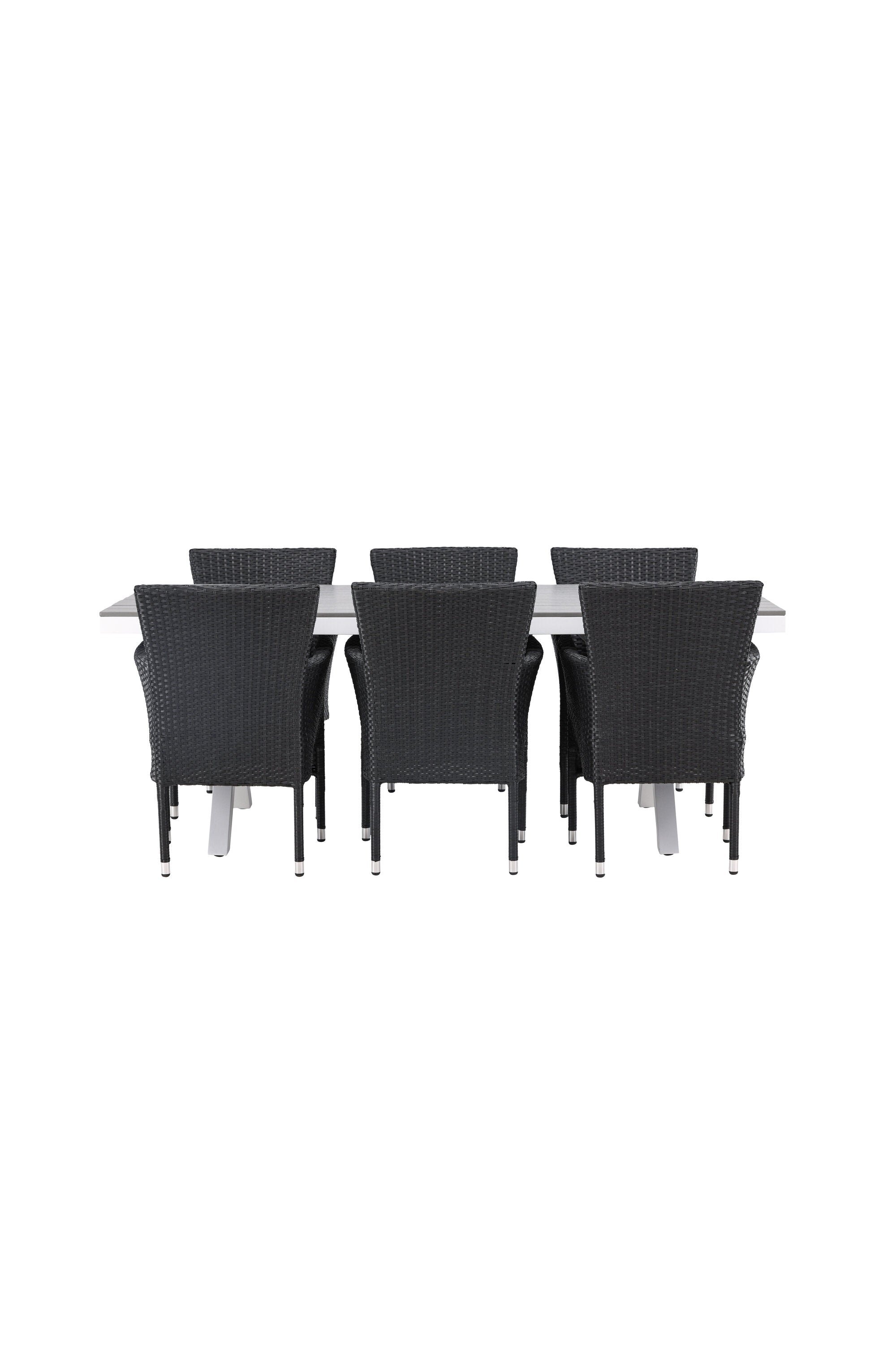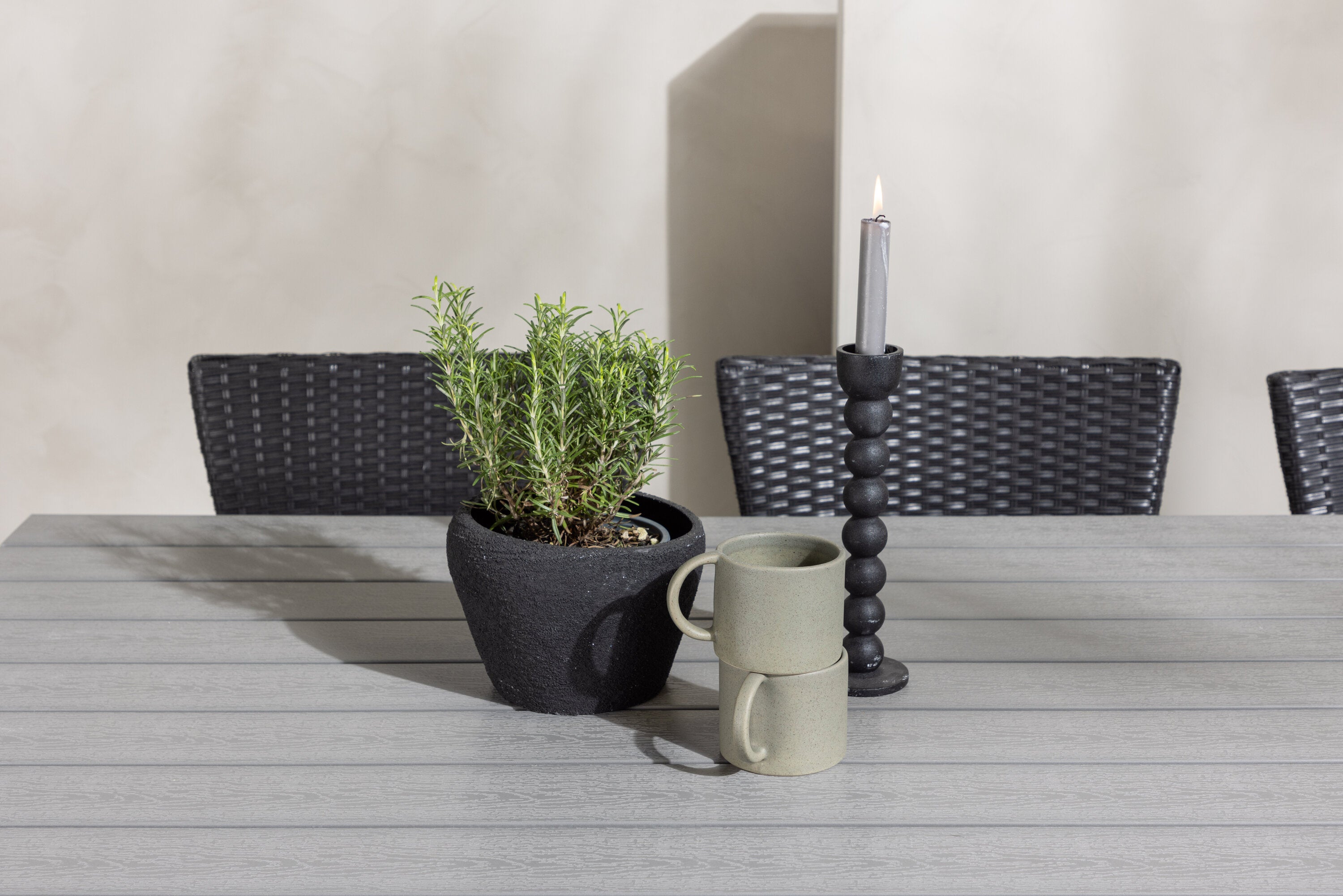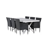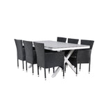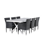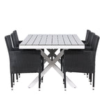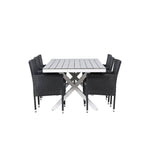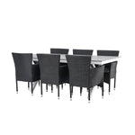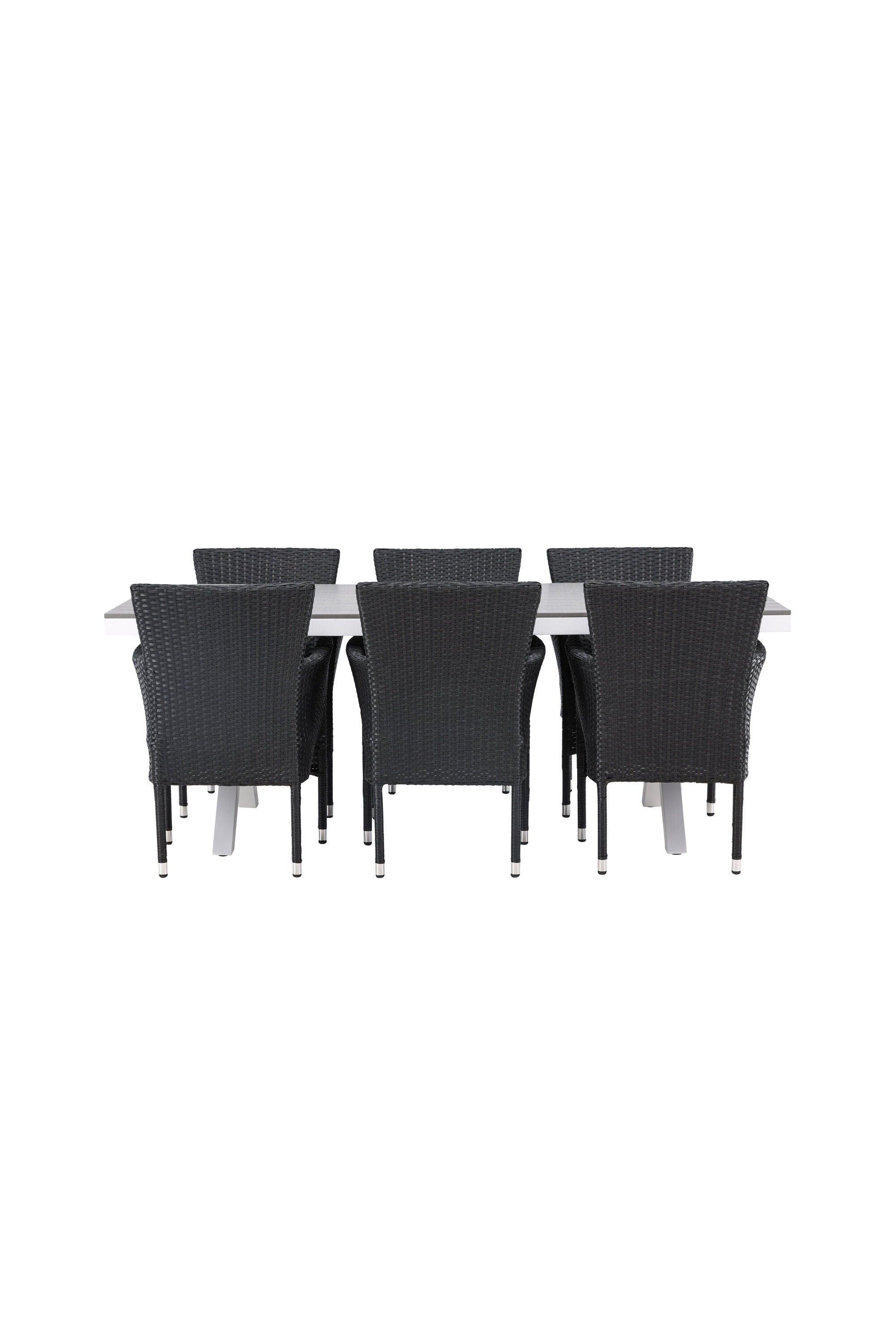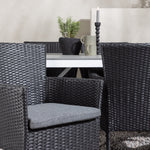Dokonalá kombinace vysokého komfortu a stylového designu - tato jídelní sestava je vhodná pro všechny příležitosti! Náš obdélníkový jídelní stůl Garcia má klasický design se stolovou deskou z vkusného aintwoodu a zkříženými nohami stolu v bílém hliníku. Zde ve fantastické kombinaci s ratanovými křesly ze série Malina. Židle má hliníkový rám a sedák z umělého ratanu v černé barvě. Pohodlně se letos v létě usaďte a vychutnejte si lahodná jídla venku! Rozměry stolu: 200 x 100 cm.