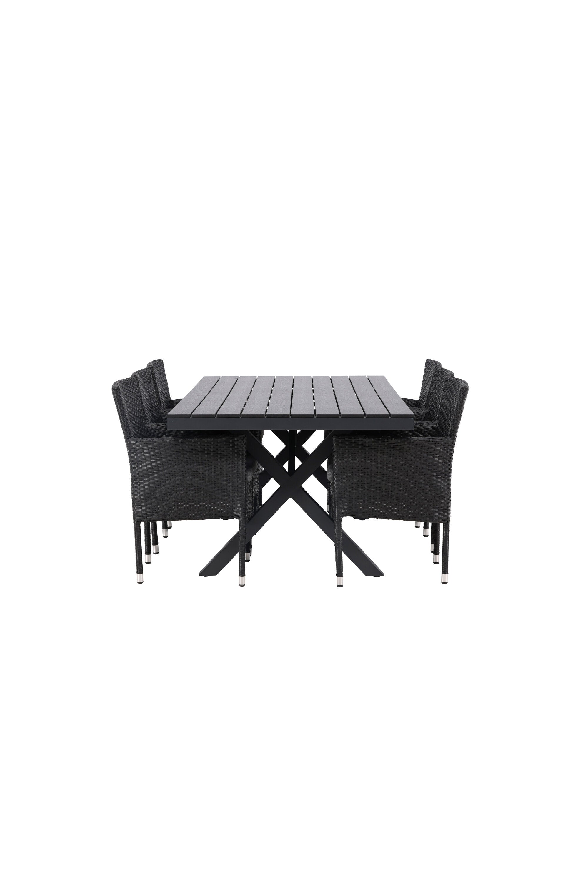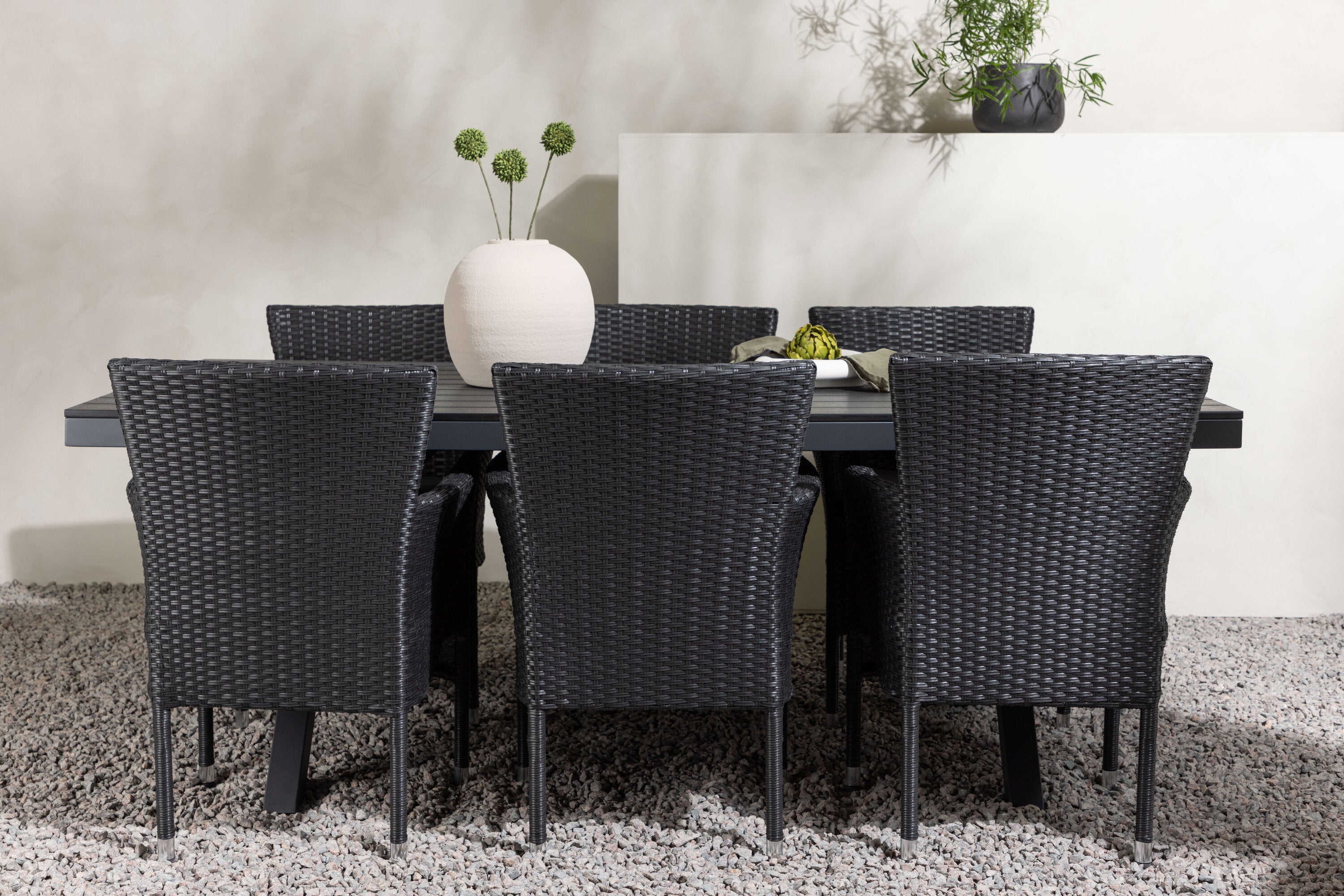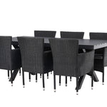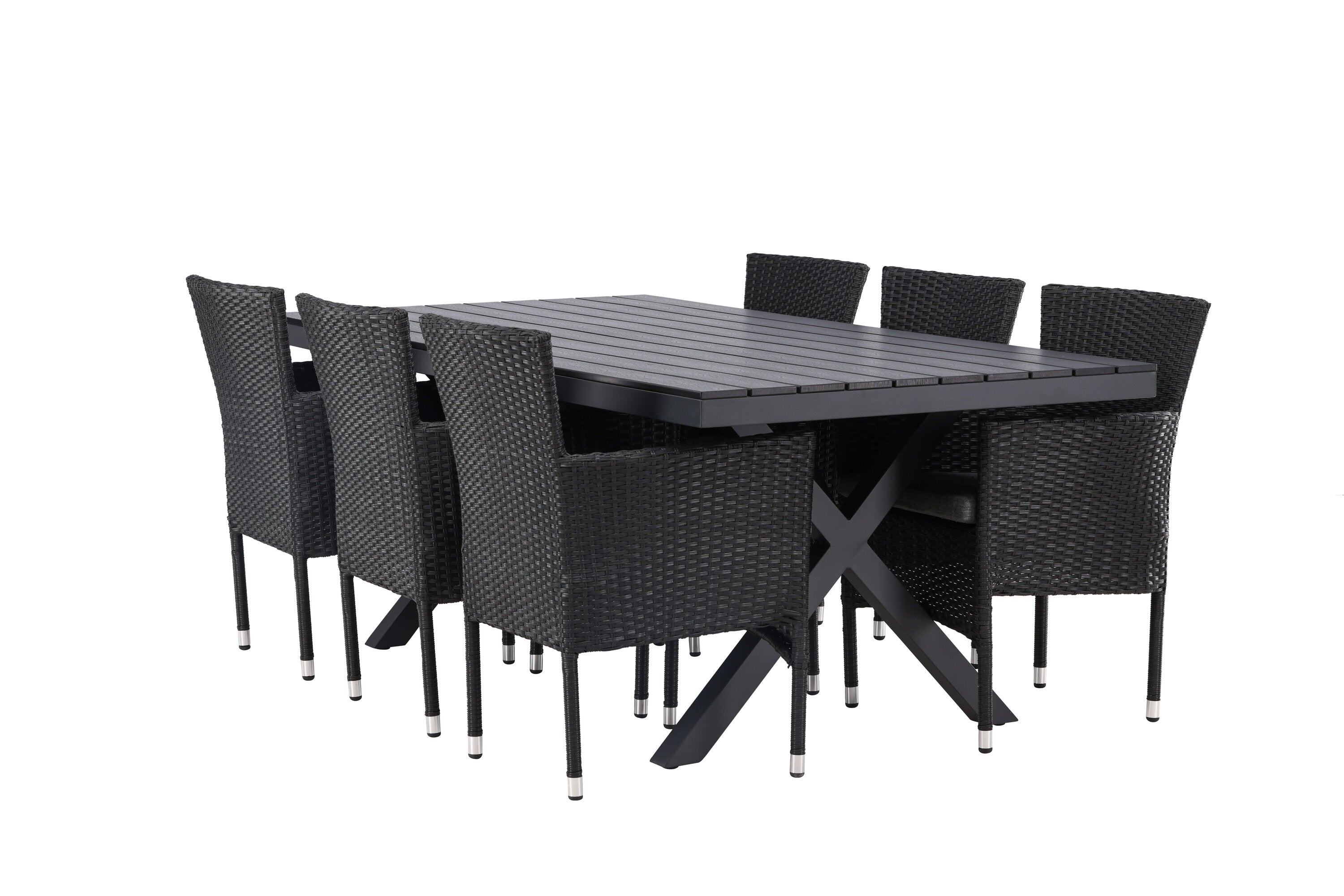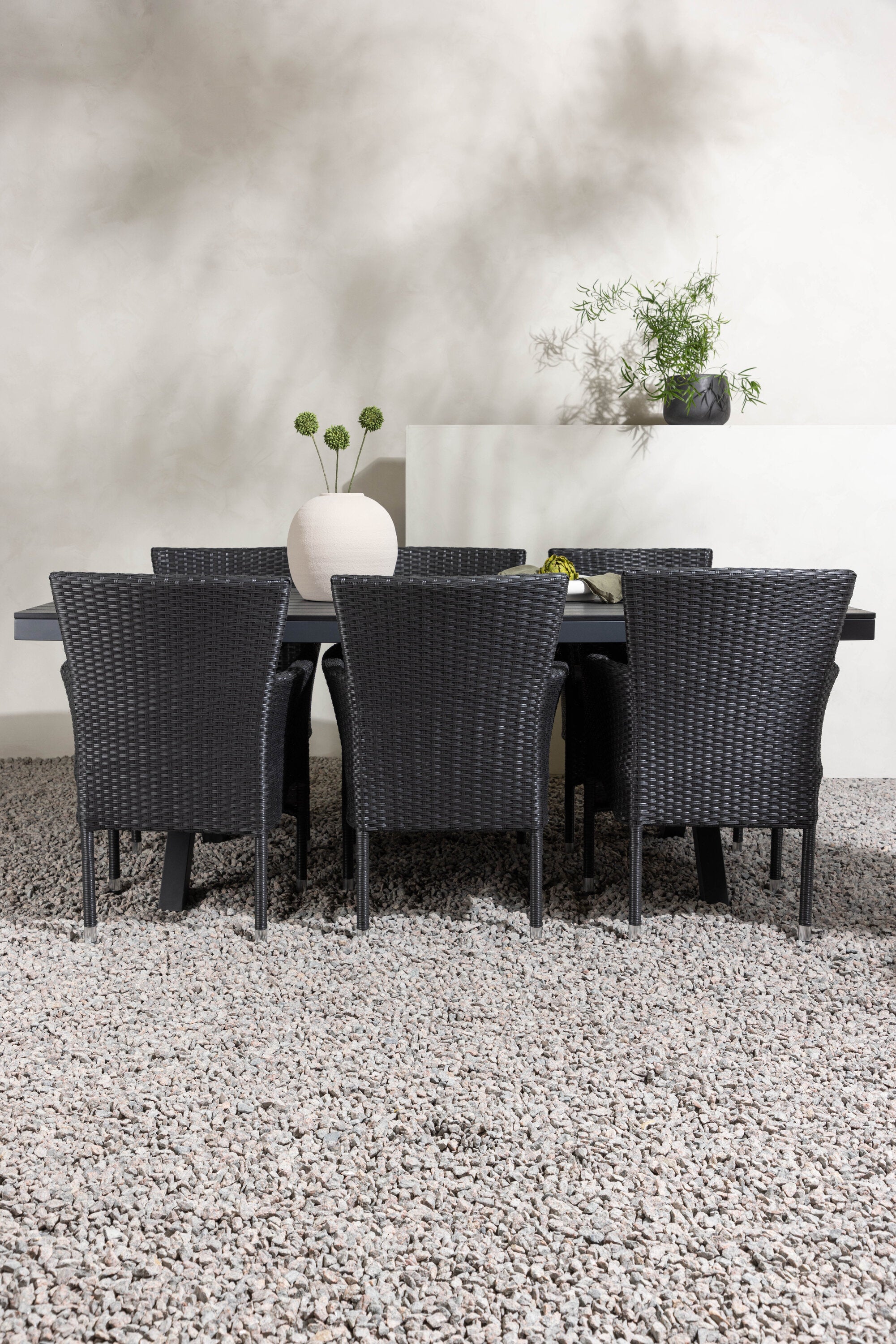 S touto jídelní skupinou snadno zařídíte zimní zahradu nebo terasu moderně a pohodlně! Náš obdélníkový jídelní stůl Garcia má klasický design s deskou stolu v černém aintwood a zkříženými nohami stolu v černém hliníku. Jídelní židle patří do série Malina a zaručeně obstojí ve zkoušce času. Židle má hliníkový rám a je čalouněná pleteným, černým umělým ratanem. Pozvěte své přátele na mnoho skvělých jídel venku v budoucnu! Rozměry stolu: 200 x 100 cm.