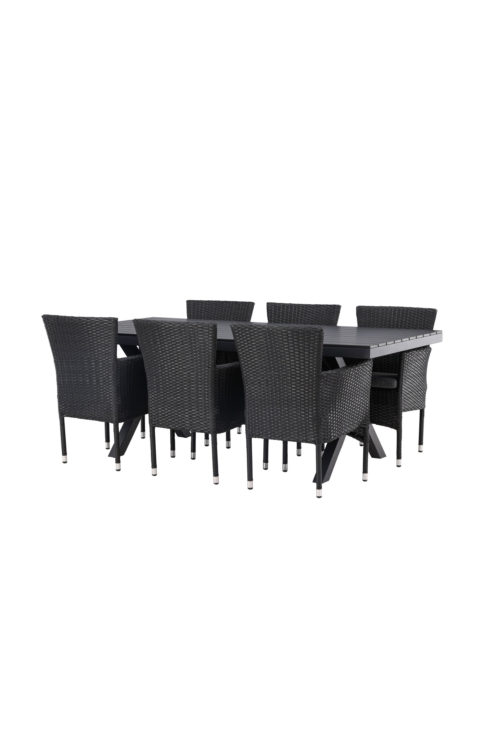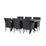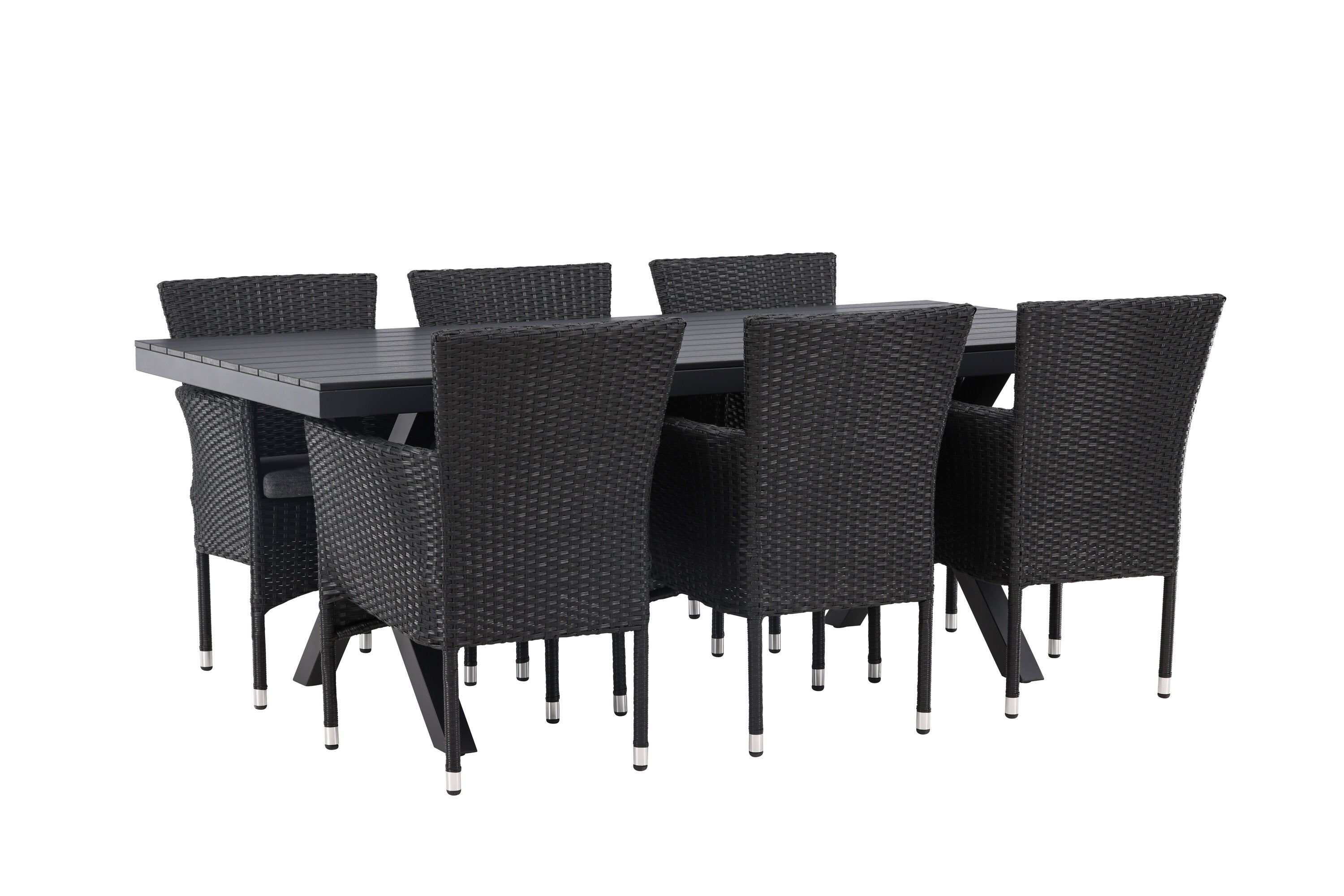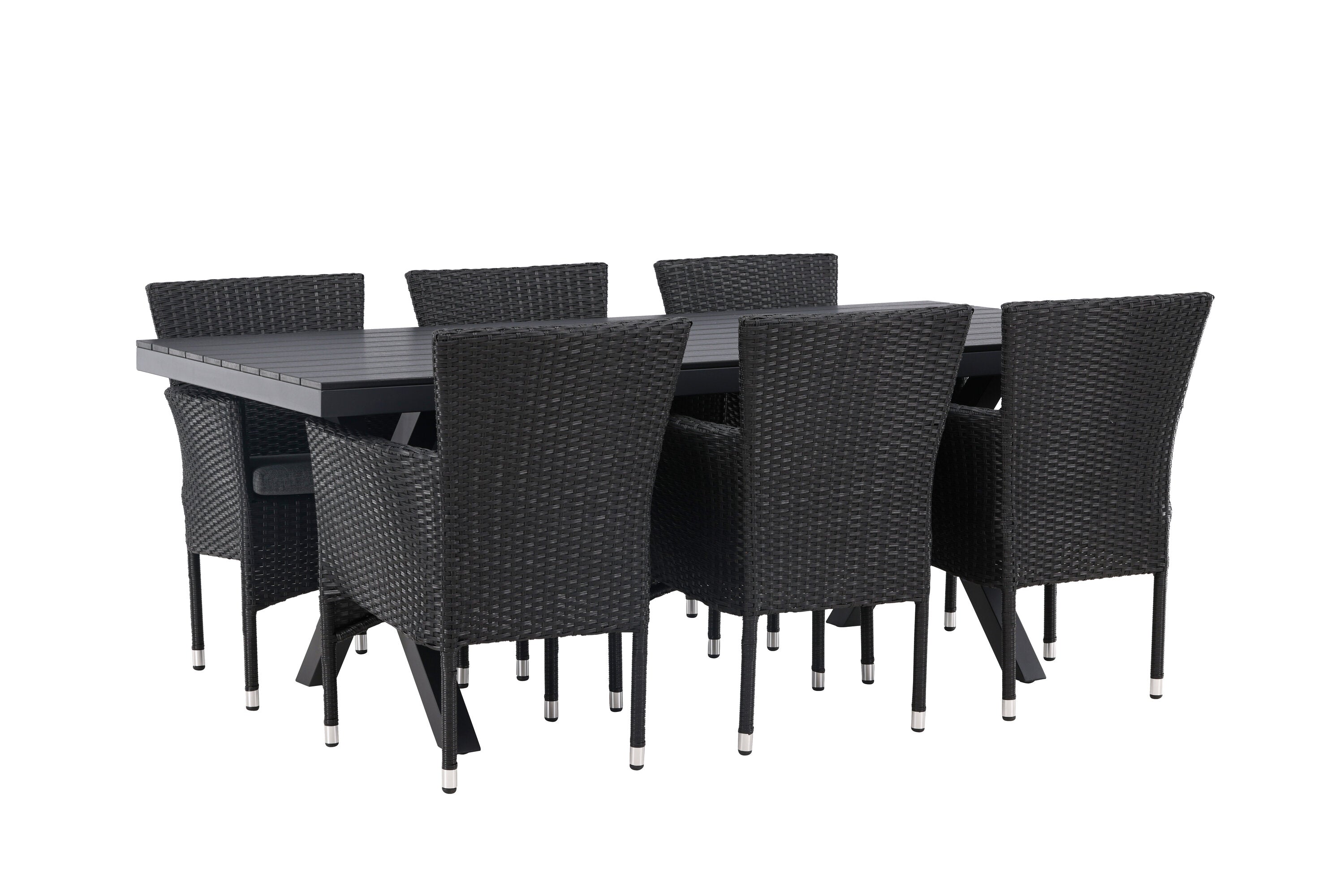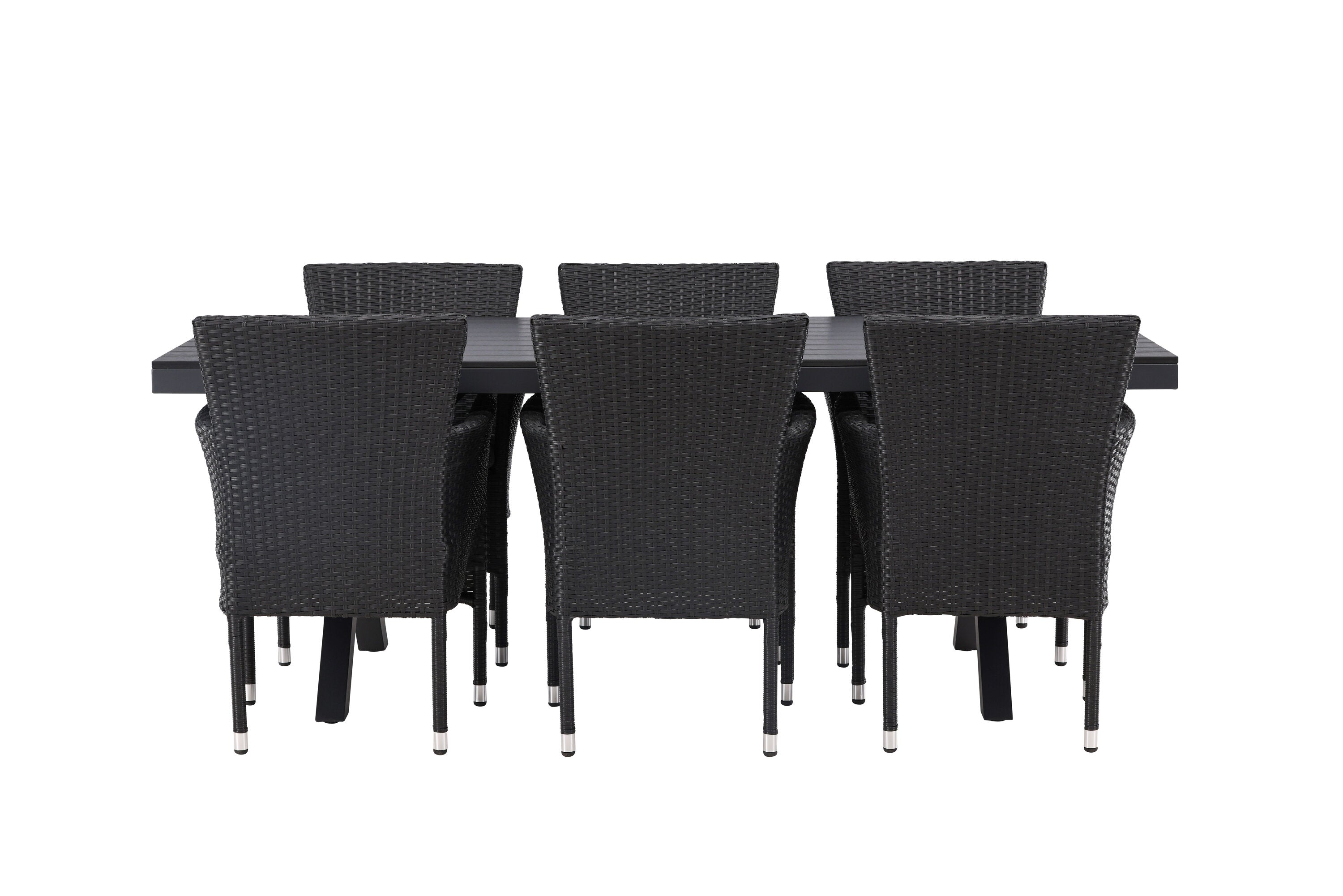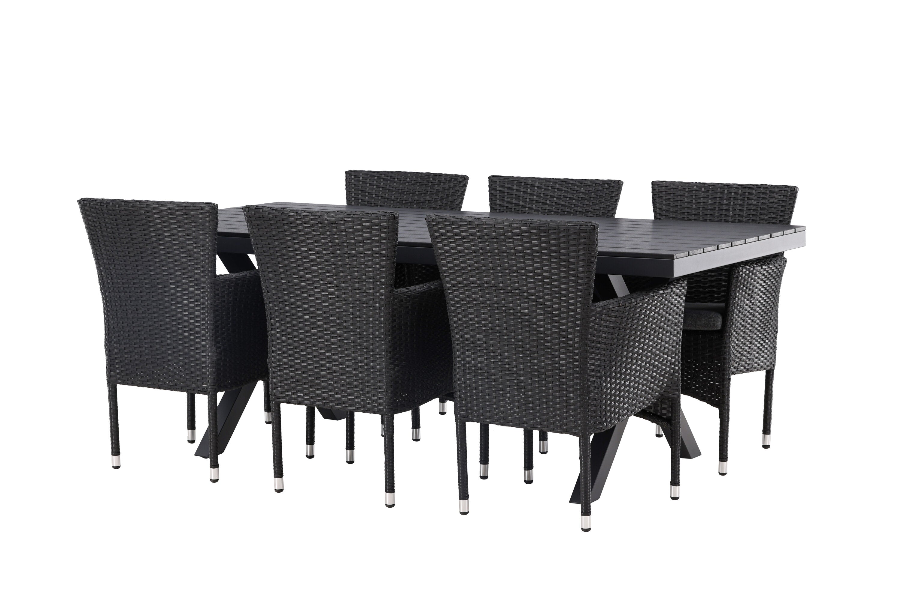 S touto jídelní skupinou snadno zařídíte zimní zahradu nebo terasu moderně a pohodlně! Náš obdélníkový jídelní stůl Garcia má klasický design s deskou stolu v černém aintwood a zkříženými nohami stolu v černém hliníku. Jídelní židle patří do série Malina a zaručeně obstojí ve zkoušce času. Židle má hliníkový rám a je čalouněná pleteným, černým umělým ratanem. Pozvěte své přátele na mnoho skvělých jídel venku v budoucnu! Rozměry stolu: 200 x 100 cm.