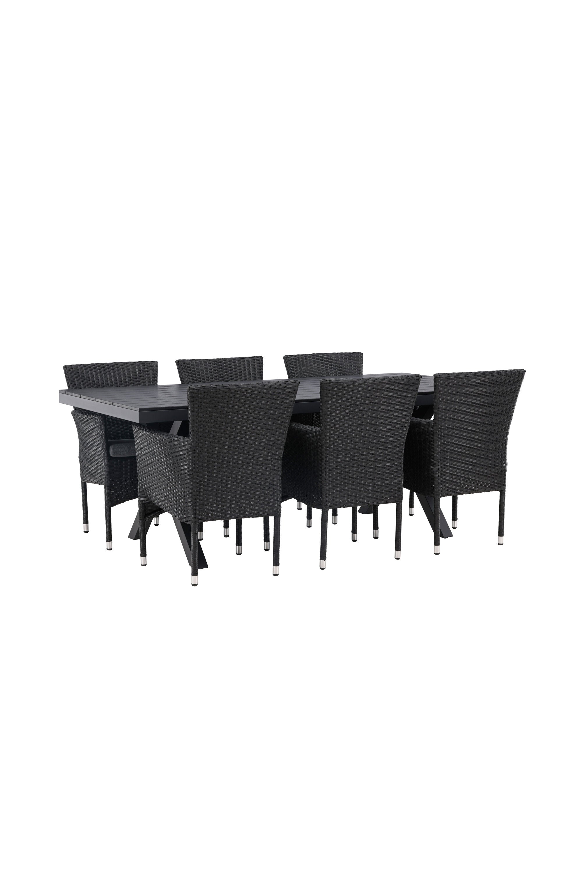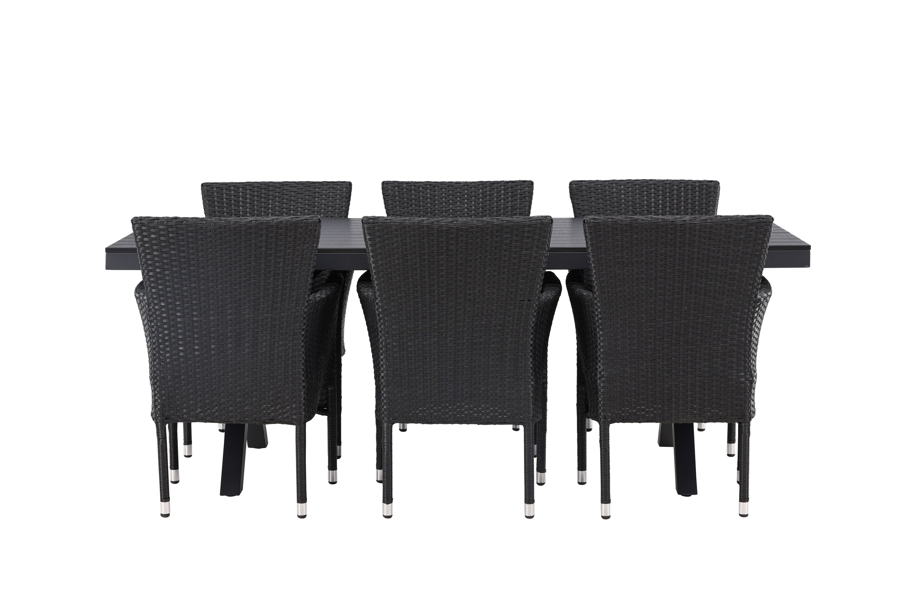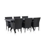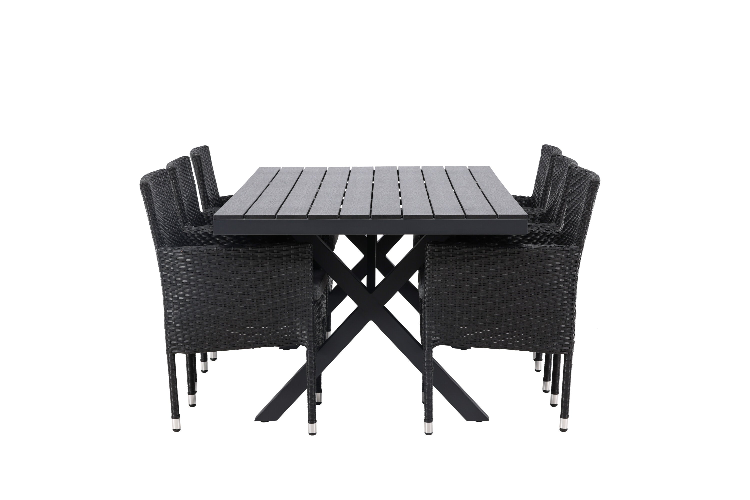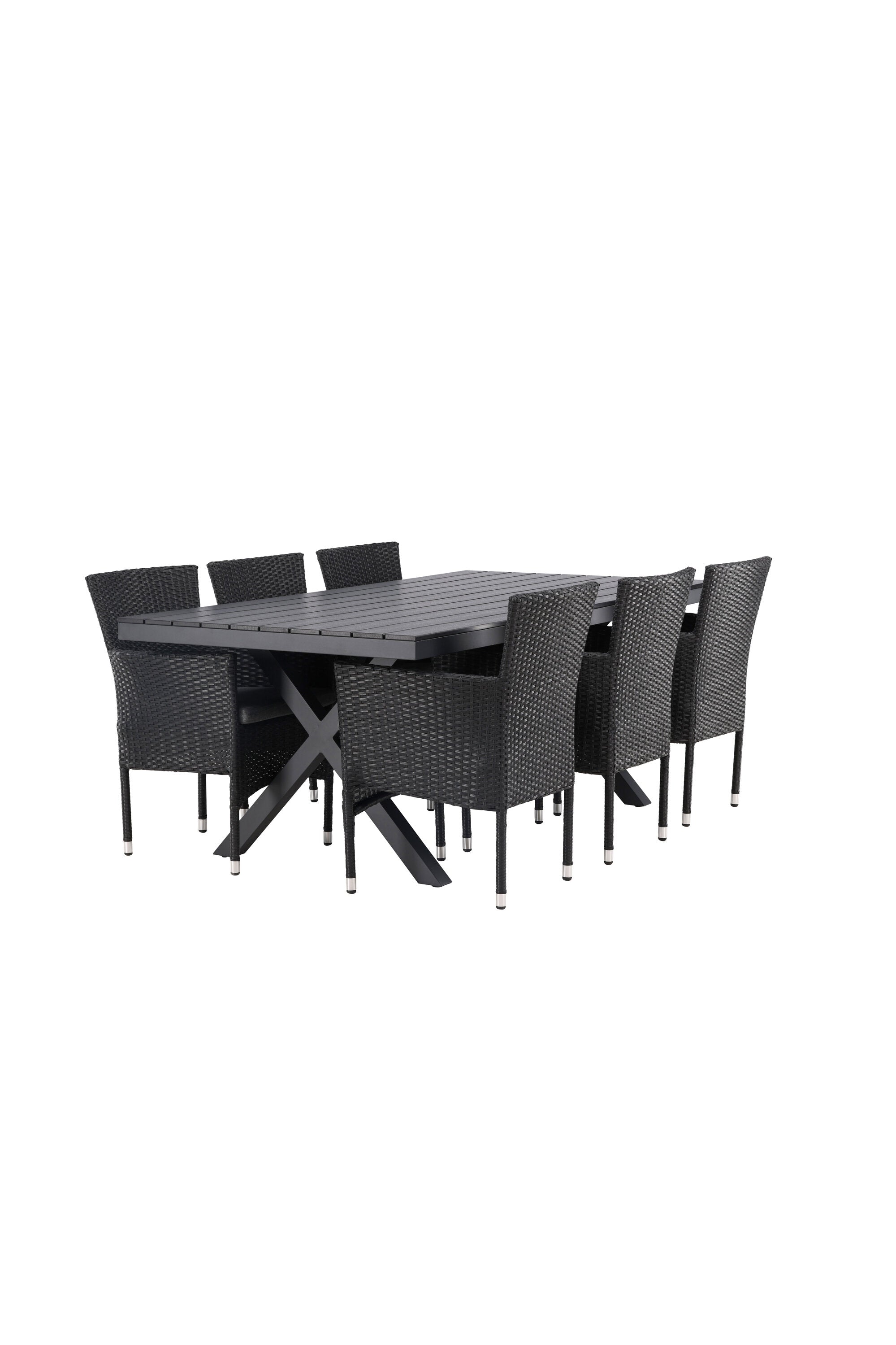 S touto jídelní skupinou snadno zařídíte zimní zahradu nebo terasu moderně a pohodlně! Náš obdélníkový jídelní stůl Garcia má klasický design s deskou stolu v černém aintwood a zkříženými nohami stolu v černém hliníku. Jídelní židle patří do série Malina a zaručeně obstojí ve zkoušce času. Židle má hliníkový rám a je čalouněná pleteným, černým umělým ratanem. Pozvěte své přátele na mnoho skvělých jídel venku v budoucnu! Rozměry stolu: 200 x 100 cm.