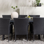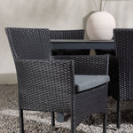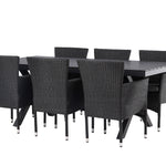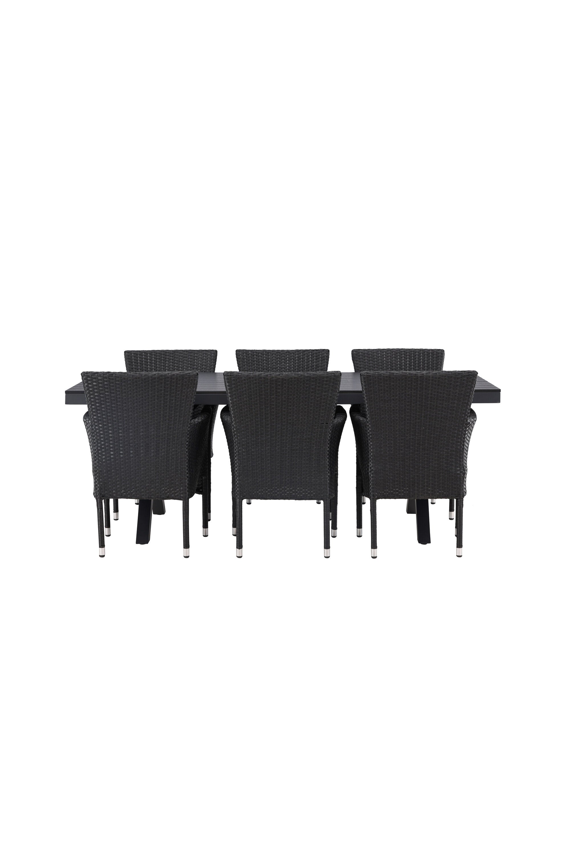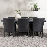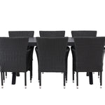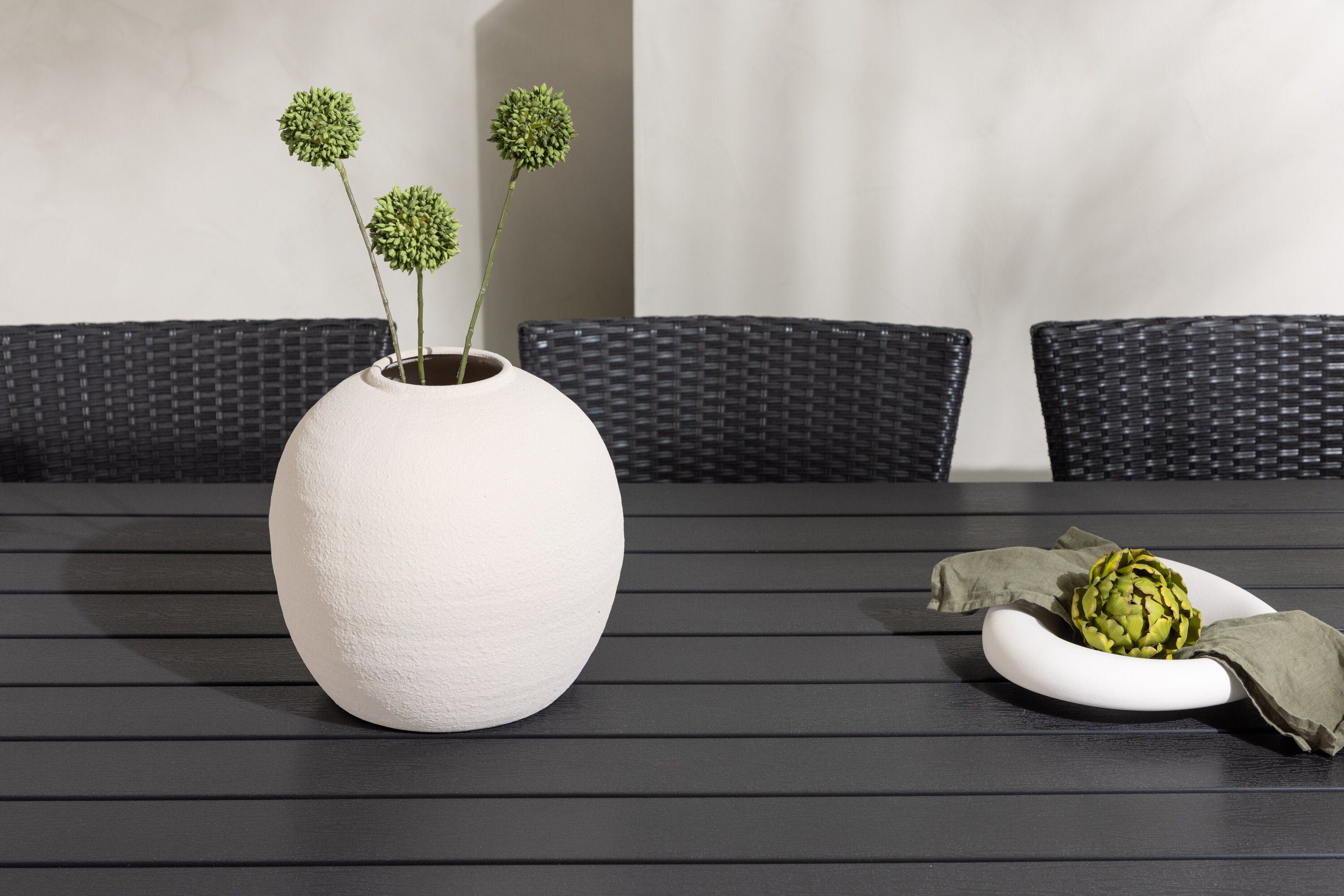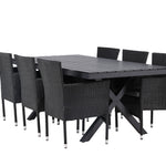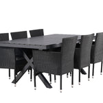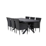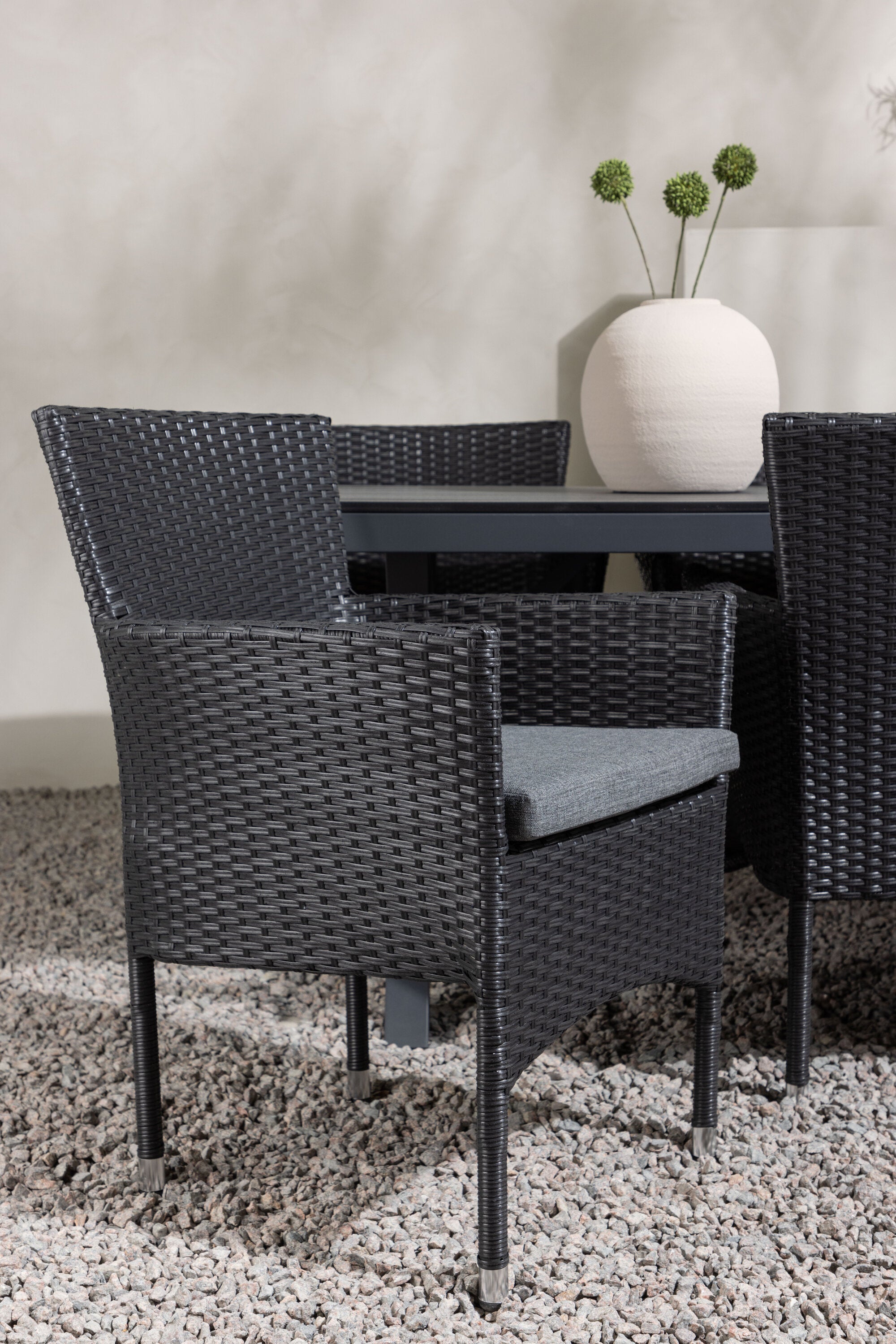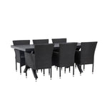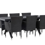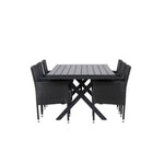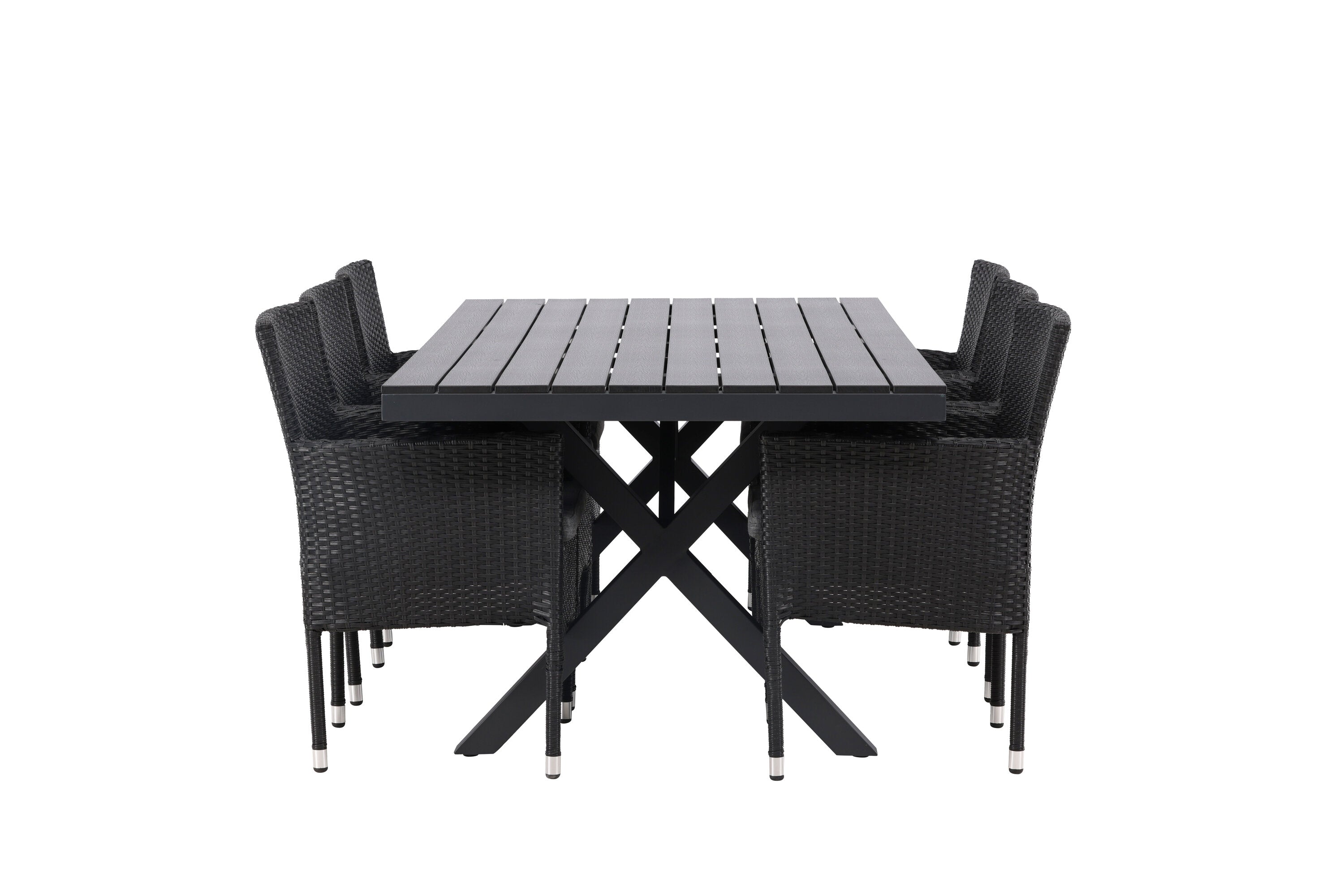 S touto jídelní skupinou snadno zařídíte zimní zahradu nebo terasu moderně a pohodlně! Náš obdélníkový jídelní stůl Garcia má klasický design s deskou stolu v černém aintwood a zkříženými nohami stolu v černém hliníku. Jídelní židle patří do série Malina a zaručeně obstojí ve zkoušce času. Židle má hliníkový rám a je čalouněná pleteným, černým umělým ratanem. Pozvěte své přátele na mnoho skvělých jídel venku v budoucnu! Rozměry stolu: 200 x 100 cm.