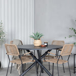 Přirozená a trendová skupina potravin na terasu! Naše oblíbené jídelní židle Lindos v lahodném provazu v barvě latte a stylové úzké nohy a také integrované područky v černé oceli jsou skutečnou designovou ikonou. Zde společně s vkusným jídelním stolem Alma s ozdobnými křížovými nohami v černém hliníku. Kulatá skupina jídla je ideální pro ty, kteří chtějí vytvořit příjemnou a rodinnou atmosféru ve vašem venkovním pokoji nebo na balkoně - pozvěte proto rodinu a přátele a vychutnejte si společně skvělé jídlo!