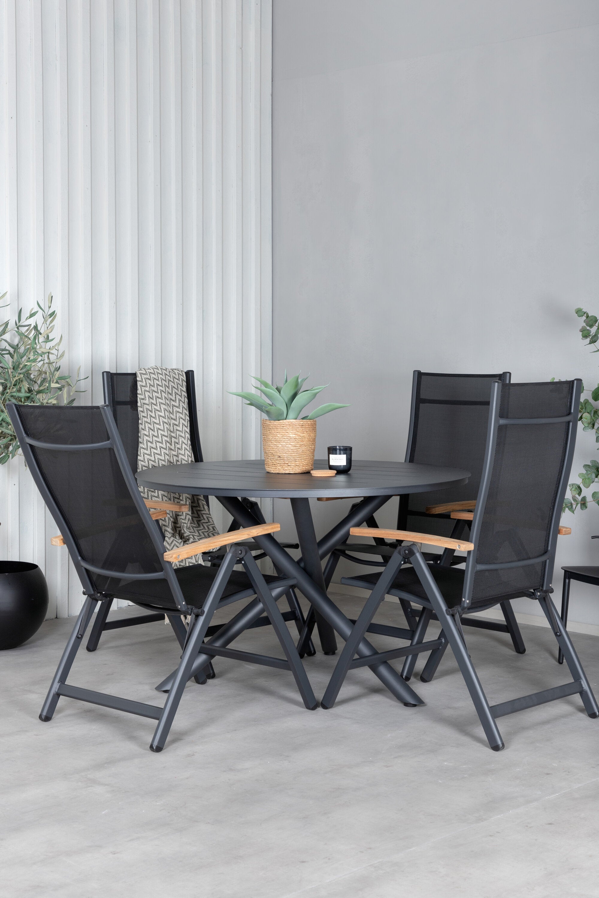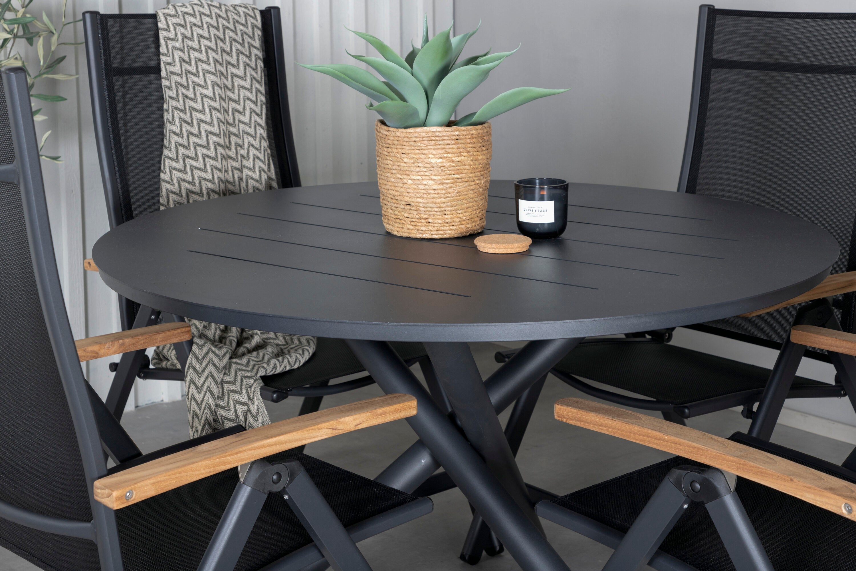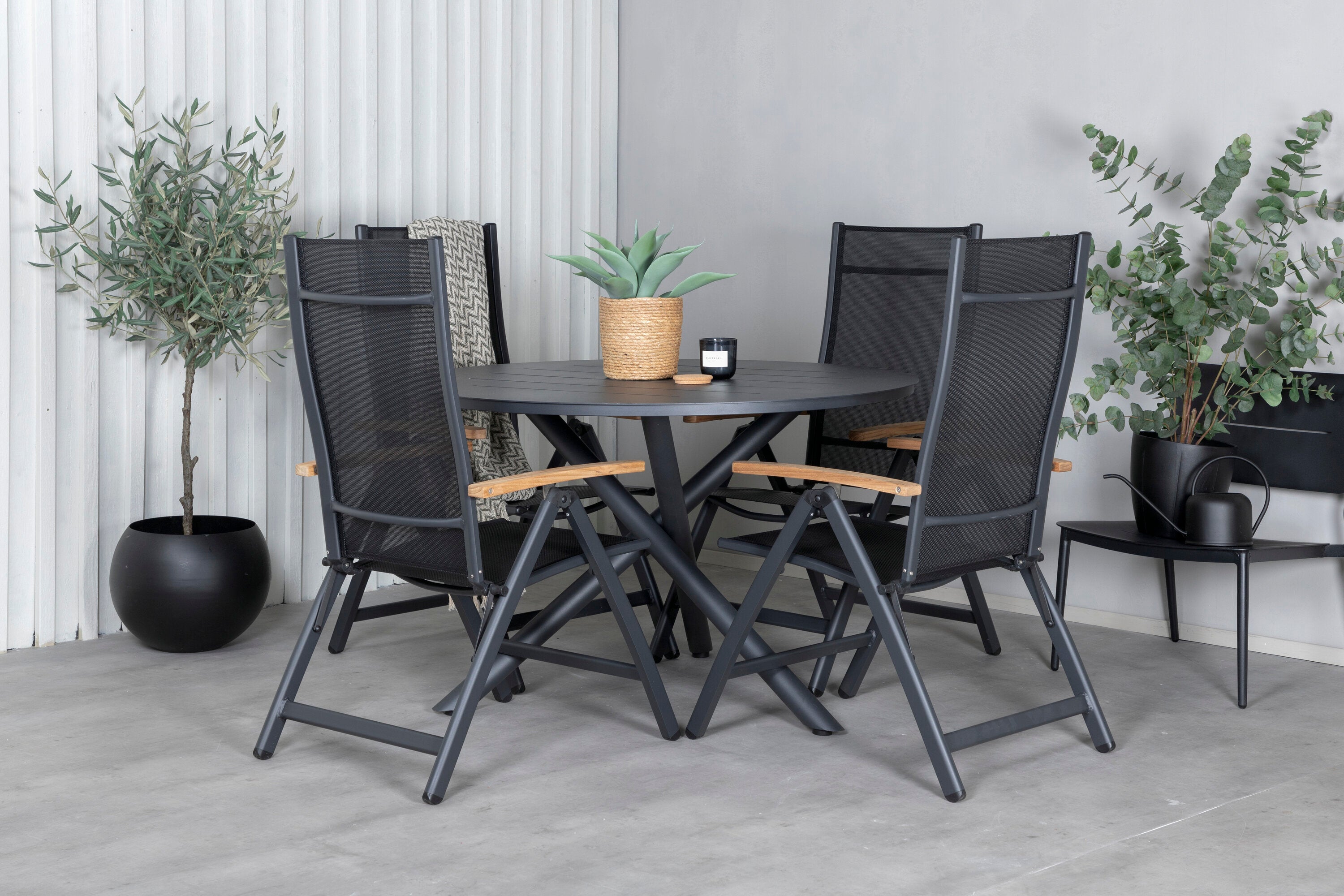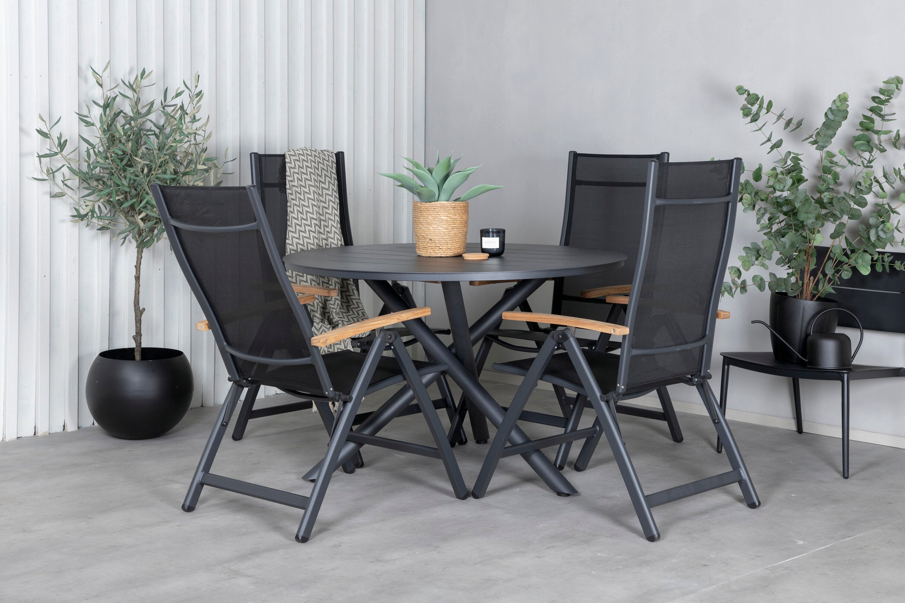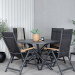 Stylové, moderní a praktické – skupina potravin, která ohromí! Náš kulatý jídelní stůl Alma v černém hliníku zajistí, že nikdo neskončí na hraně. Zde společně s našimi nastavitelnými černými jídelními židlemi ze série Panama. Židle jsou vyrobeny z textilu s lahodnými teakovými detaily, které vytvářejí luxusní poutač. Pozvěte rodinu a přátele a užijte si společně skvělé jídlo!