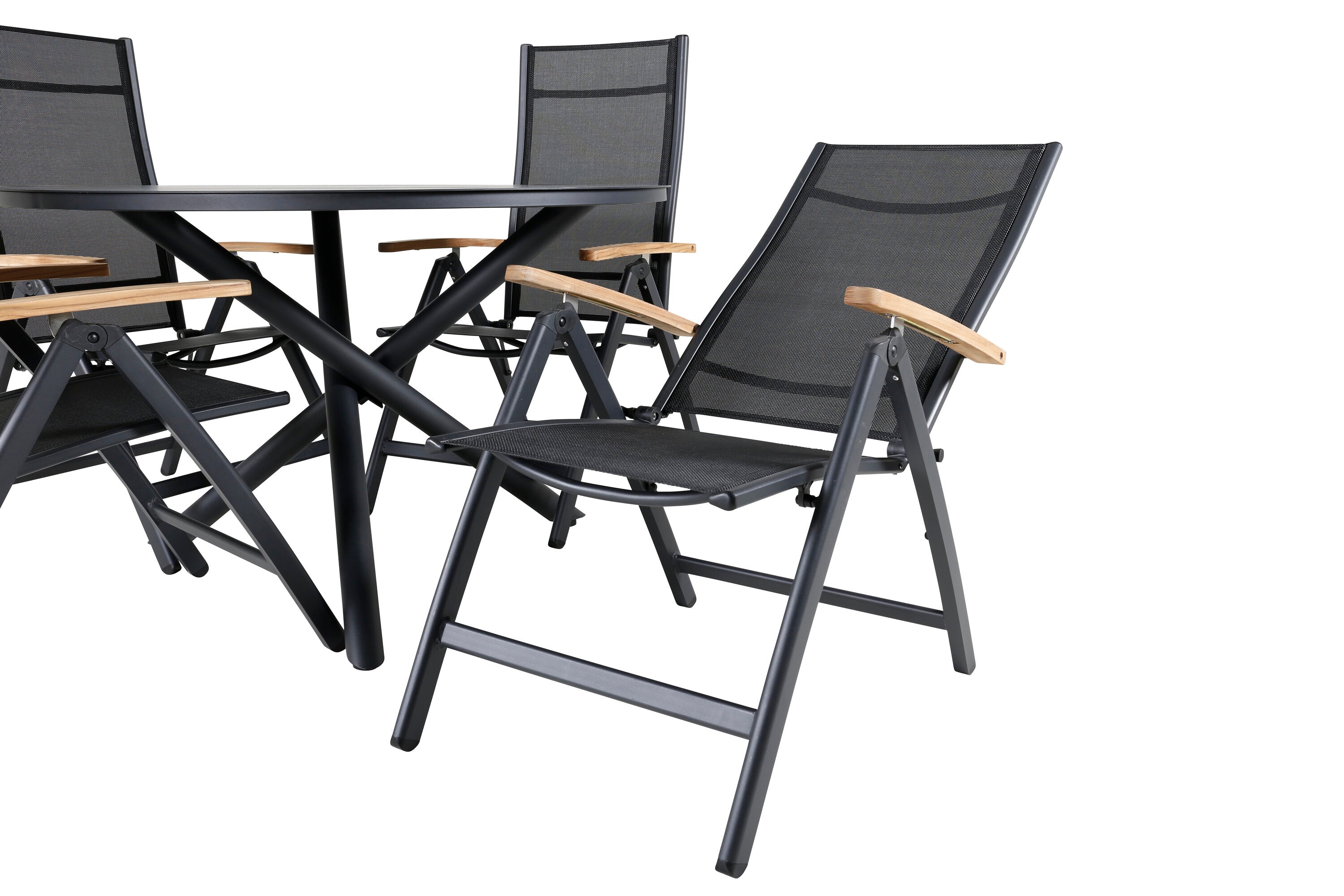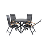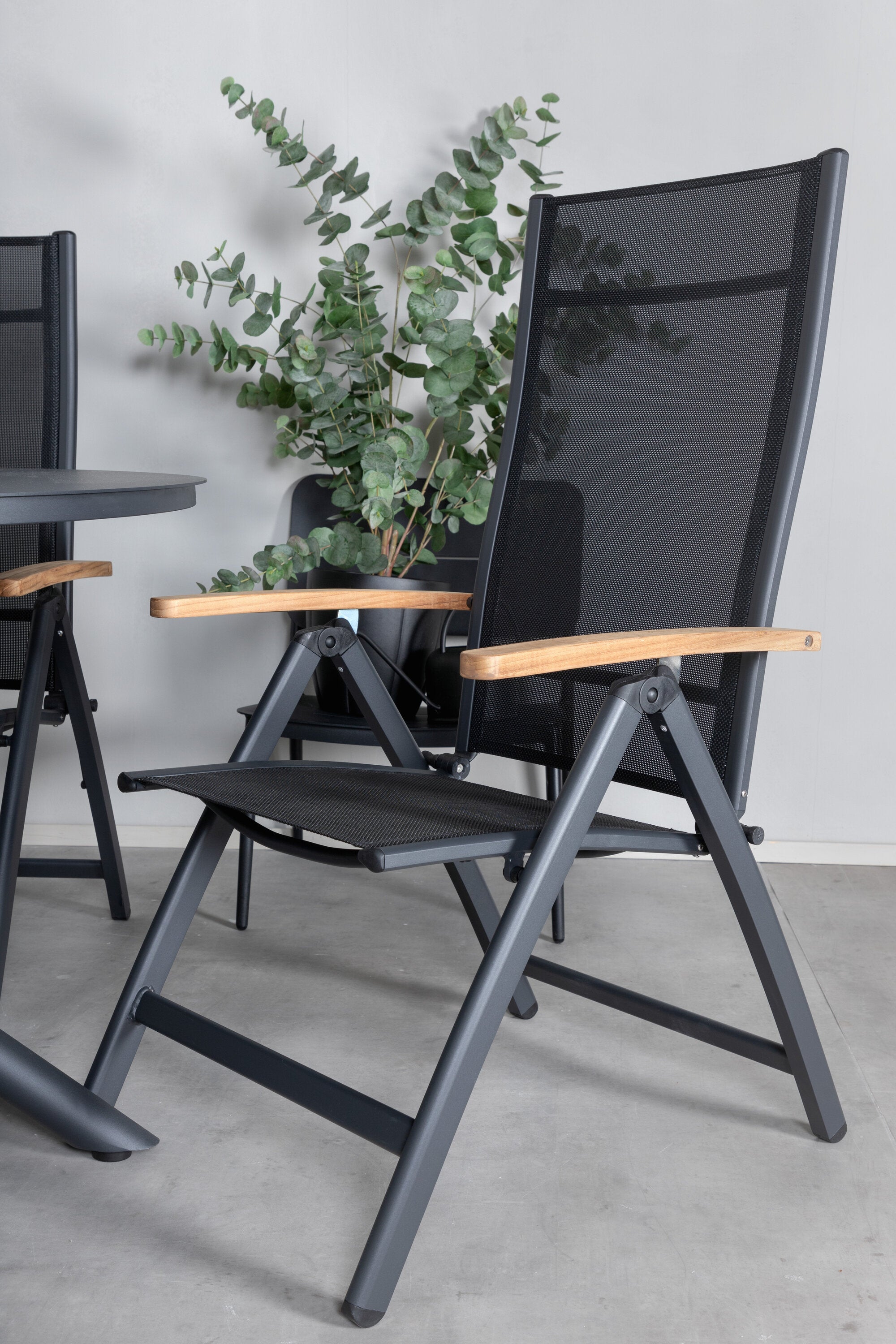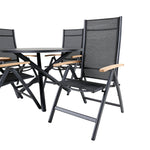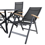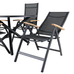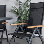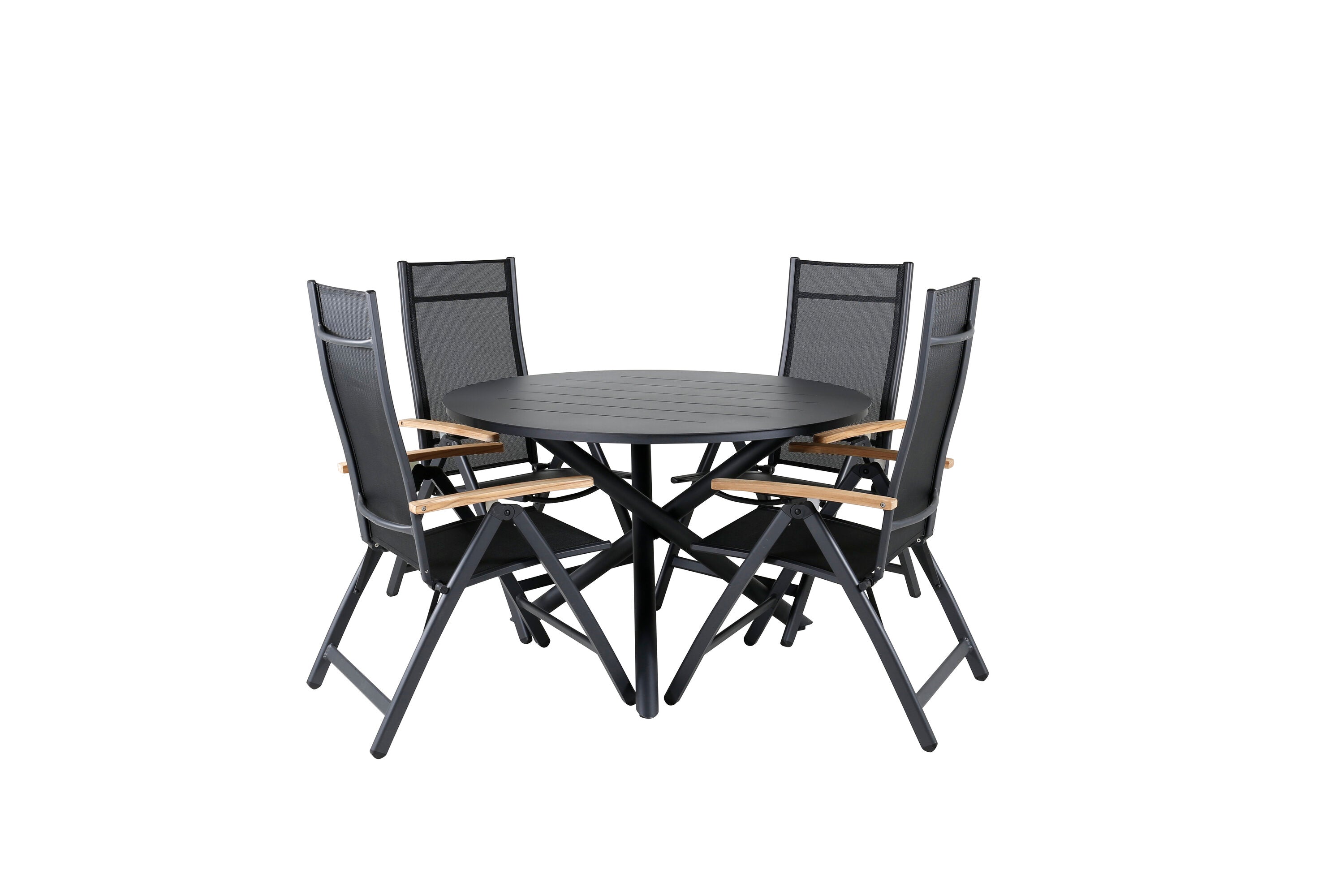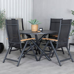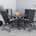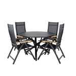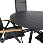 Stylové, moderní a praktické – skupina potravin, která ohromí! Náš kulatý jídelní stůl Alma v černém hliníku zajistí, že nikdo neskončí na hraně. Zde společně s našimi nastavitelnými černými jídelními židlemi ze série Panama. Židle jsou vyrobeny z textilu s lahodnými teakovými detaily, které vytvářejí luxusní poutač. Pozvěte rodinu a přátele a užijte si společně skvělé jídlo!