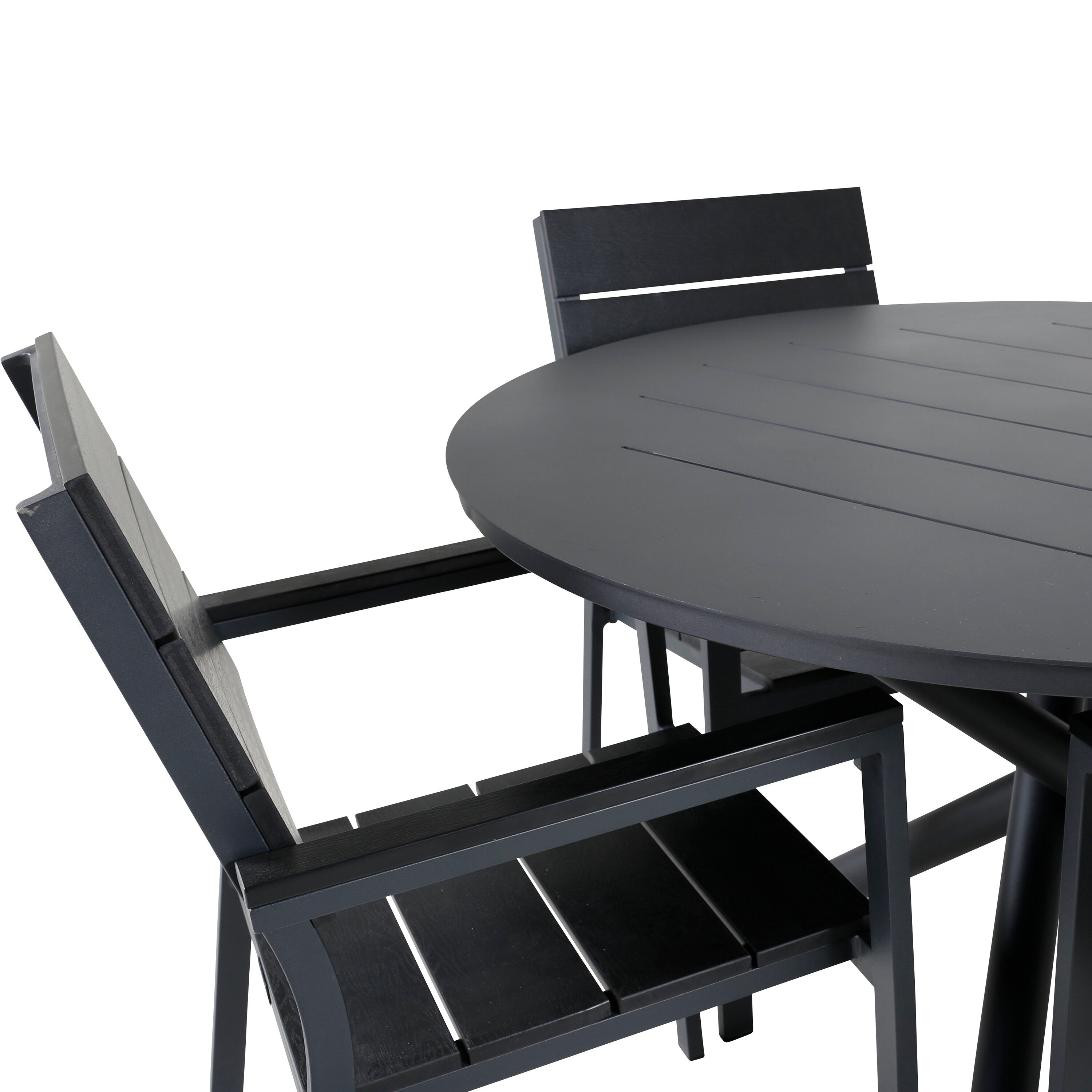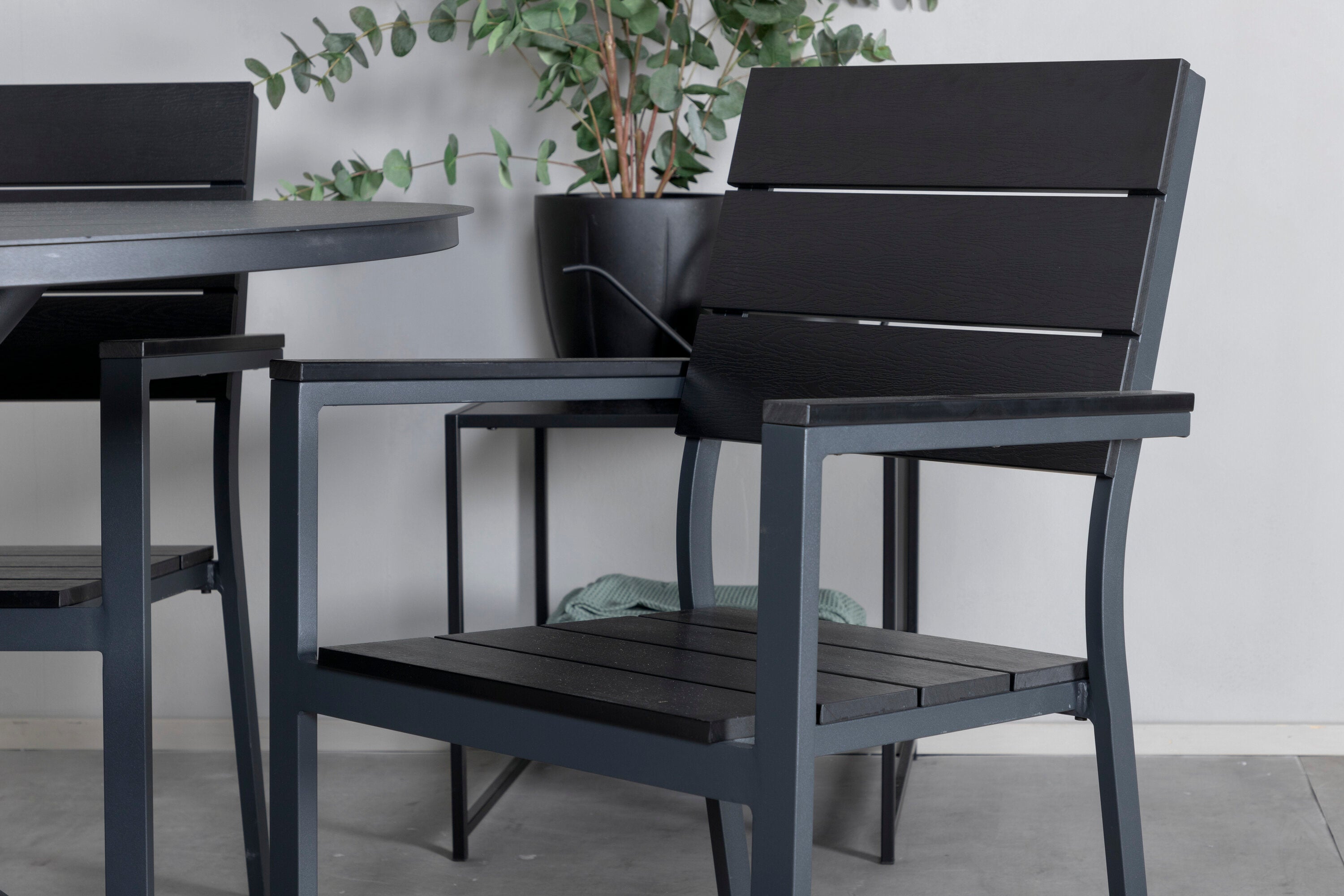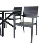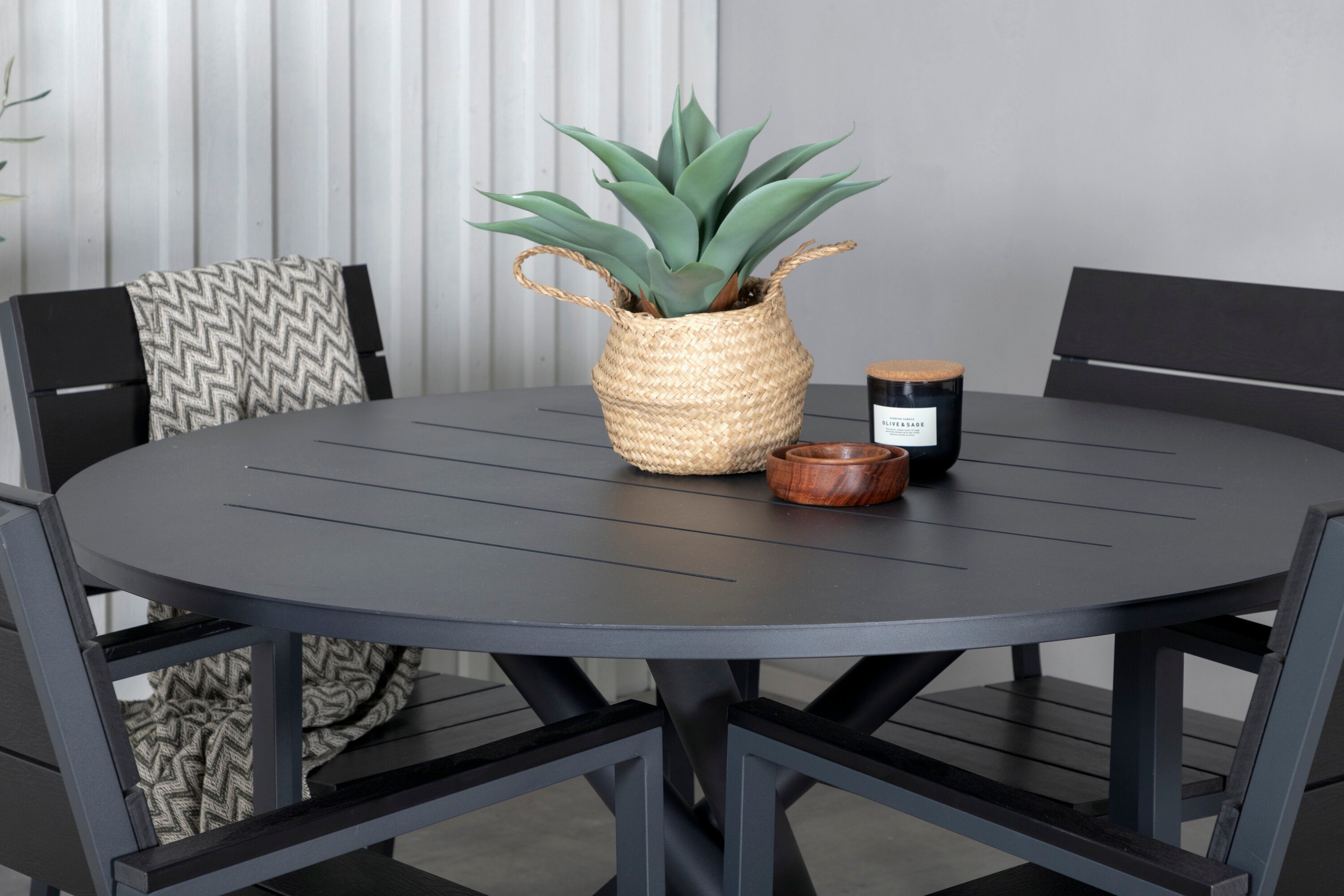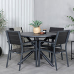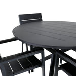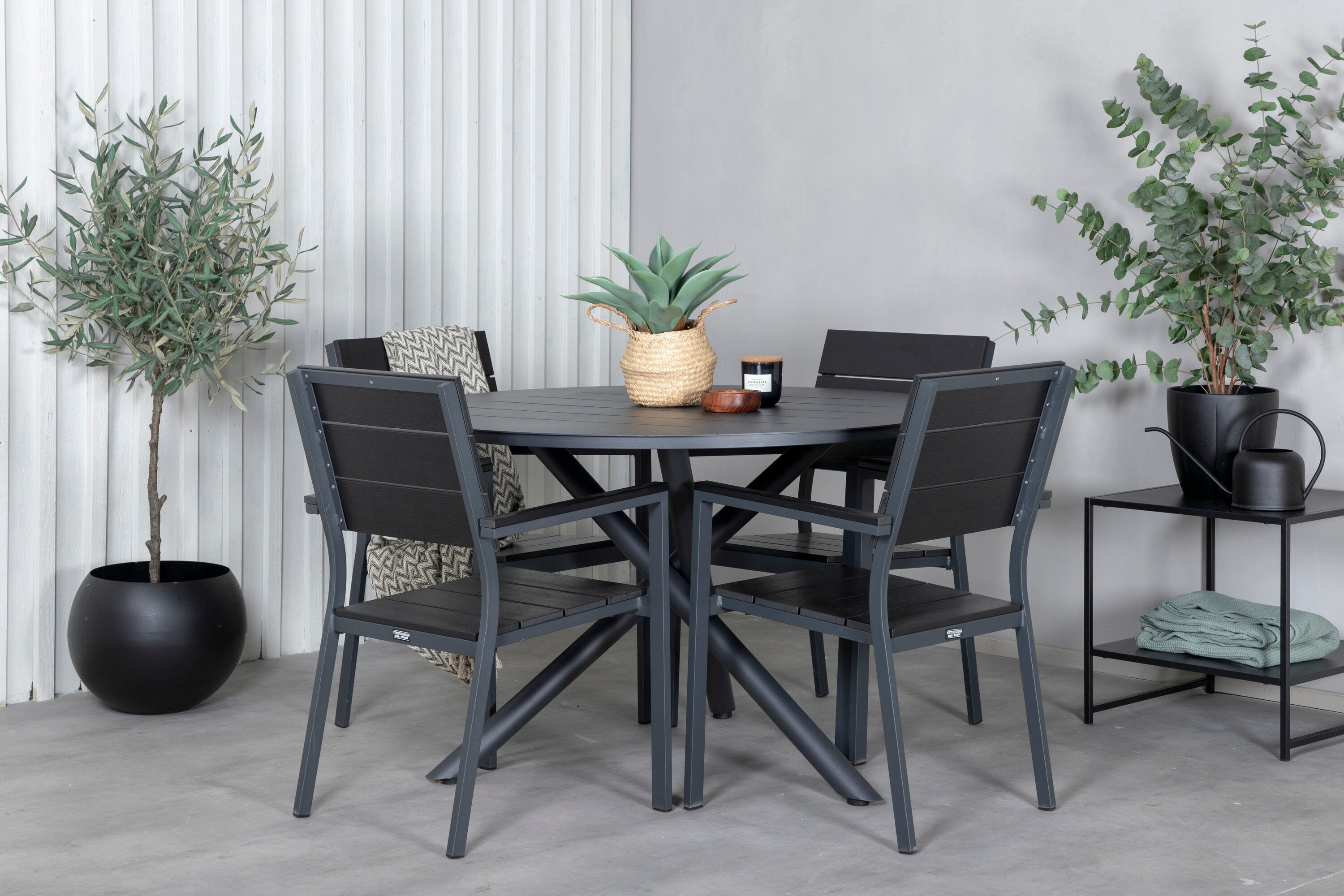 Lahodná sladká skupina potravin pro všechna letní jídla - hodí se stejně dobře do venkovního prostoru jako na balkon! Levels je praktické křeslo v černém hliníku s černým sedákem a opěradlem v barvě Smaster Aintwood. Židle je stohovatelná pro snadné skladování. Zde společně s naším kulatým jídelním stolem Alma v černém hliníku. Vytvořte dokonalou společenskou atmosféru na terase!