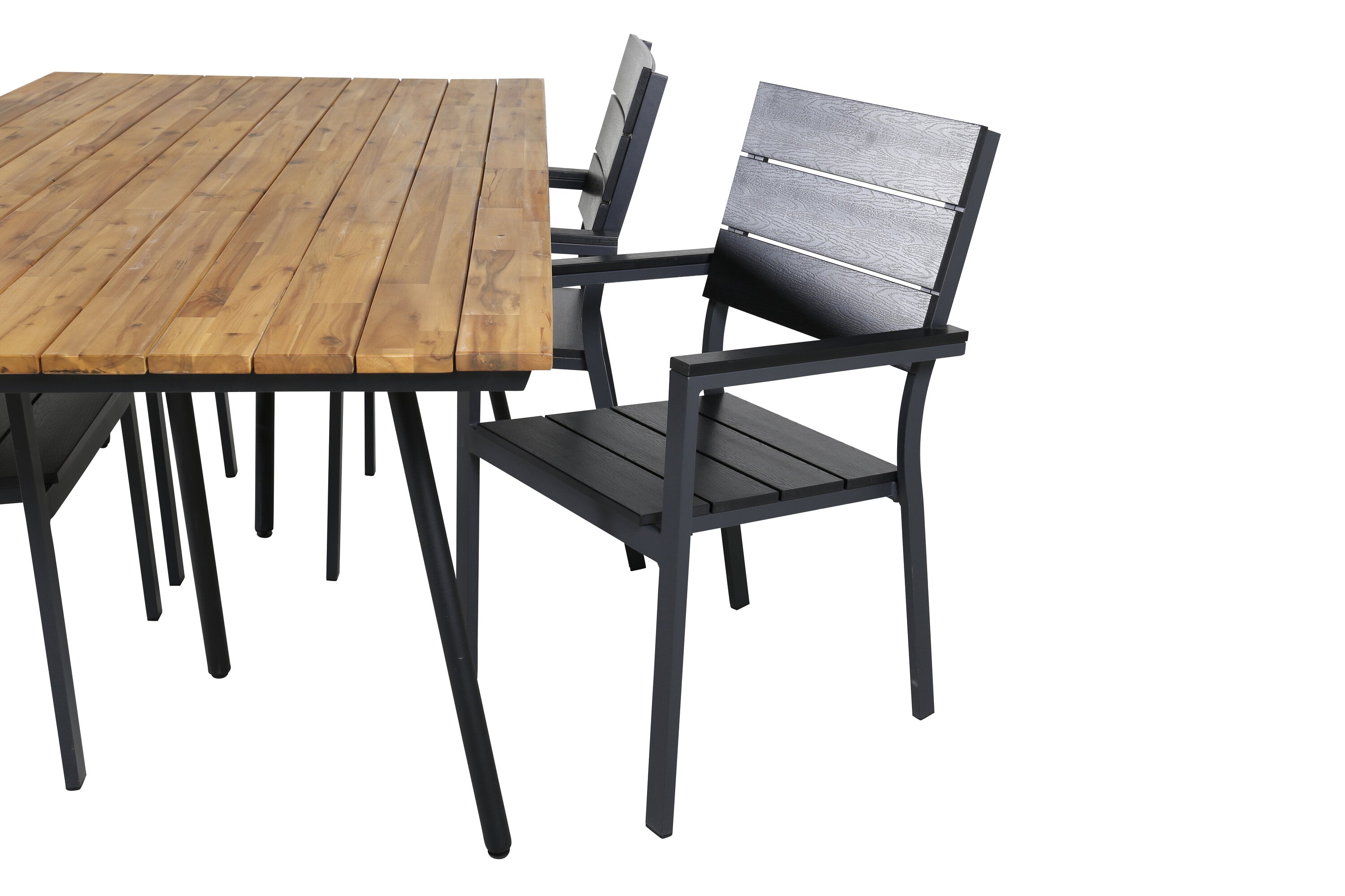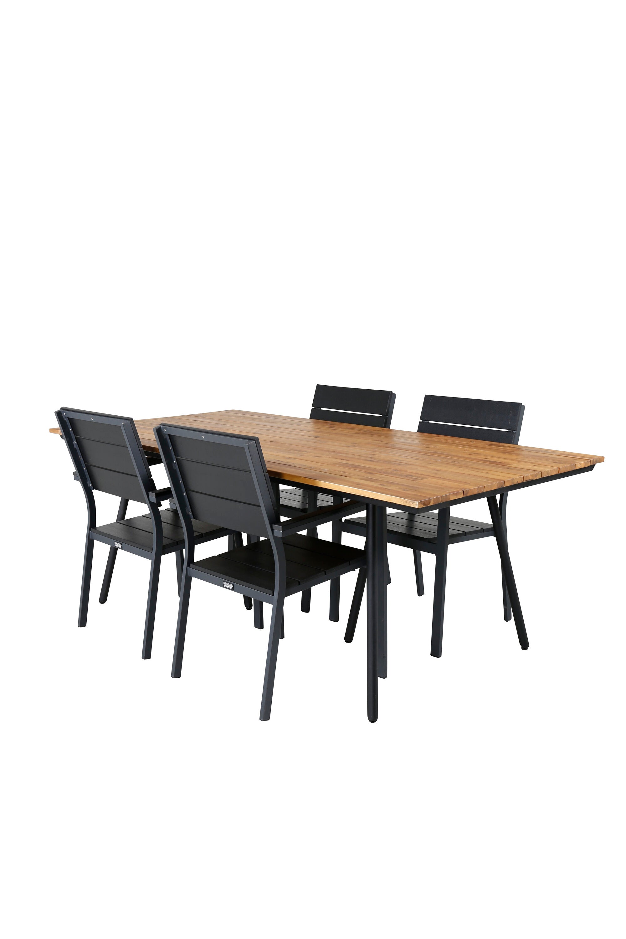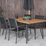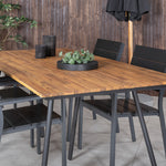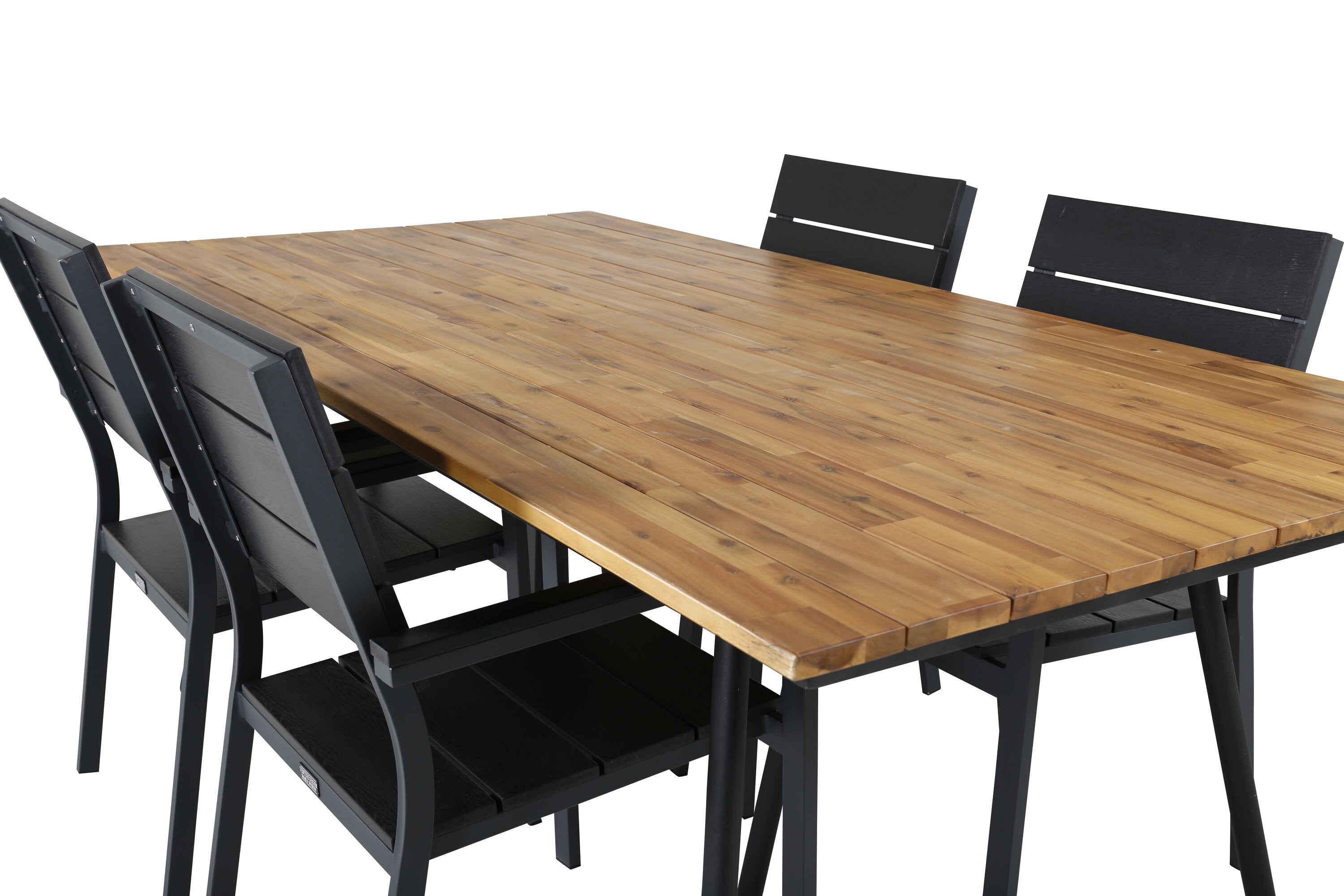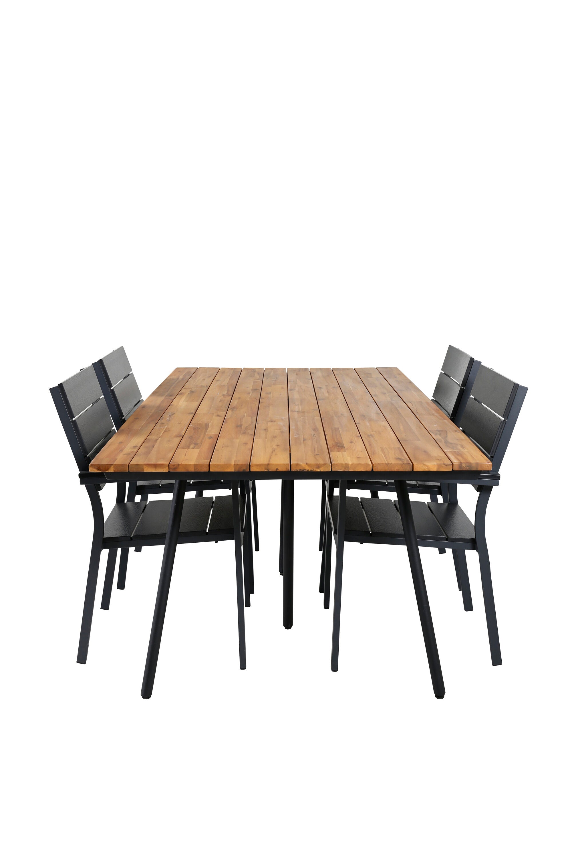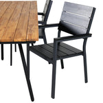 Jídelní stůl Chan - černá ocel / akácie (vzhled týkového dřeva) - 200 cm + židle (stohovatelné) - černá hliníková / černá Aintwood_4
