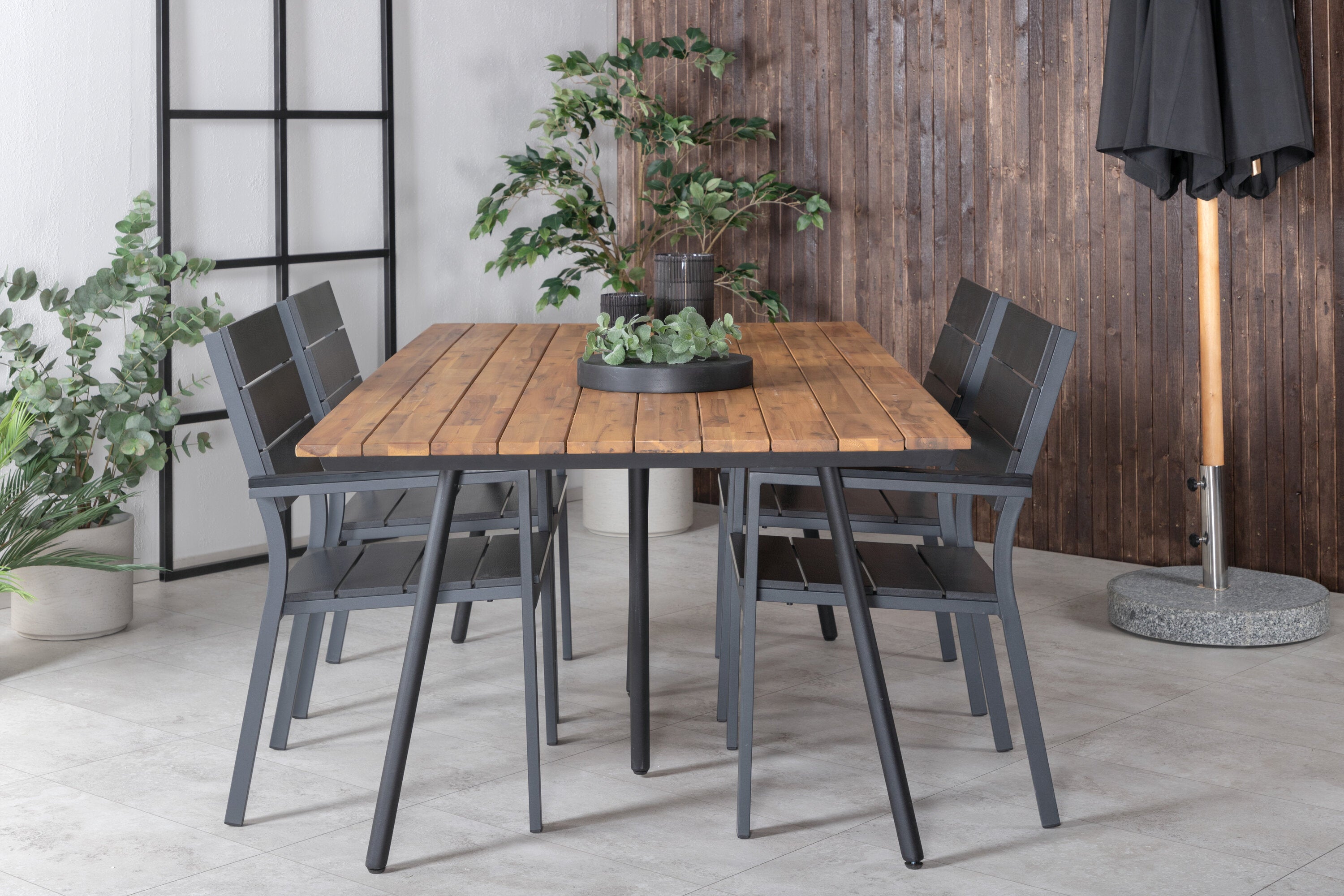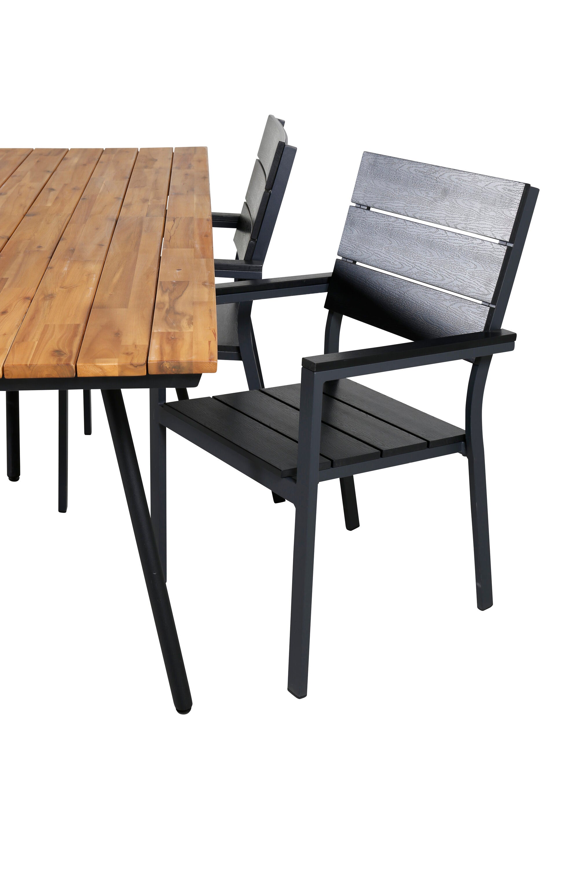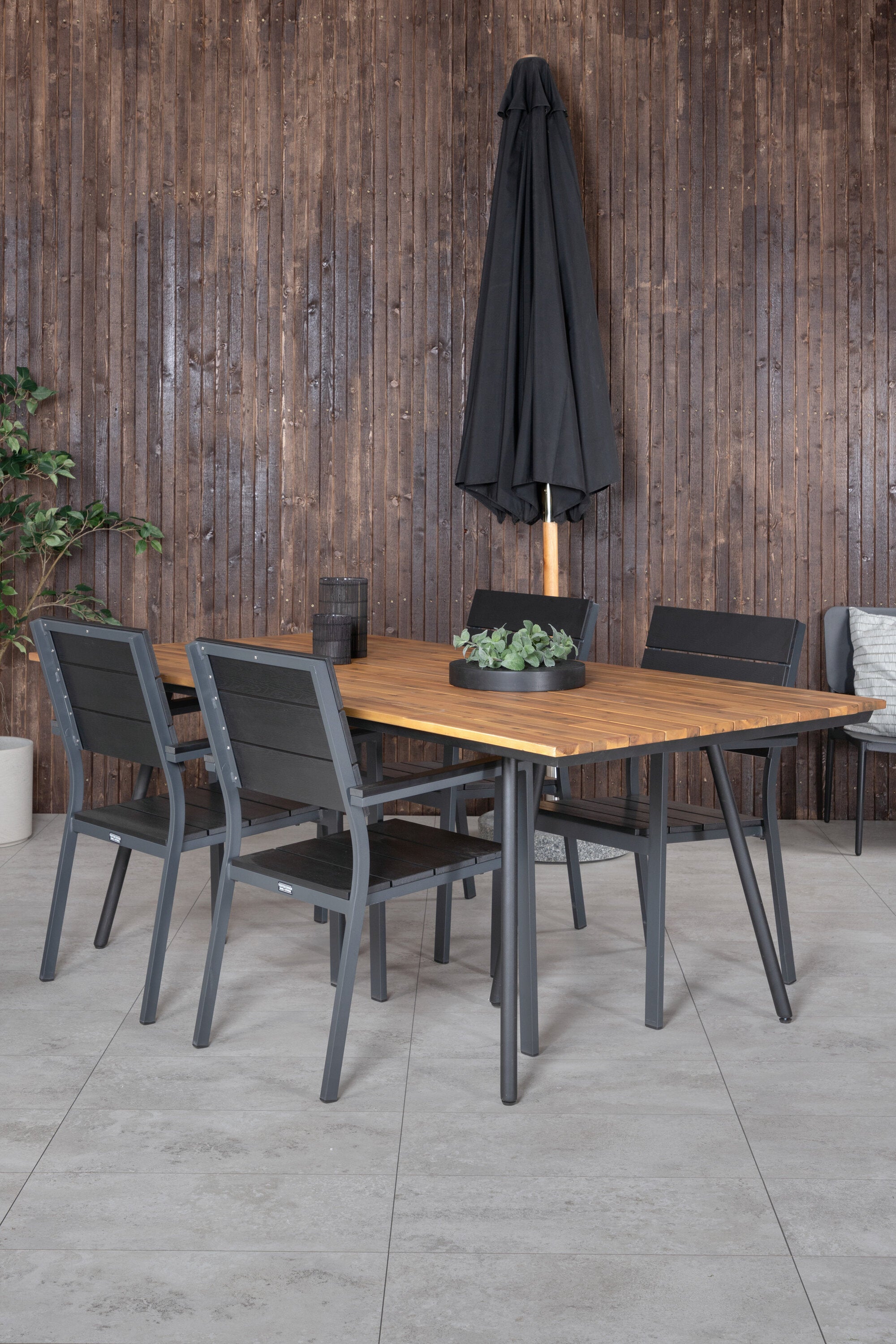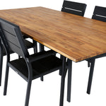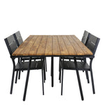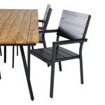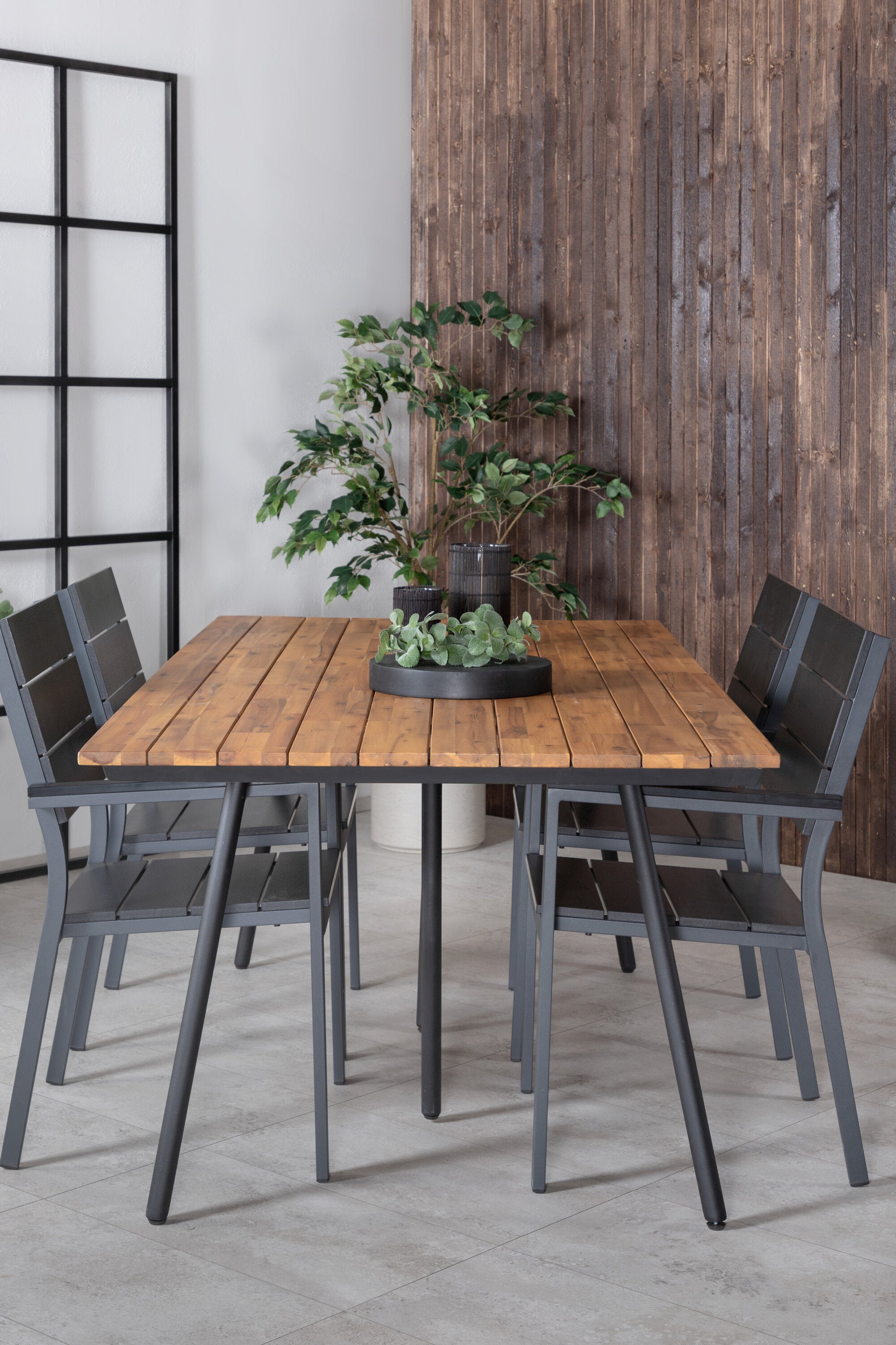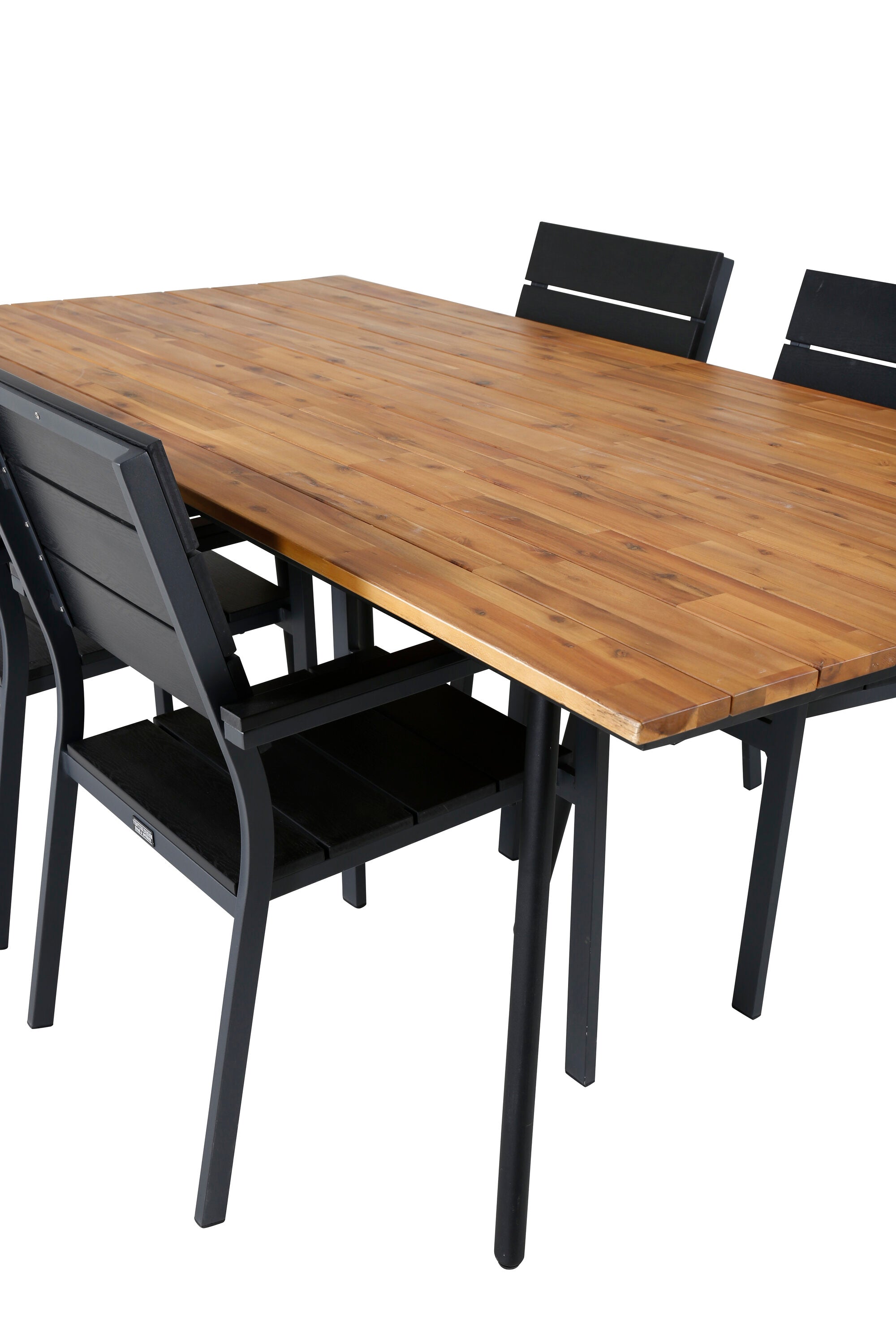 Jídelní stůl Chan - černá ocel / akácie (vzhled týkového dřeva) - 200 cm + židle (stohovatelné) - černá hliníková / černá Aintwood_4