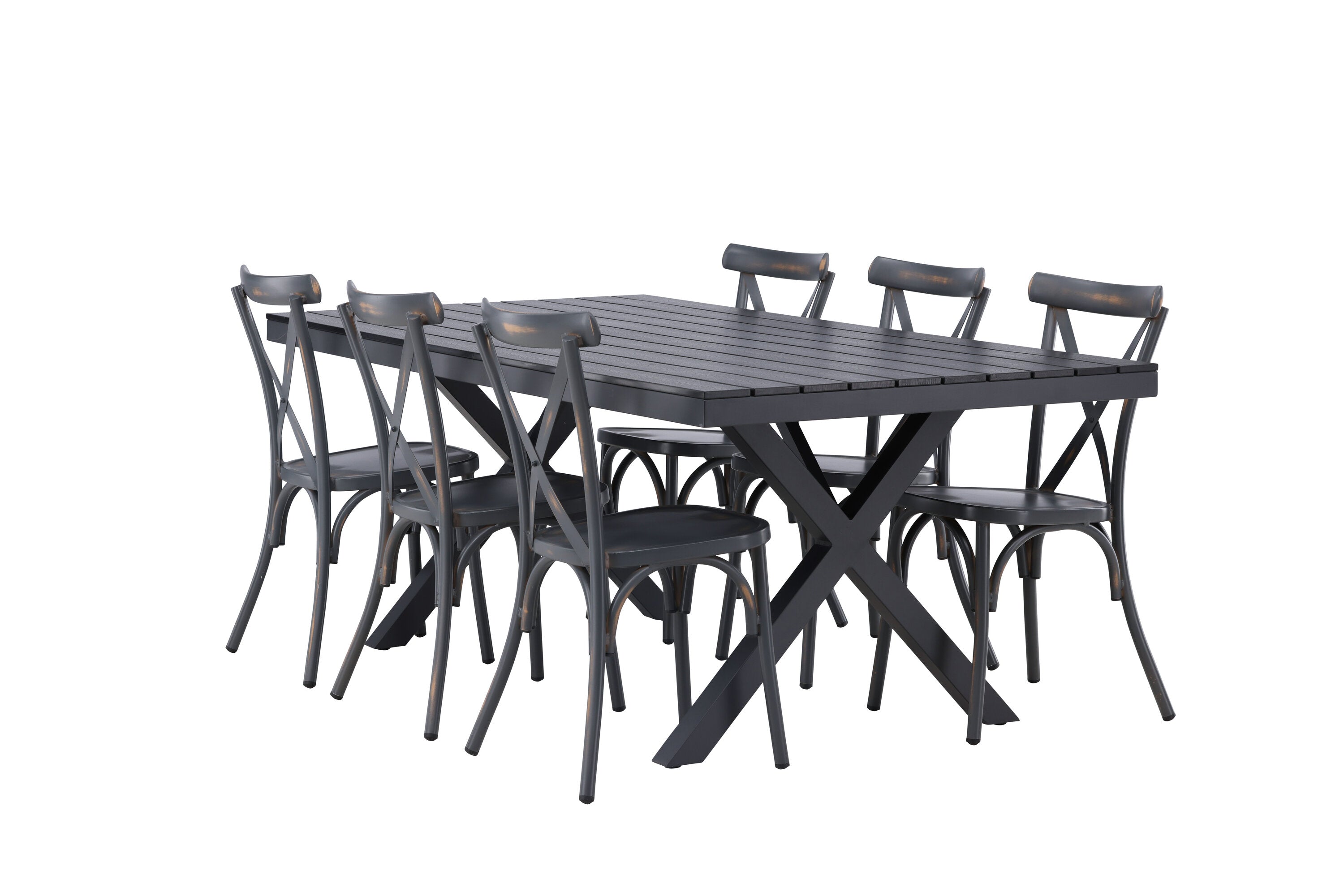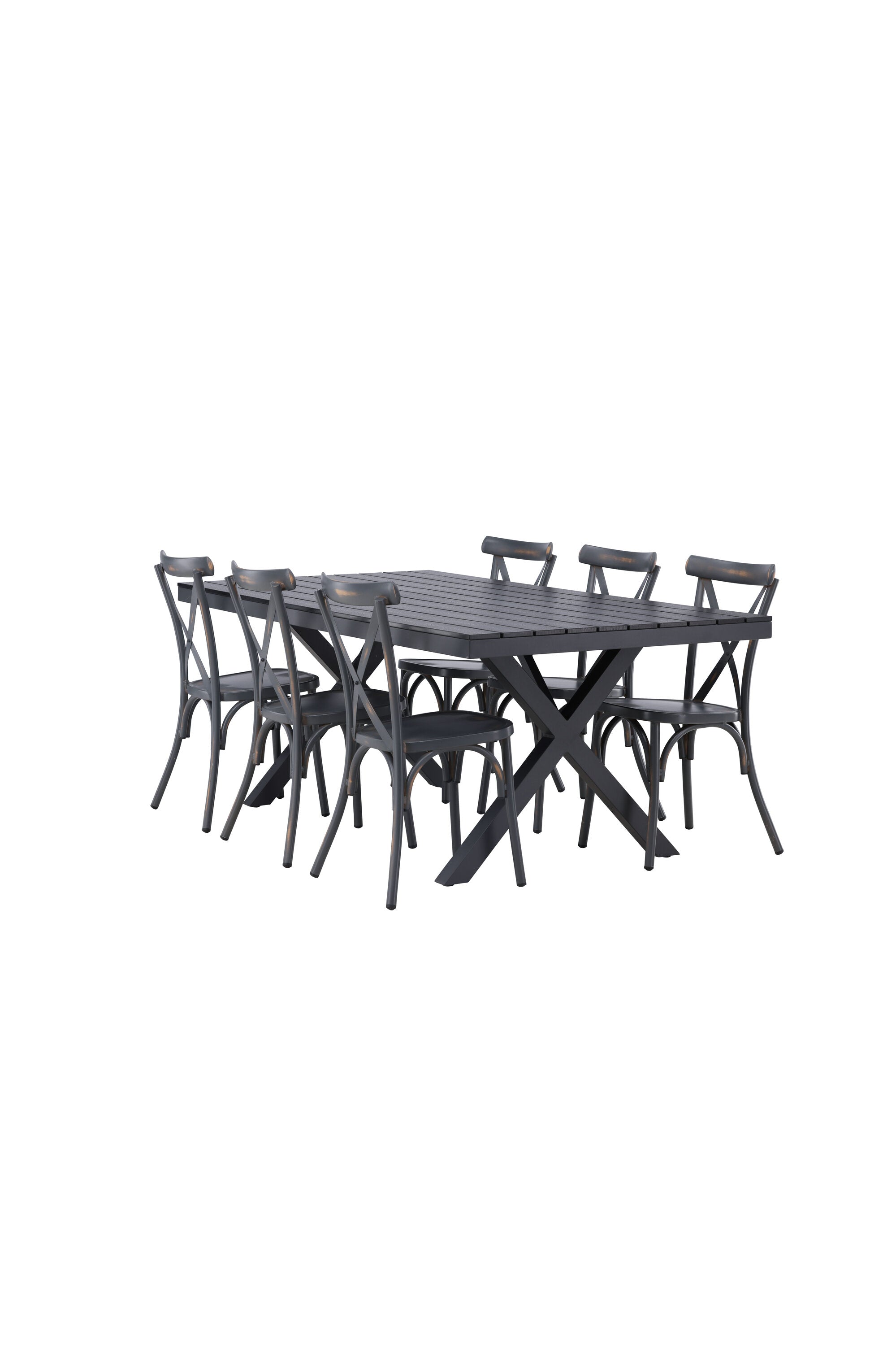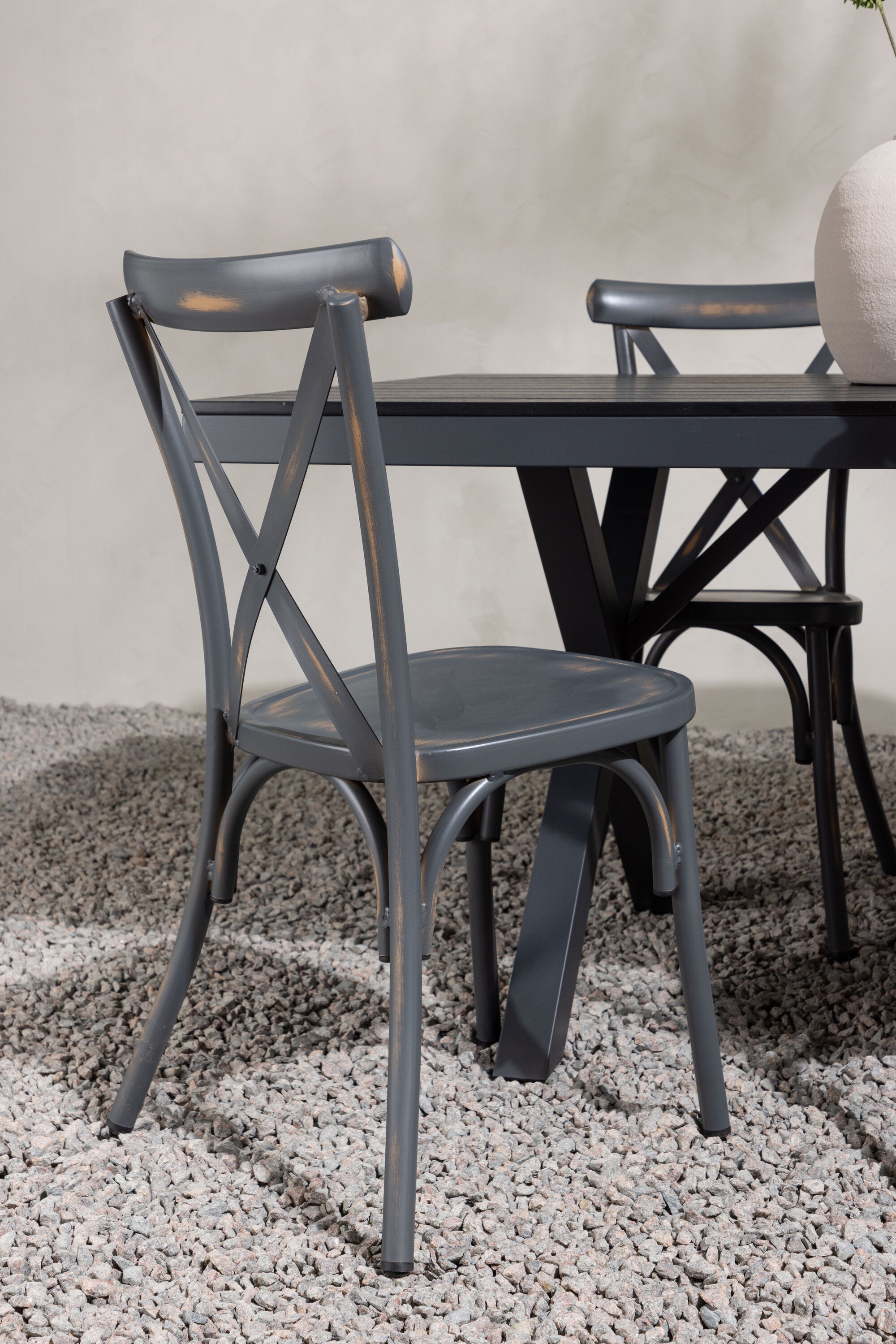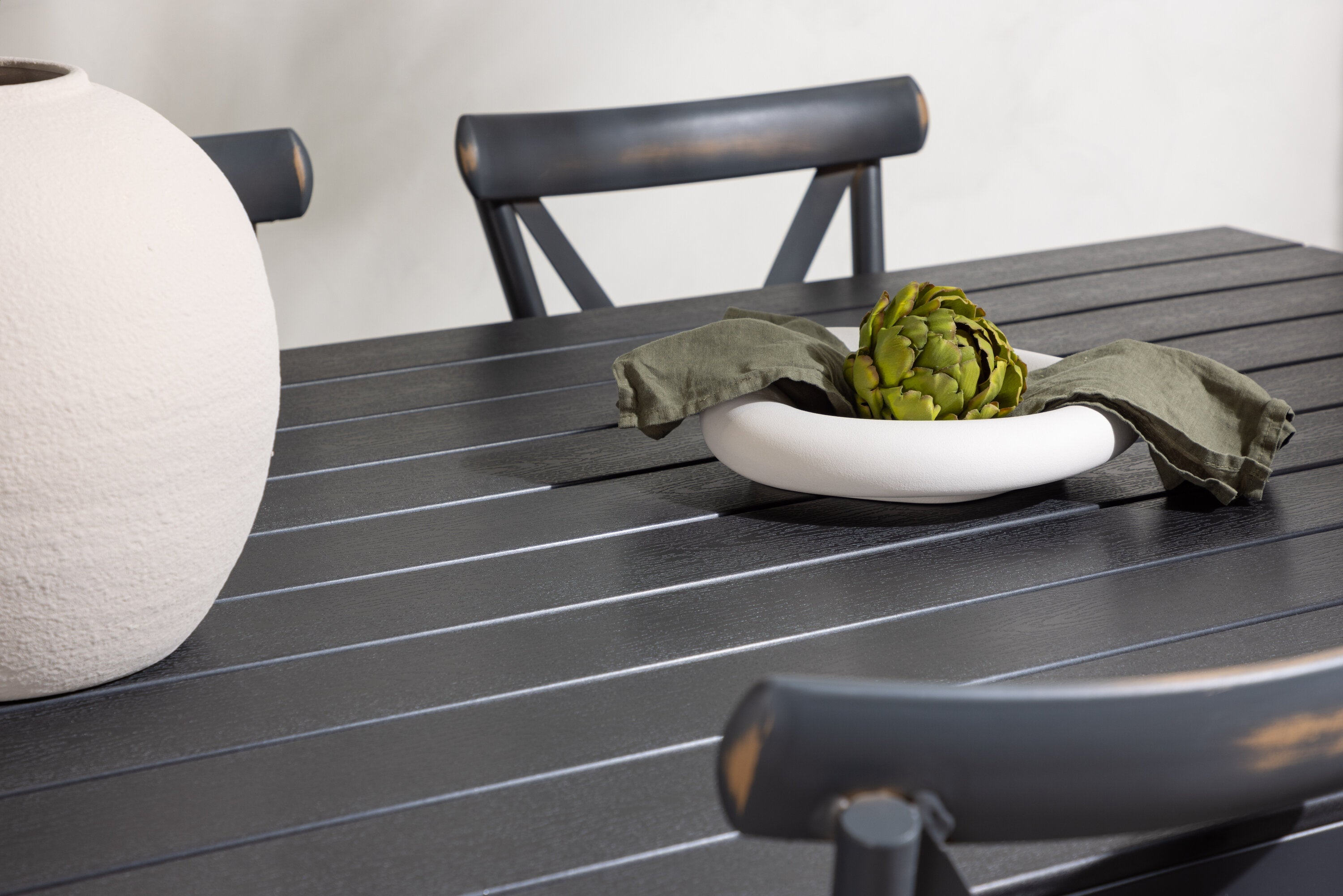 Elegantní černá jídelní sestava ve skandinávském designu – ideální pro vaši terasu! Náš obdélníkový jídelní stůl Garcia má klasický design s deskou stolu v černém aintwood a zkříženými nohami stolu v černém hliníku. Zde v kombinaci s našimi moderními jídelními židlemi ze série Tablas. Židle má industriální styl a je vyrobena z odolného hliníku v ušpiněné černé barvě. Vytvořte poutač, který udělá dojem na vaše blízké, a pohodlně se v létě usaďte! Rozměry stolu: 200 x 100 cm.