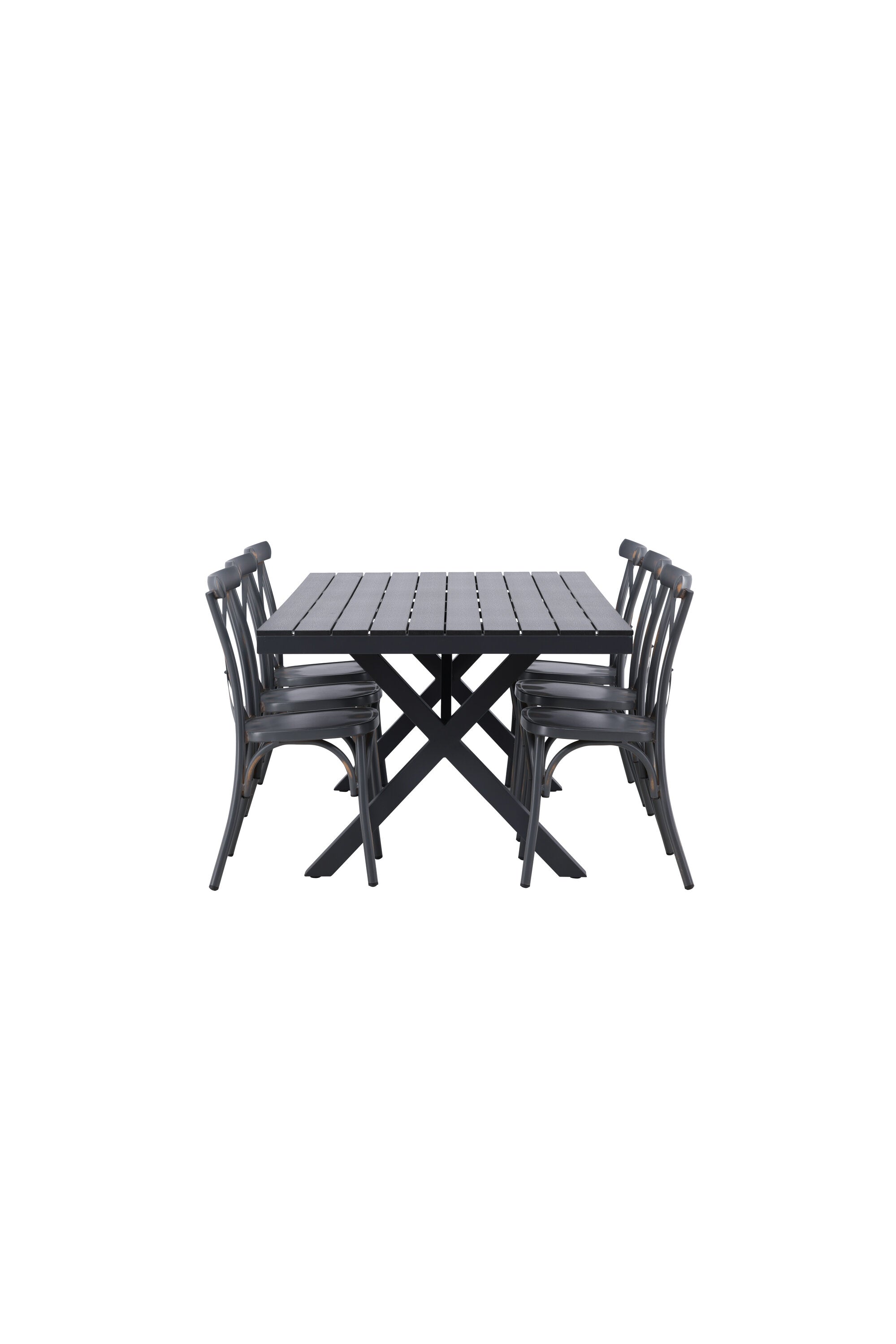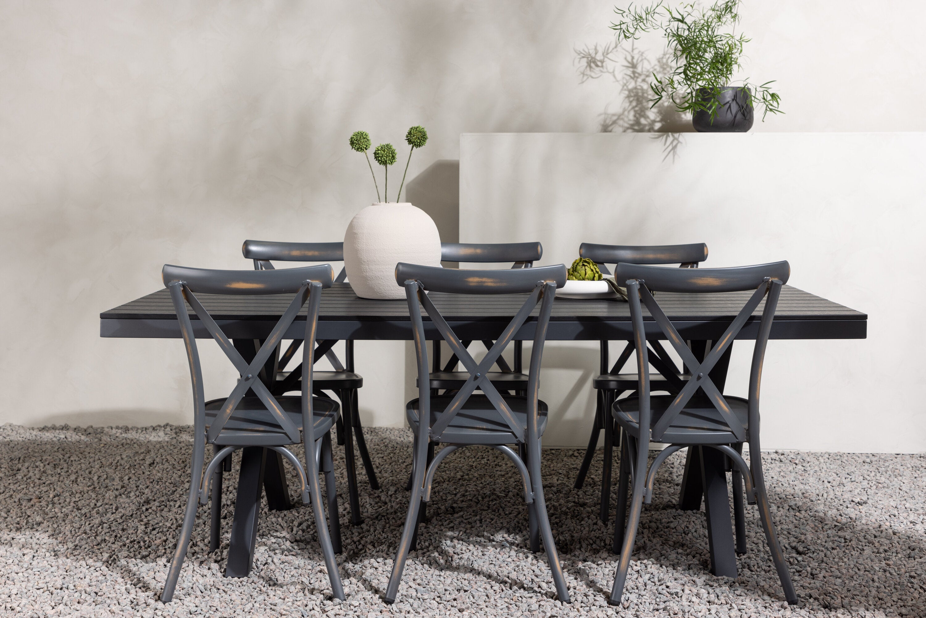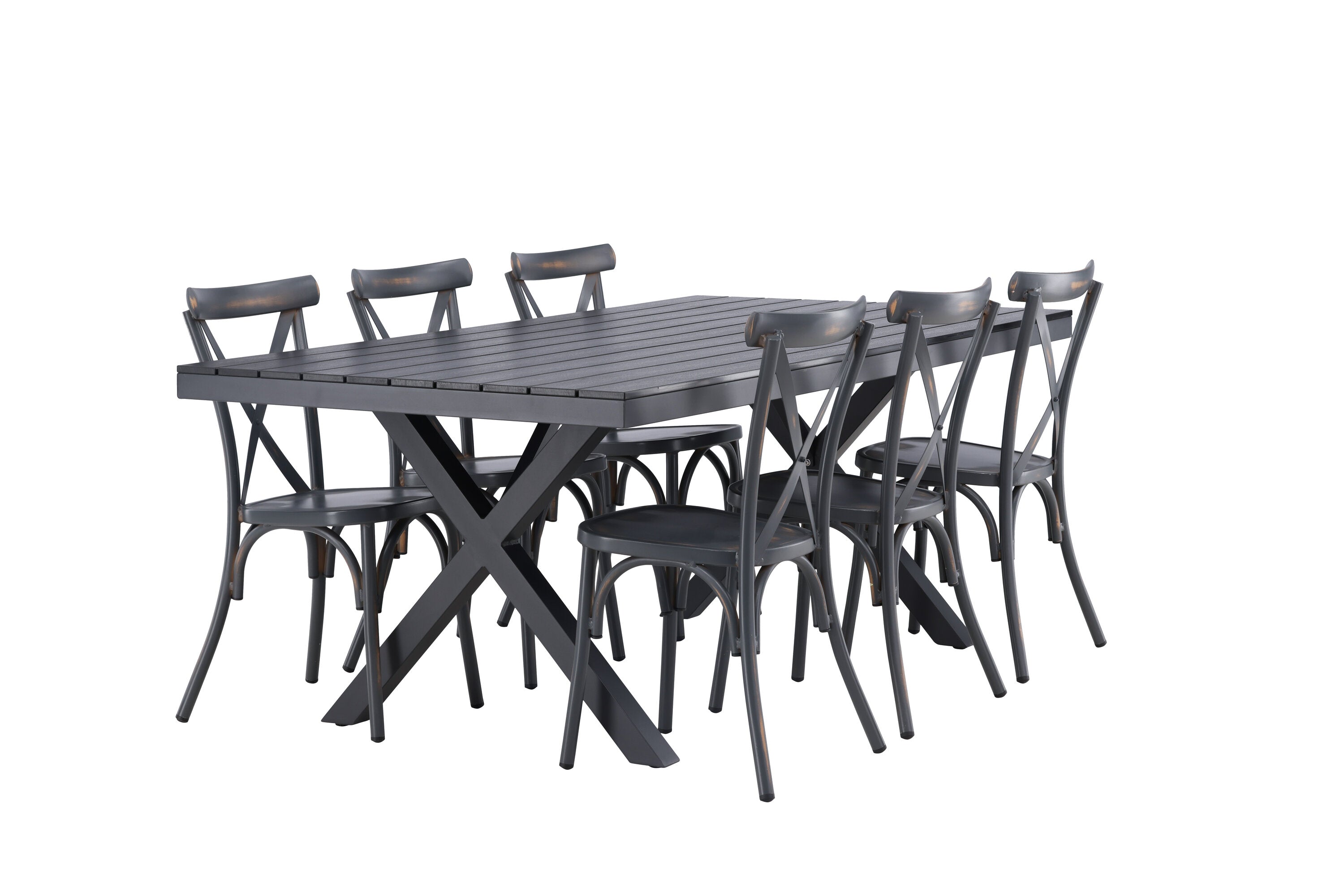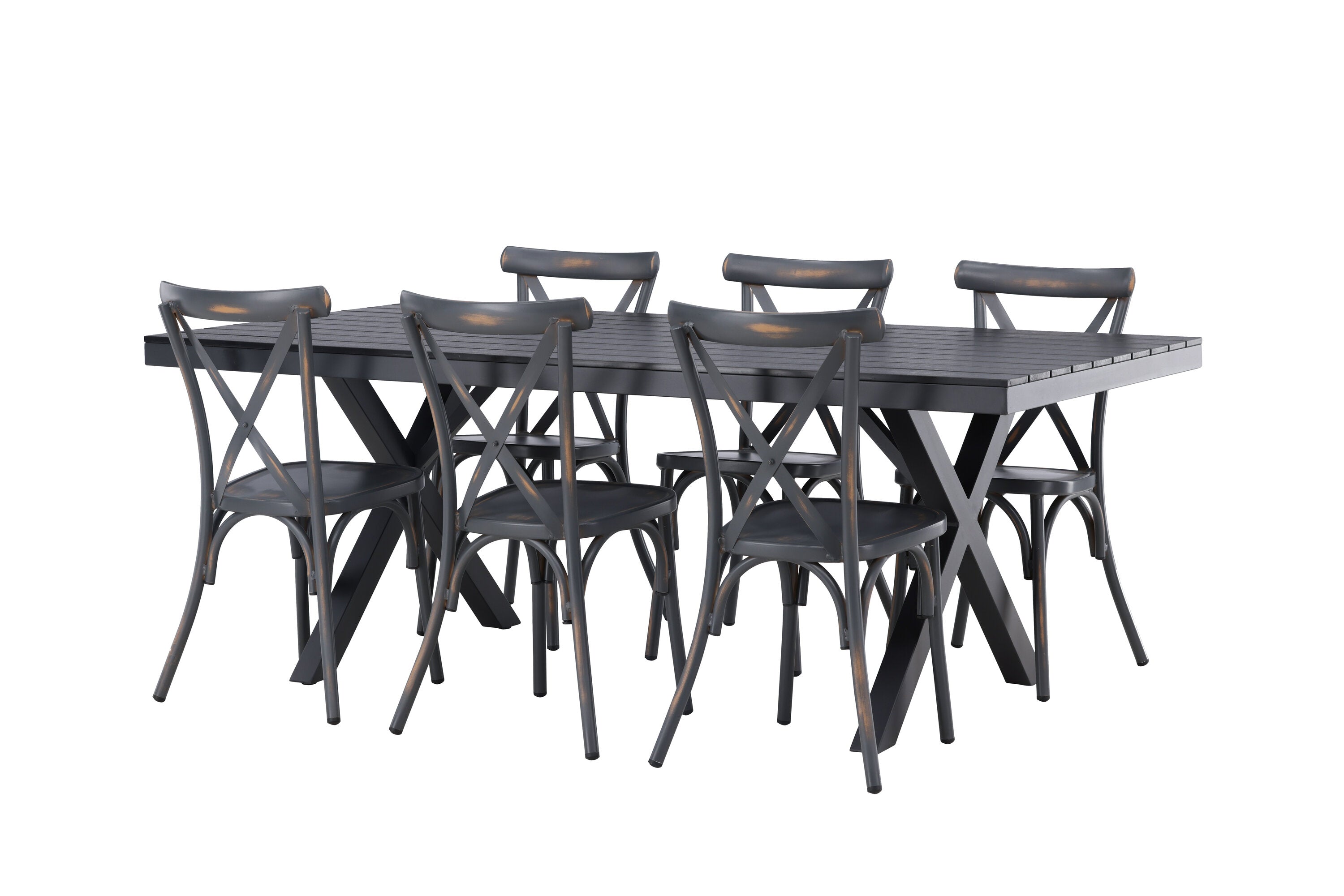 Elegantní černá jídelní sestava ve skandinávském designu – ideální pro vaši terasu! Náš obdélníkový jídelní stůl Garcia má klasický design s deskou stolu v černém aintwood a zkříženými nohami stolu v černém hliníku. Zde v kombinaci s našimi moderními jídelními židlemi ze série Tablas. Židle má industriální styl a je vyrobena z odolného hliníku v ušpiněné černé barvě. Vytvořte poutač, který udělá dojem na vaše blízké, a pohodlně se v létě usaďte! Rozměry stolu: 200 x 100 cm.