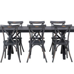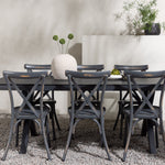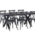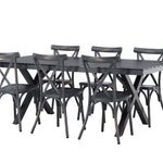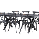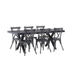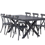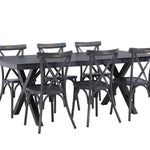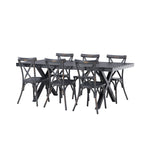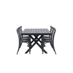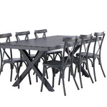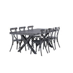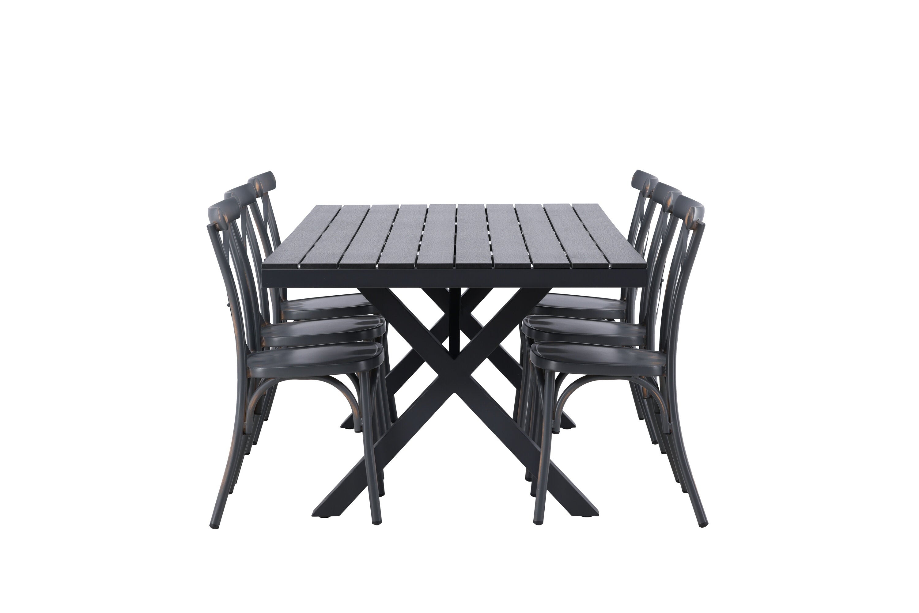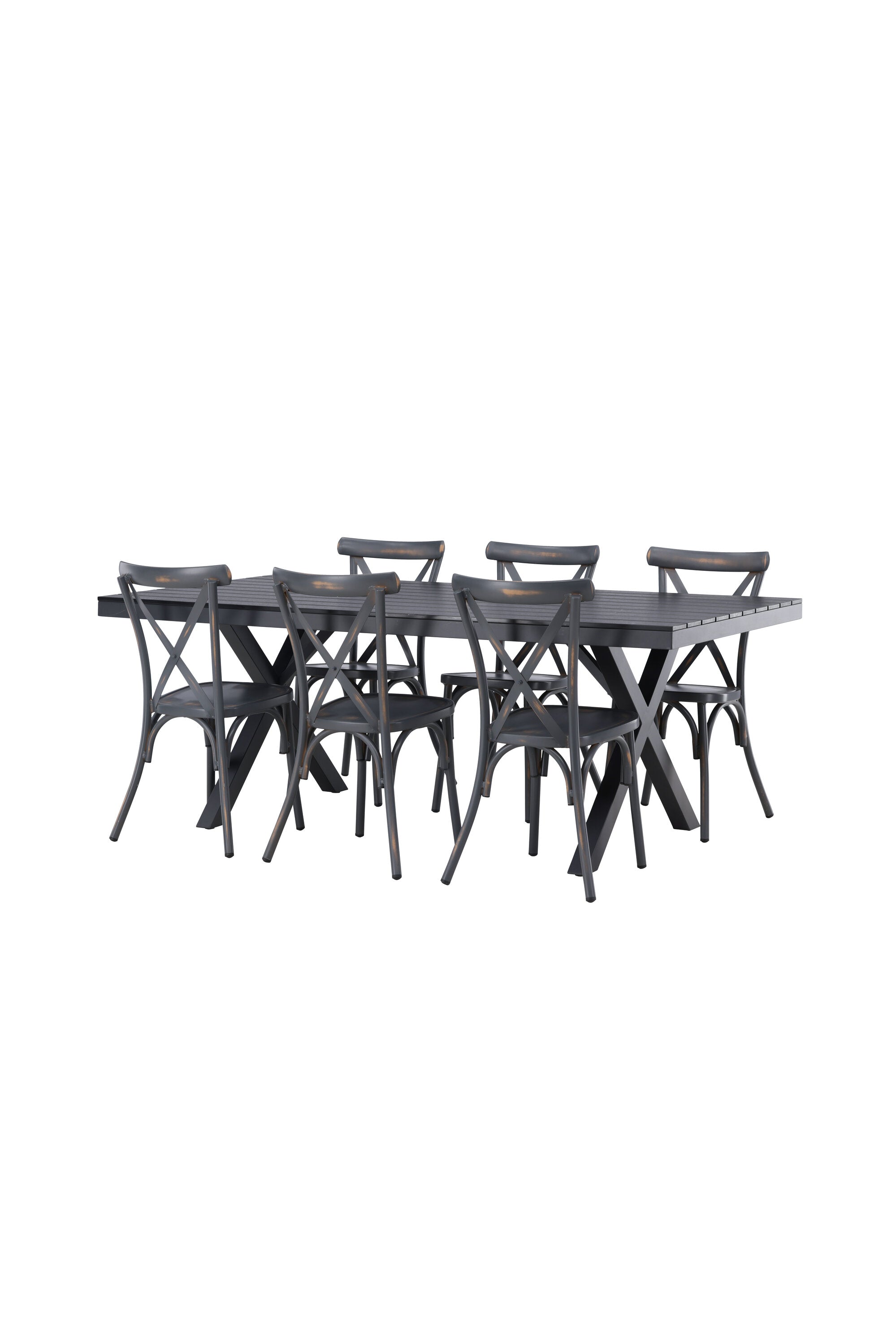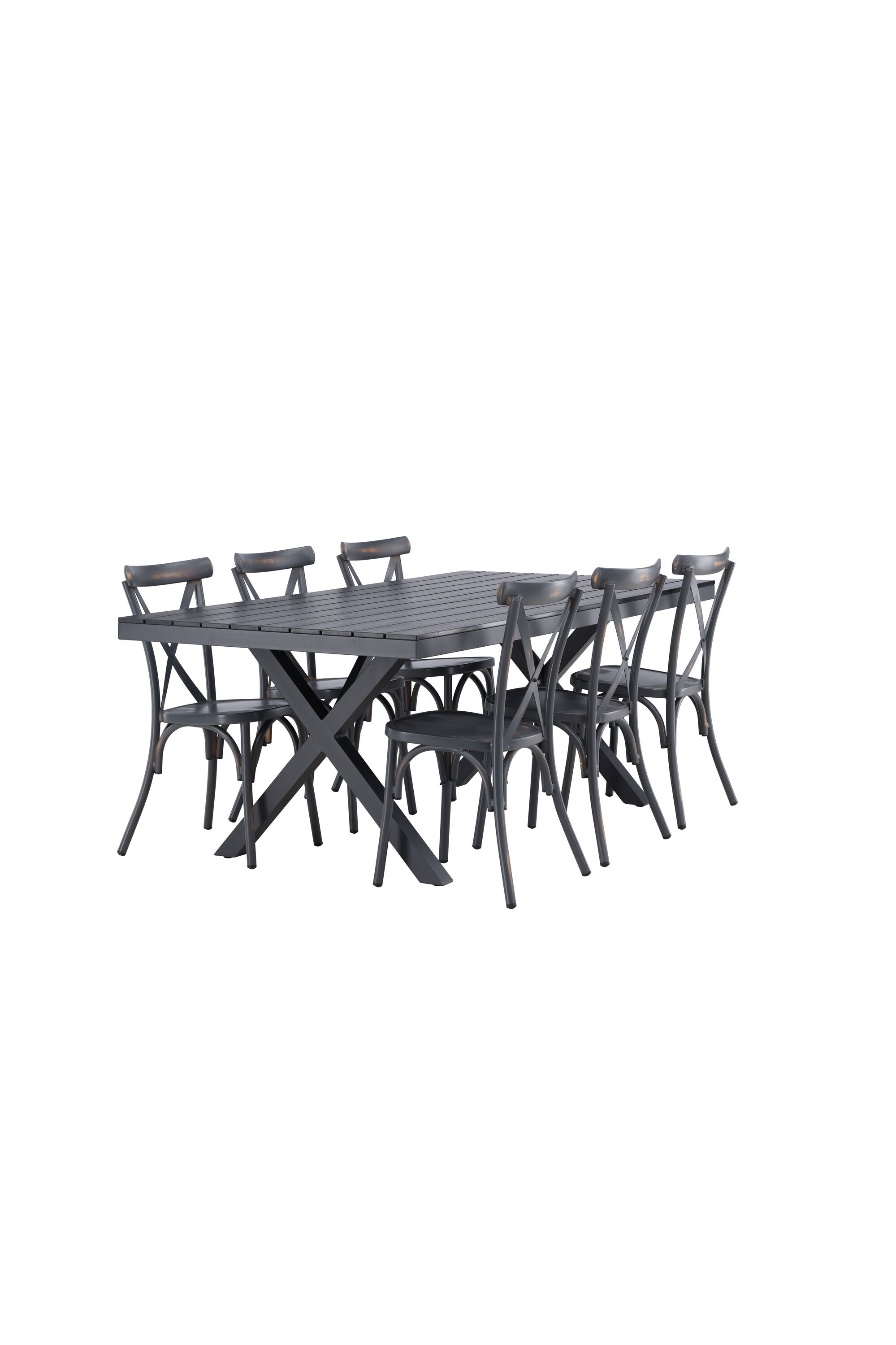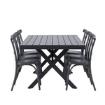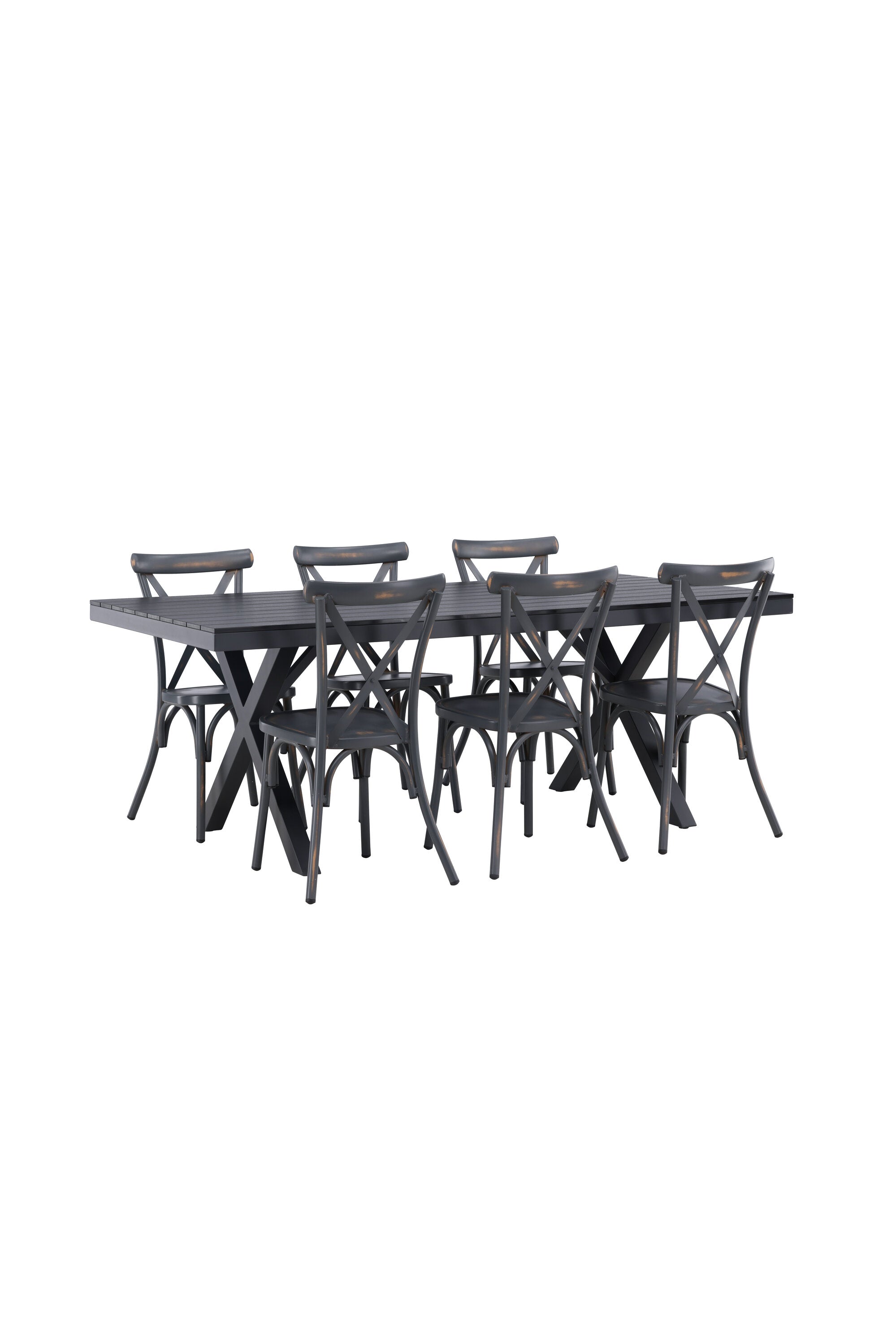 Elegantní černá jídelní sestava ve skandinávském designu – ideální pro vaši terasu! Náš obdélníkový jídelní stůl Garcia má klasický design s deskou stolu v černém aintwood a zkříženými nohami stolu v černém hliníku. Zde v kombinaci s našimi moderními jídelními židlemi ze série Tablas. Židle má industriální styl a je vyrobena z odolného hliníku v ušpiněné černé barvě. Vytvořte poutač, který udělá dojem na vaše blízké, a pohodlně se v létě usaďte! Rozměry stolu: 200 x 100 cm.