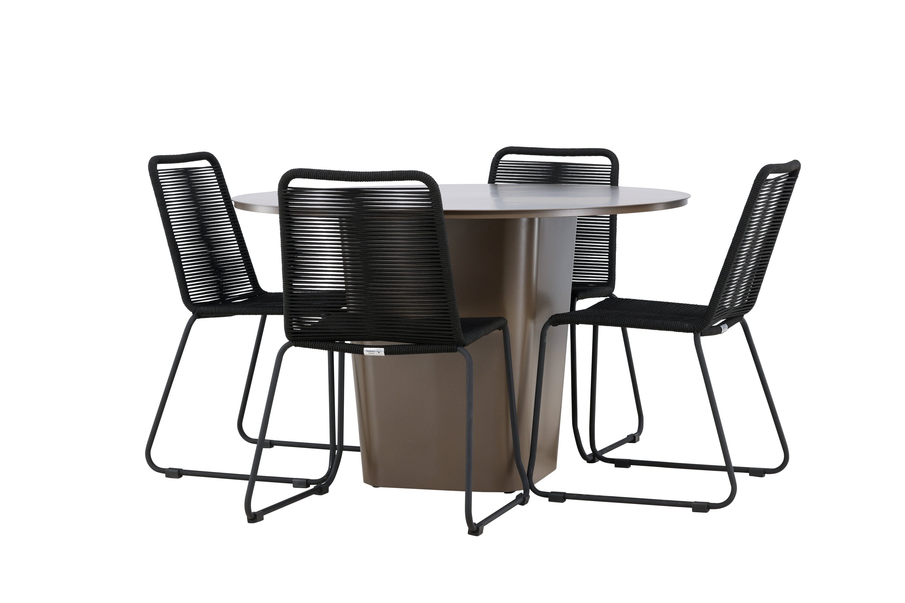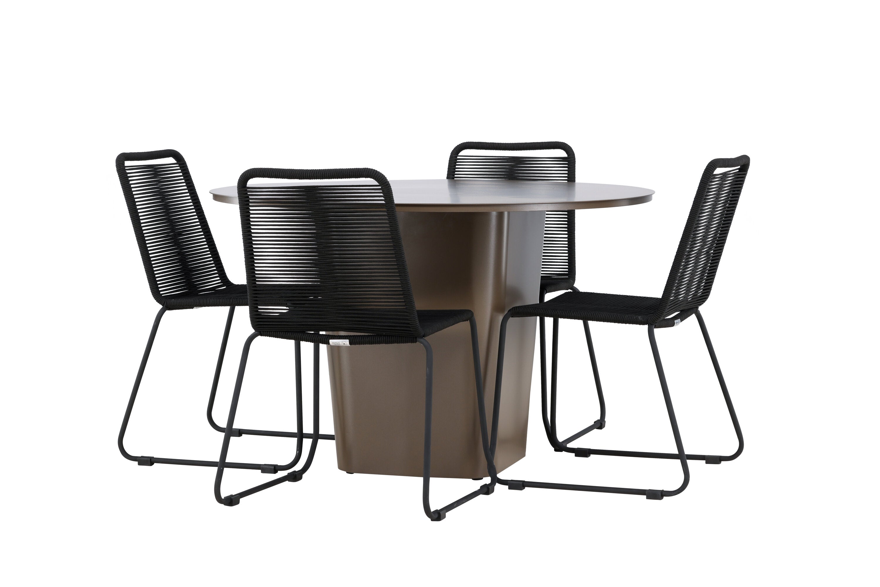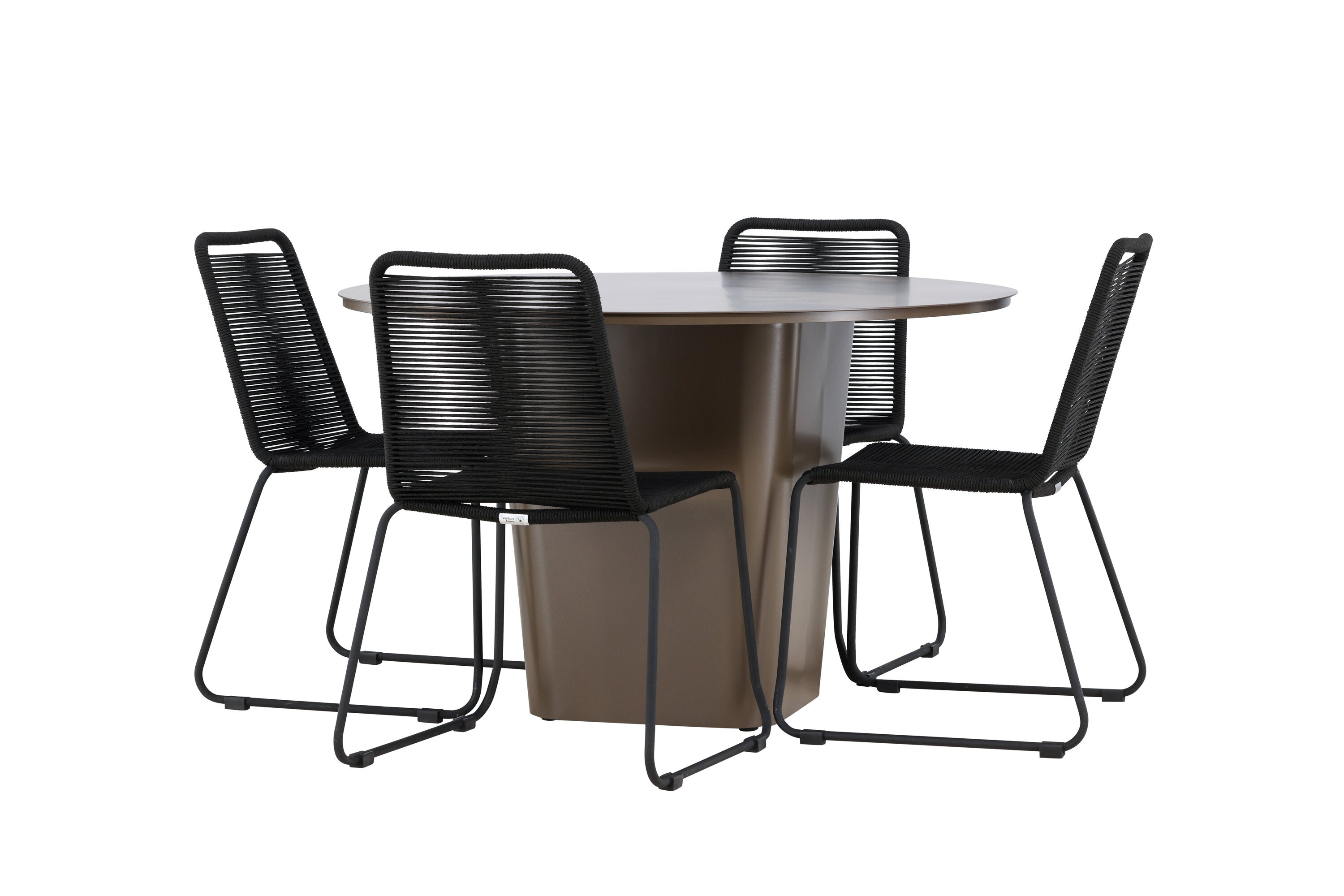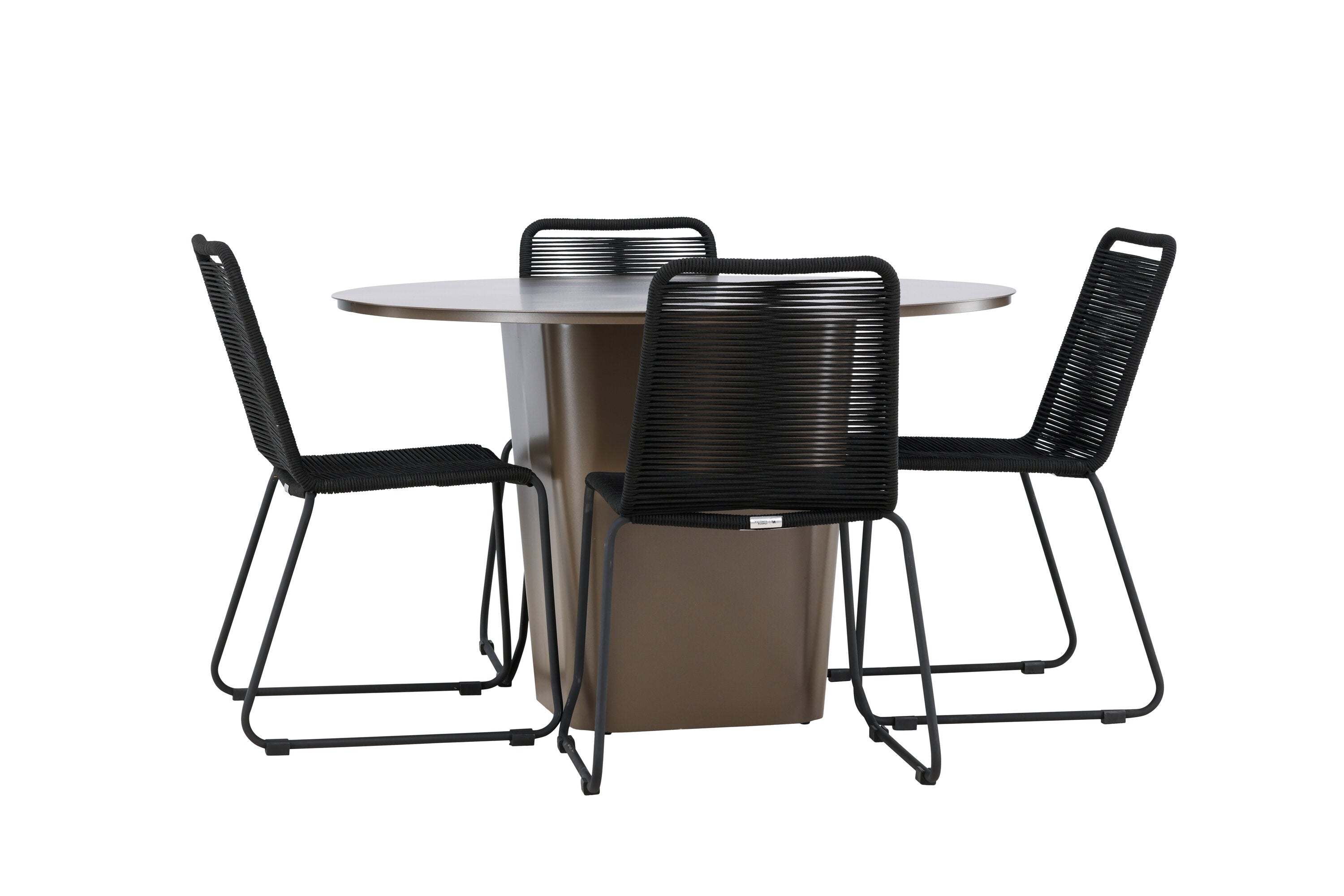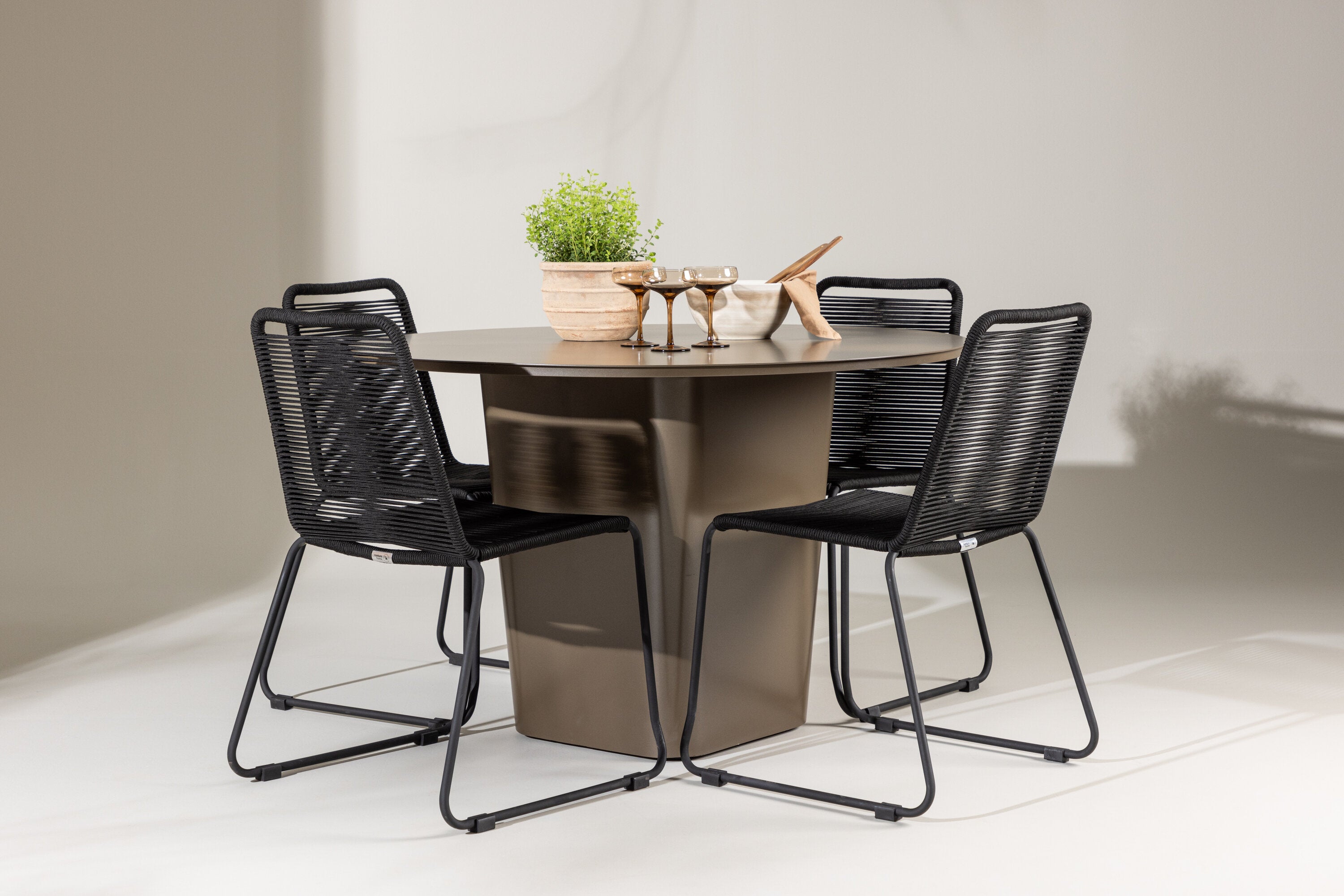 Tato jídelní souprava se čtyřmi židlemi Lindos, které jsou součástí dodávky, nabízí pohodlné a stylové sezení pro malé i velké venkovní akce.
