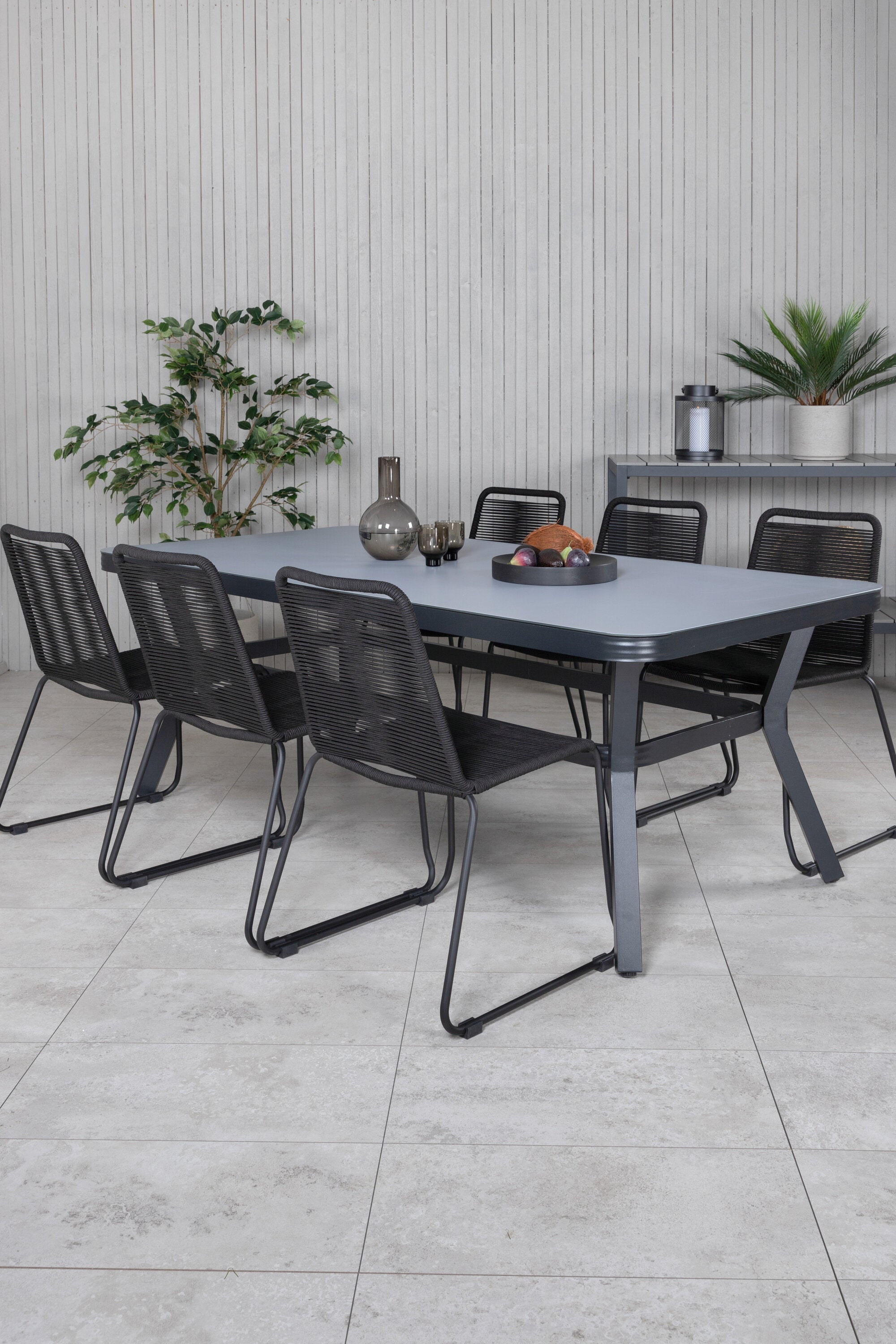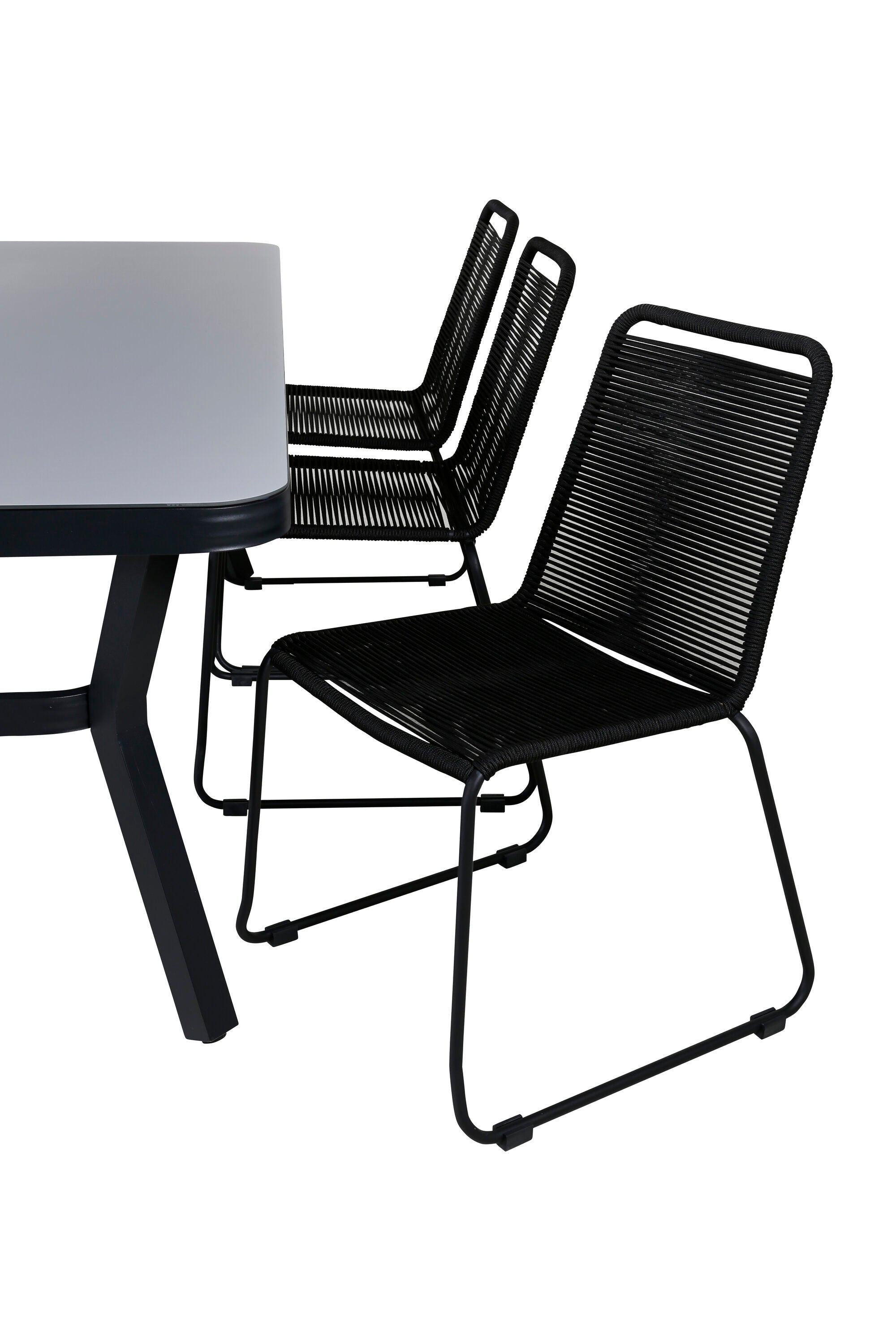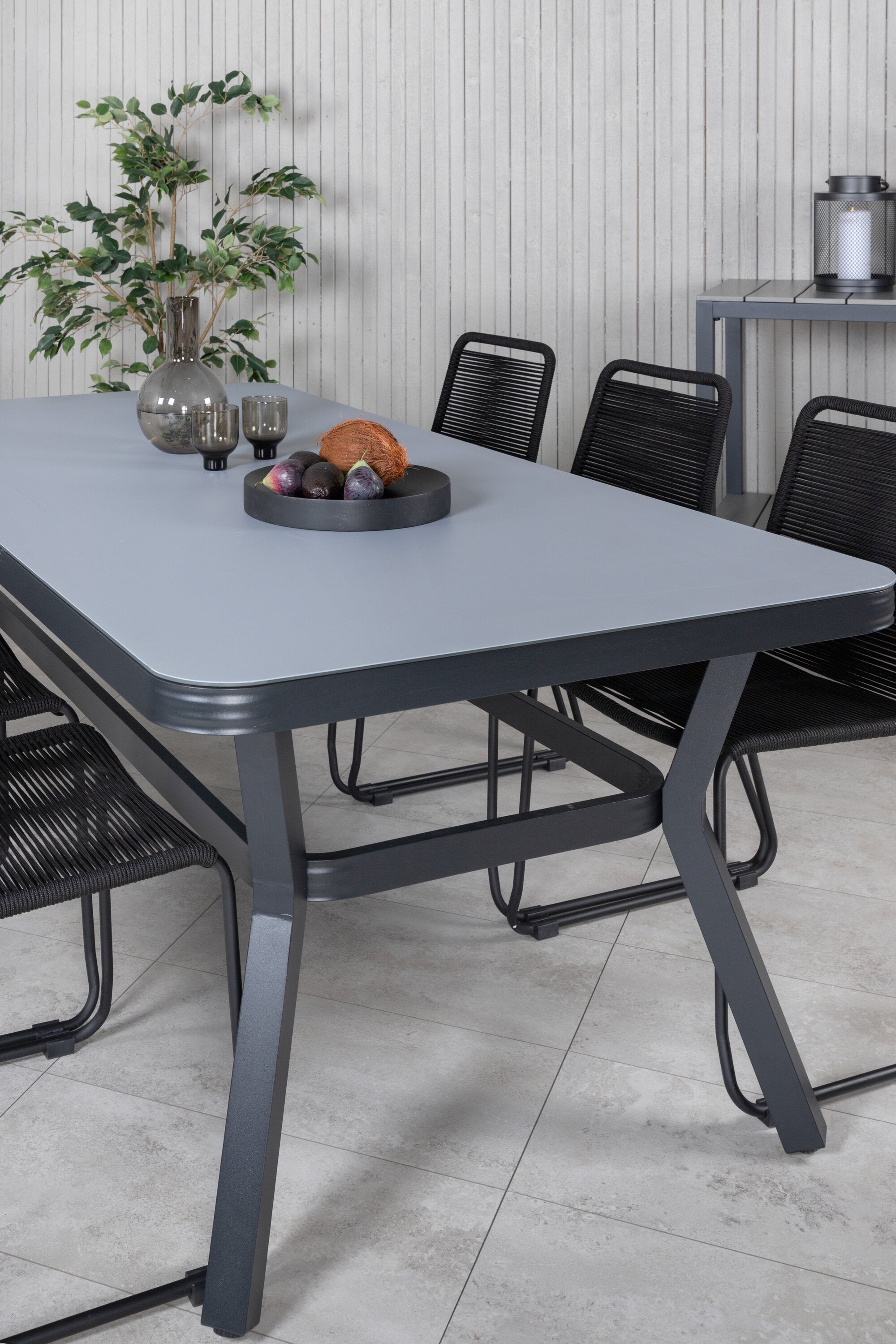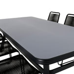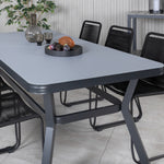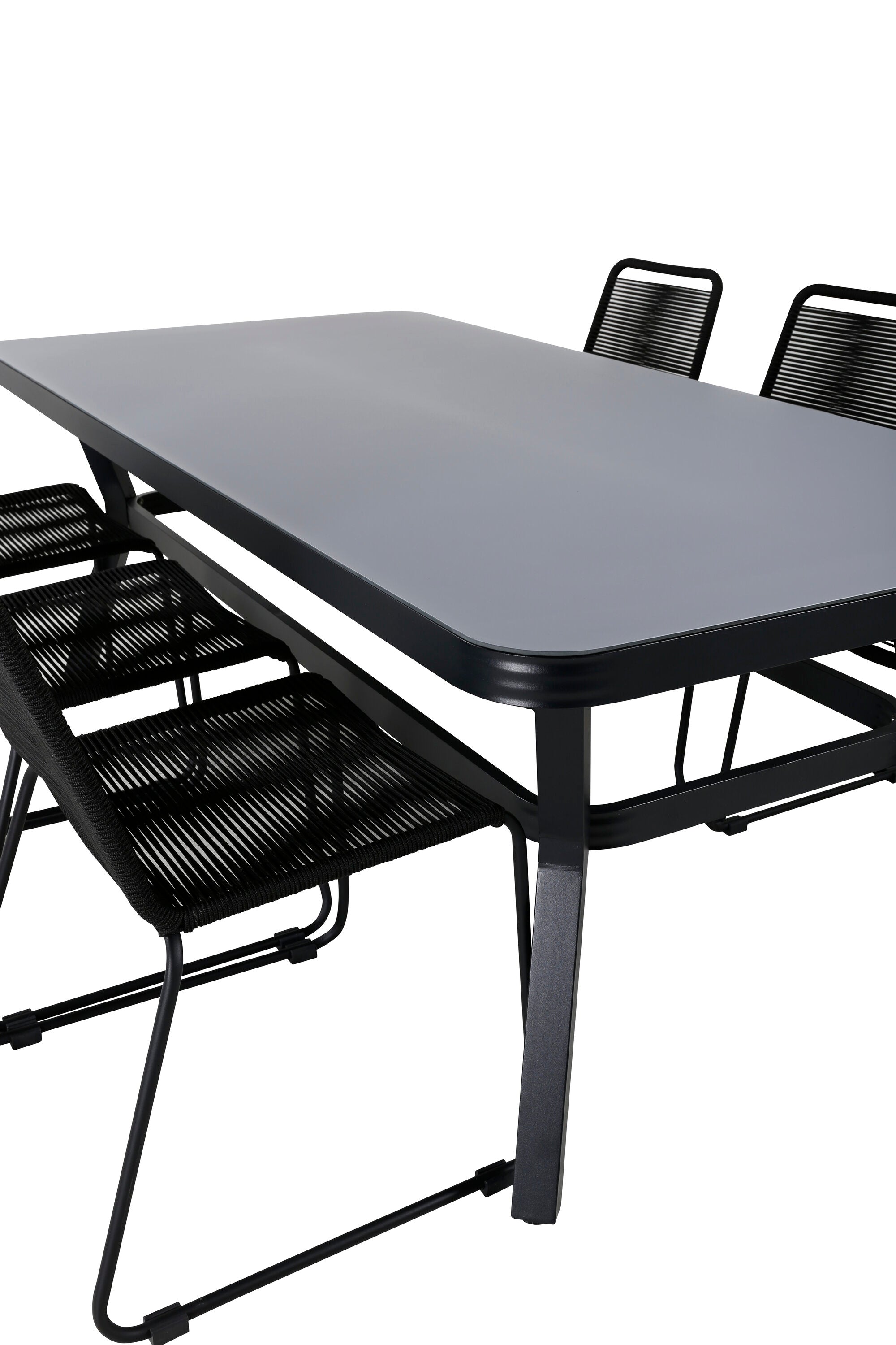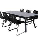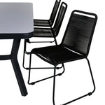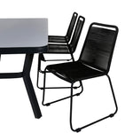 Jídelní stůl Virya - černá Alu / šedé sklo - velký stůl + stohovací židle Lindos - černá Alu / černé lano_6