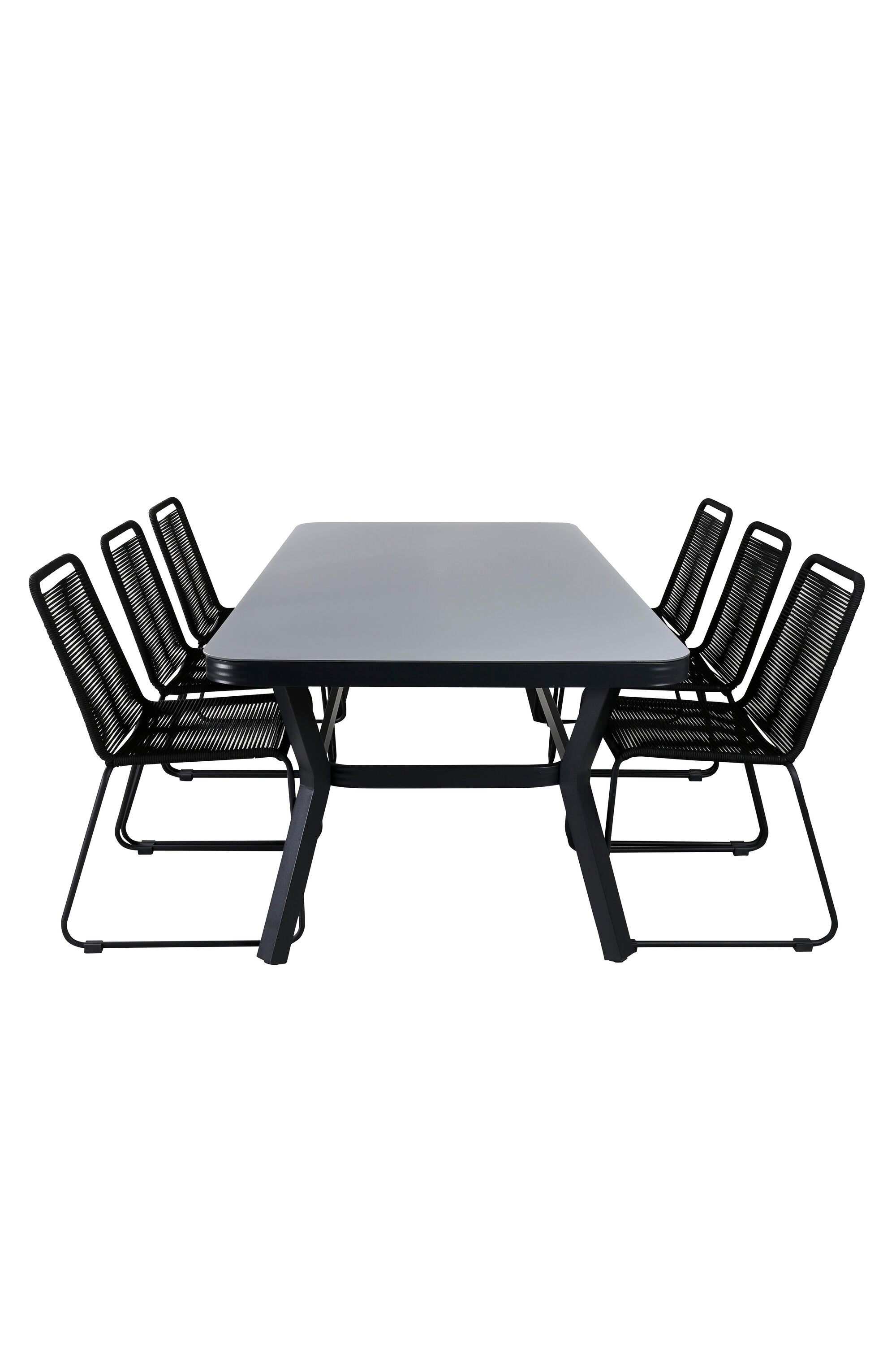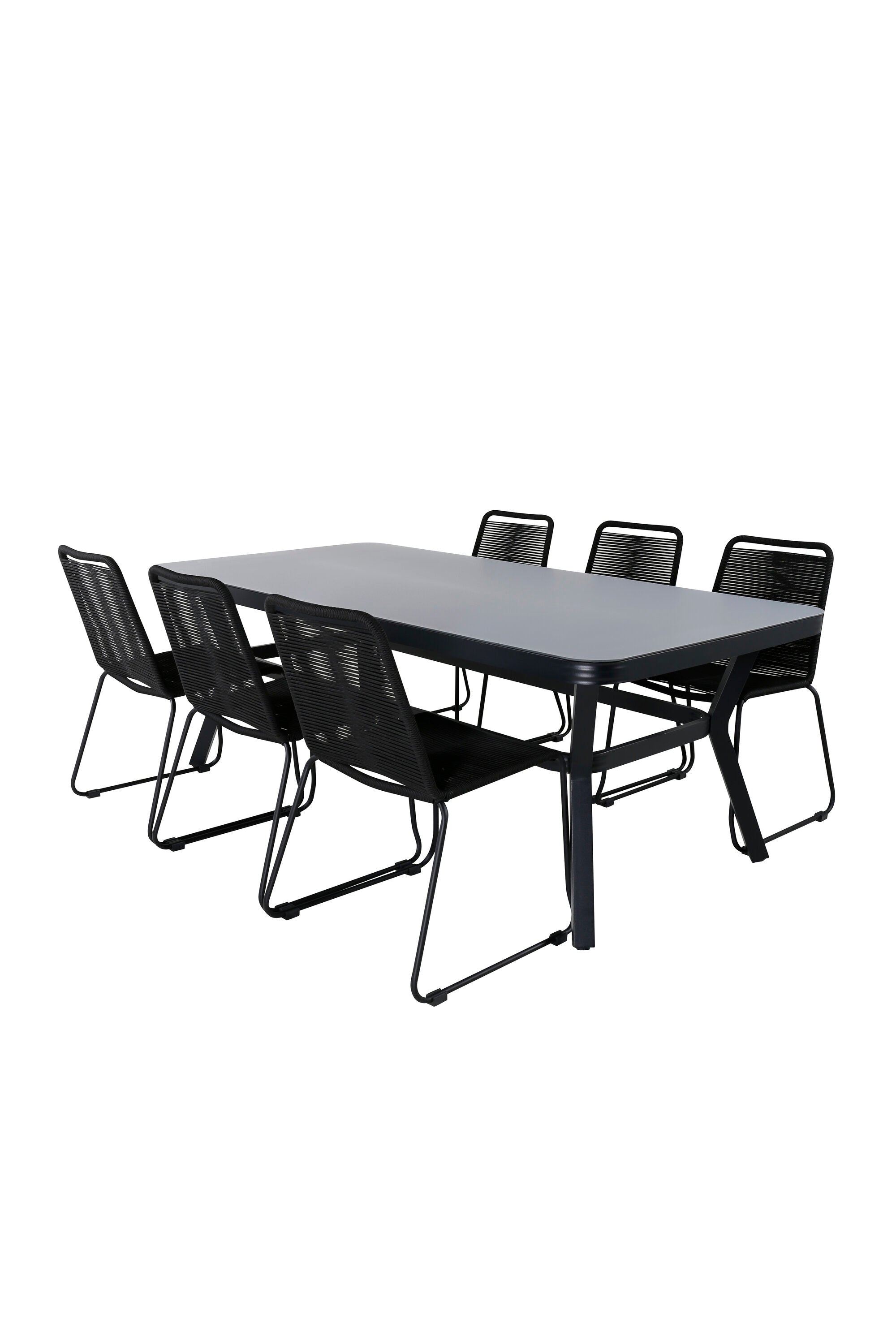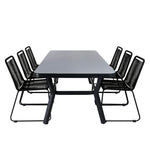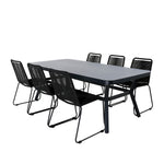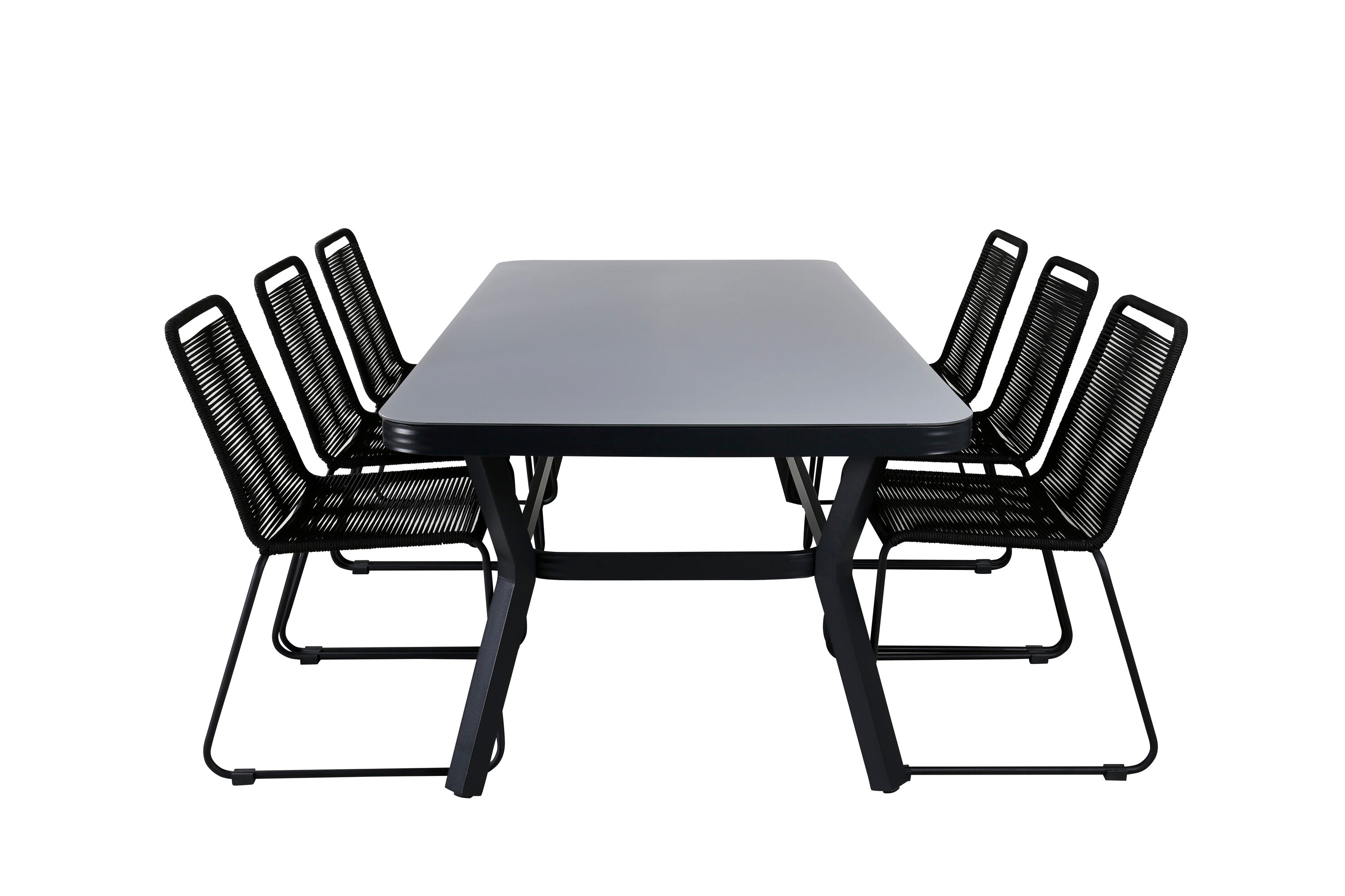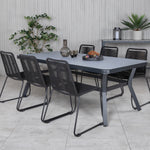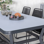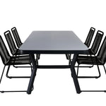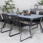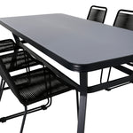 Jídelní stůl Virya - černá Alu / šedé sklo - velký stůl + stohovací židle Lindos - černá Alu / černé lano_6