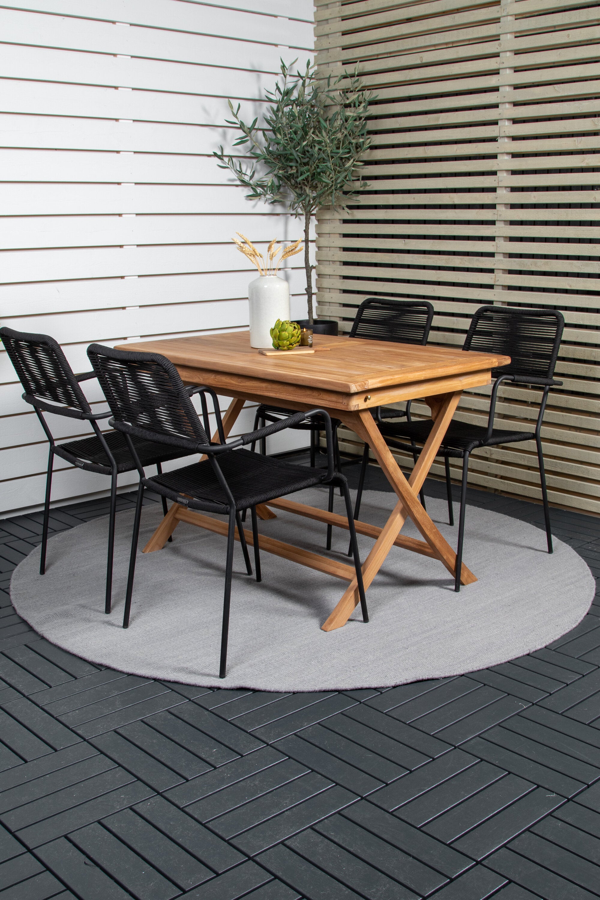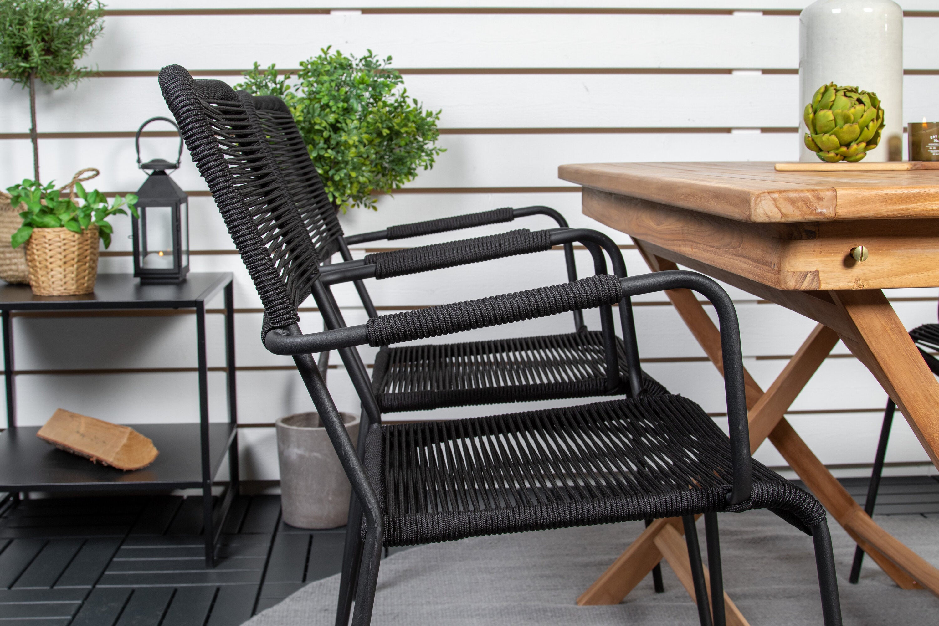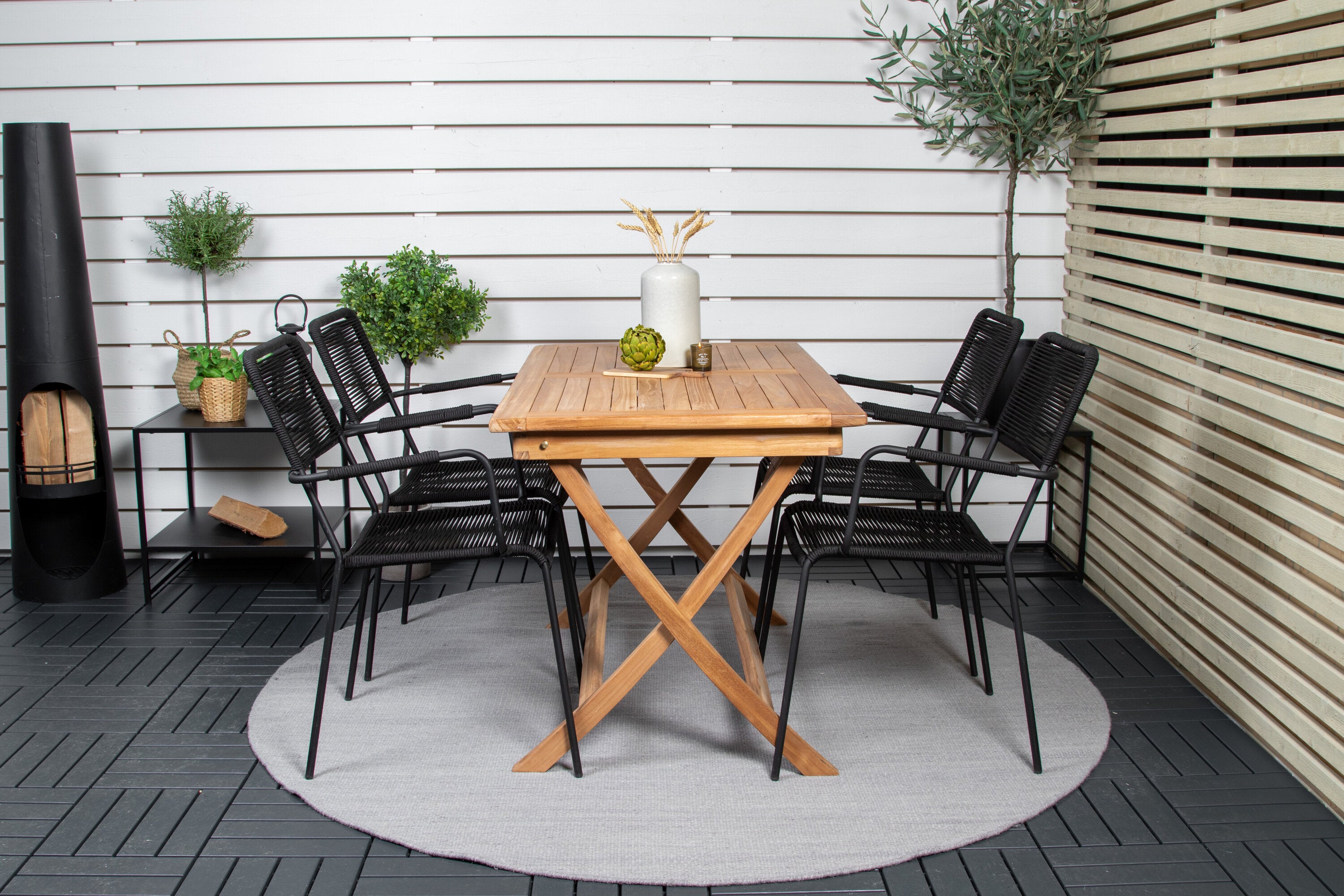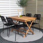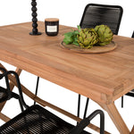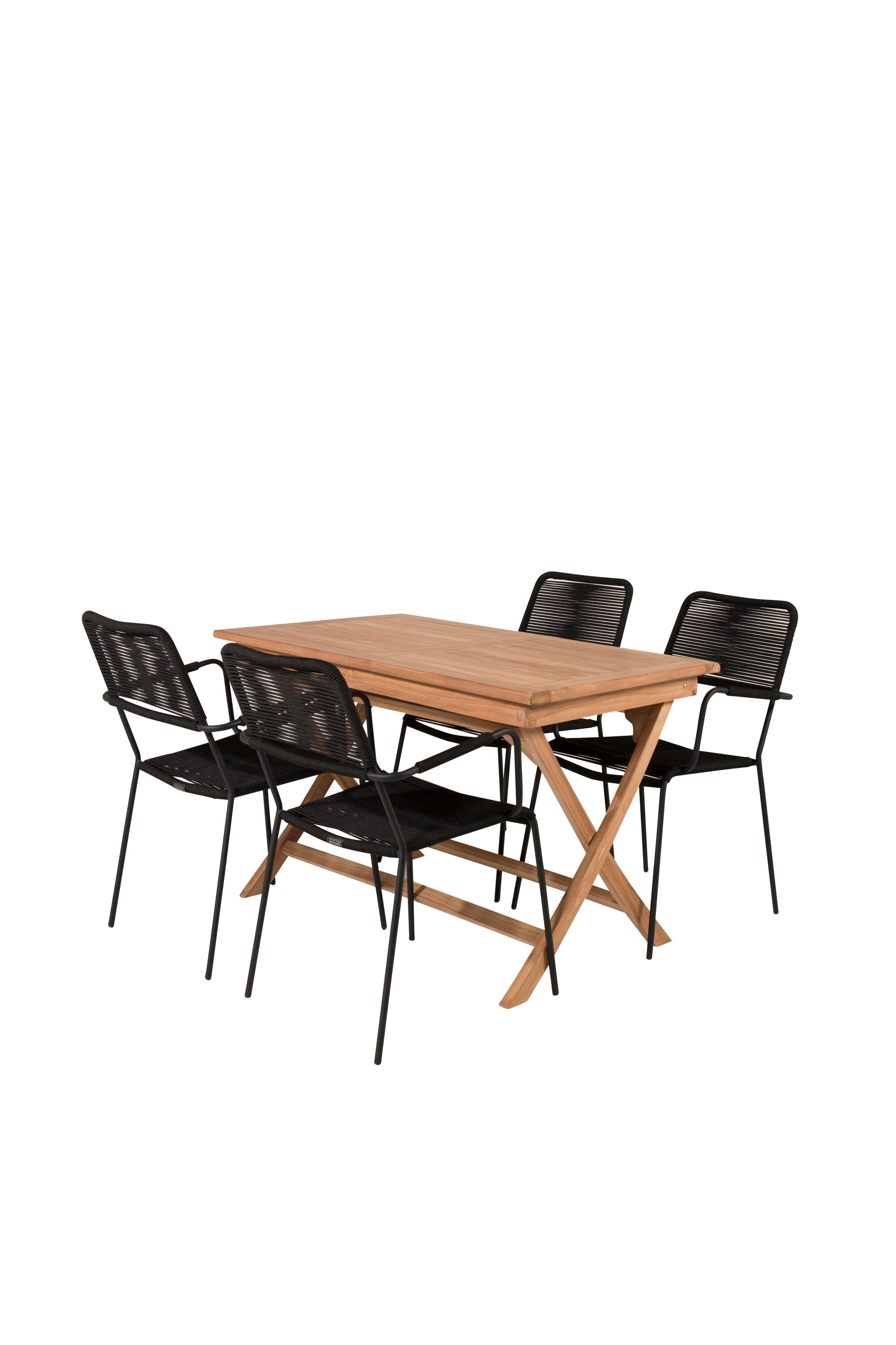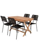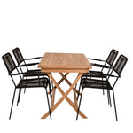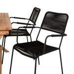 Stylová, trendová a pohodlná jídelní sestava ve skandinávském designu! Náš oblíbený obdélníkový jídelní stůl Kenya má nadčasový design s žebrovanou verzí ve vkusném teaku. Křížové nohy působí pevným a okouzlujícím dojmem. Rozměry: 120x70 cm. Zde v štíhlé kombinaci s lahodnými jídelními židlemi ze série Lindos. Židle mají integrované područky z černé oceli a sedák z odolného černého lana. Zařiďte nádvoří příjemně a vytvořte poutač, který zaujme!