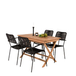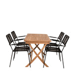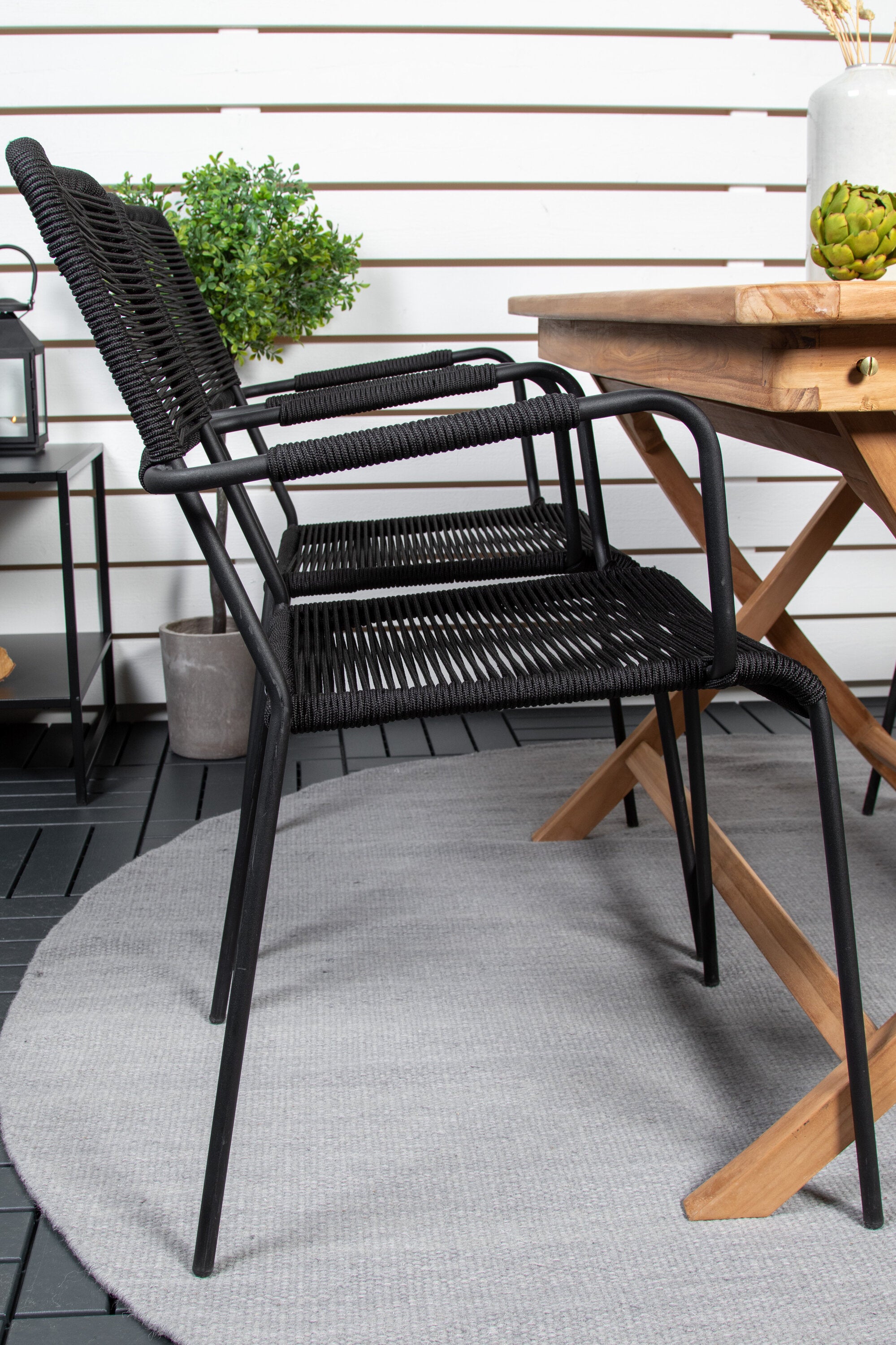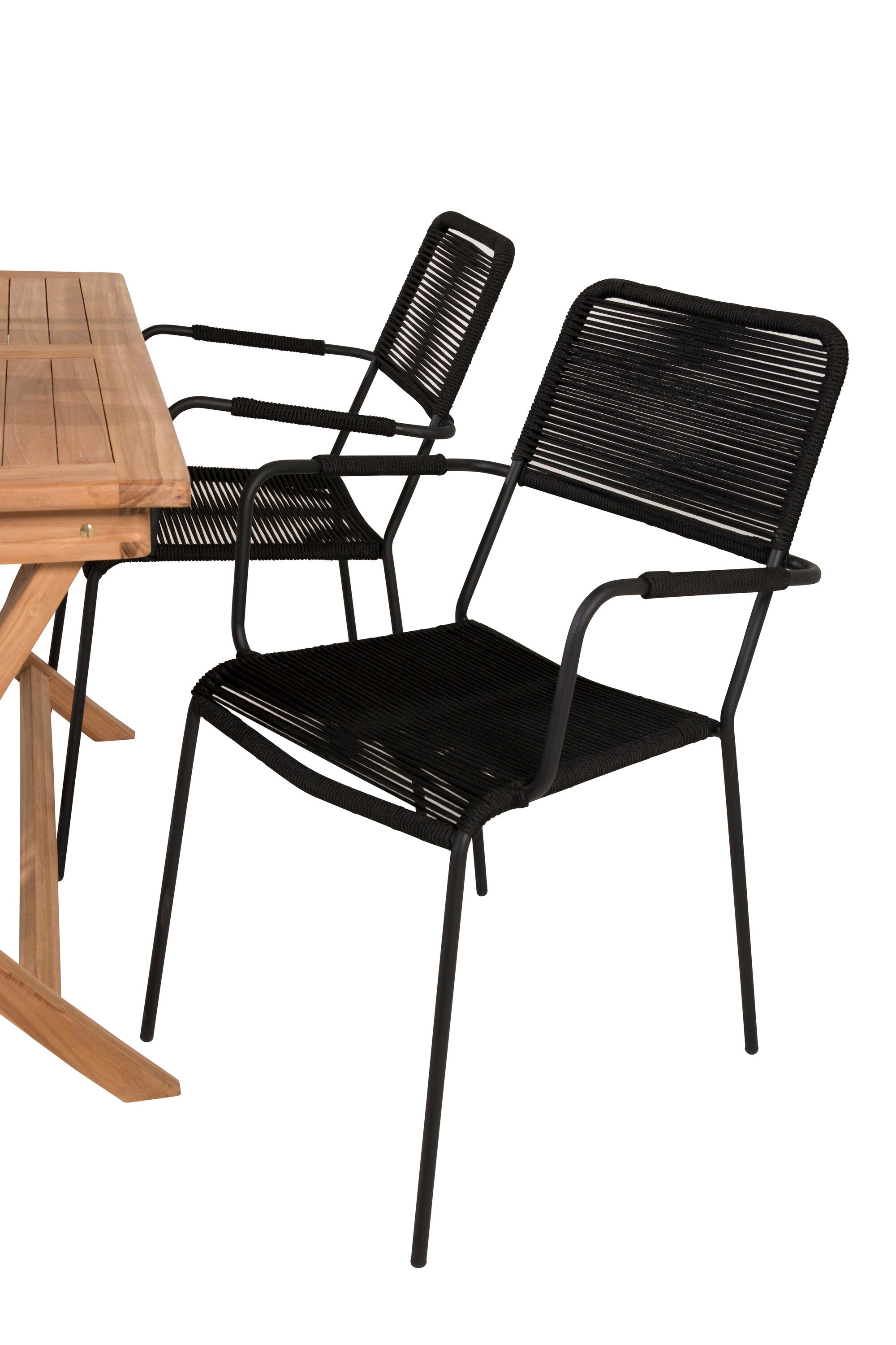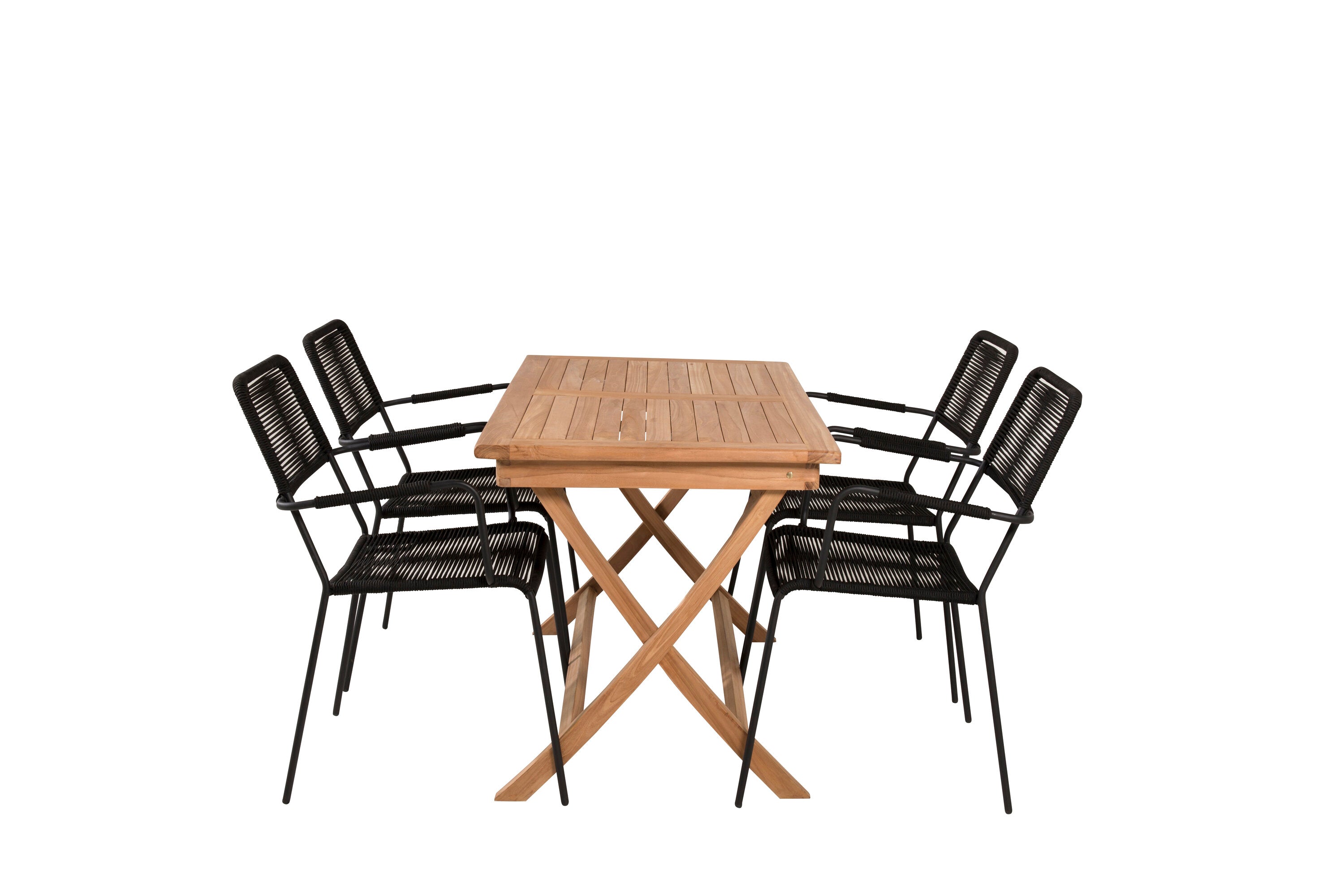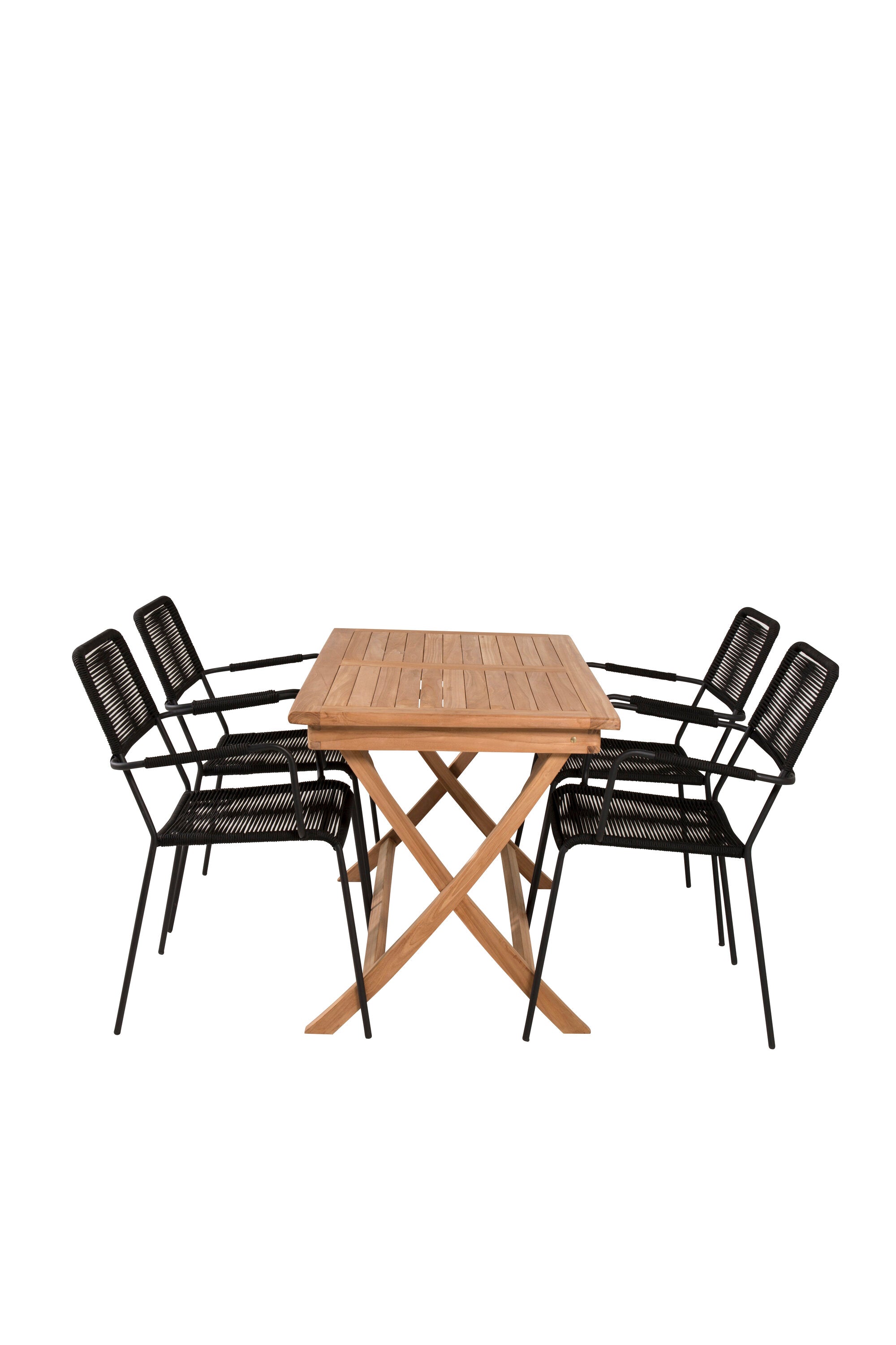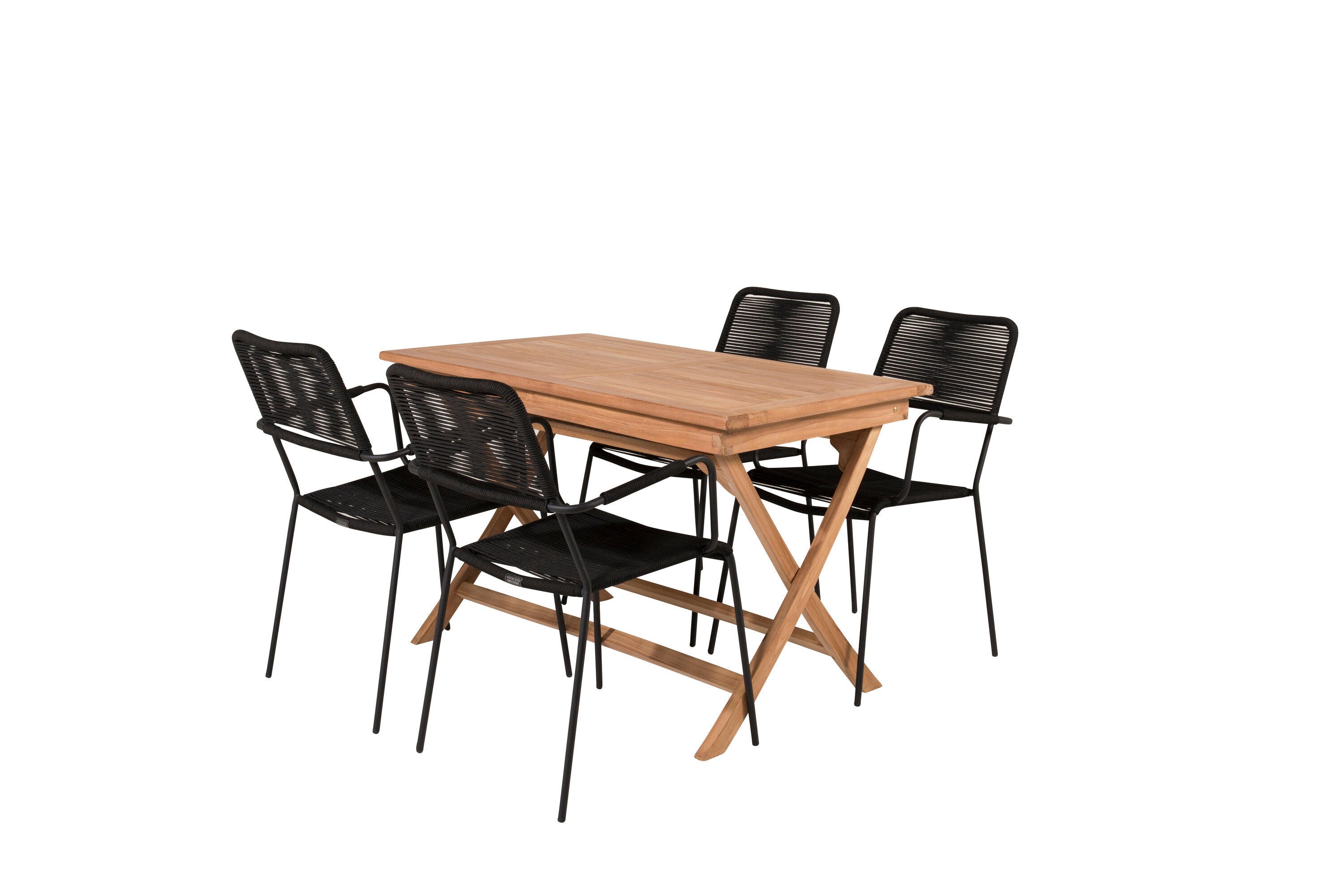Stylová, trendová a pohodlná jídelní sestava ve skandinávském designu! Náš oblíbený obdélníkový jídelní stůl Kenya má nadčasový design s žebrovanou verzí ve vkusném teaku. Křížové nohy působí pevným a okouzlujícím dojmem. Rozměry: 120x70 cm. Zde v štíhlé kombinaci s lahodnými jídelními židlemi ze série Lindos. Židle mají integrované područky z černé oceli a sedák z odolného černého lana. Zařiďte nádvoří příjemně a vytvořte poutač, který zaujme!