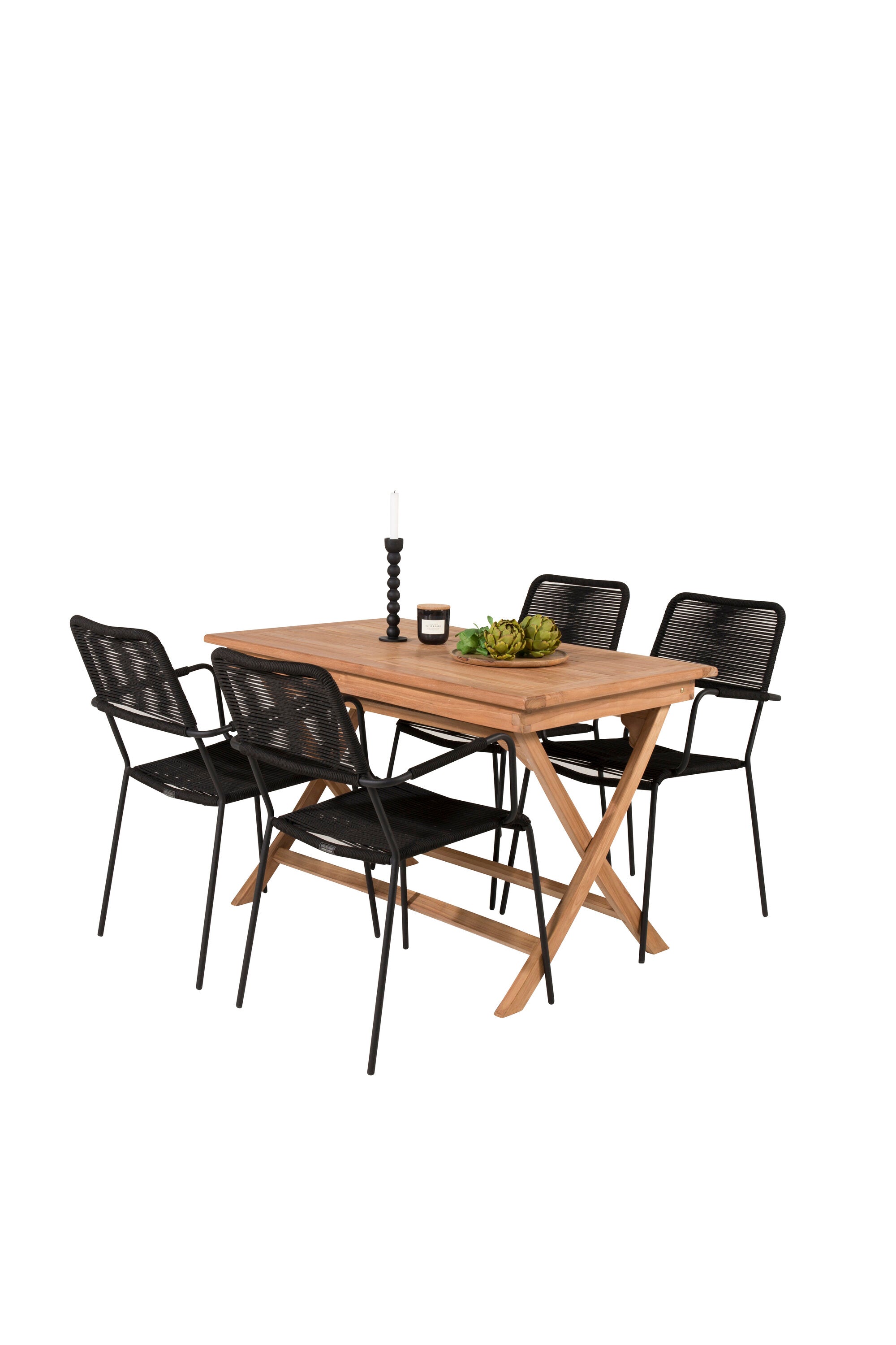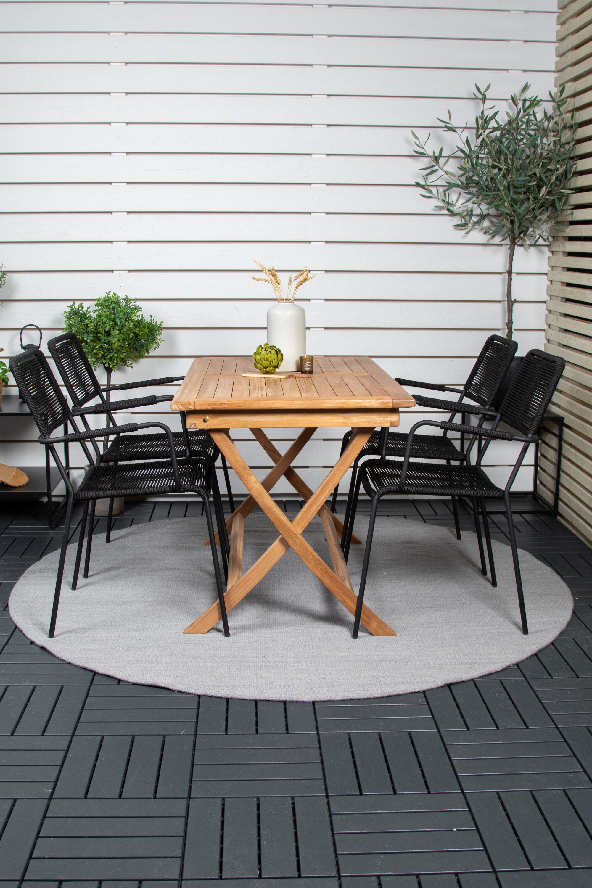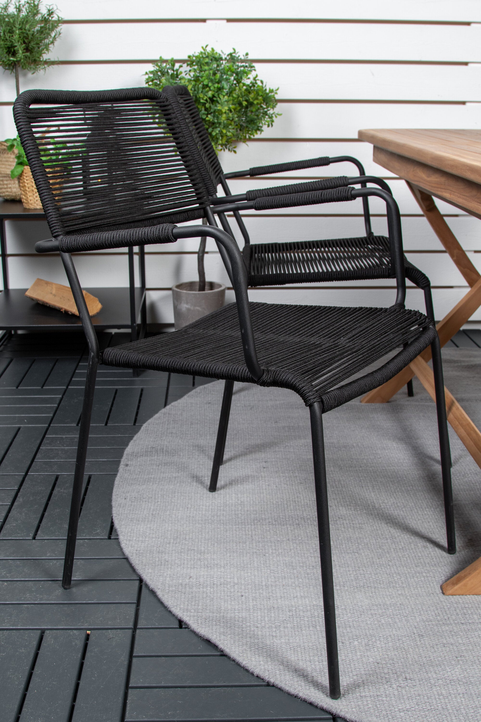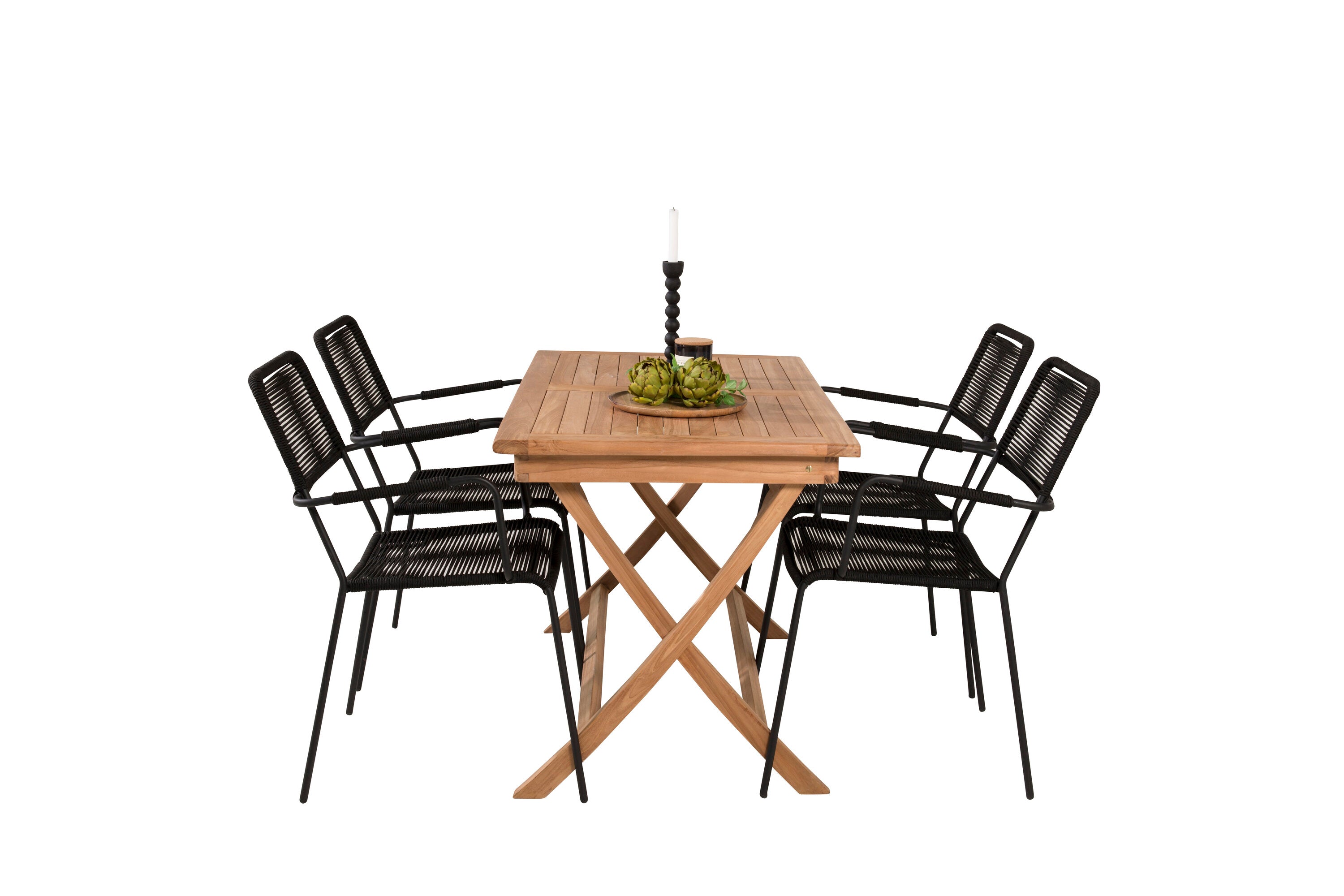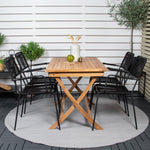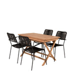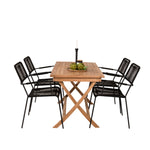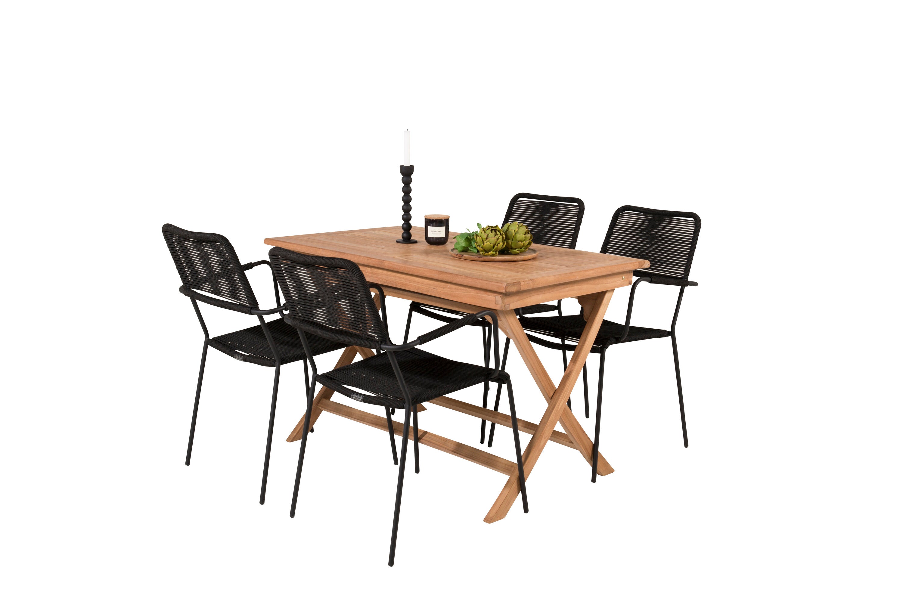 Stylová, trendová a pohodlná jídelní sestava ve skandinávském designu! Náš oblíbený obdélníkový jídelní stůl Kenya má nadčasový design s žebrovanou verzí ve vkusném teaku. Křížové nohy působí pevným a okouzlujícím dojmem. Rozměry: 120x70 cm. Zde v štíhlé kombinaci s lahodnými jídelními židlemi ze série Lindos. Židle mají integrované područky z černé oceli a sedák z odolného černého lana. Zařiďte nádvoří příjemně a vytvořte poutač, který zaujme!