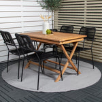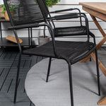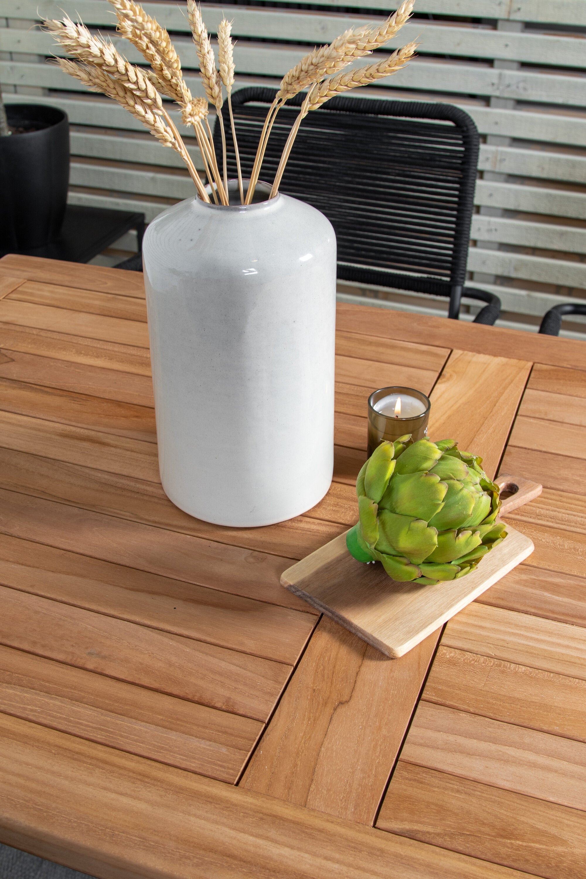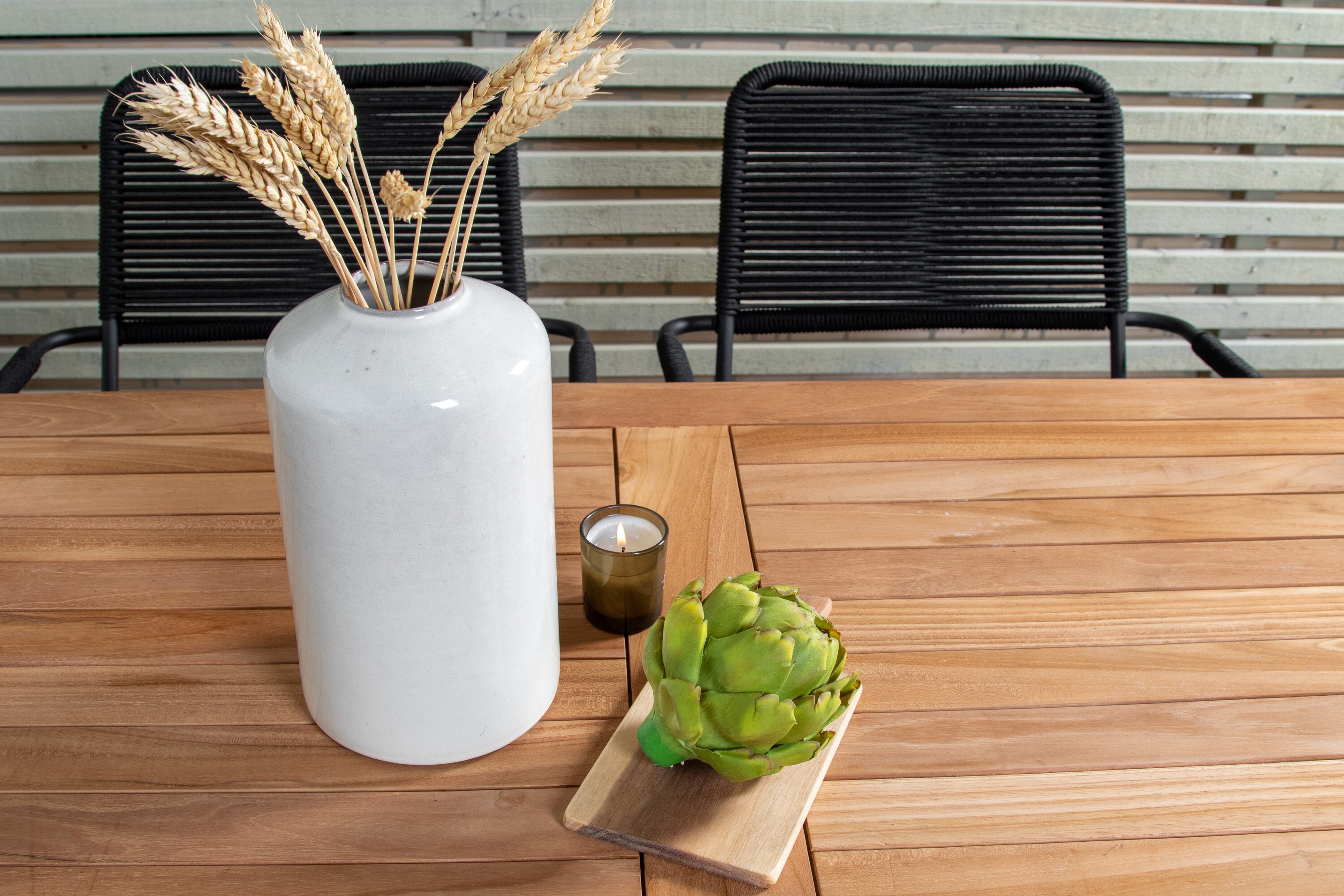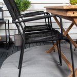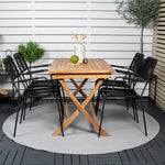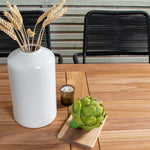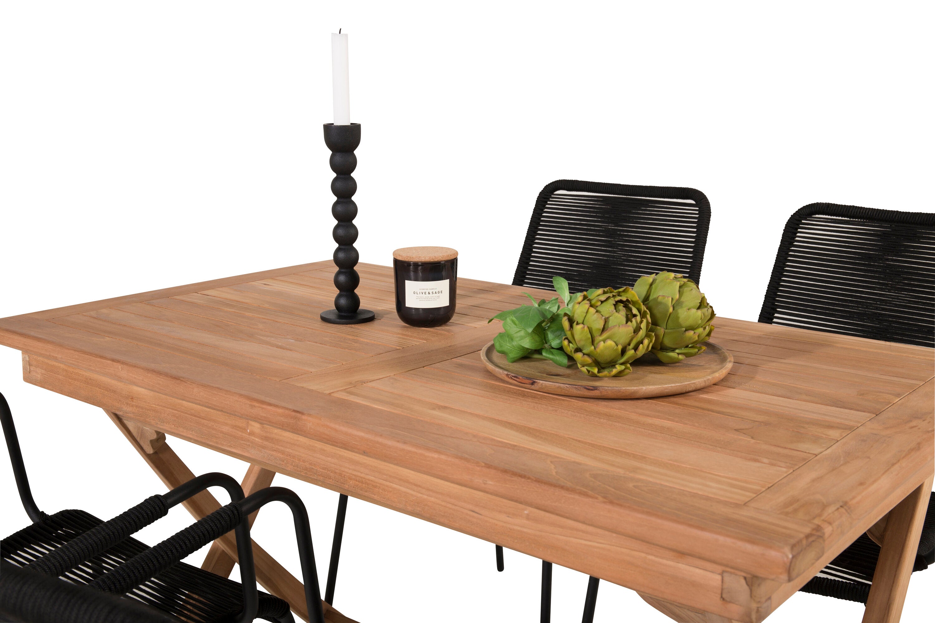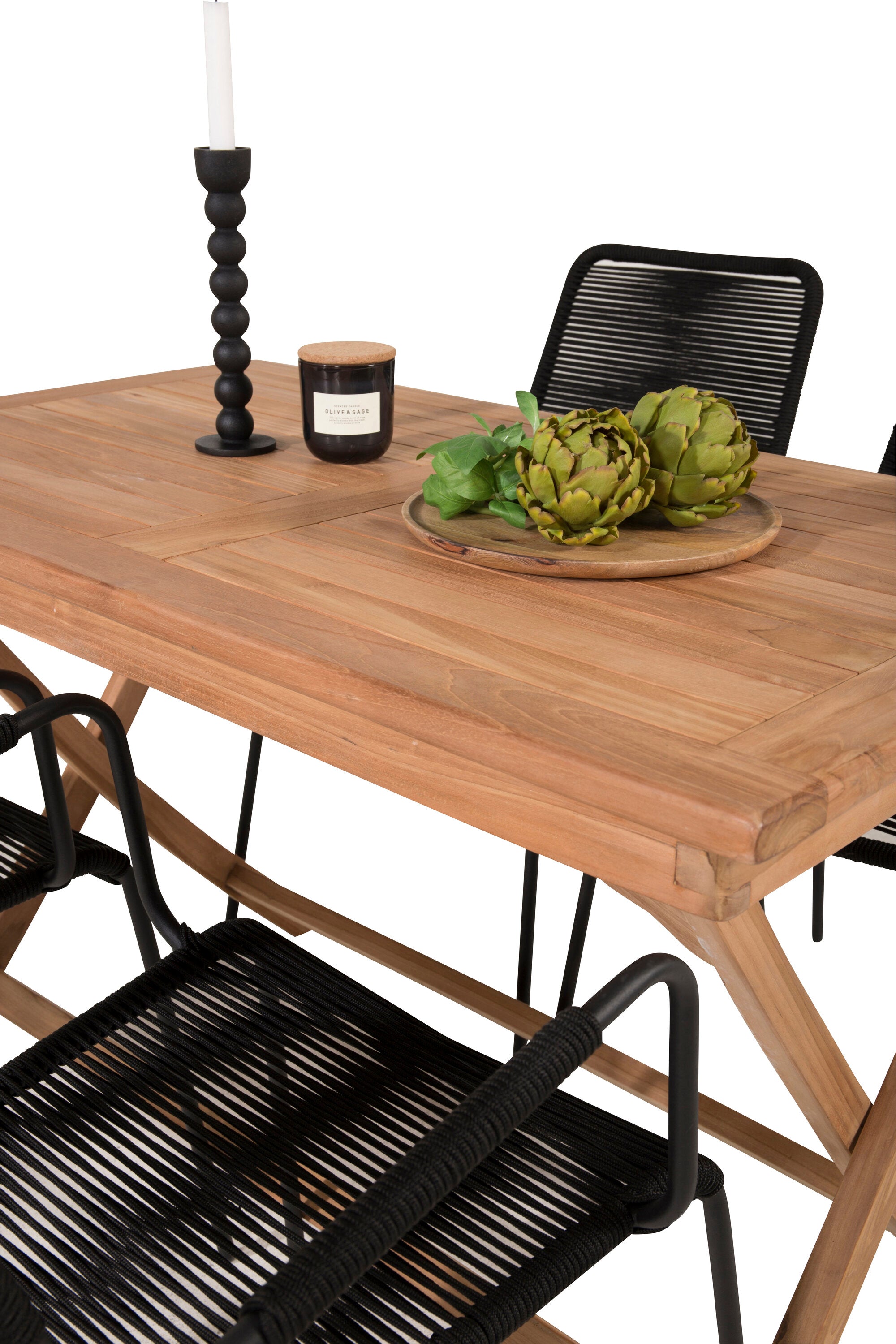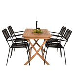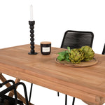 Stylová, trendová a pohodlná jídelní sestava ve skandinávském designu! Náš oblíbený obdélníkový jídelní stůl Kenya má nadčasový design s žebrovanou verzí ve vkusném teaku. Křížové nohy působí pevným a okouzlujícím dojmem. Rozměry: 120x70 cm. Zde v štíhlé kombinaci s lahodnými jídelními židlemi ze série Lindos. Židle mají integrované područky z černé oceli a sedák z odolného černého lana. Zařiďte nádvoří příjemně a vytvořte poutač, který zaujme!