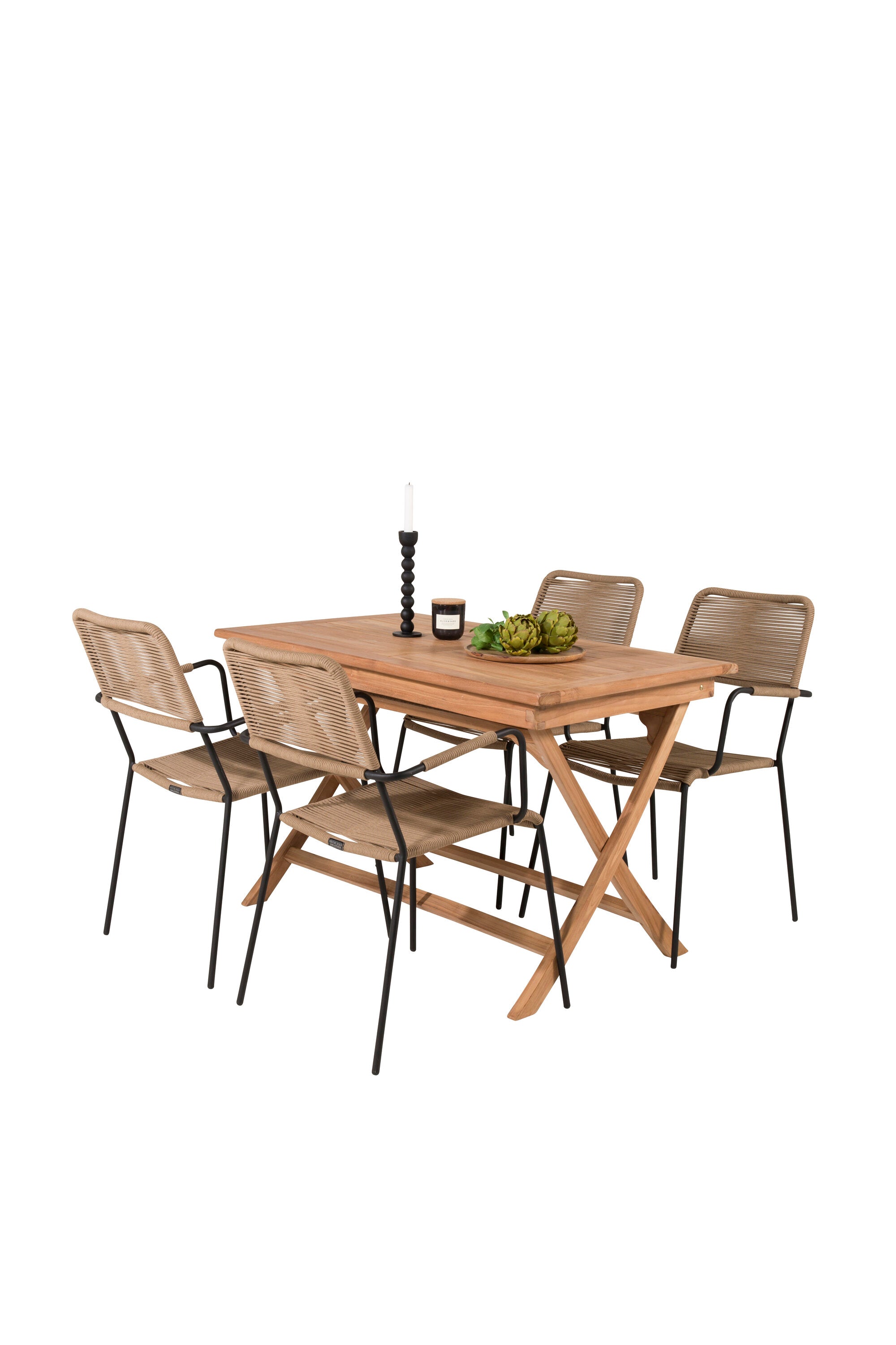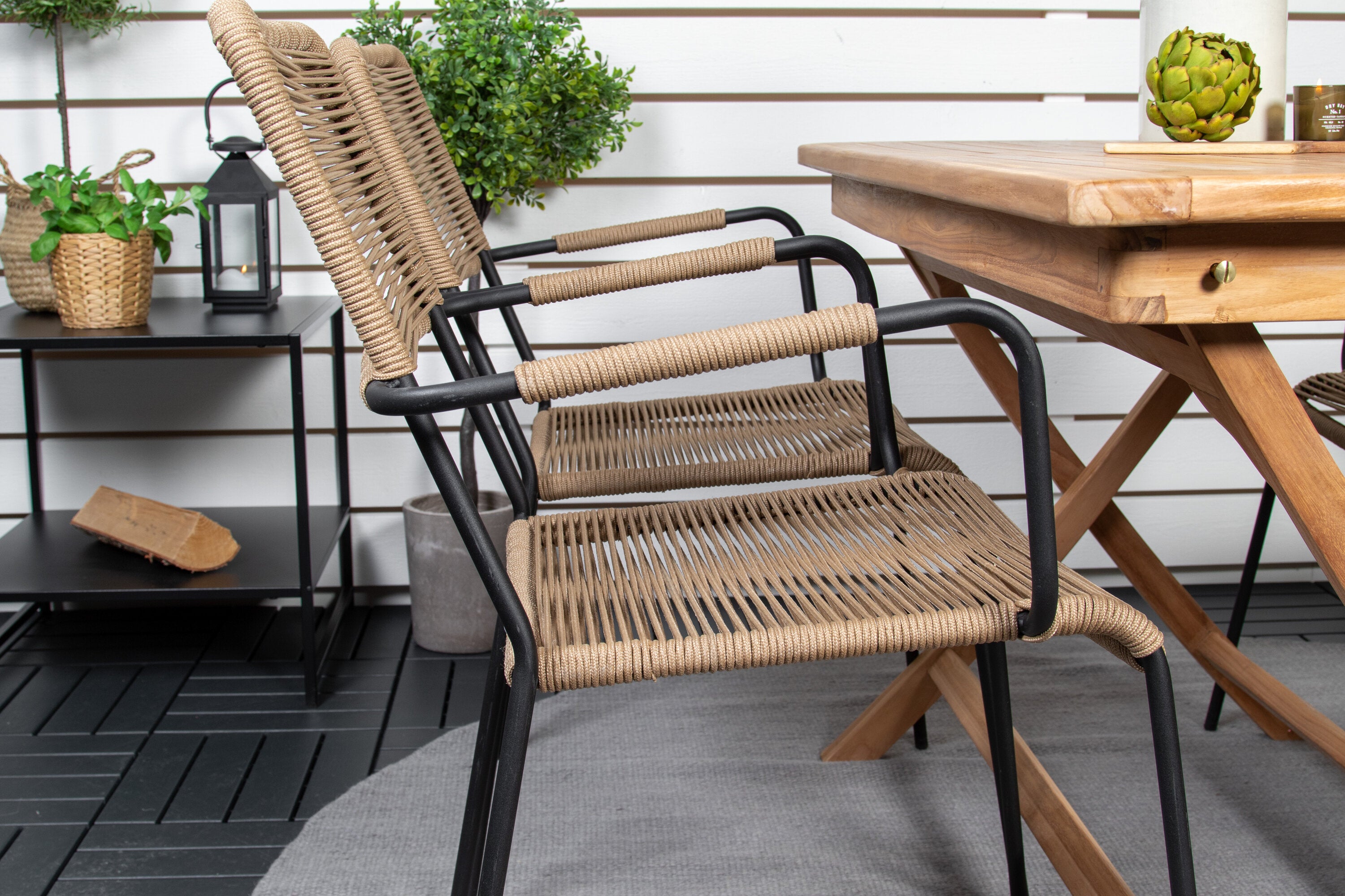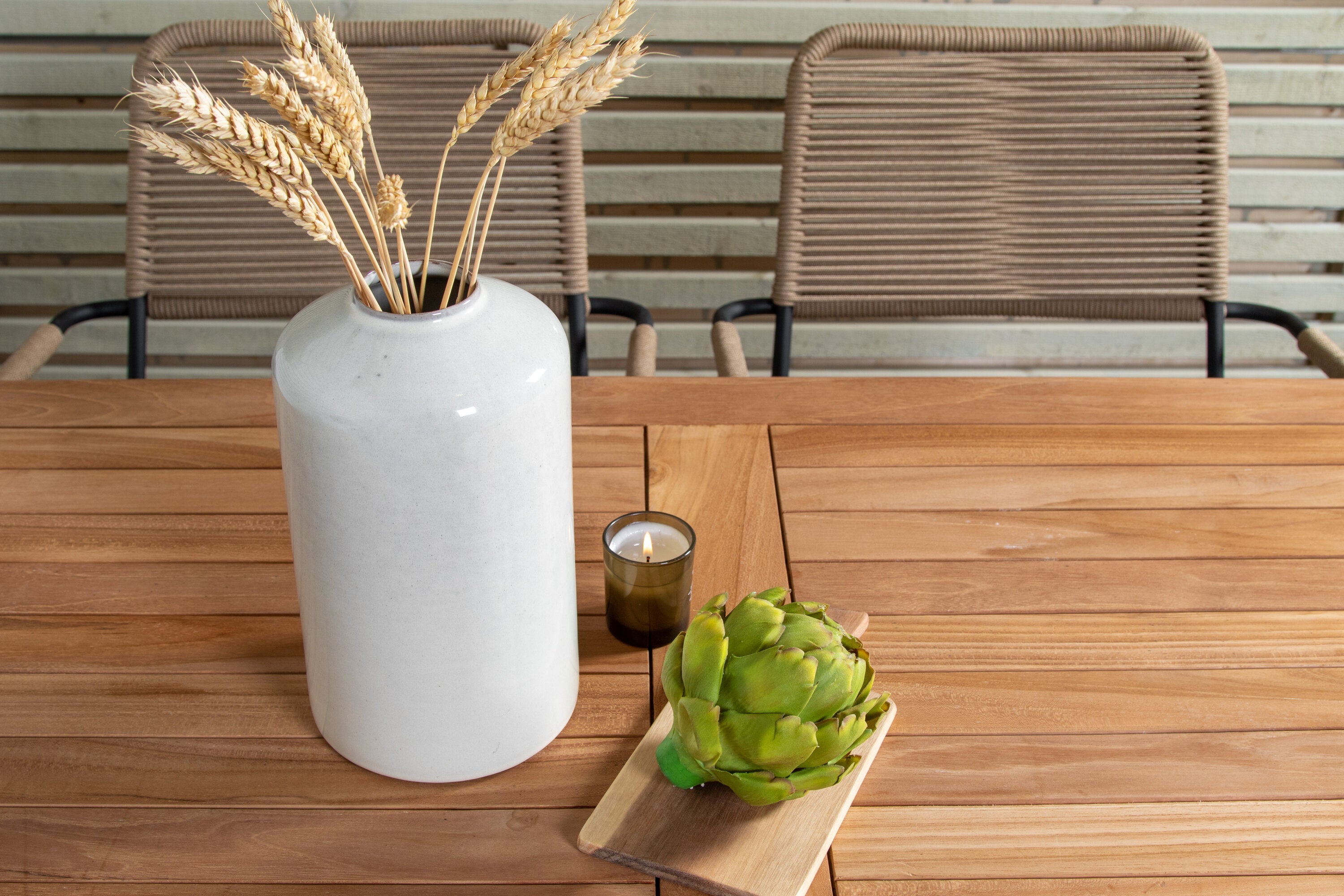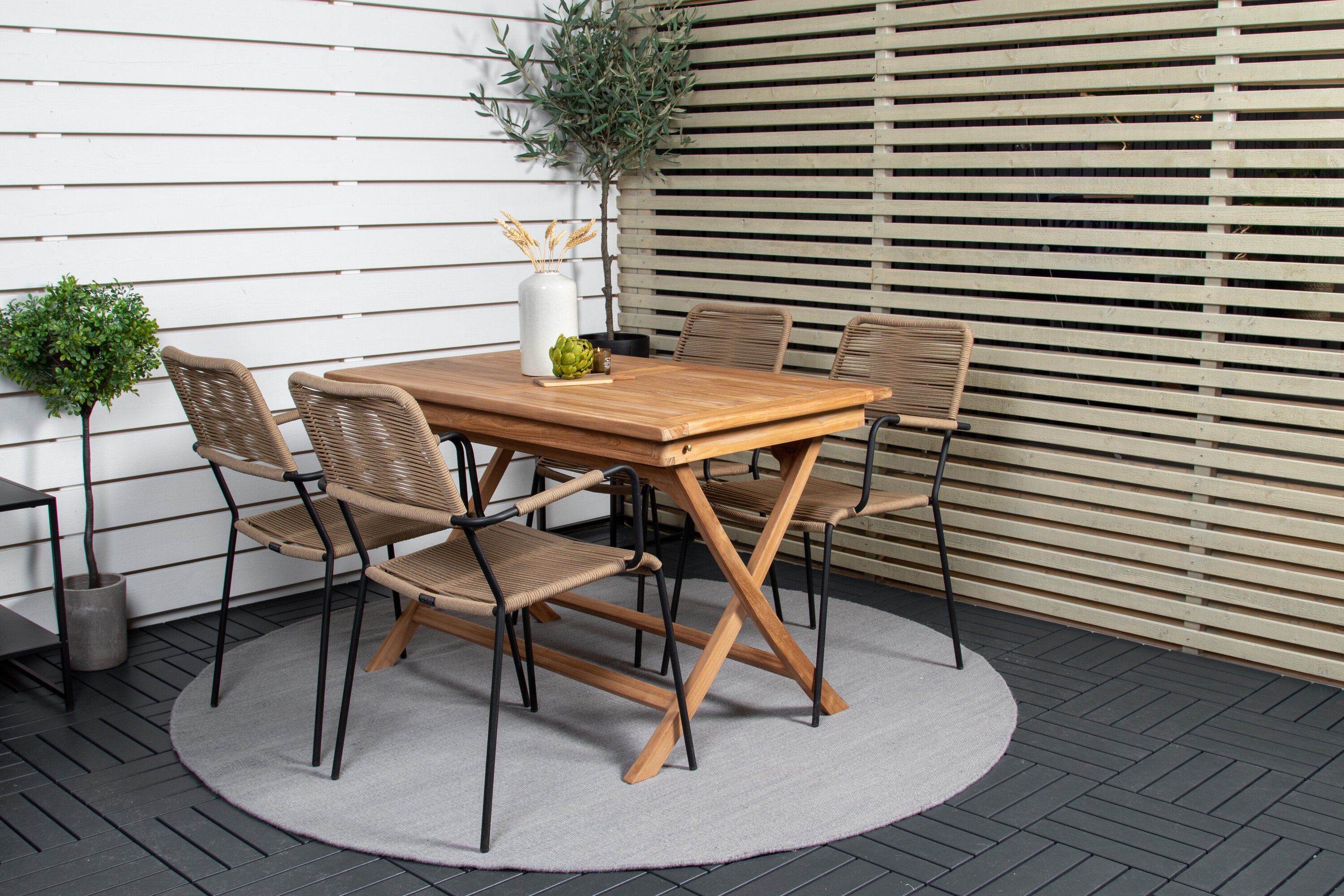 Zařiďte terasu v zemitých barvách se skupinou jídel ve skandinávském designu! Náš oblíbený obdélníkový jídelní stůl Kenya má nadčasový design s žebrovanou verzí ve vkusném teaku. Křížové nohy působí pevným a okouzlujícím dojmem. Rozměry: 120x70 cm. Zde v štíhlé kombinaci s lahodnými jídelními židlemi ze série Lindos. Židle mají integrované područky z černé oceli a sedák z odolného lana v barvě latte. Zařiďte nádvoří příjemně a vytvořte poutač, který zaujme!