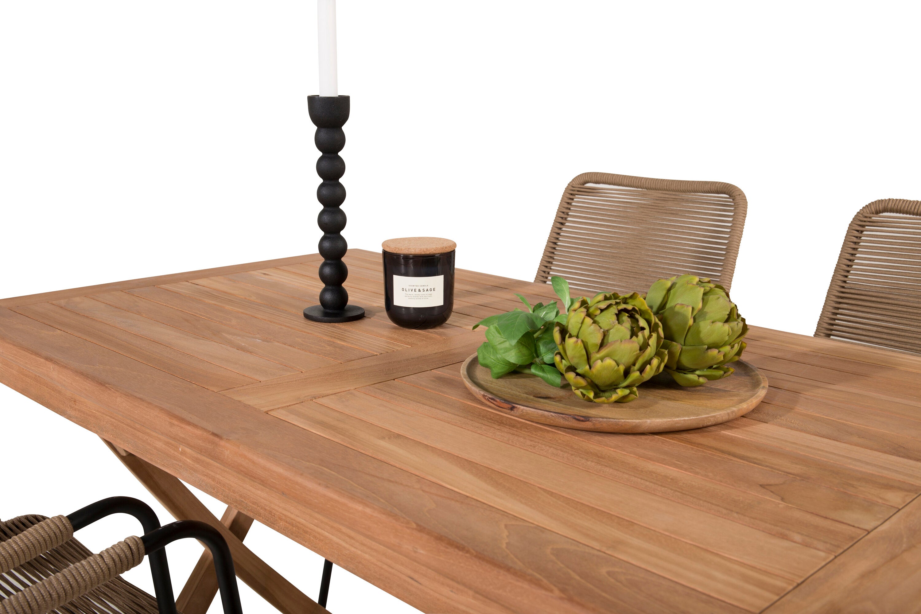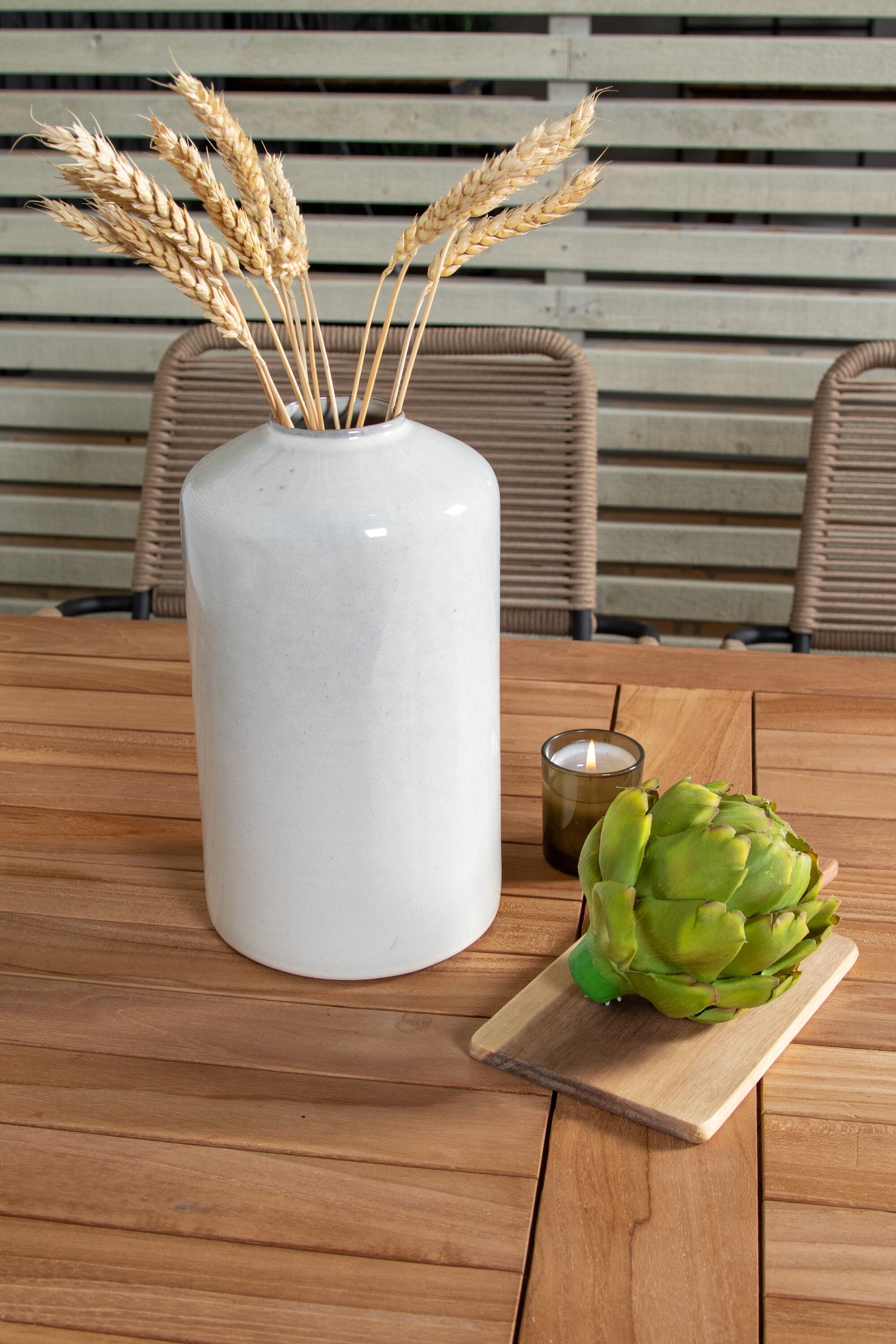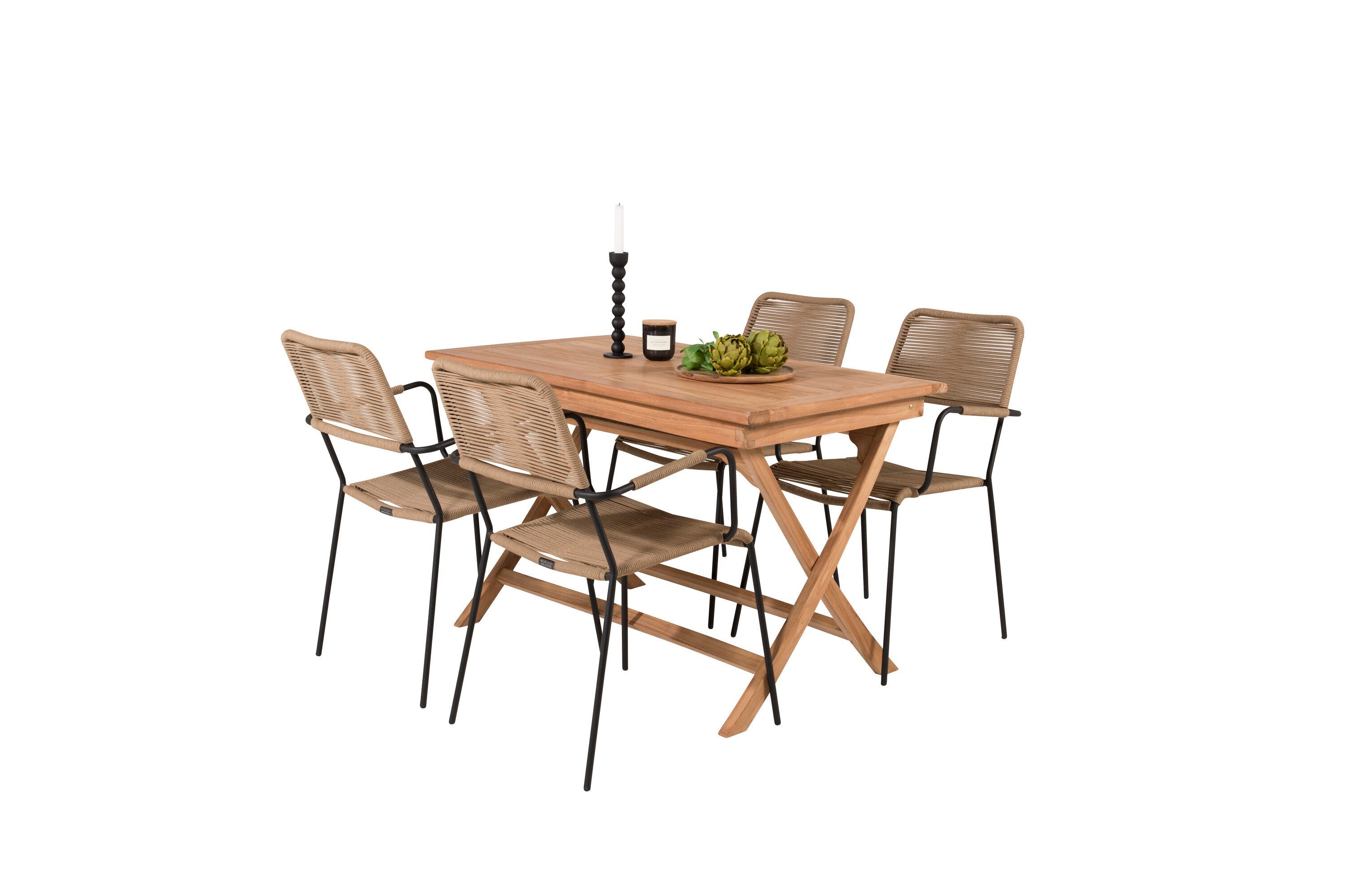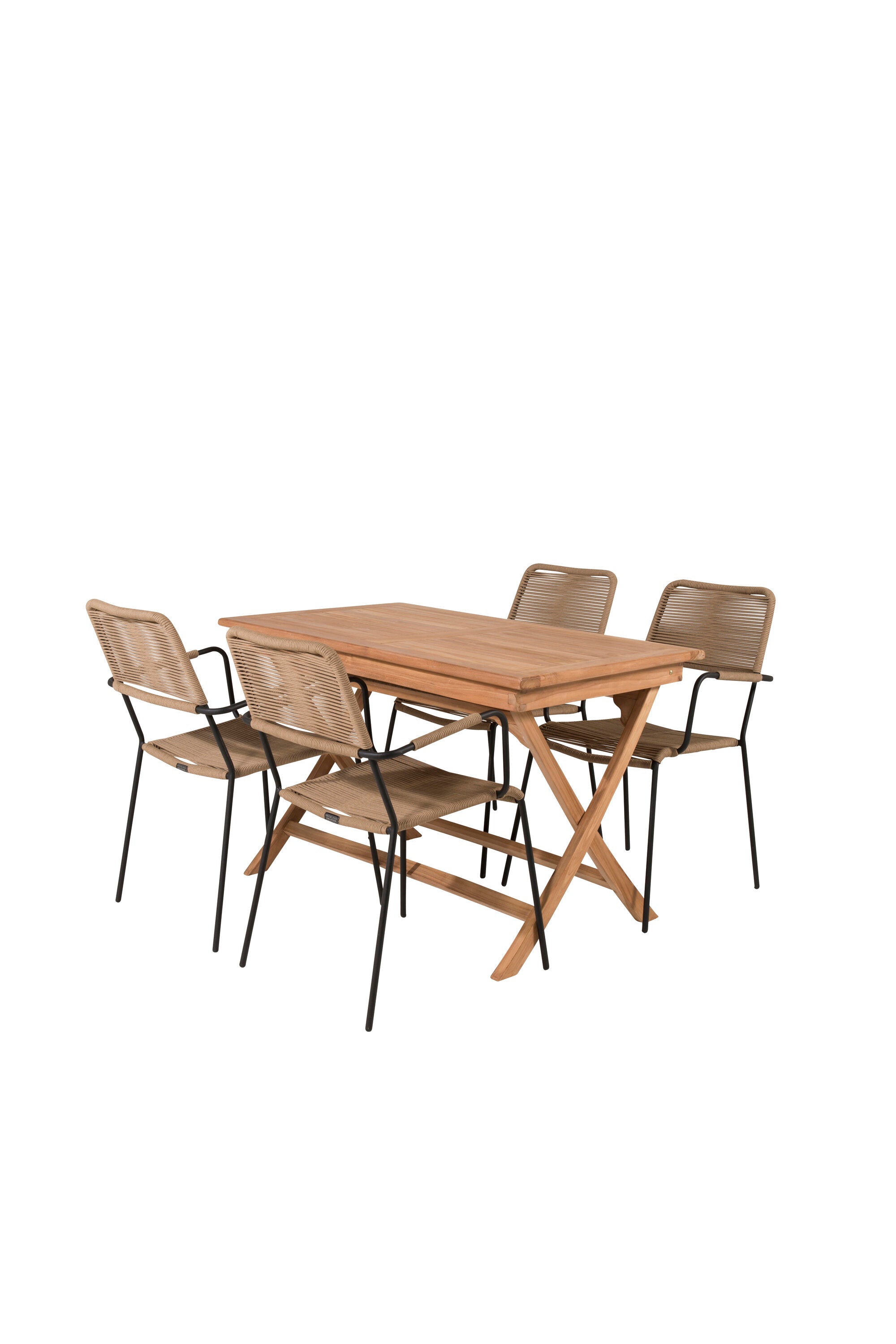 Zařiďte terasu v zemitých barvách se skupinou jídel ve skandinávském designu! Náš oblíbený obdélníkový jídelní stůl Kenya má nadčasový design s žebrovanou verzí ve vkusném teaku. Křížové nohy působí pevným a okouzlujícím dojmem. Rozměry: 120x70 cm. Zde v štíhlé kombinaci s lahodnými jídelními židlemi ze série Lindos. Židle mají integrované područky z černé oceli a sedák z odolného lana v barvě latte. Zařiďte nádvoří příjemně a vytvořte poutač, který zaujme!