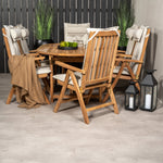 Oválná skupina jídel vytváří rodinný pocit a zajišťuje, aby nikdo neskončil na okraji! Jídelní stůl Kenya ve vkusném teakovém provedení zaujme svým pompézním designem a skandinávským designem. Stolová deska má žebrovanou verzi a rám působí stabilním dojmem. Rozměry: 180/240x120 cm. Zde v dokonalé kombinaci se 6 pohodlnými jídelními židlemi ze stejné série, která je navíc ve vkusném teakovém provedení. Židle jsou skládací pro optimální relaxaci a mají područky pro větší pohodlí. Pohodlně se usaďte a vychutnejte si příjemné jídlo!